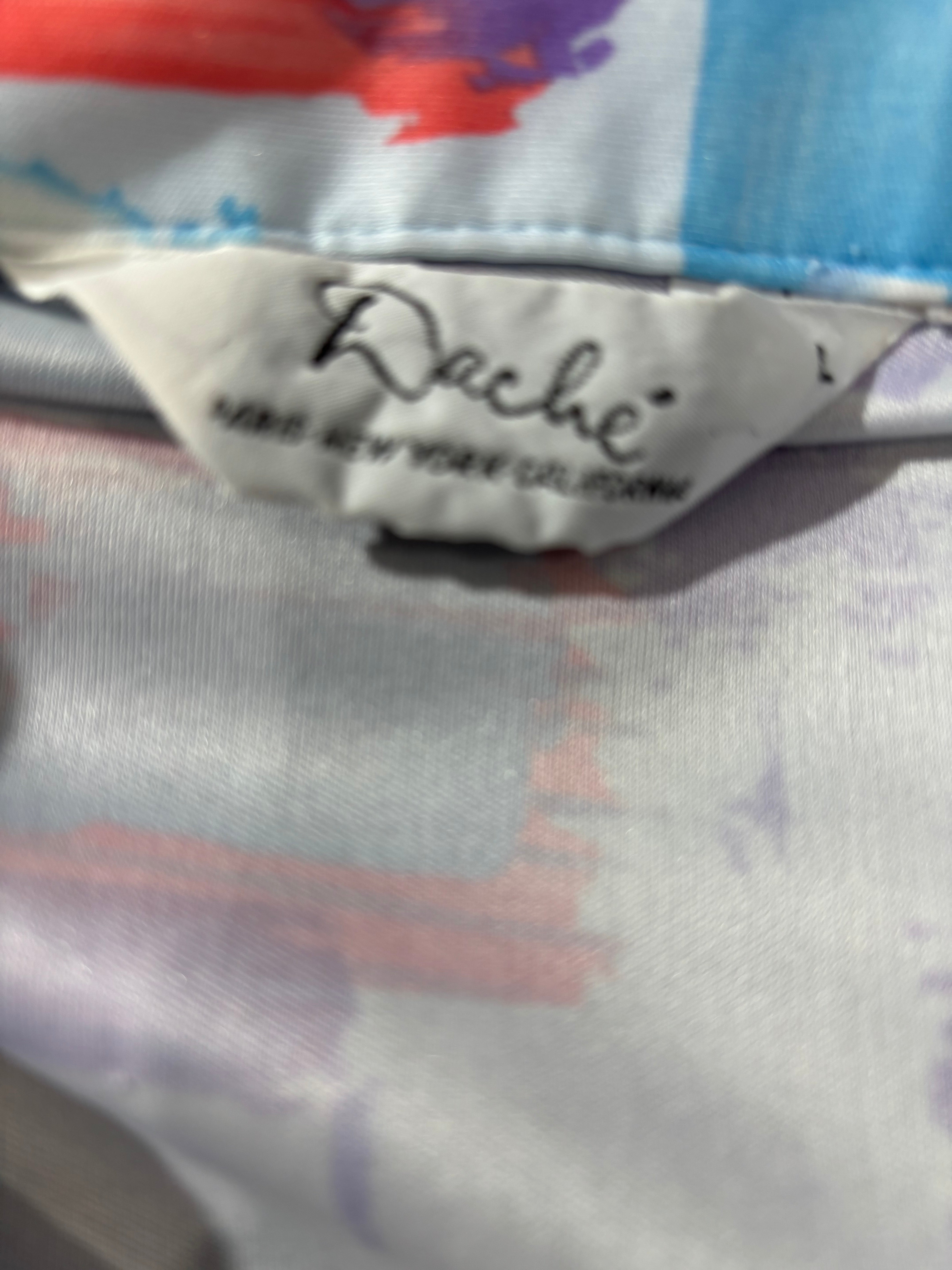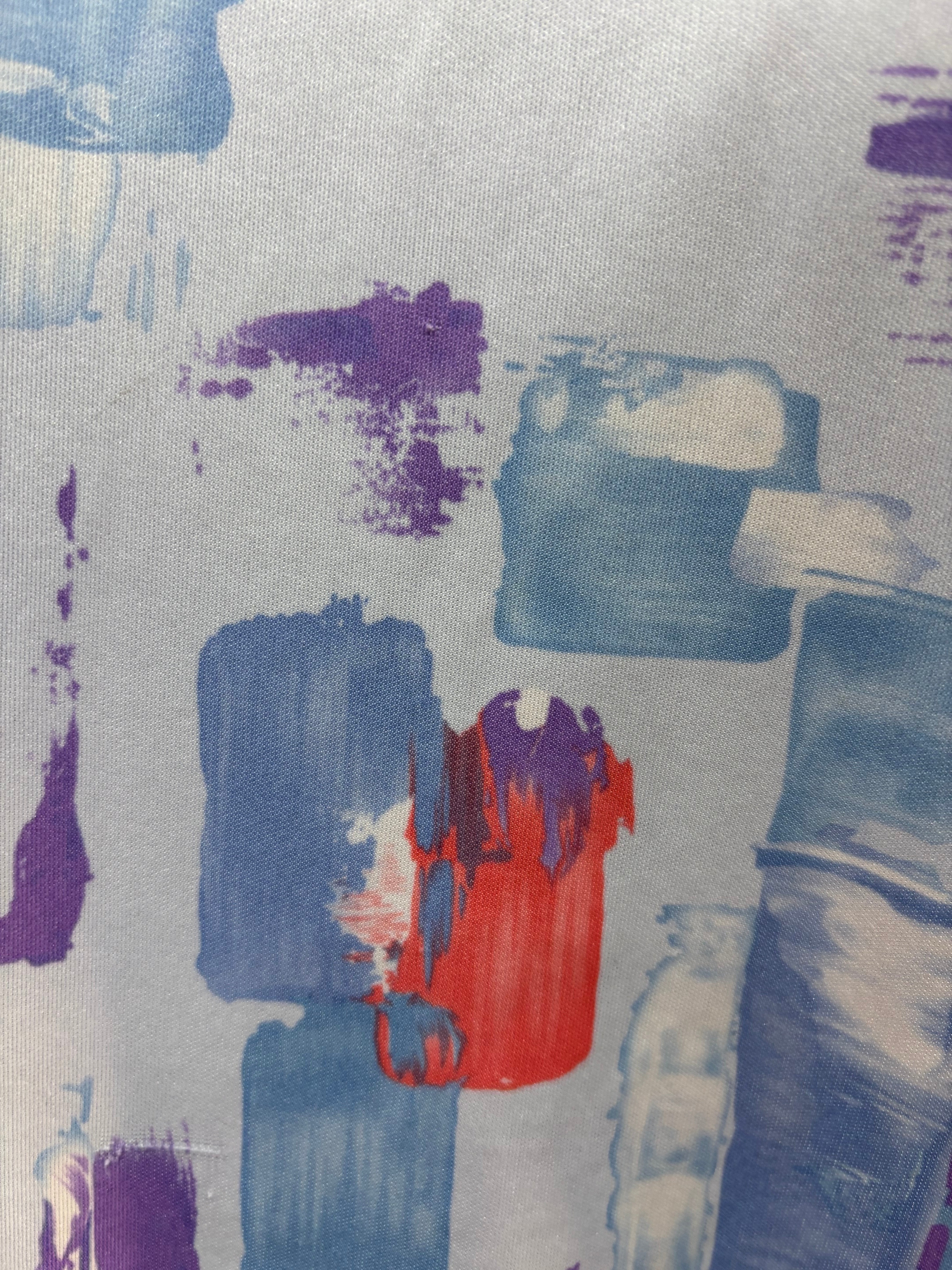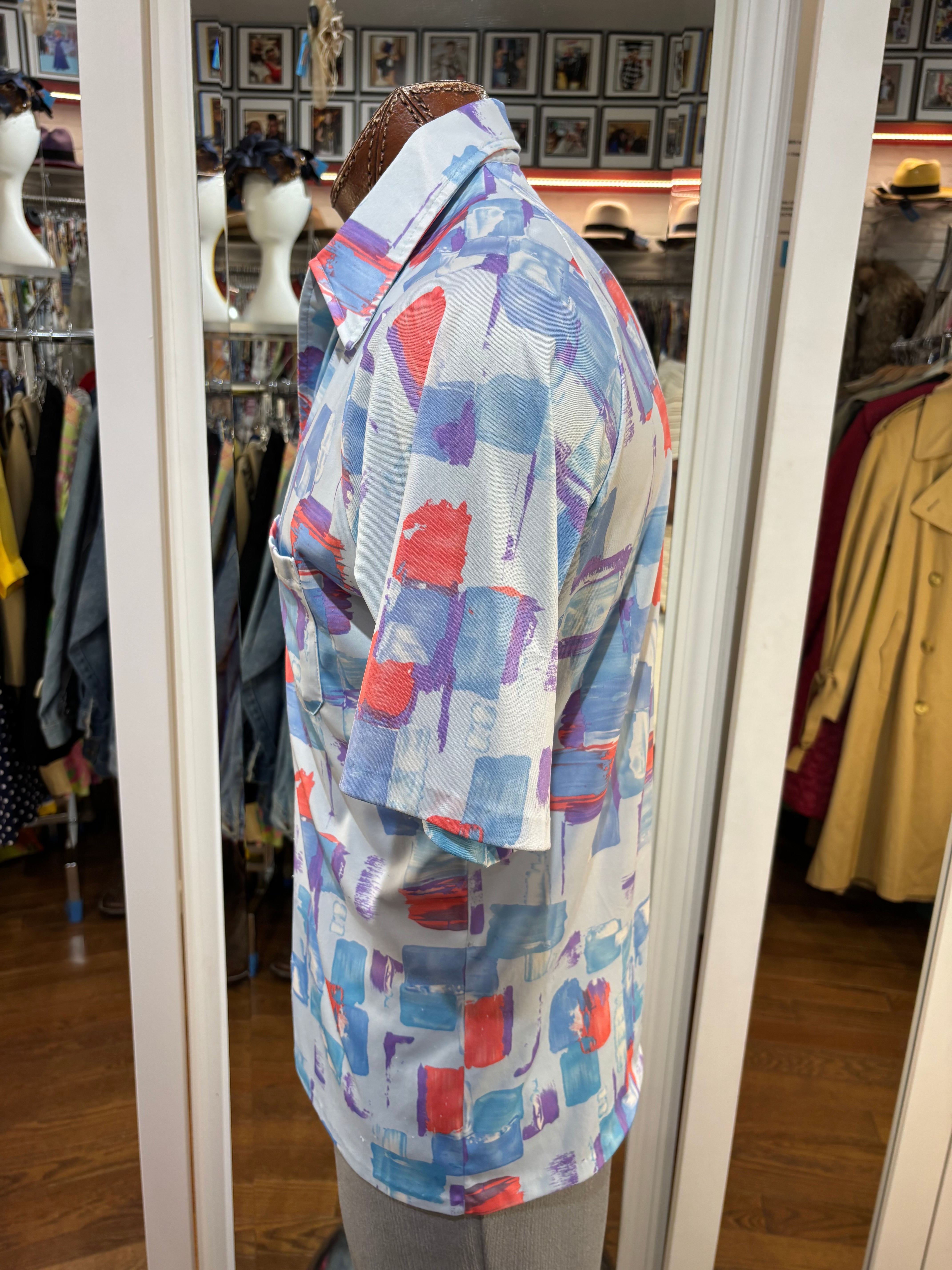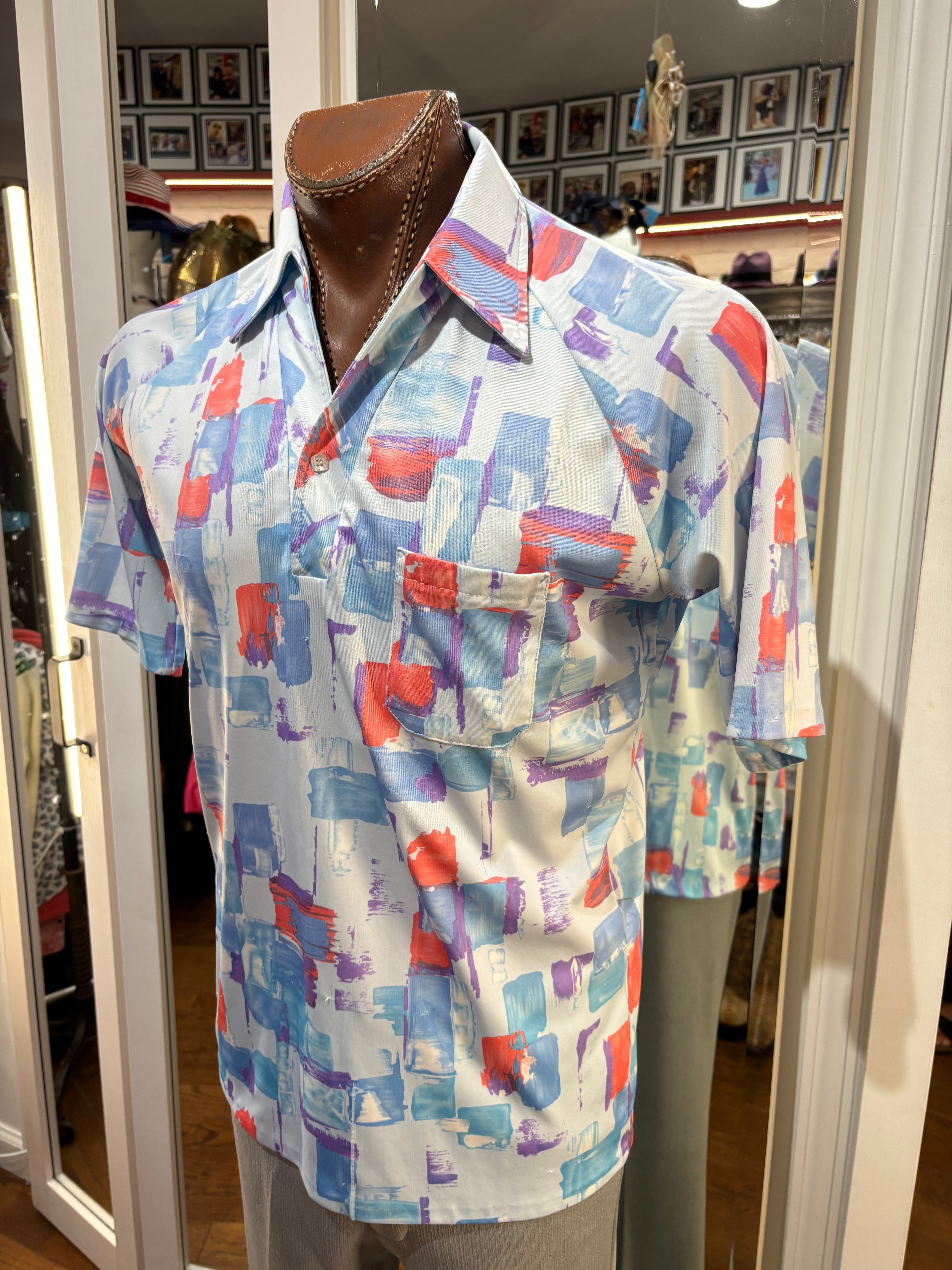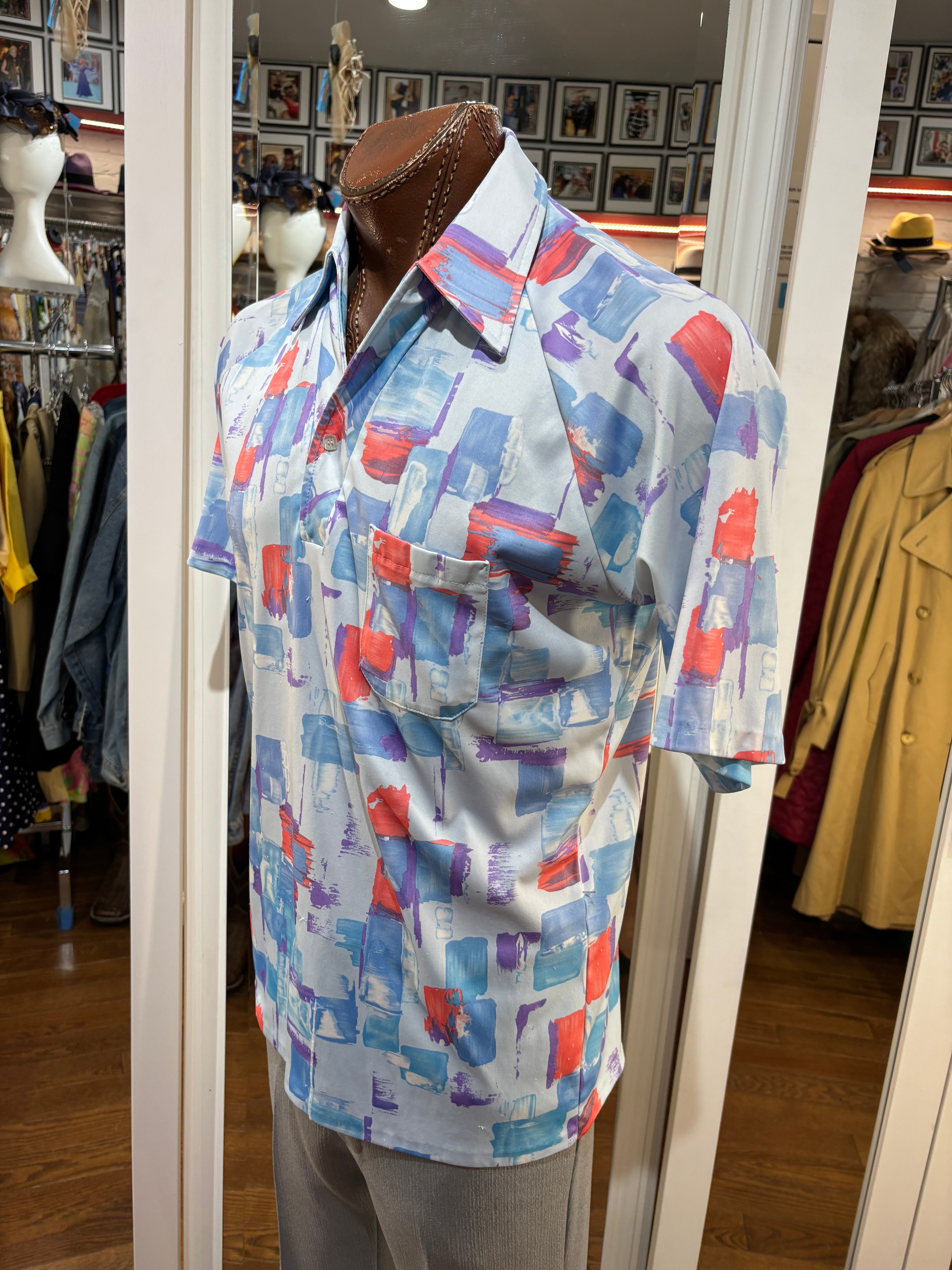 70’s Pale Blue Abstract Multicolor Print Collared Disco Polo Shirt By Lilly Daché