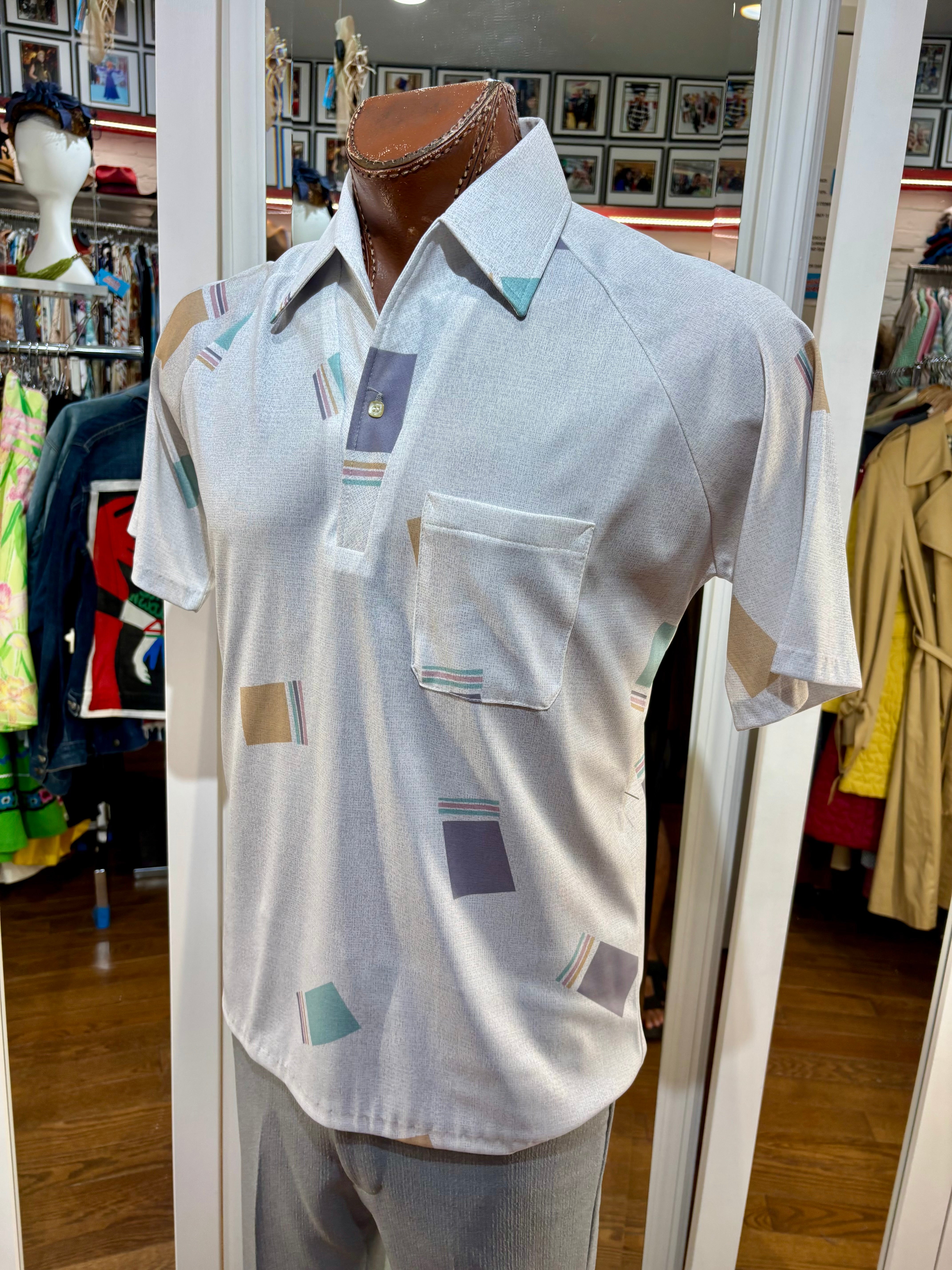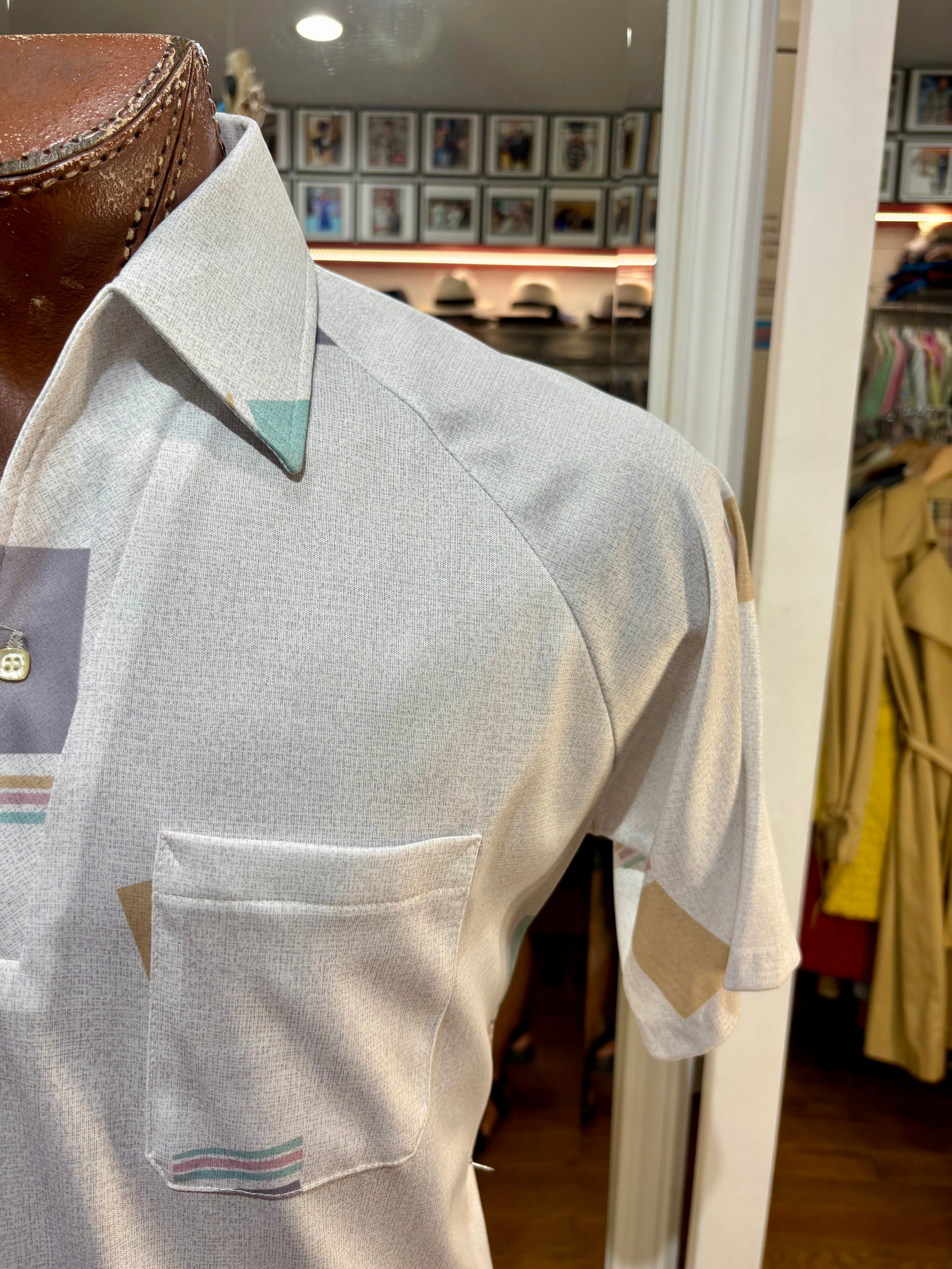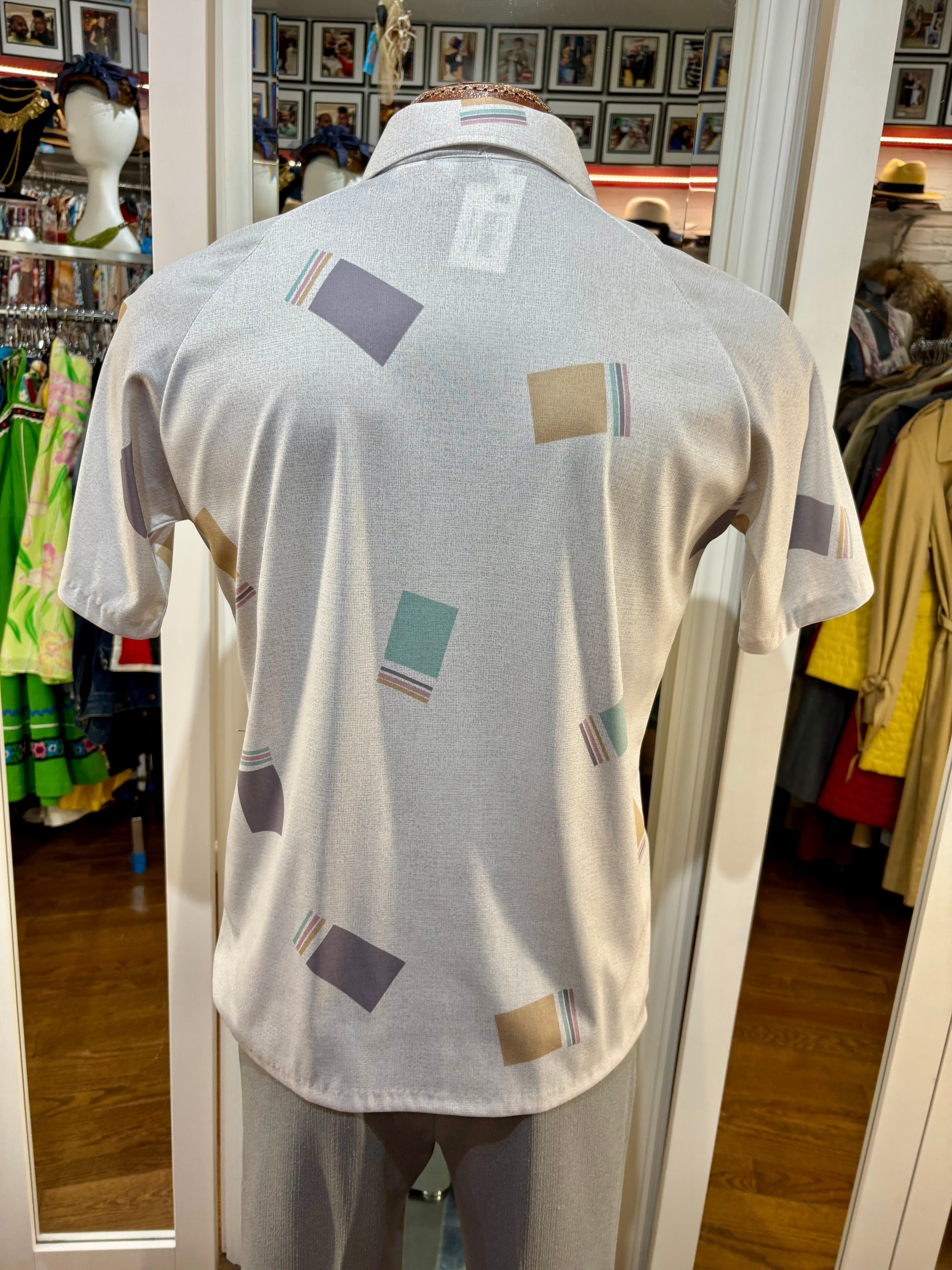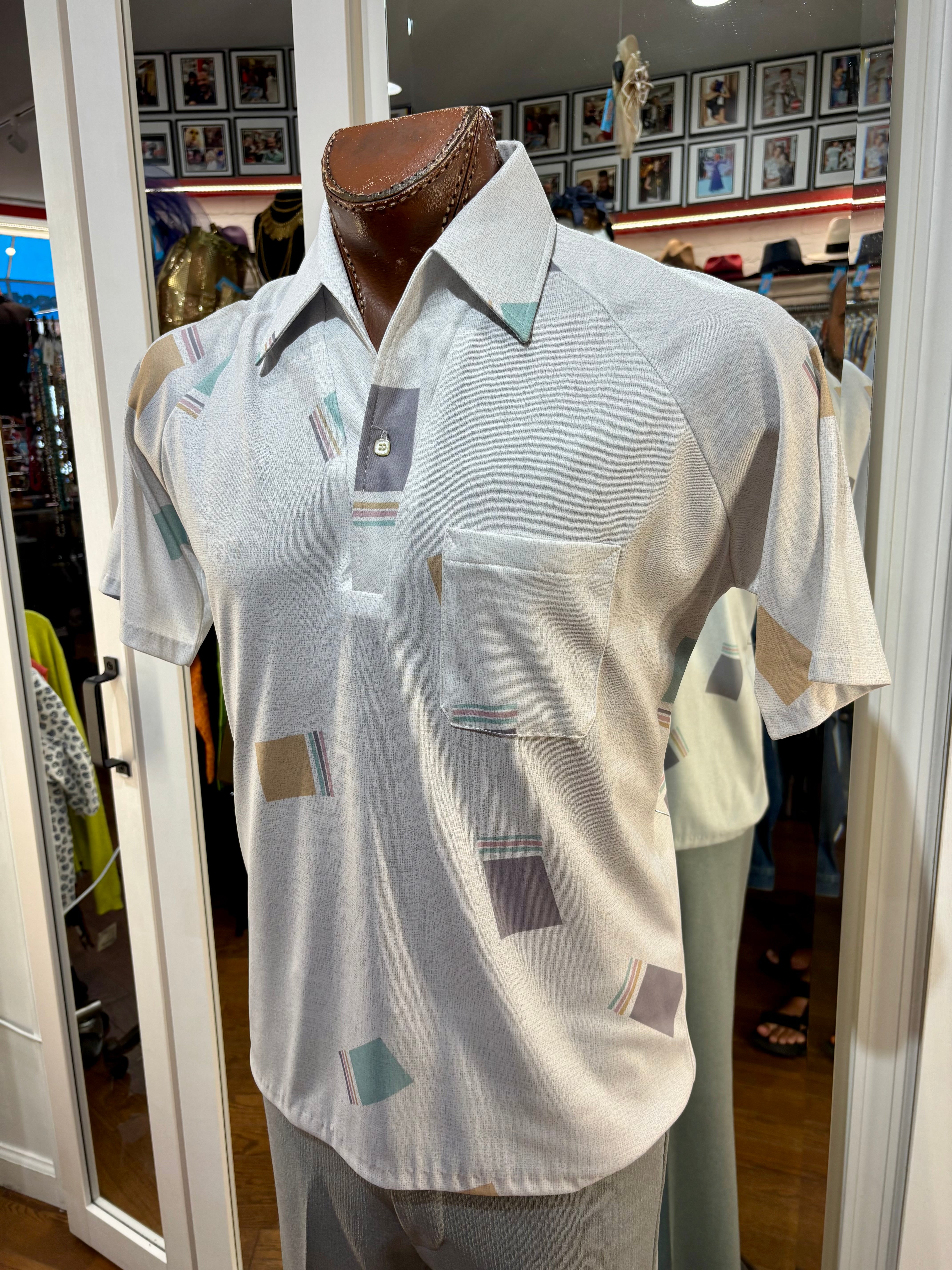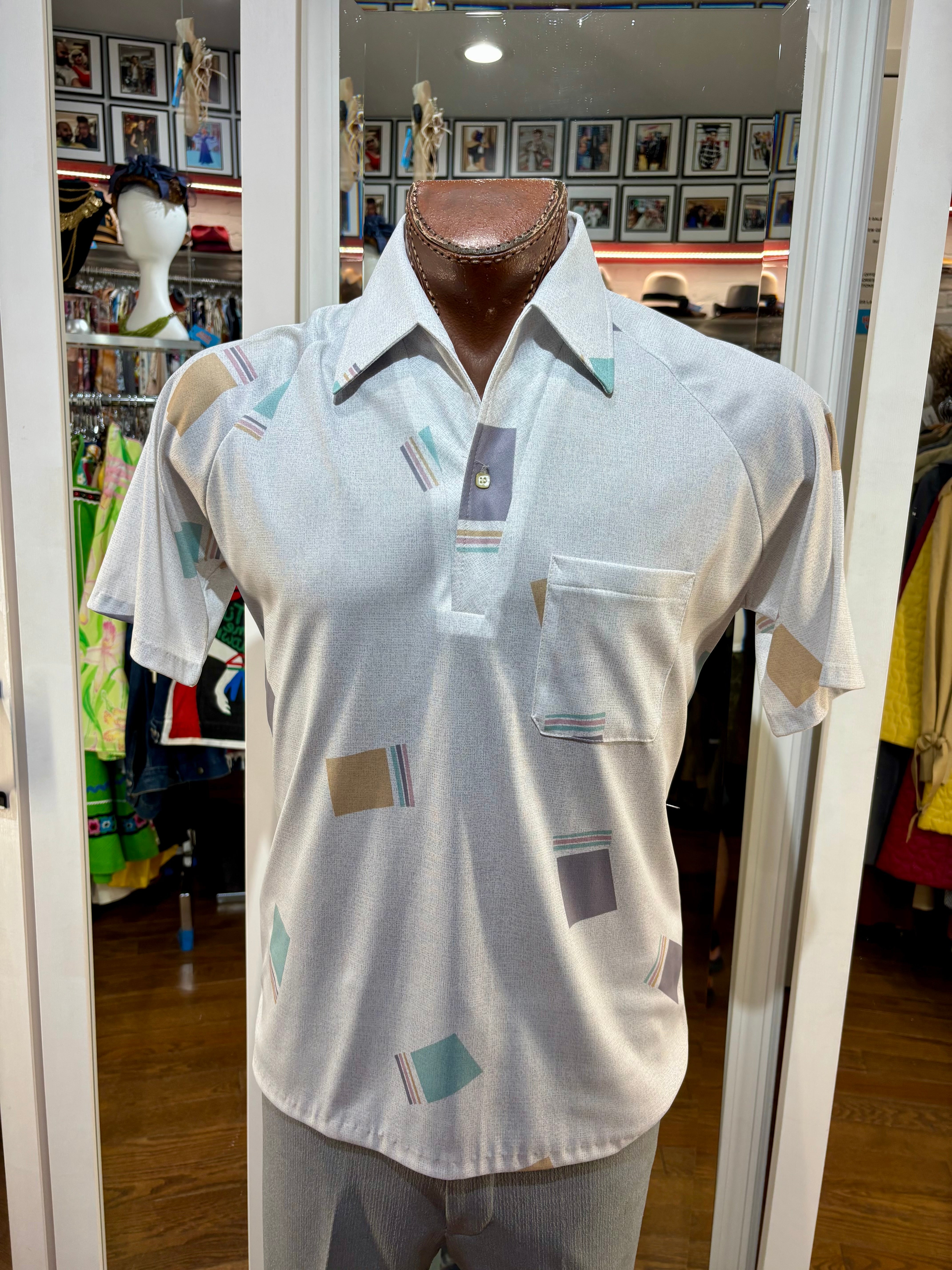 70’s Light Gray Multicolor Geometrical Square Print Disco Short Sleeve Polo By Lilly Daché