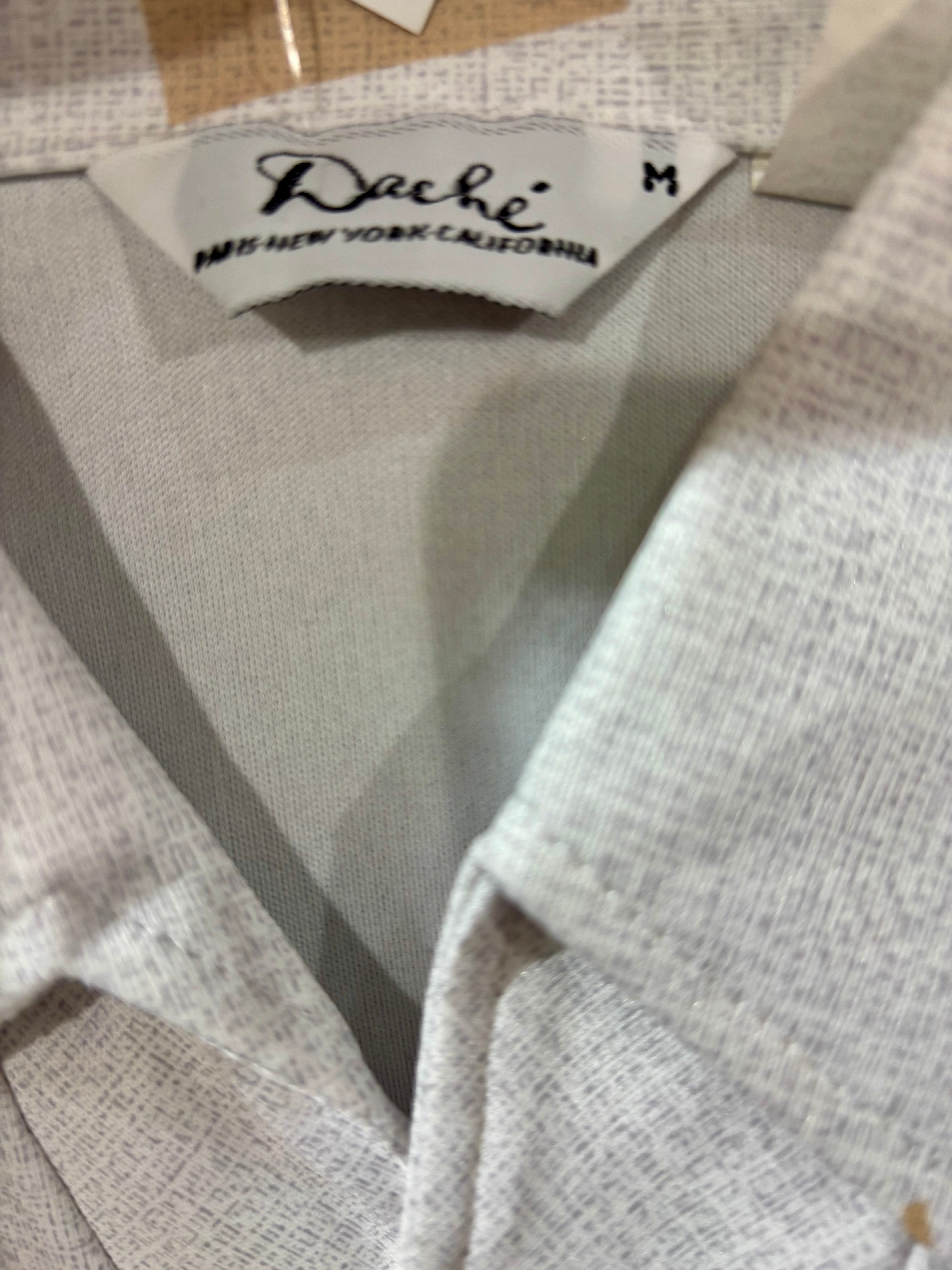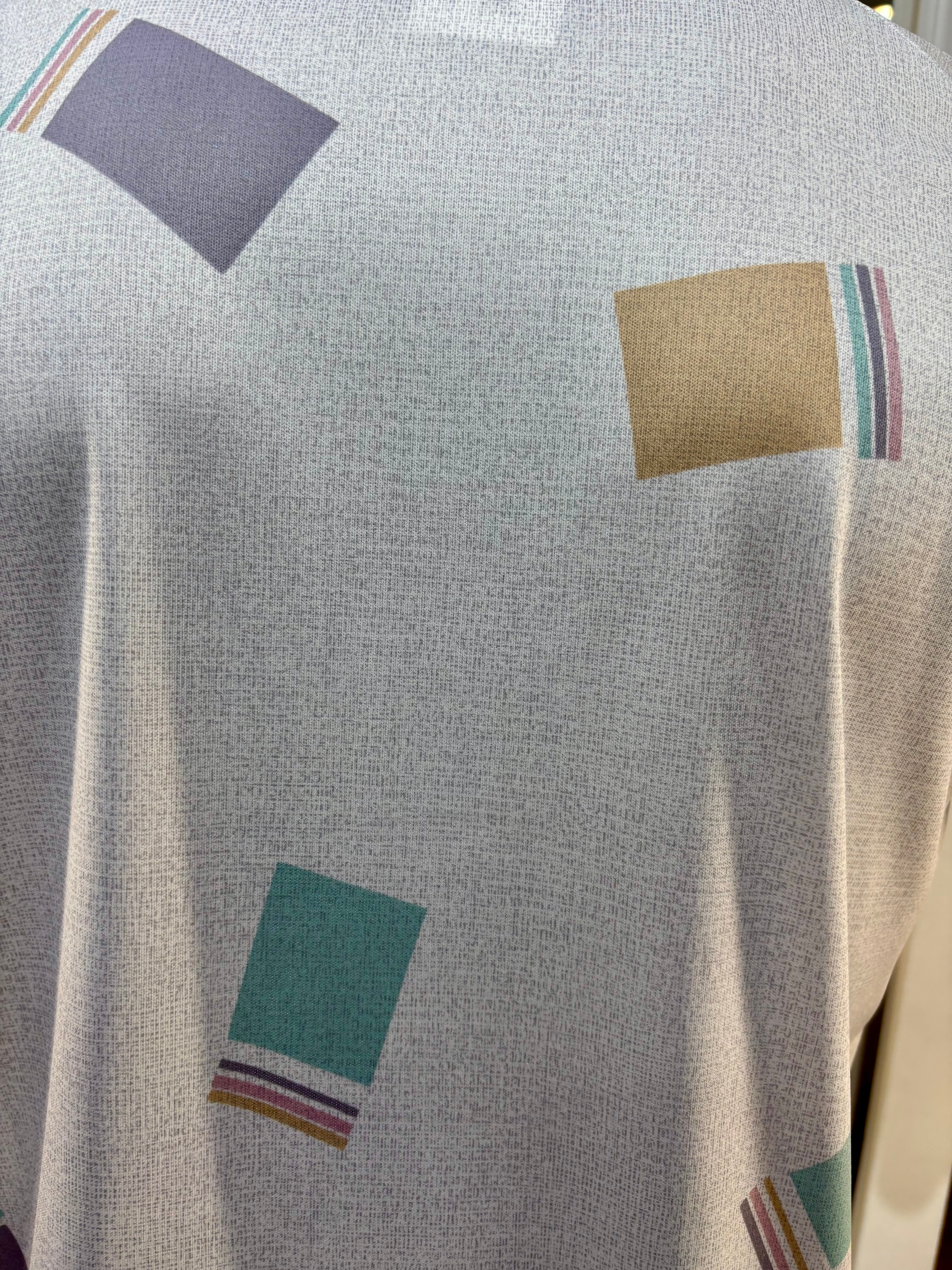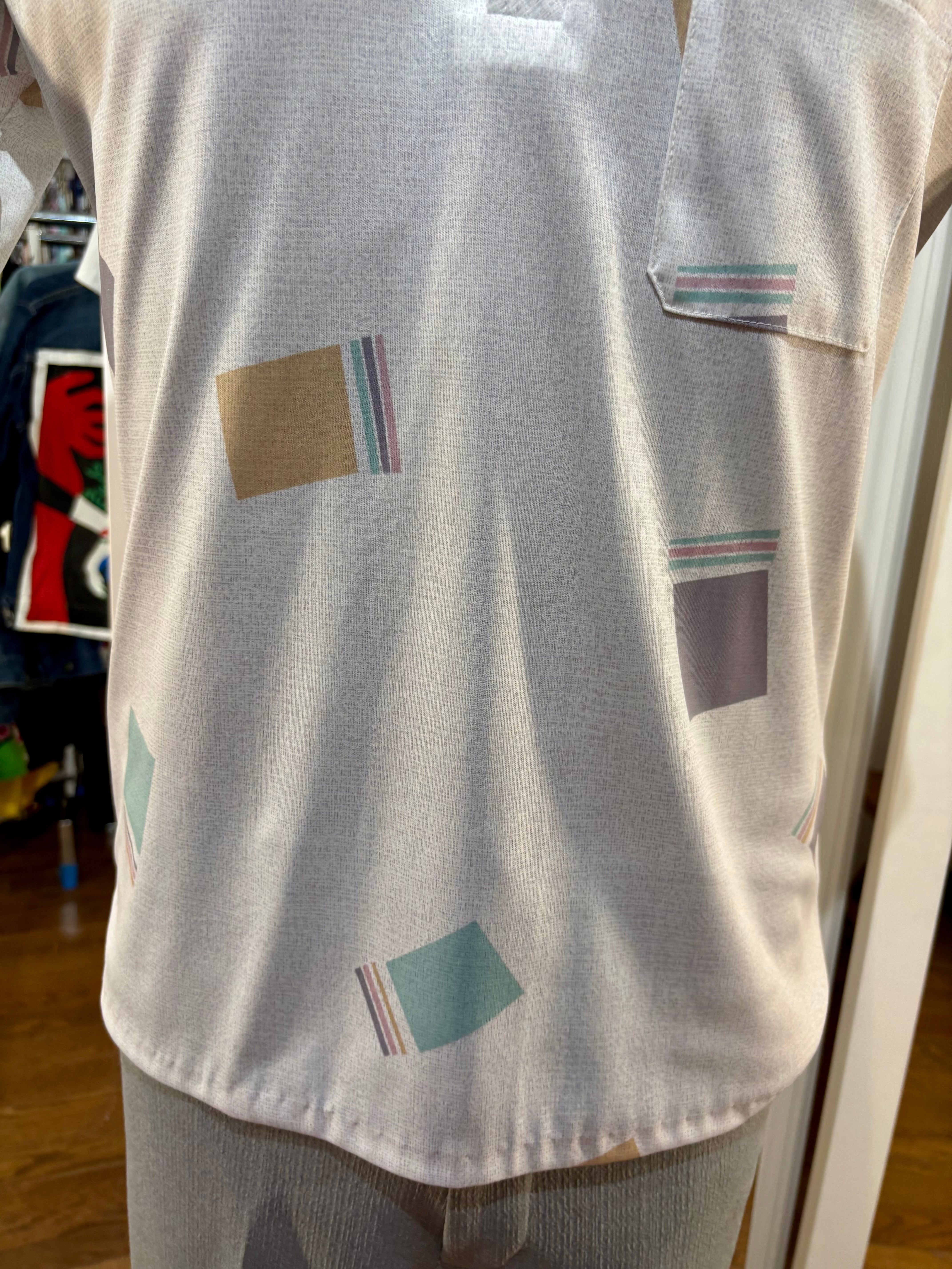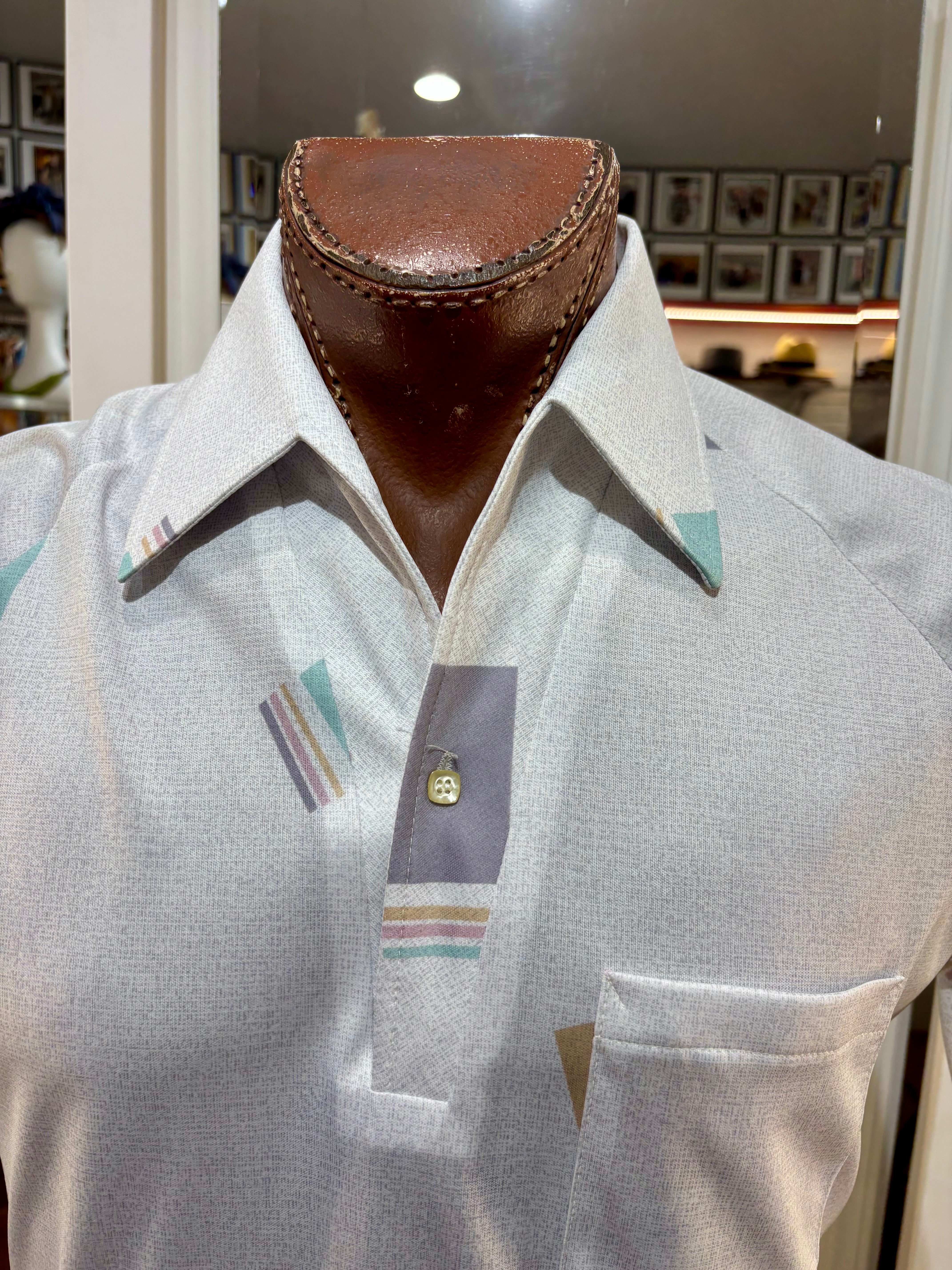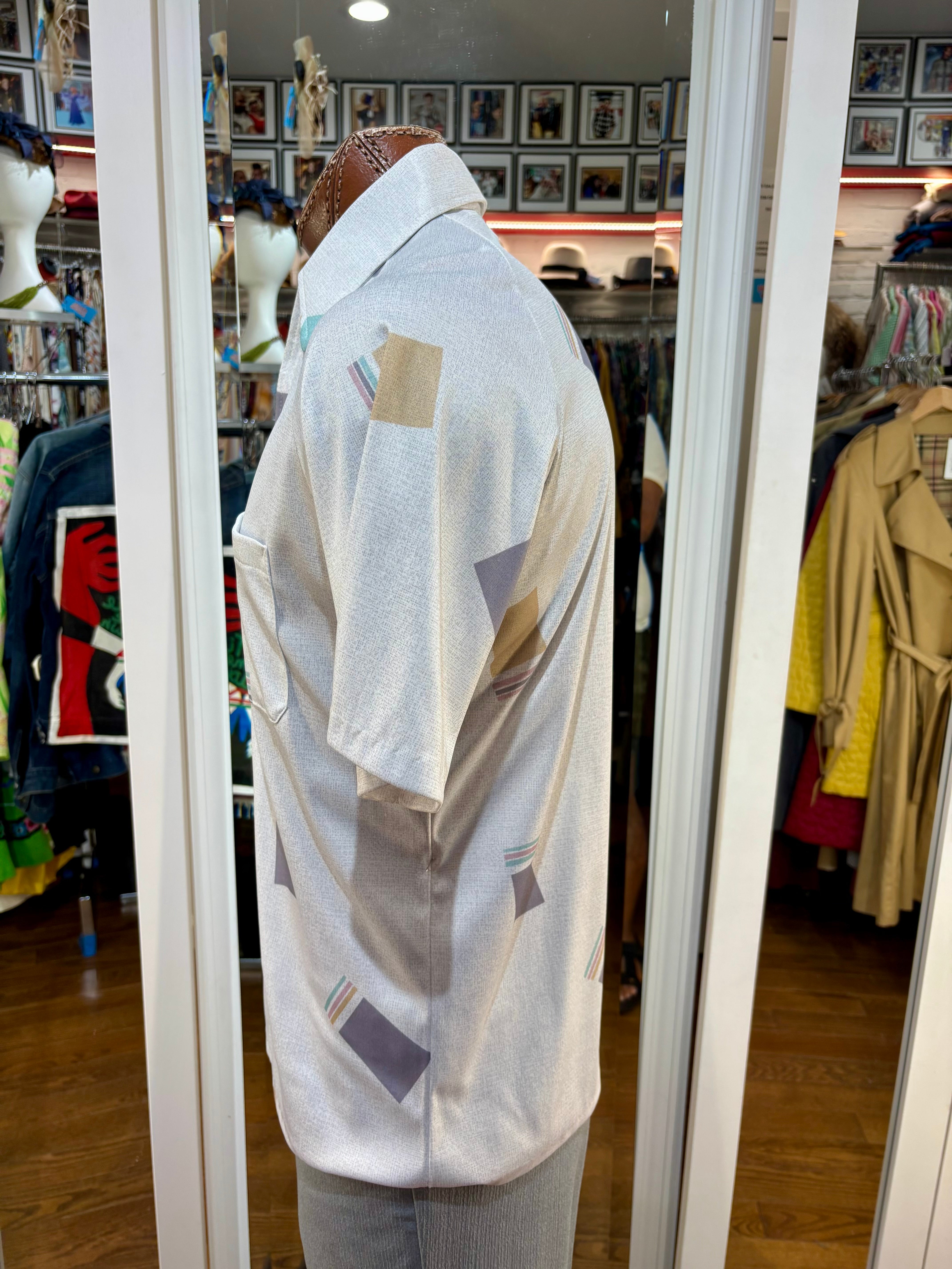 70’s Light Gray Multicolor Geometrical Square Print Disco Short Sleeve Polo By Lilly Daché