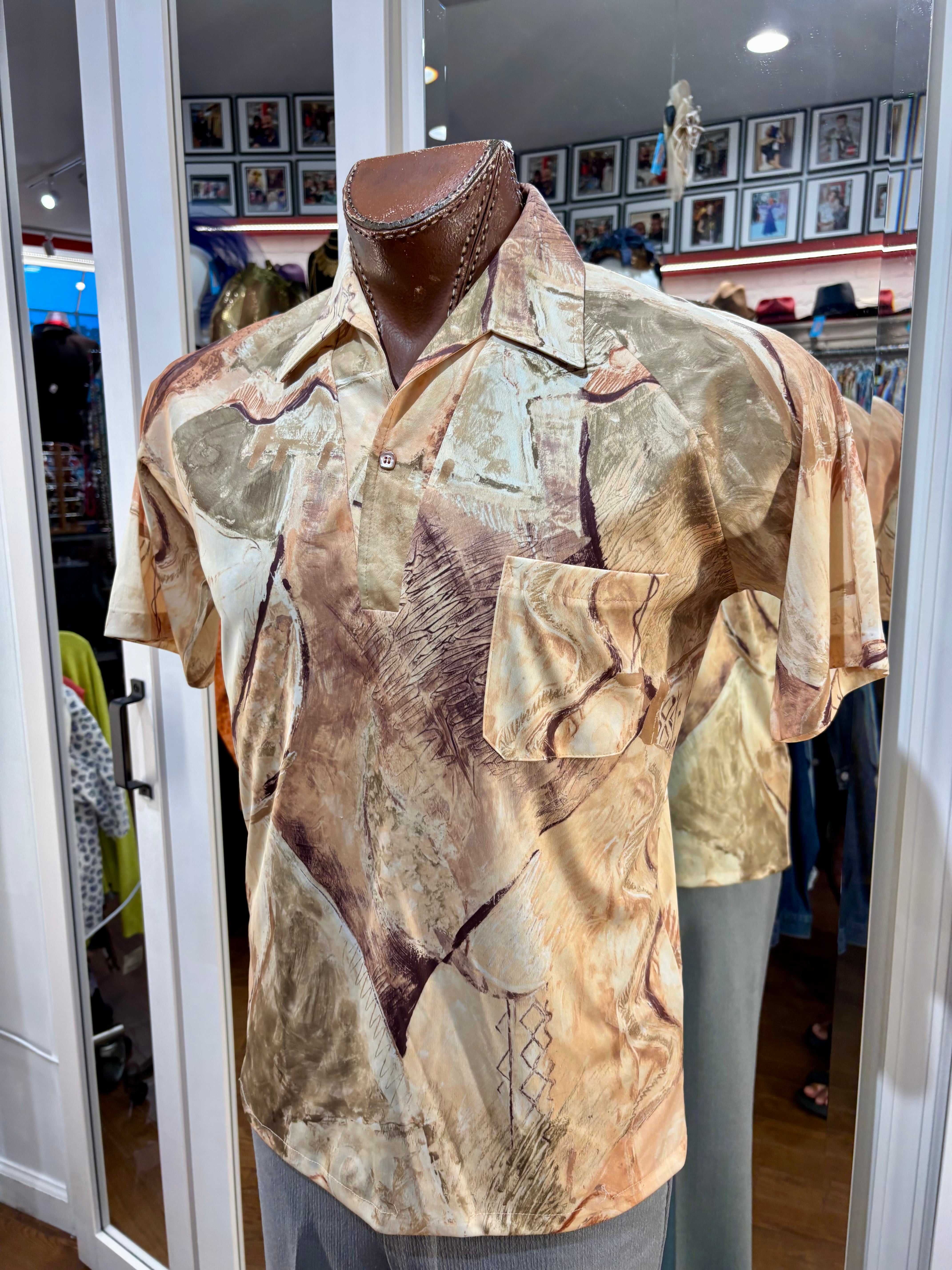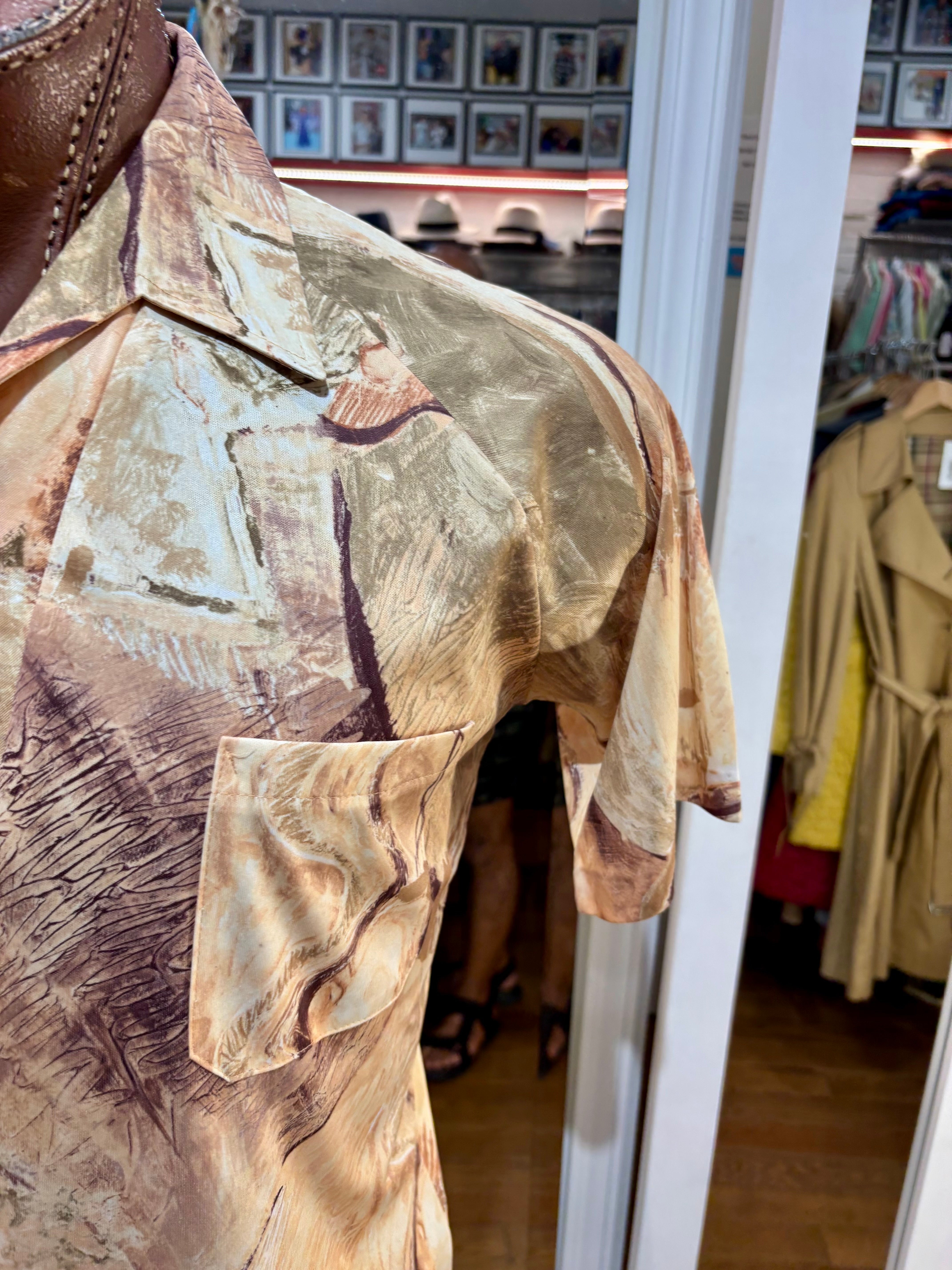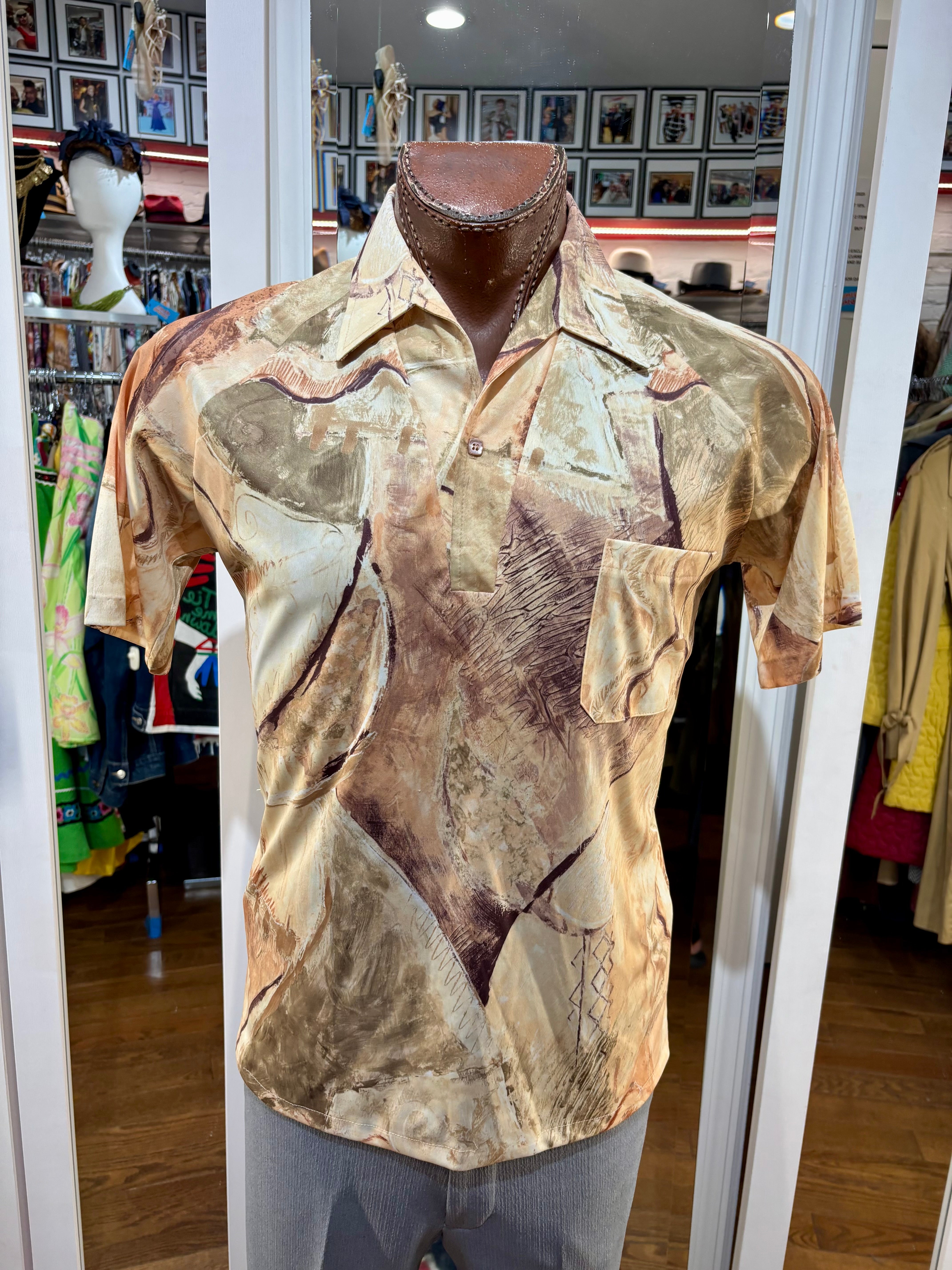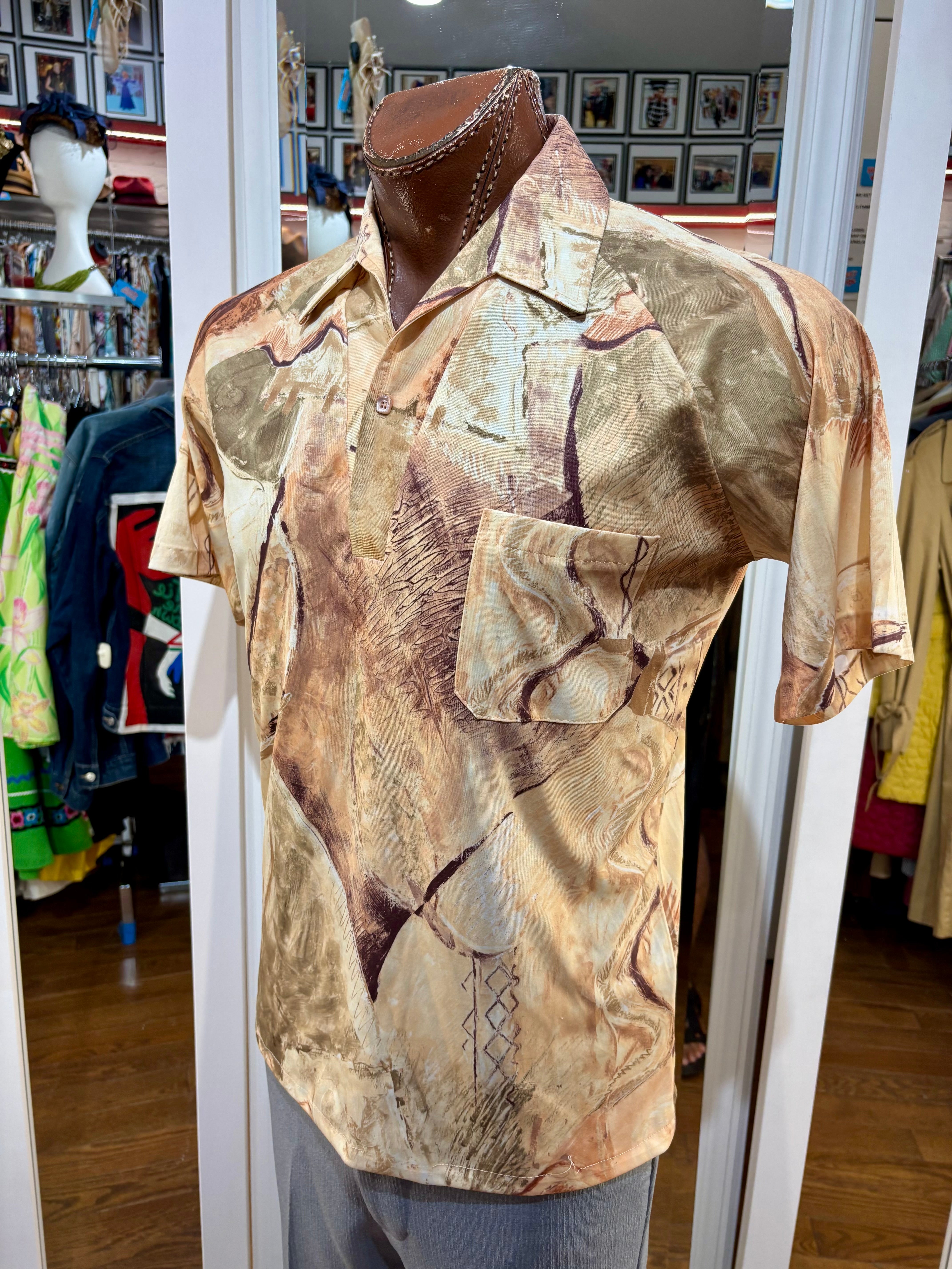 70’s Beige Multicolored Abstract Print Disco Short Sleeve Collared Polo By Lilly Daché