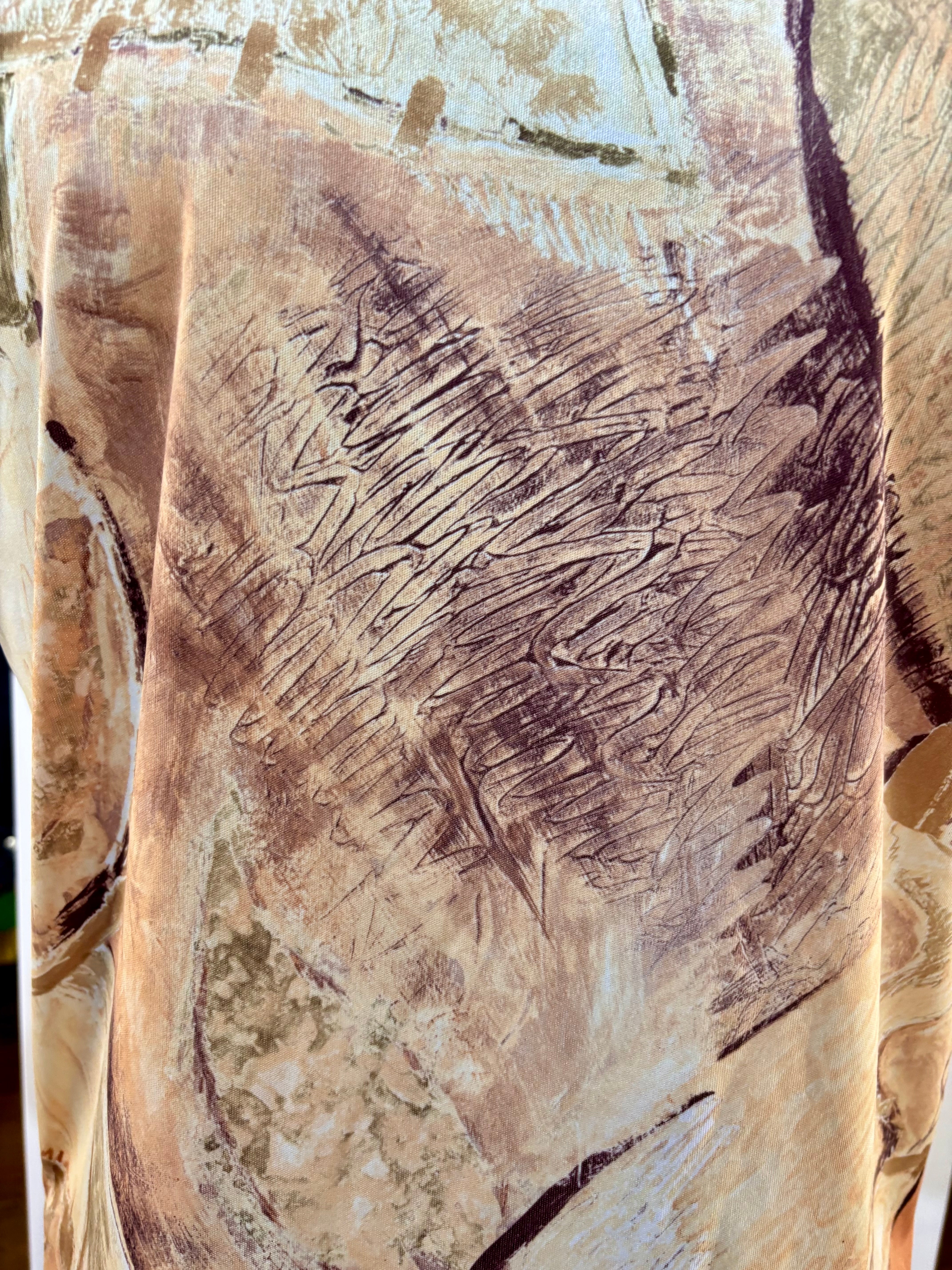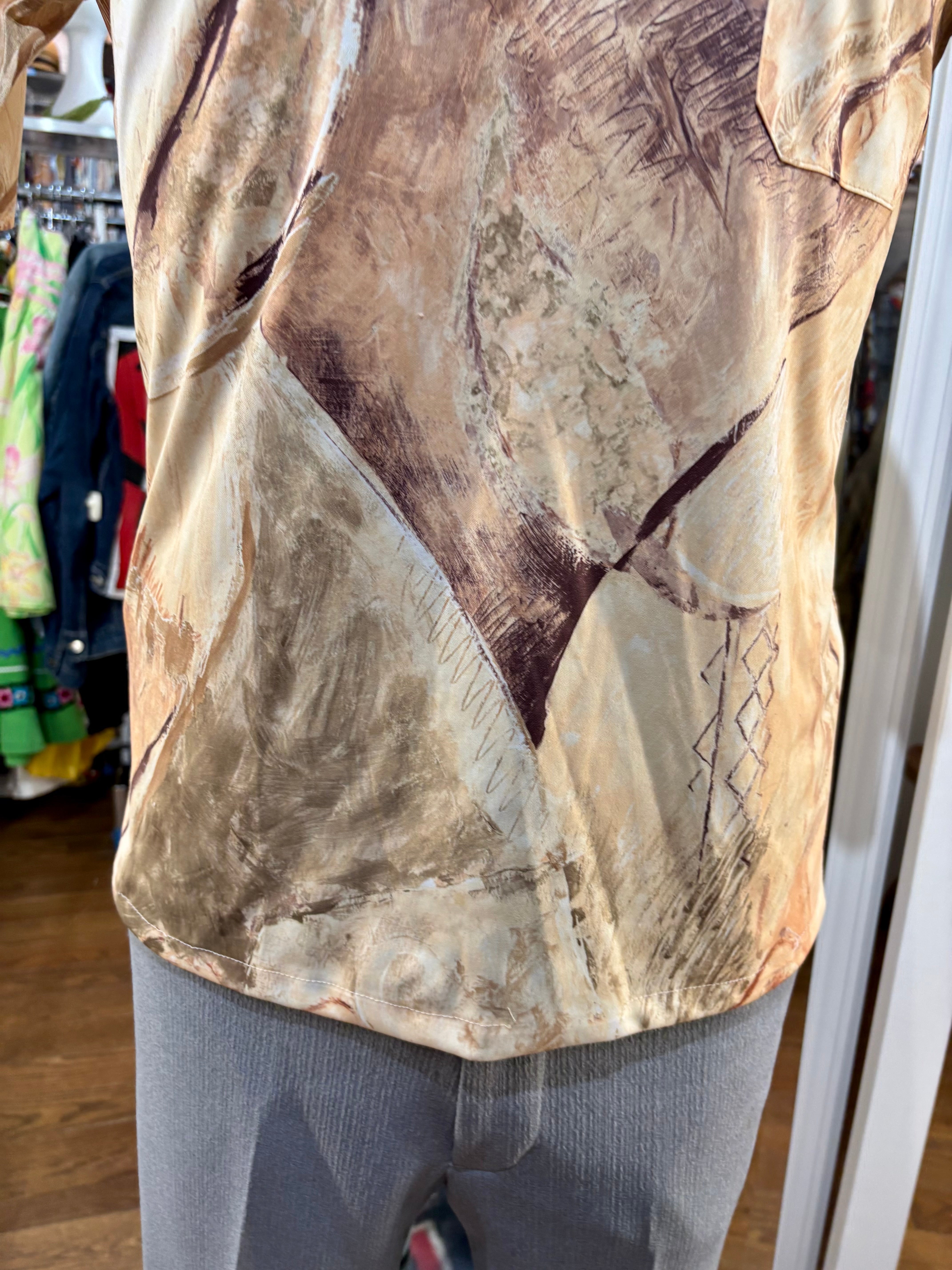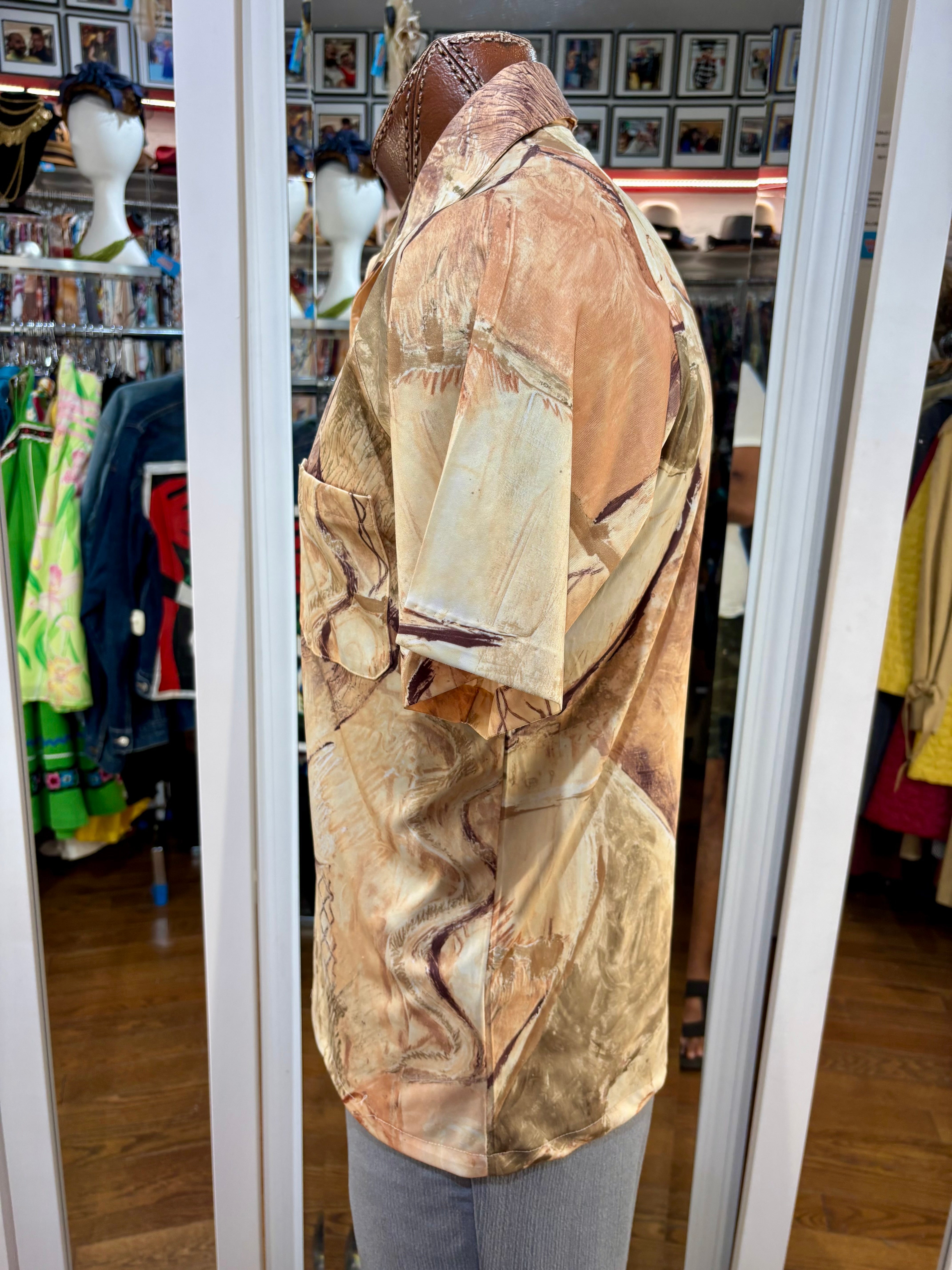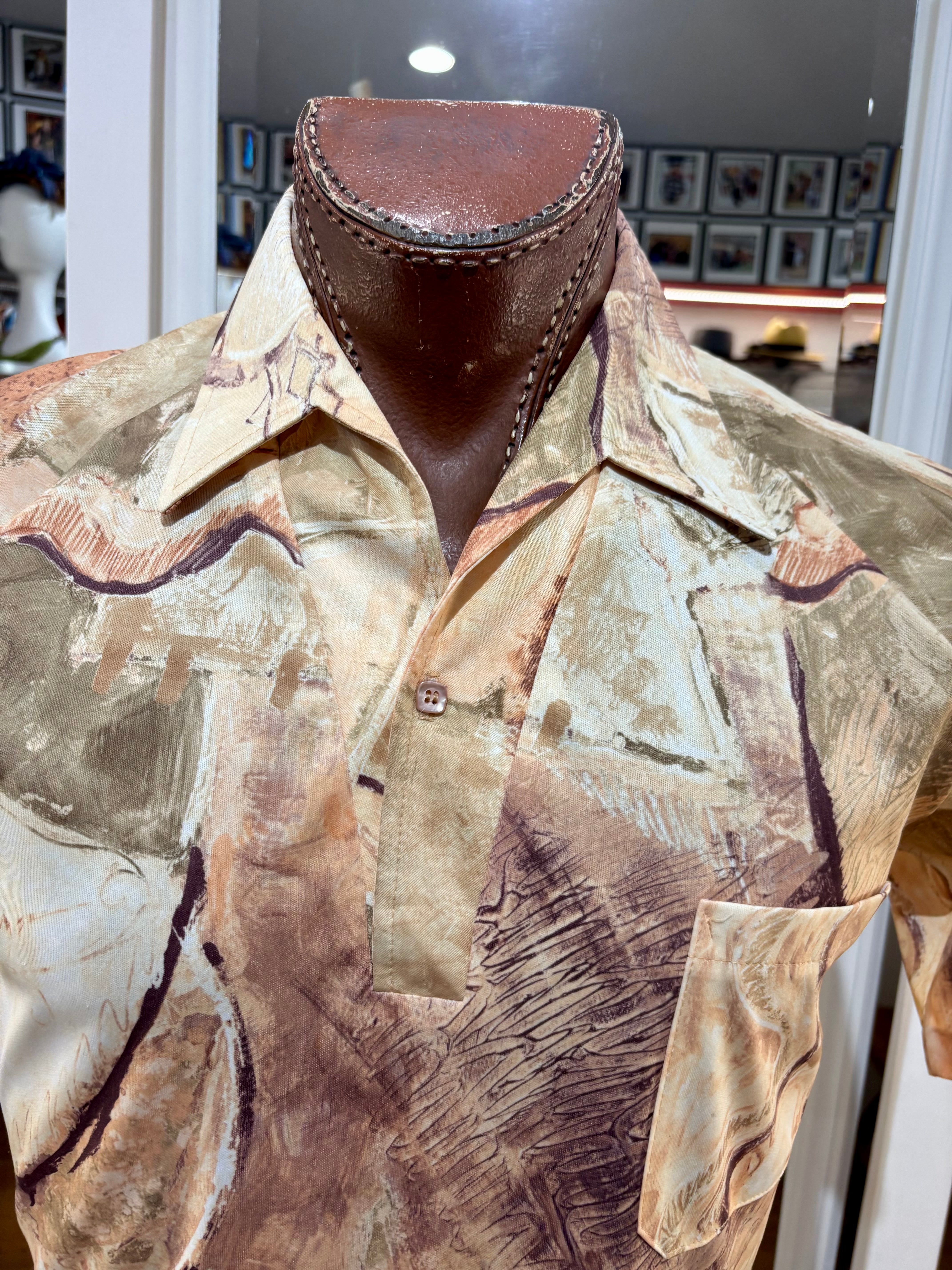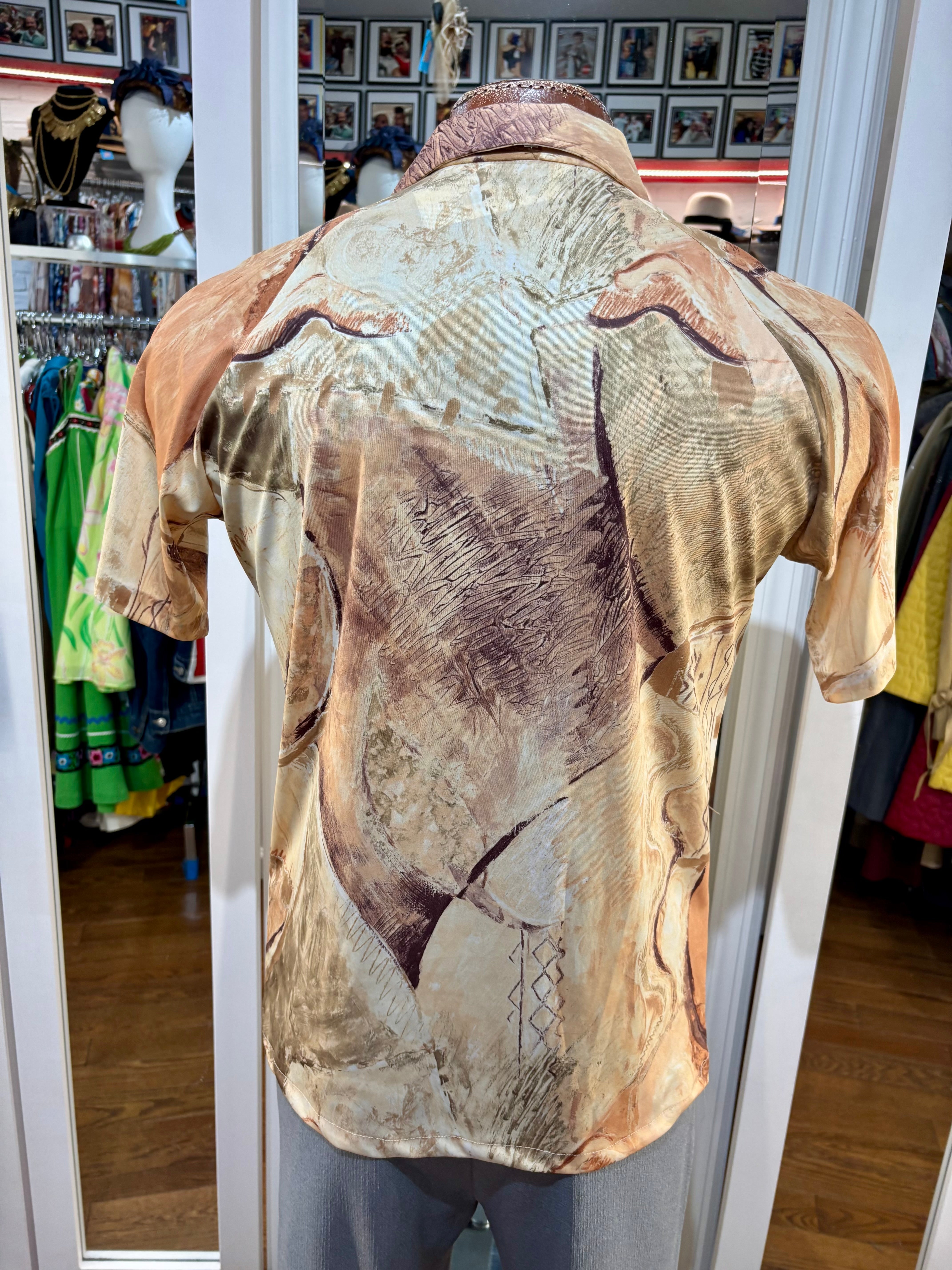 70’s Beige Multicolored Abstract Print Disco Short Sleeve Collared Polo By Lilly Daché