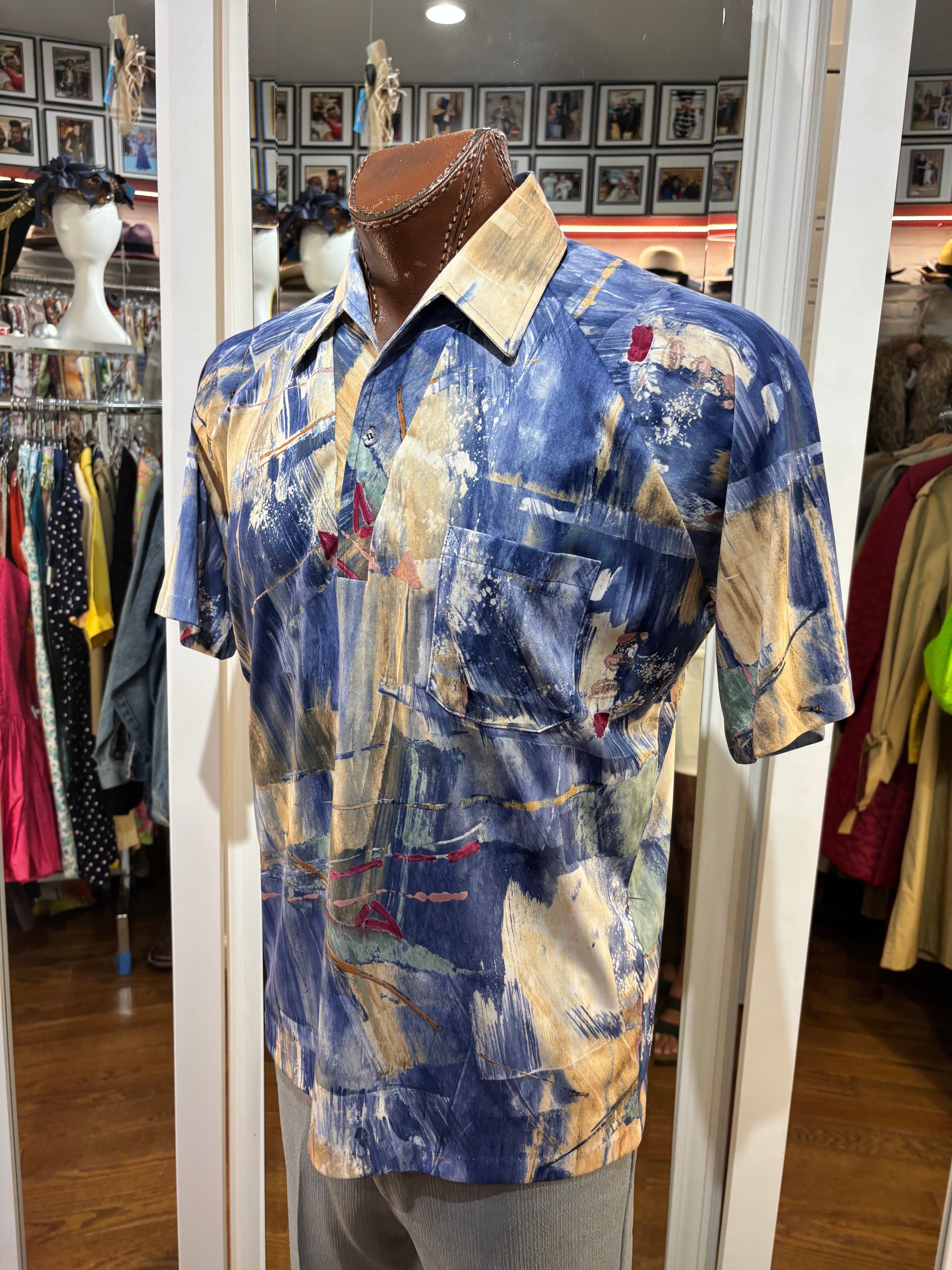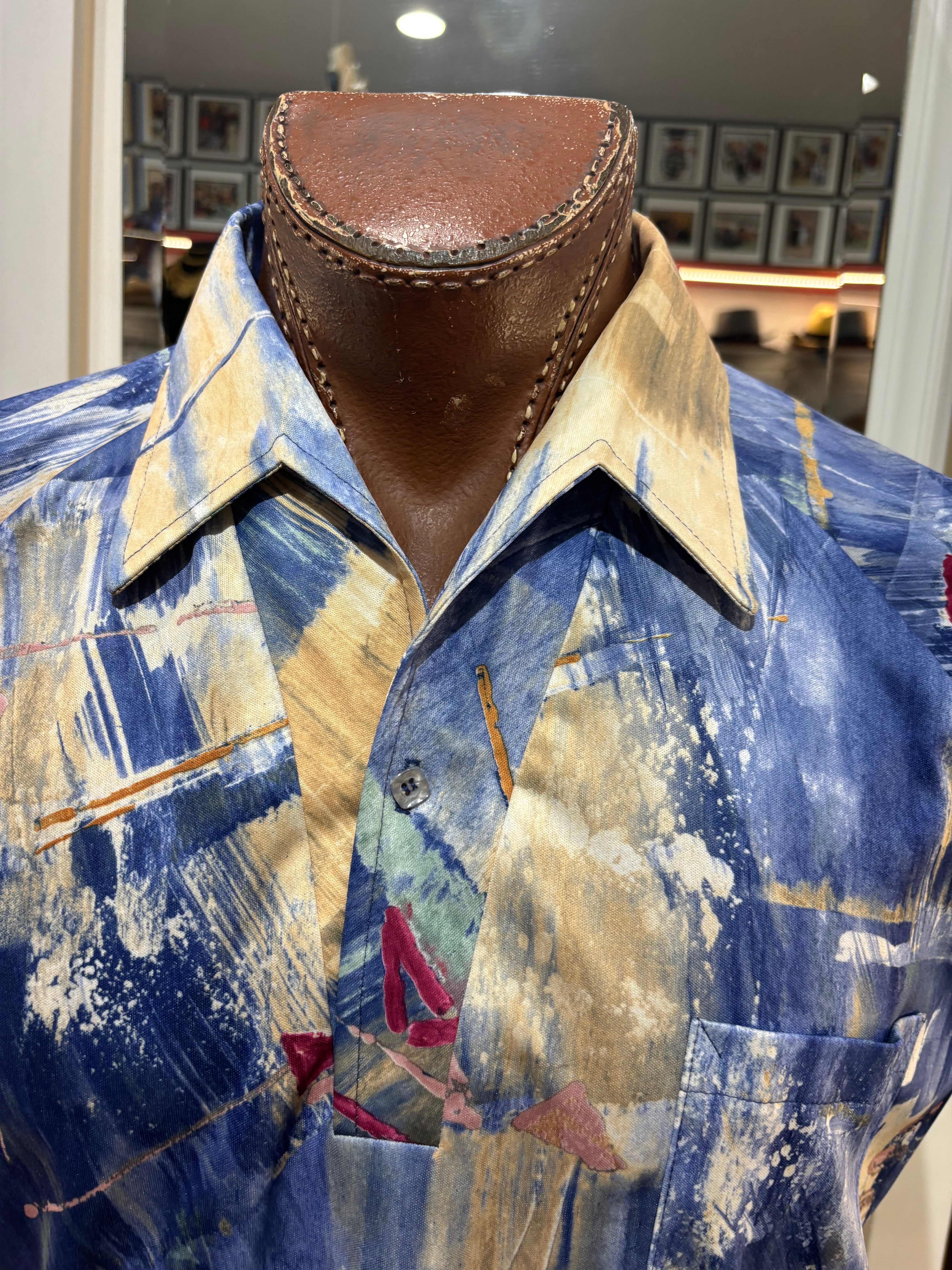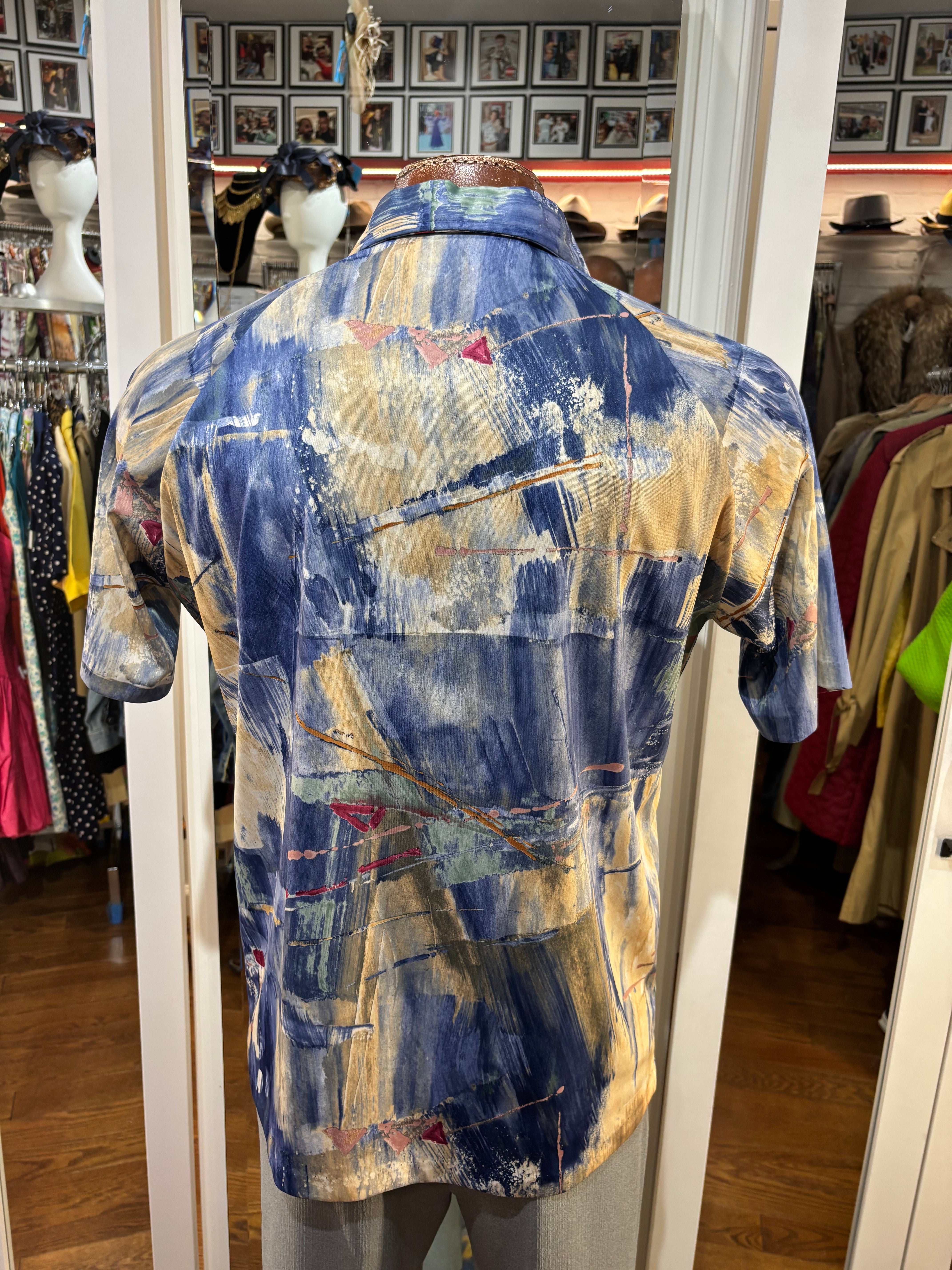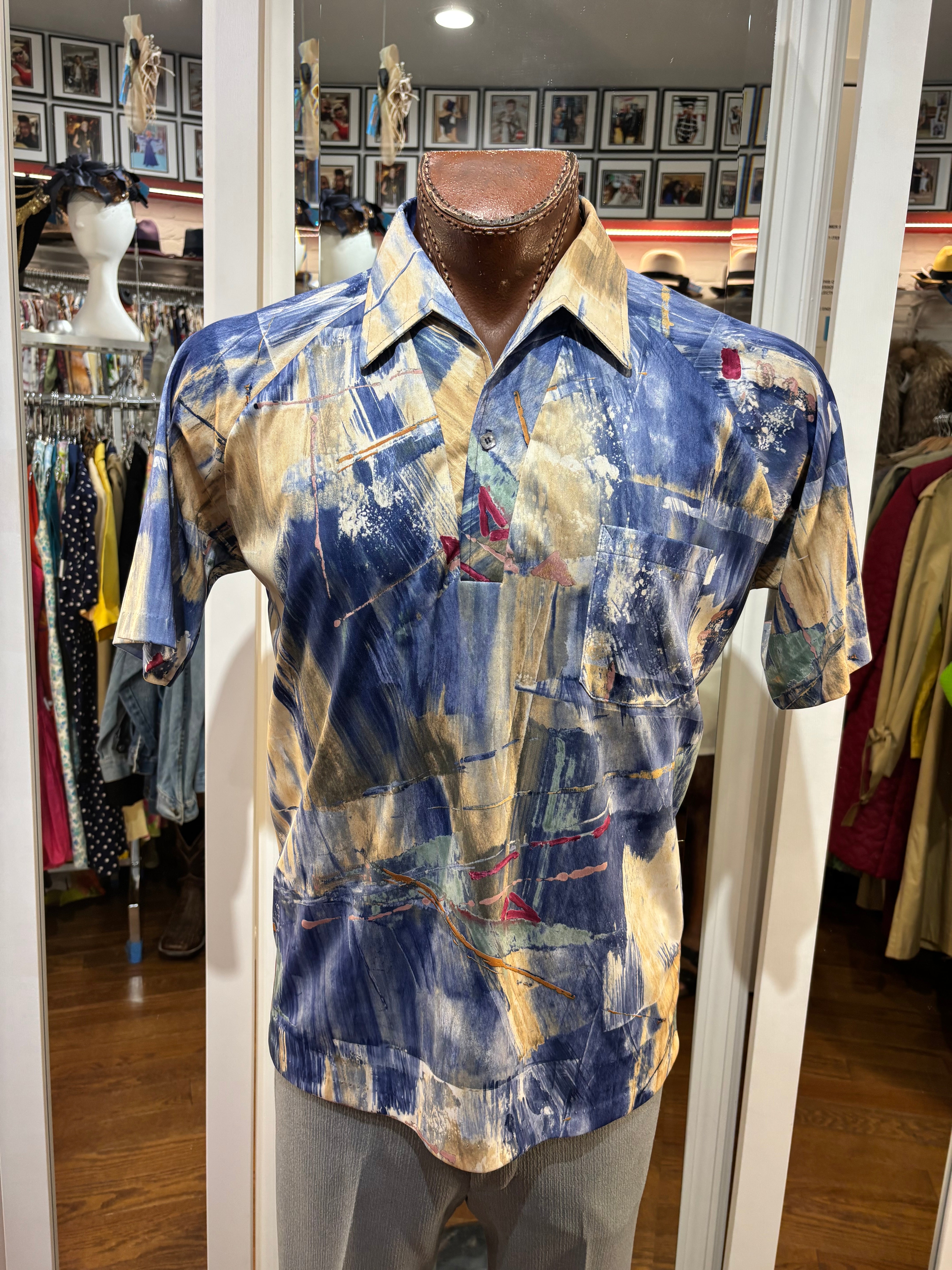 70’s Blue And Sand Abstract Multicolor Print Collared Disco Polo Shirt By Lilly Daché