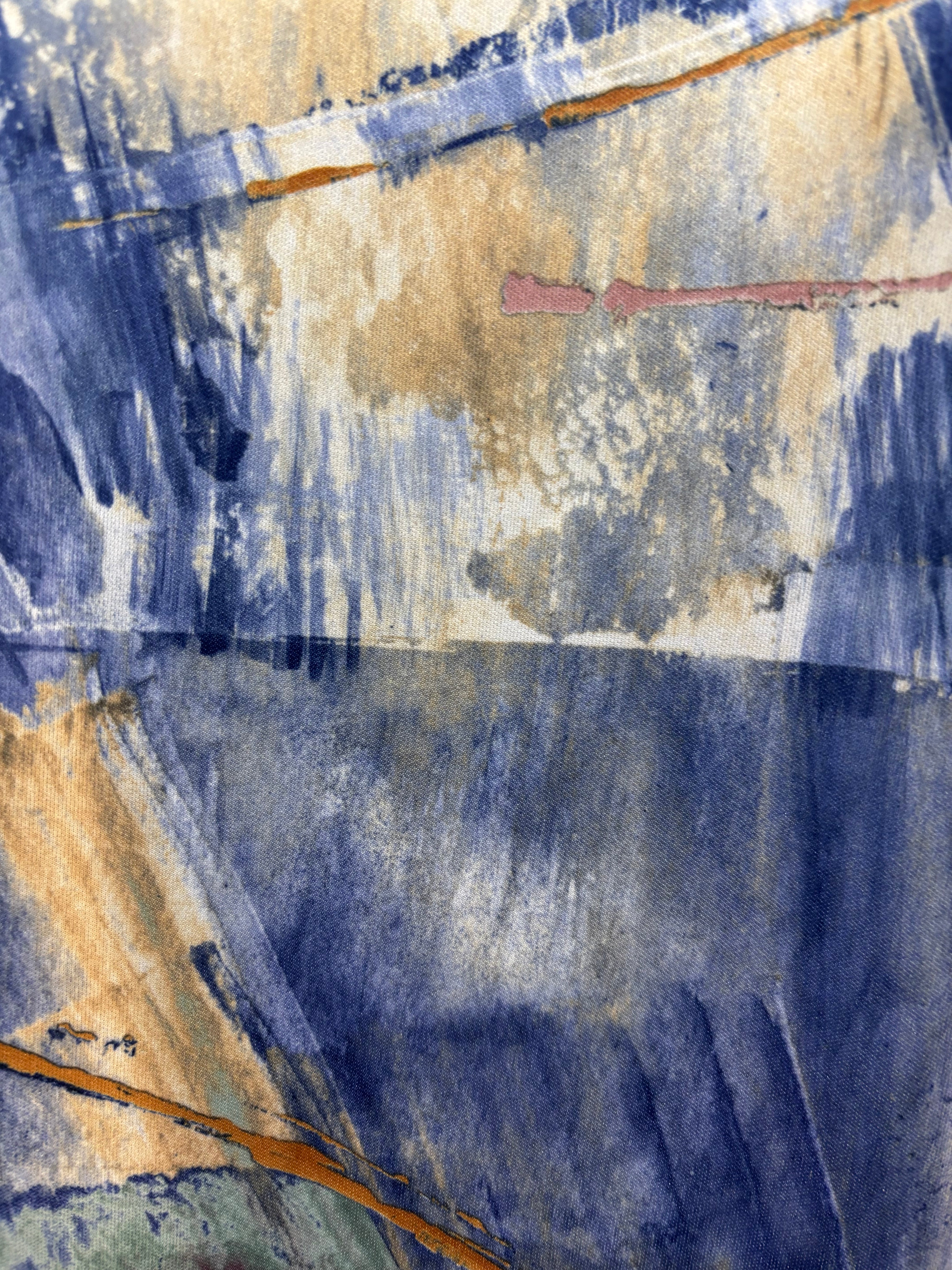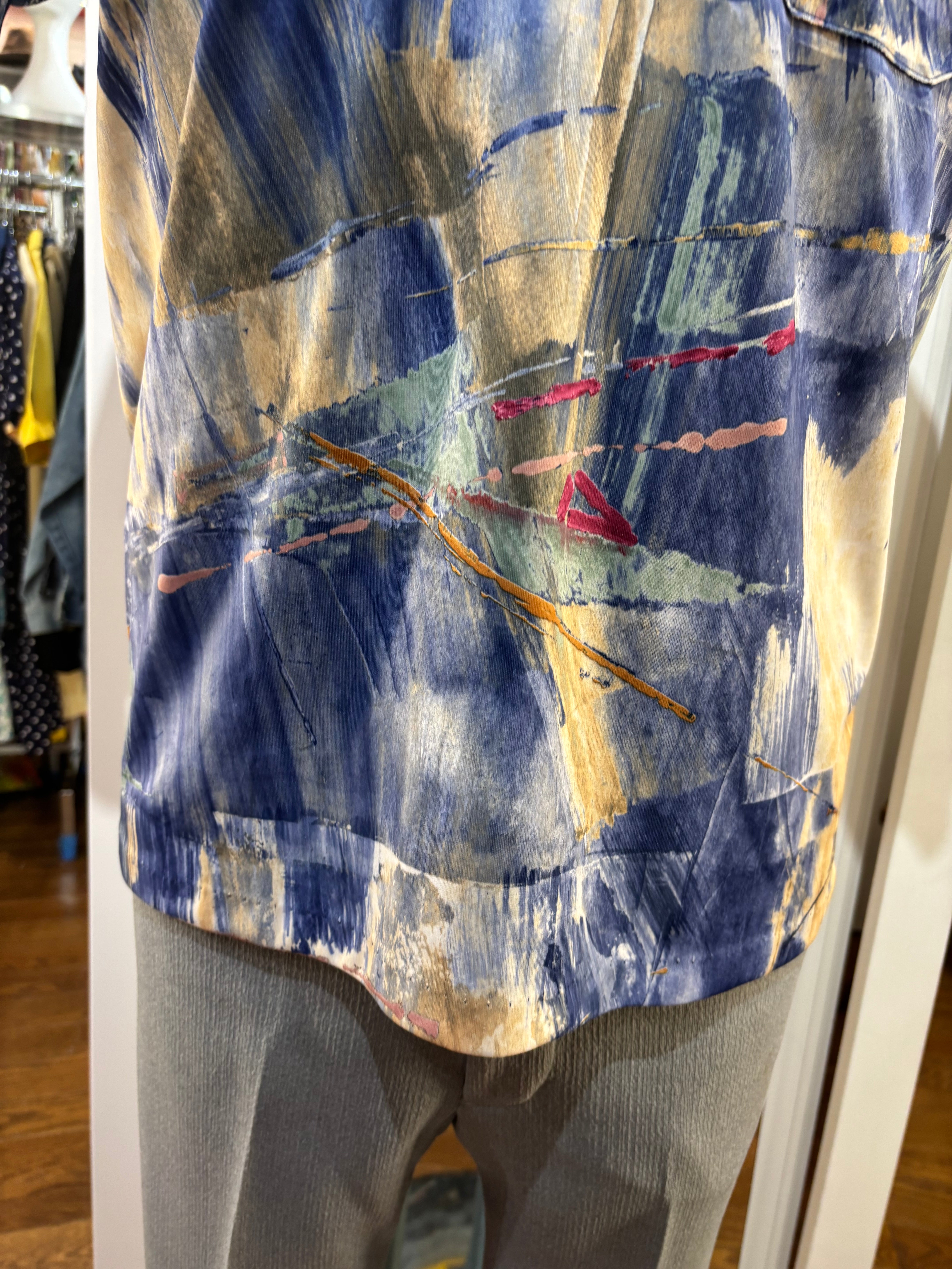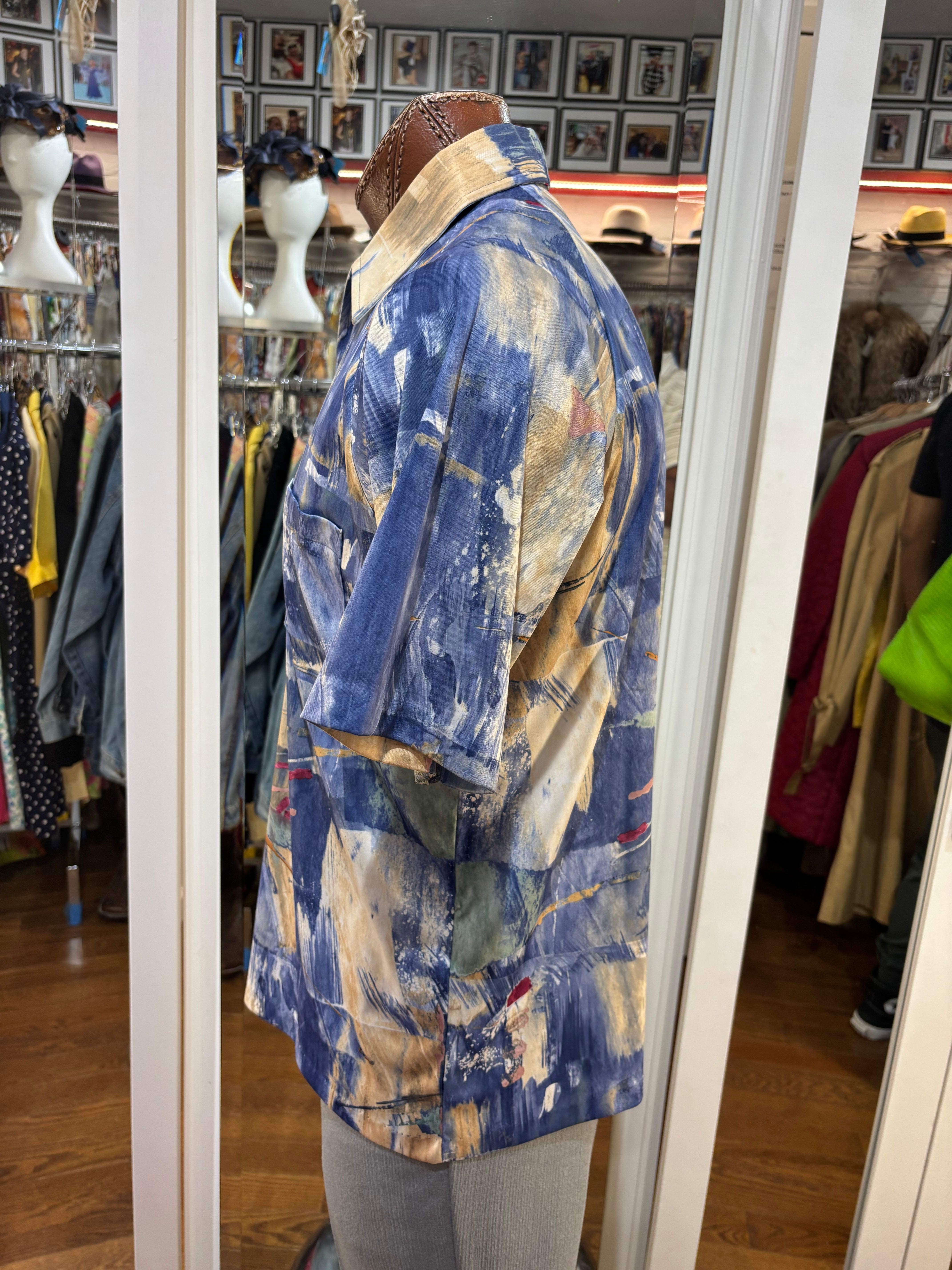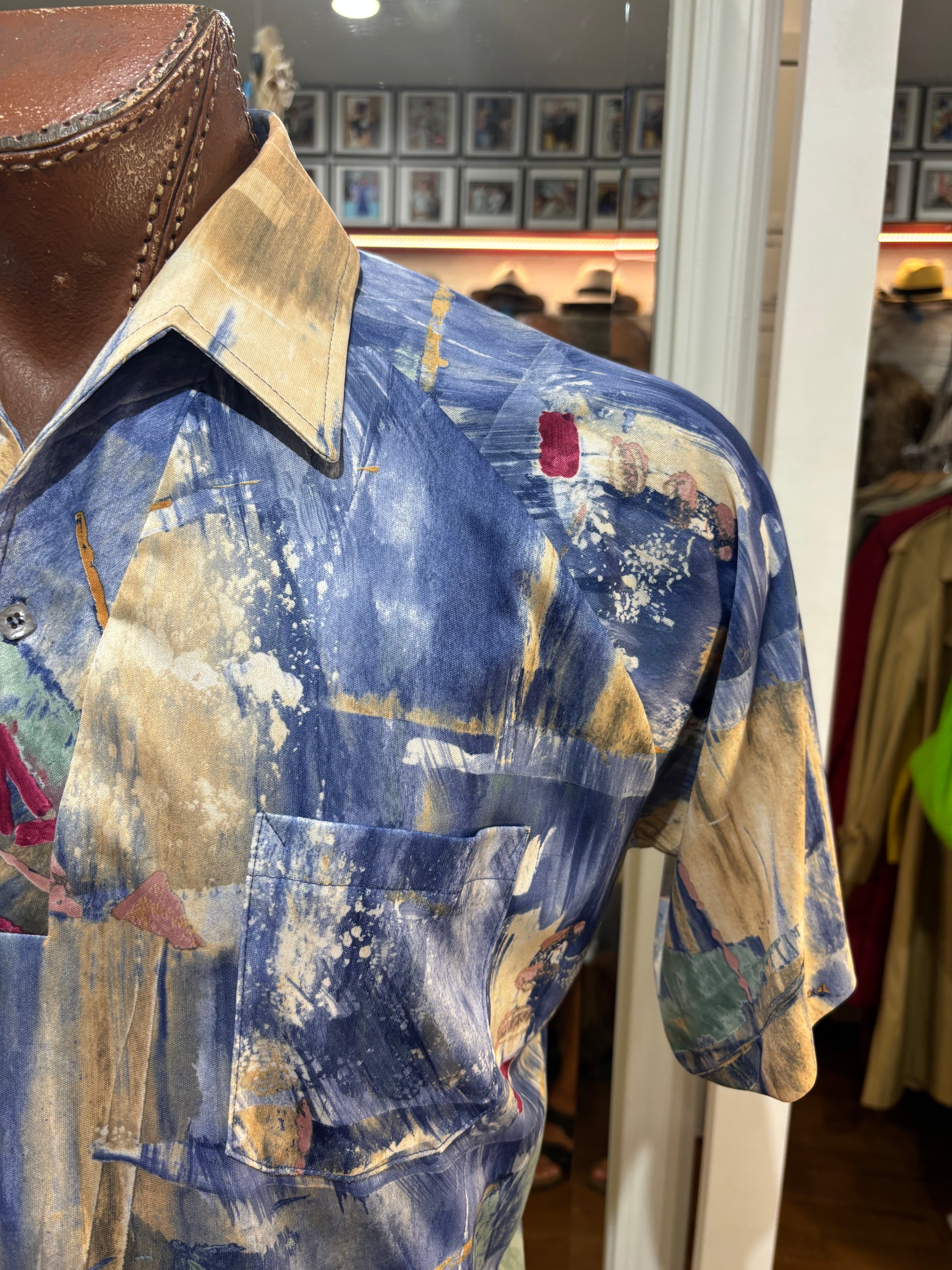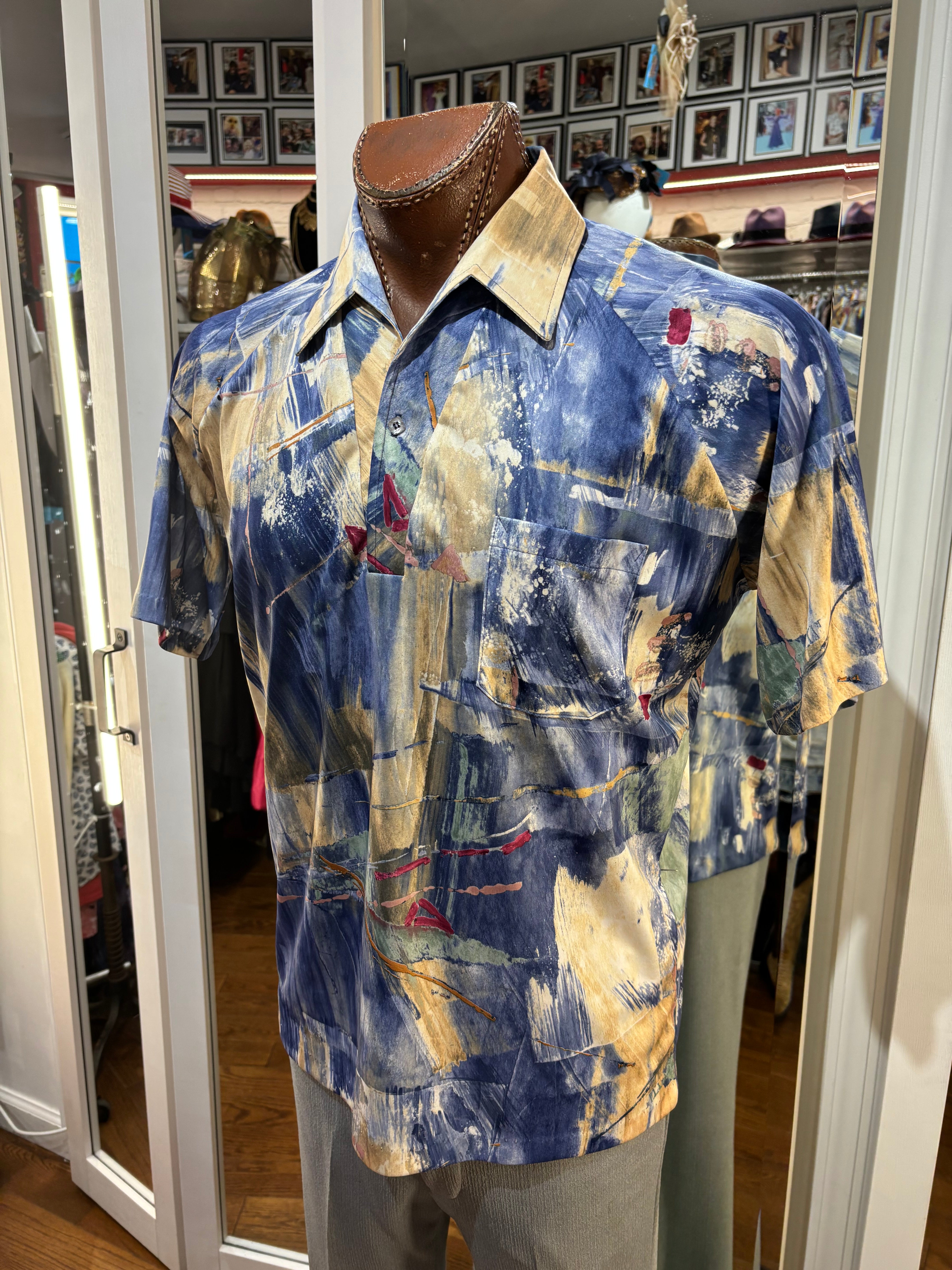 70’s Blue And Sand Abstract Multicolor Print Collared Disco Polo Shirt By Lilly Daché