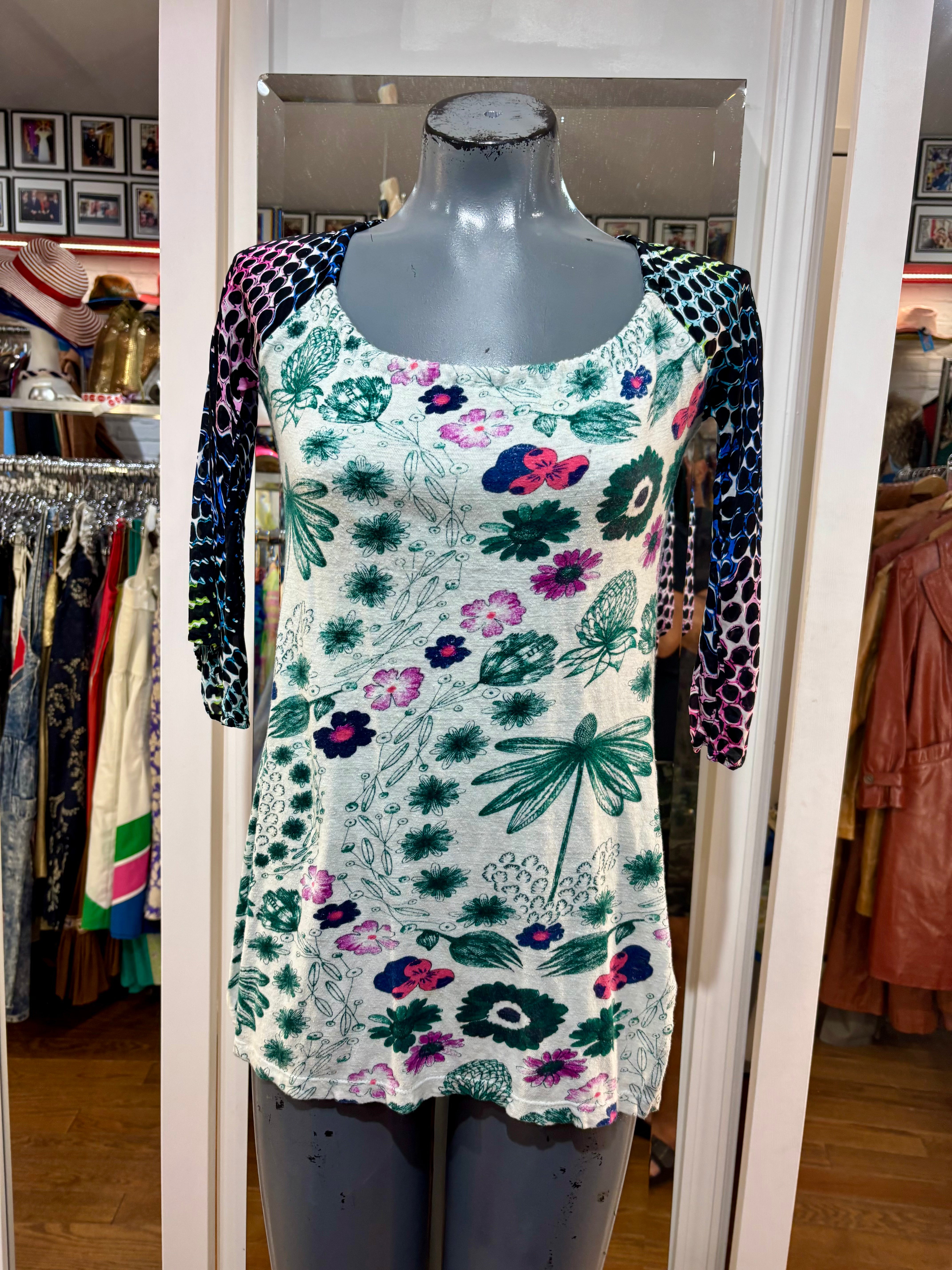 00’s Off White & Green Flower Print 3/4 Length Sleeve Top By Custo Barcelona