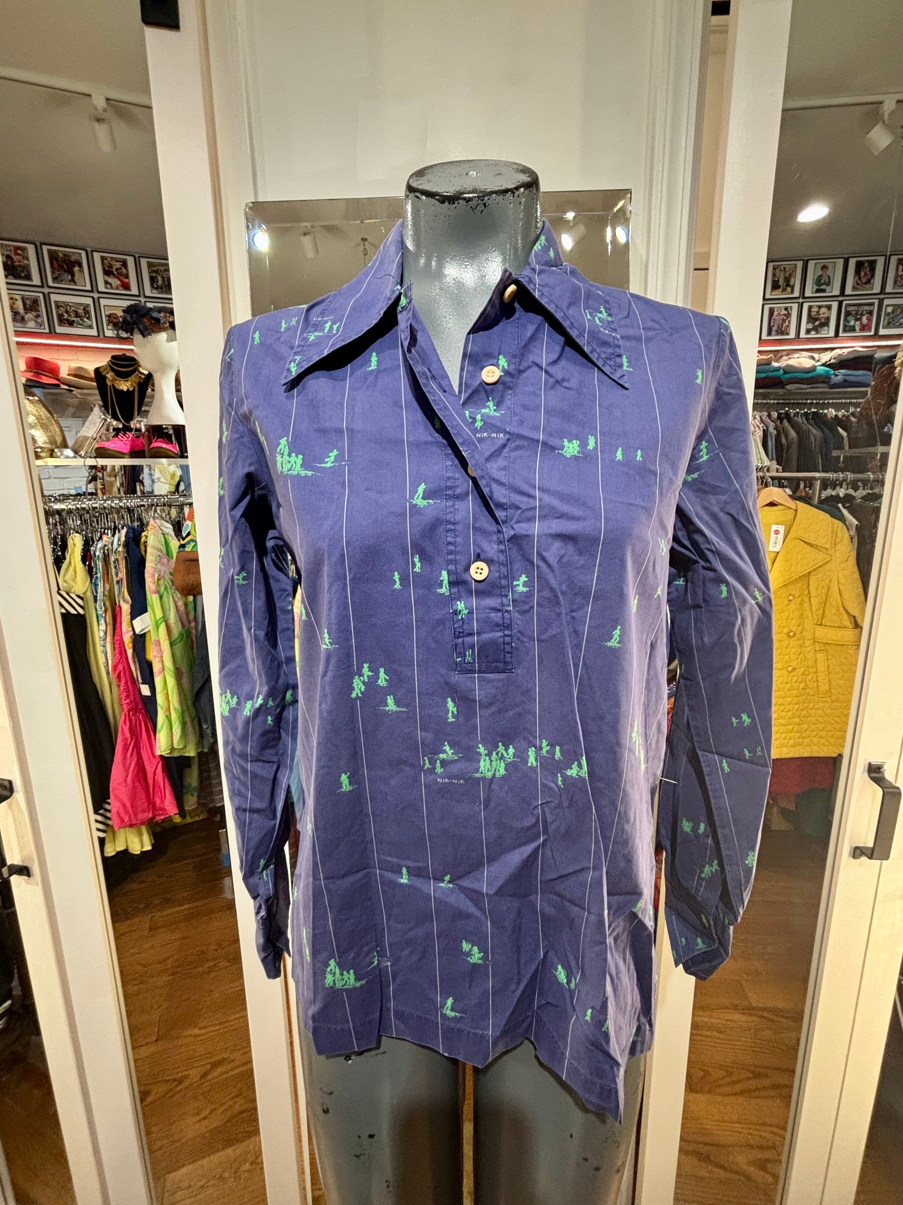 70s Blue And Green Flower Print 3 Button Pull Blouse By Nik Nik