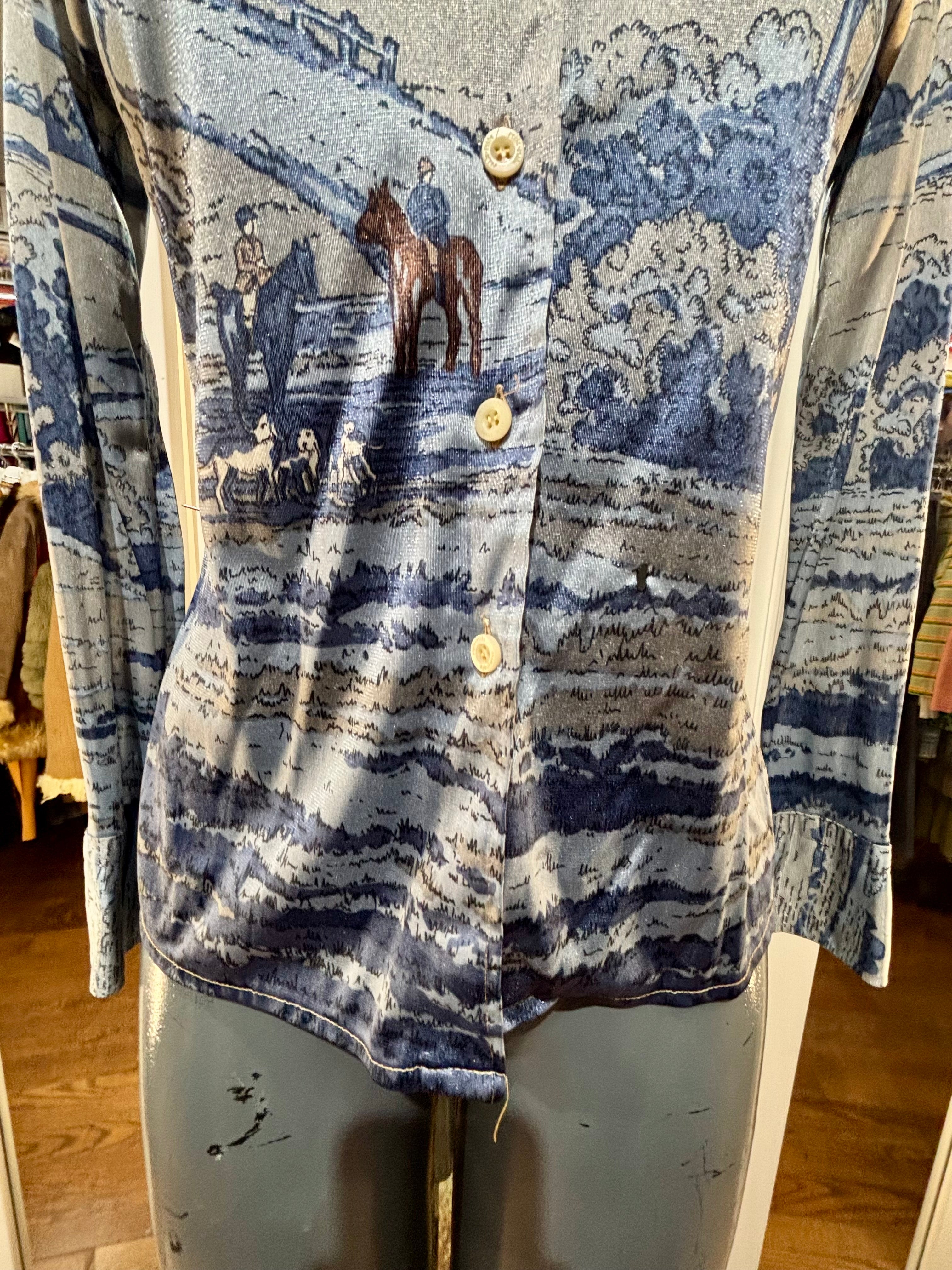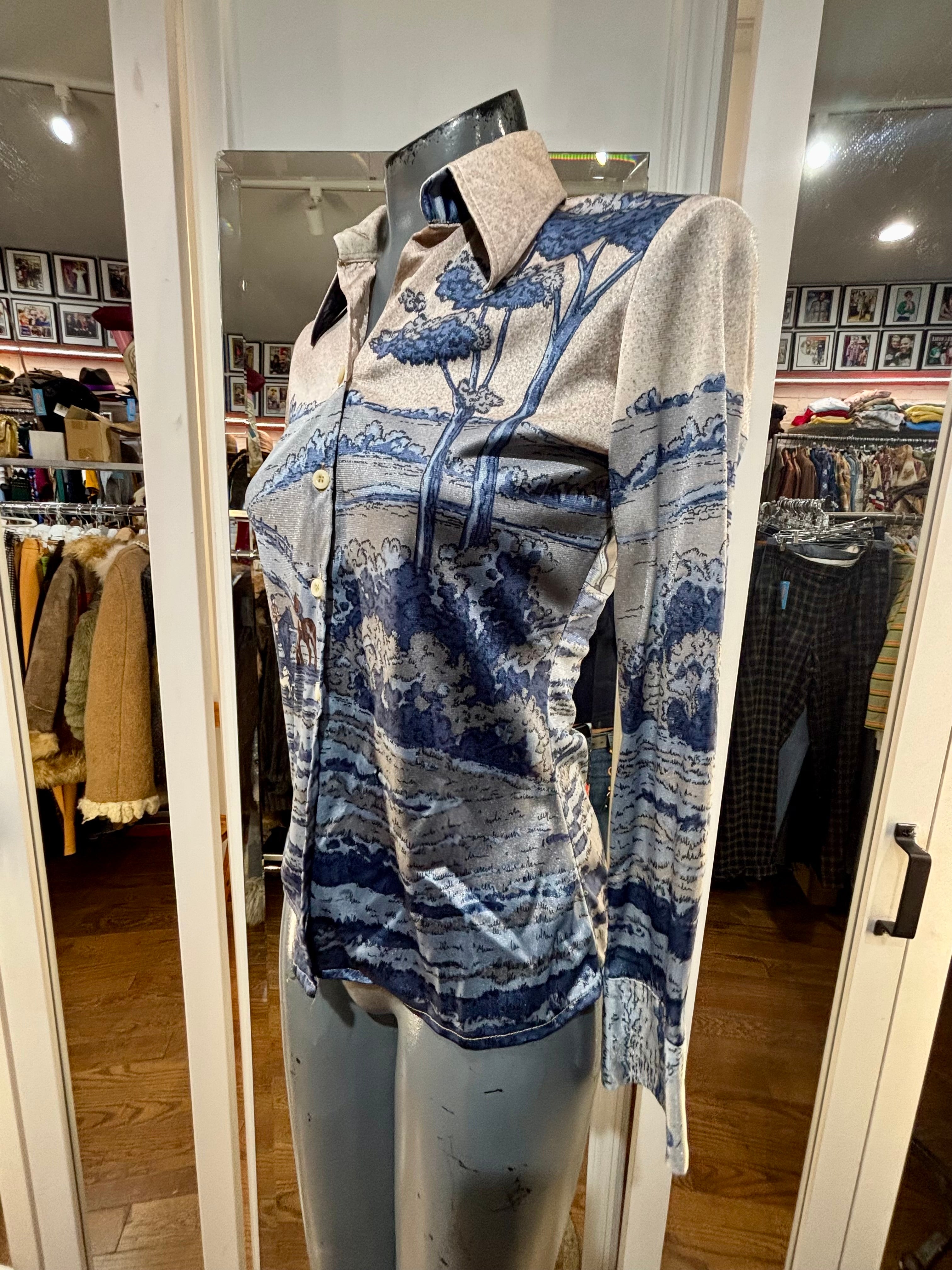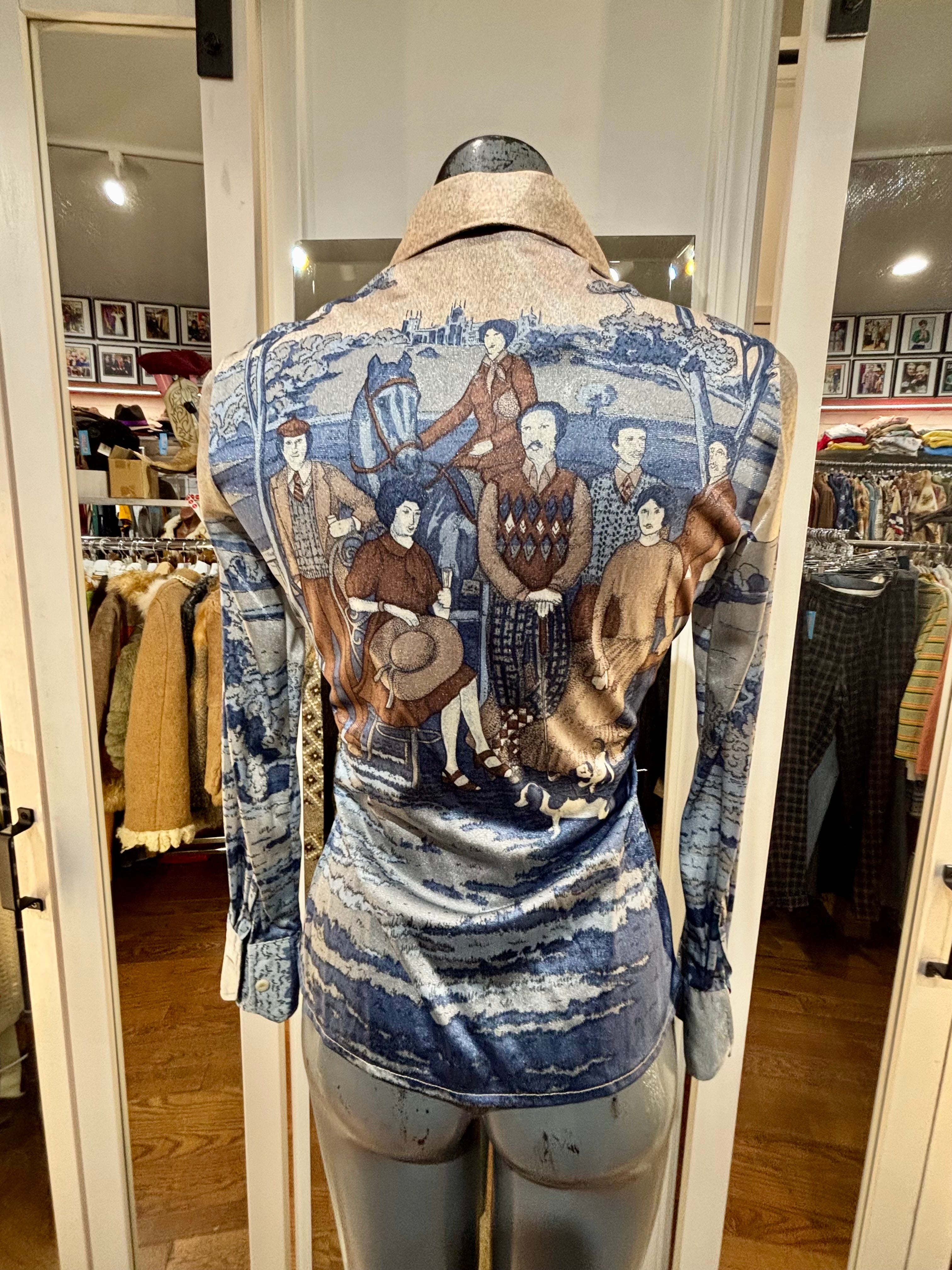 70’s Blue And Beige Disco Blouse With Medieval Scenery By Nik Nik