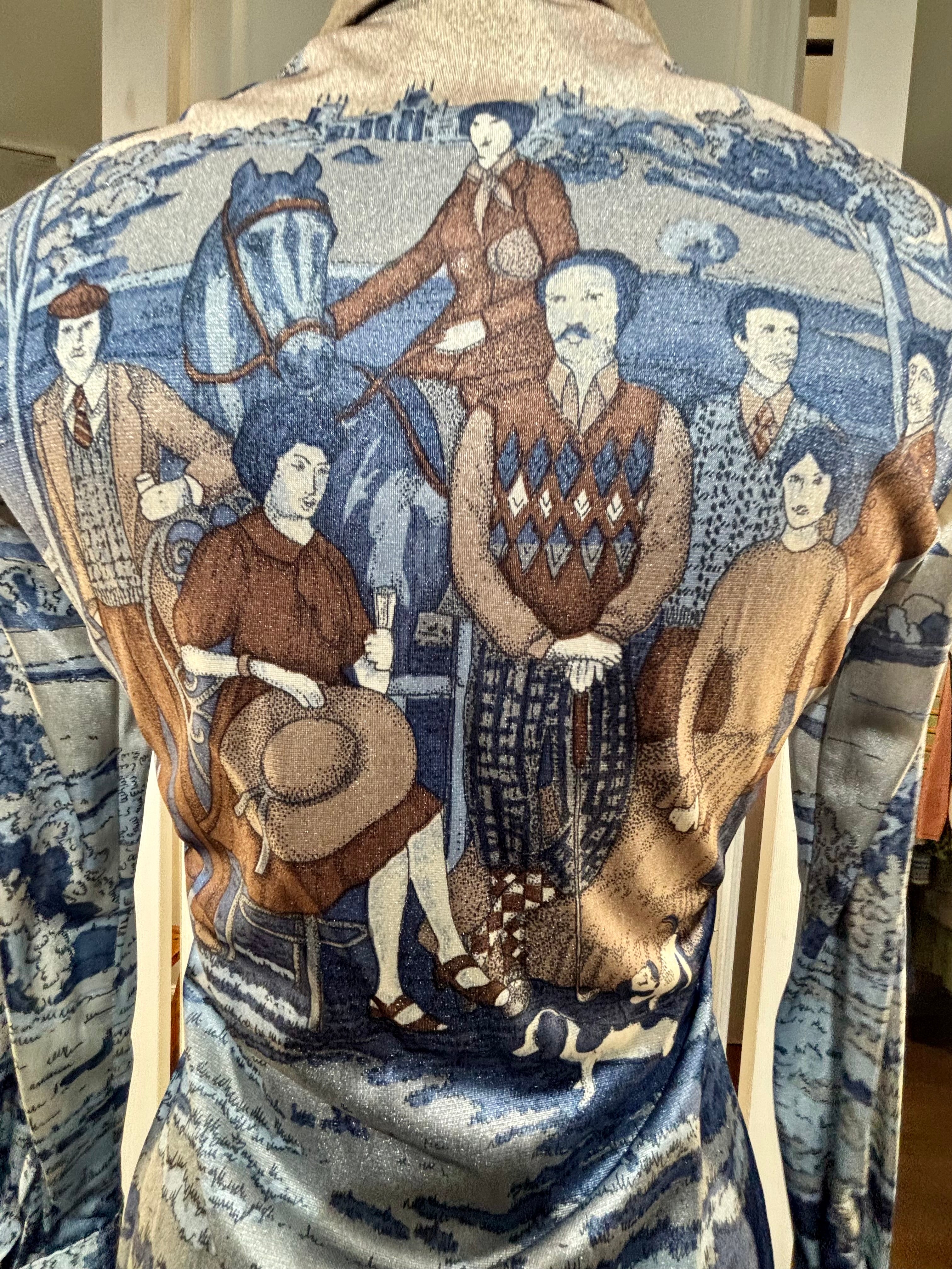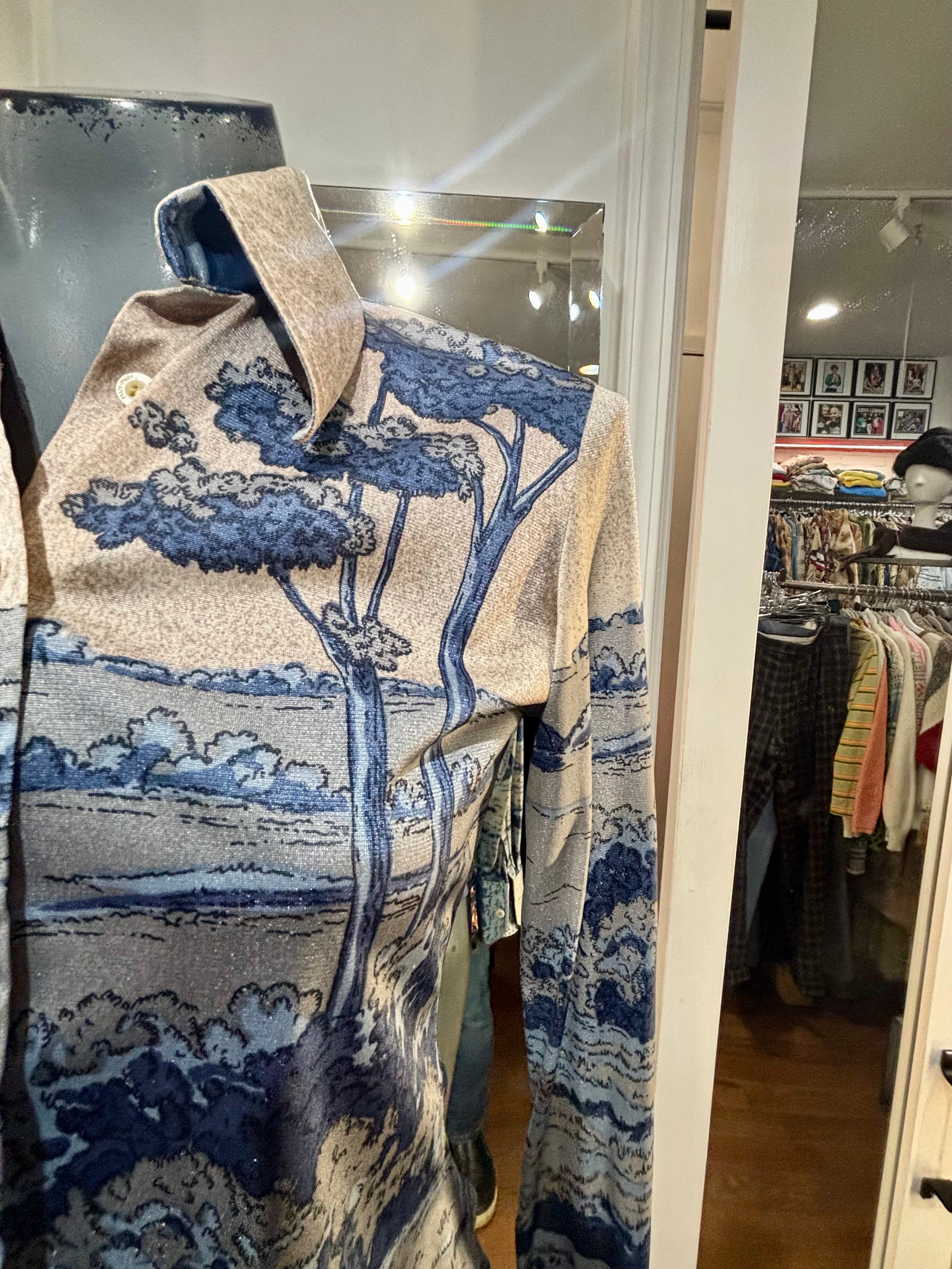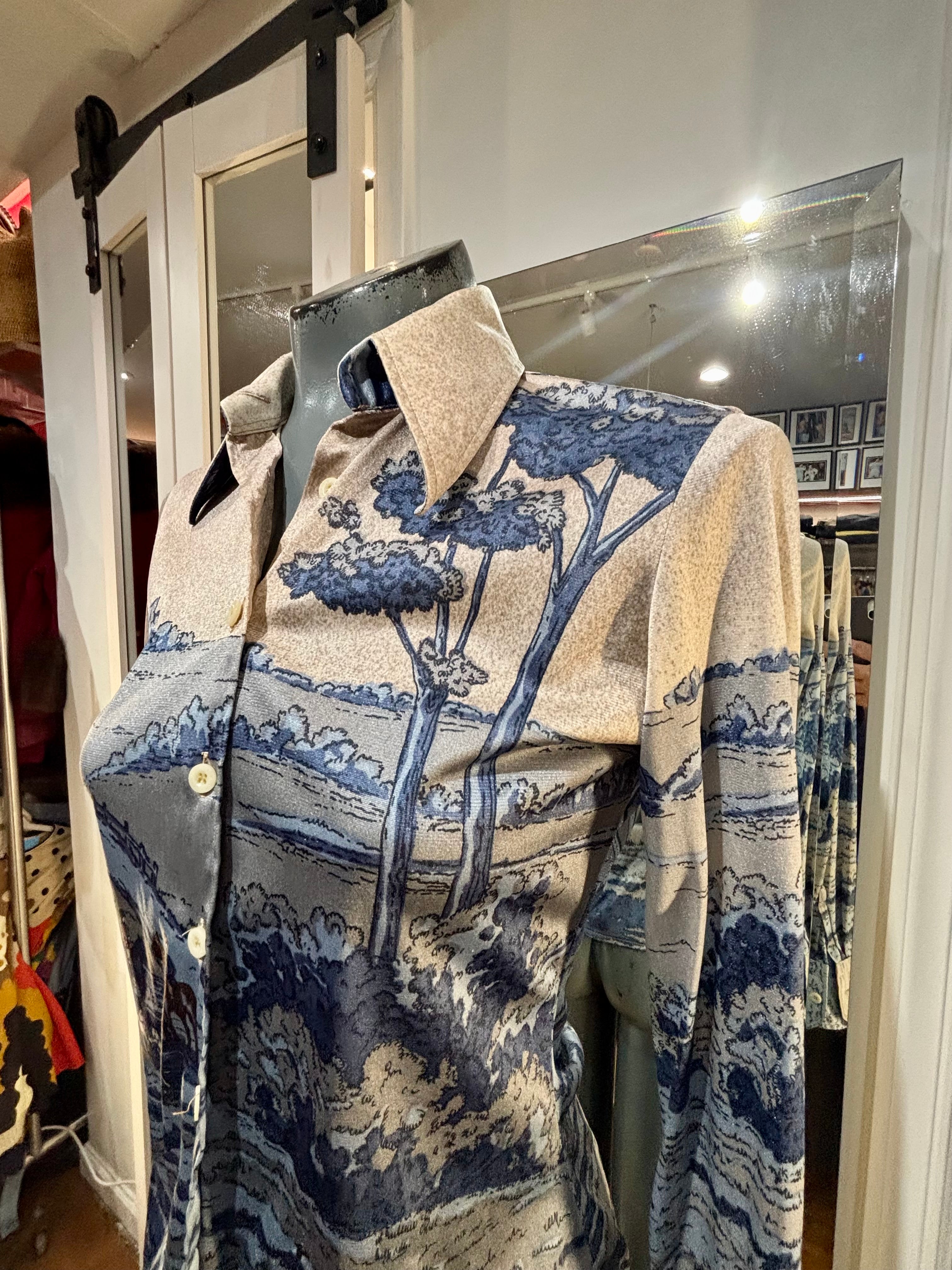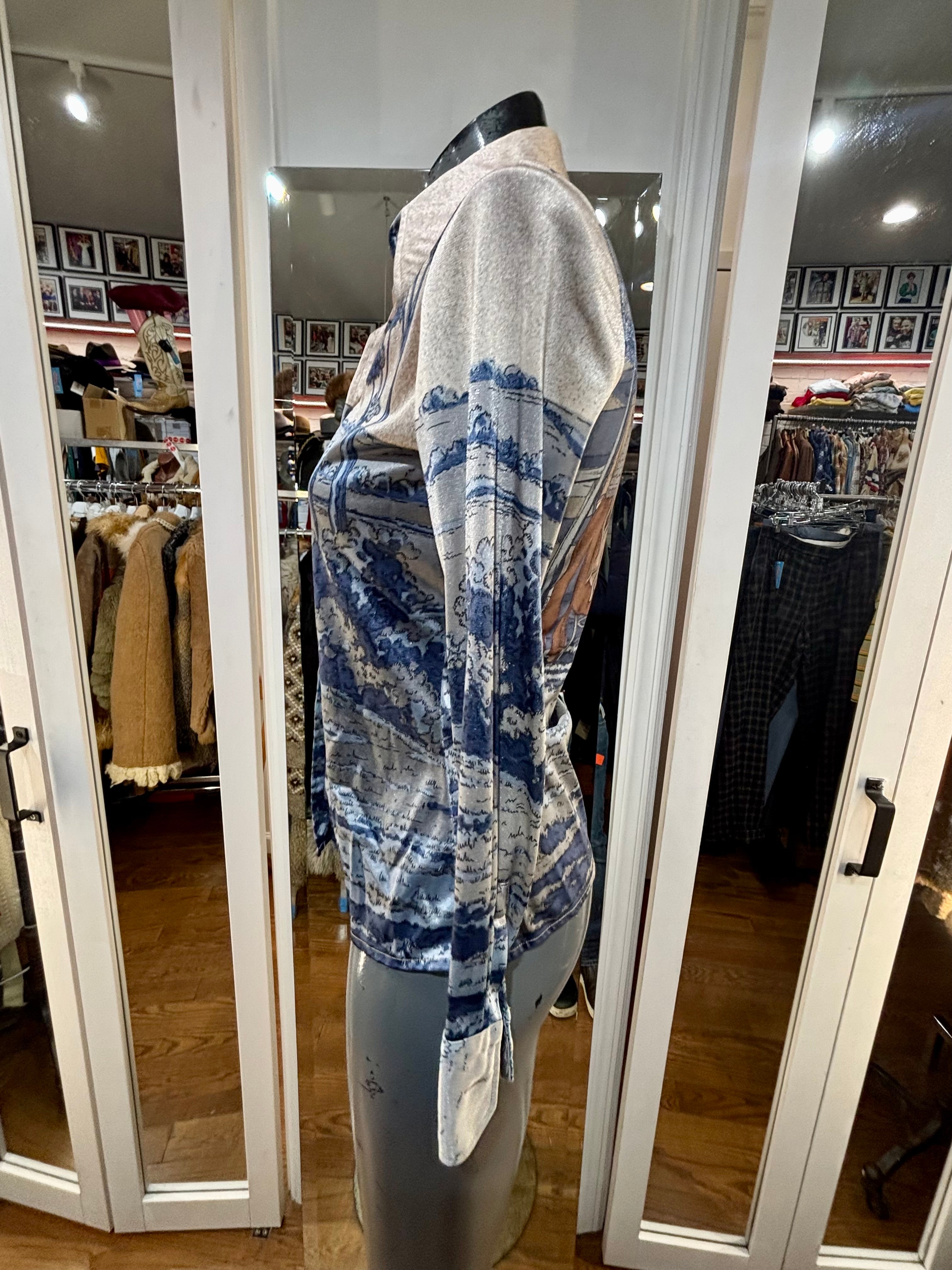 70’s Blue And Beige Disco Blouse With Medieval Scenery By Nik Nik