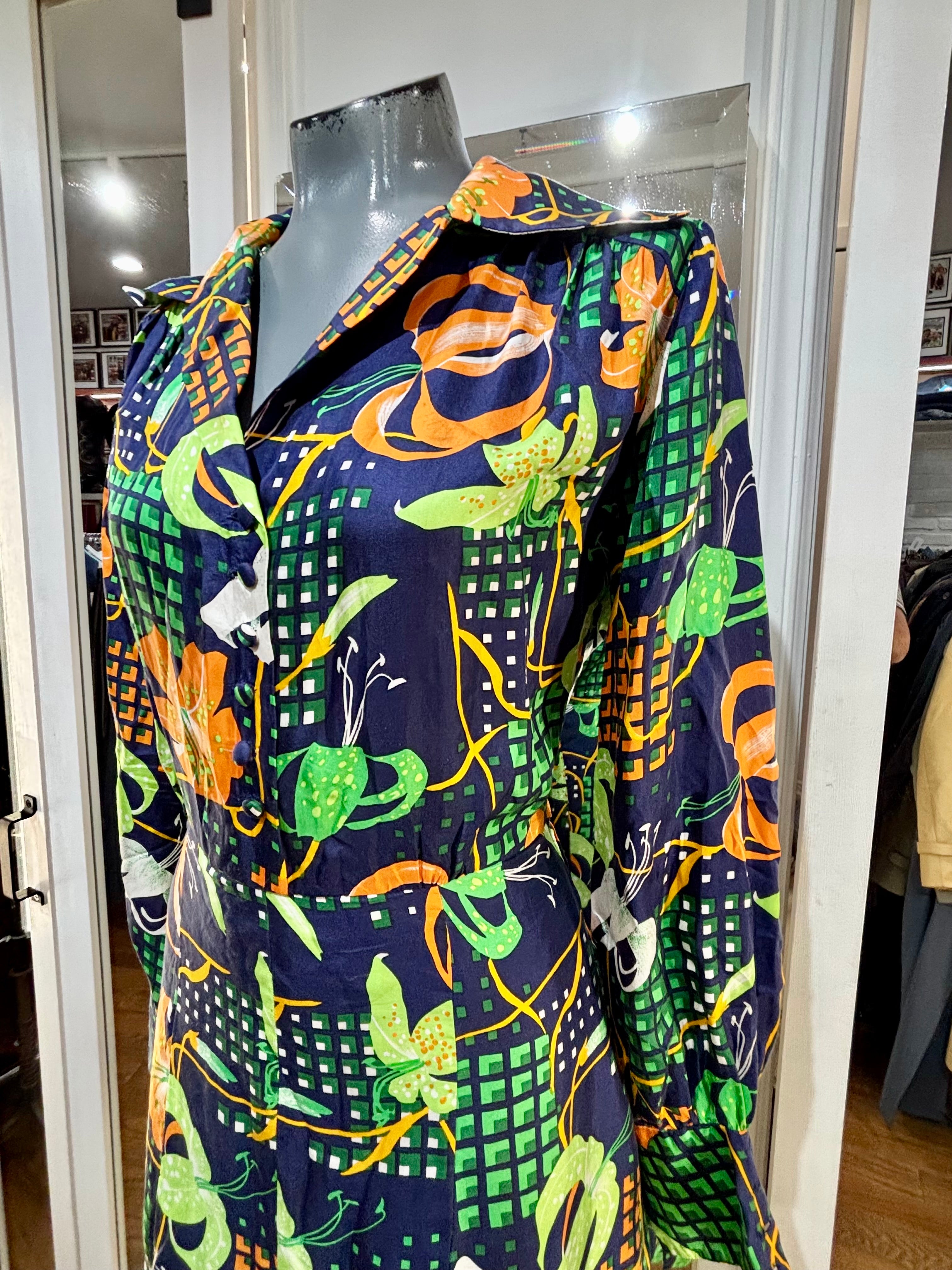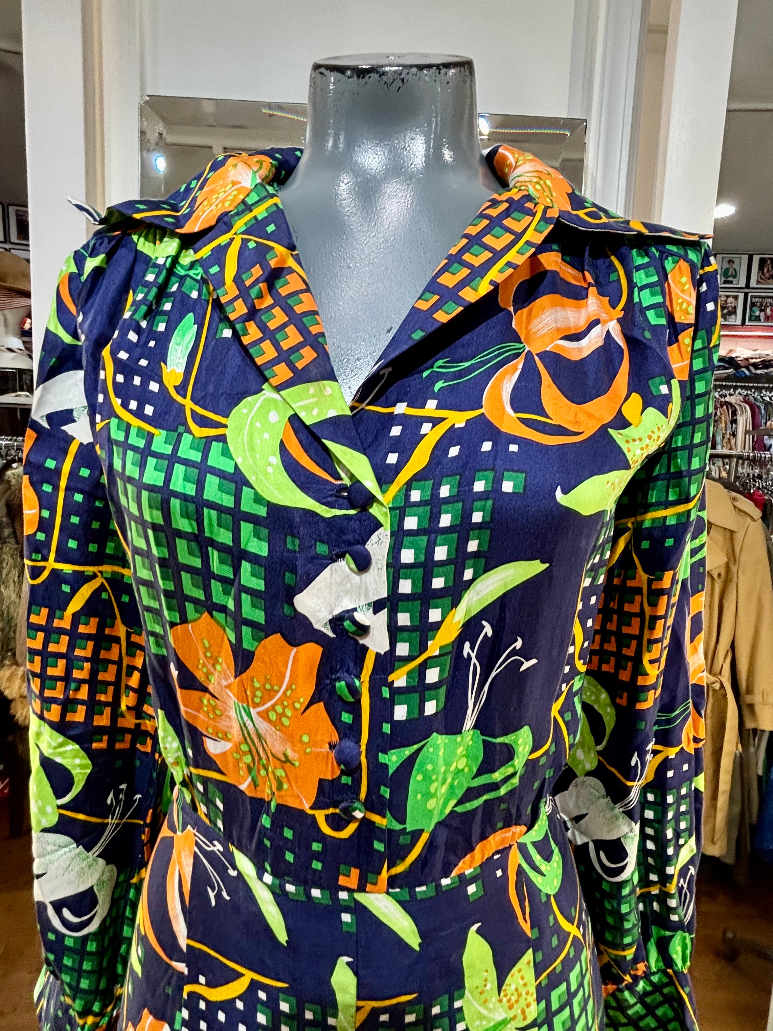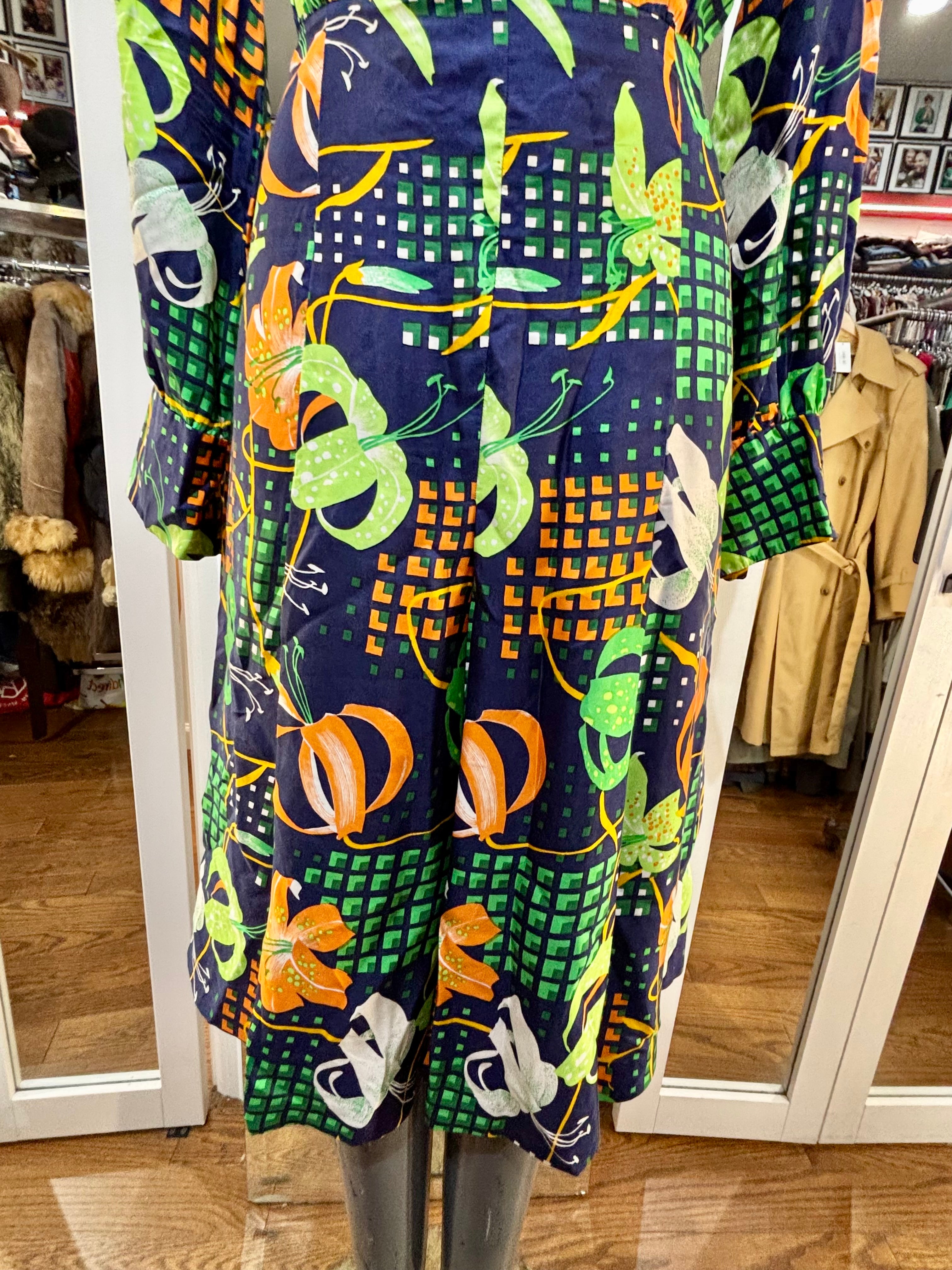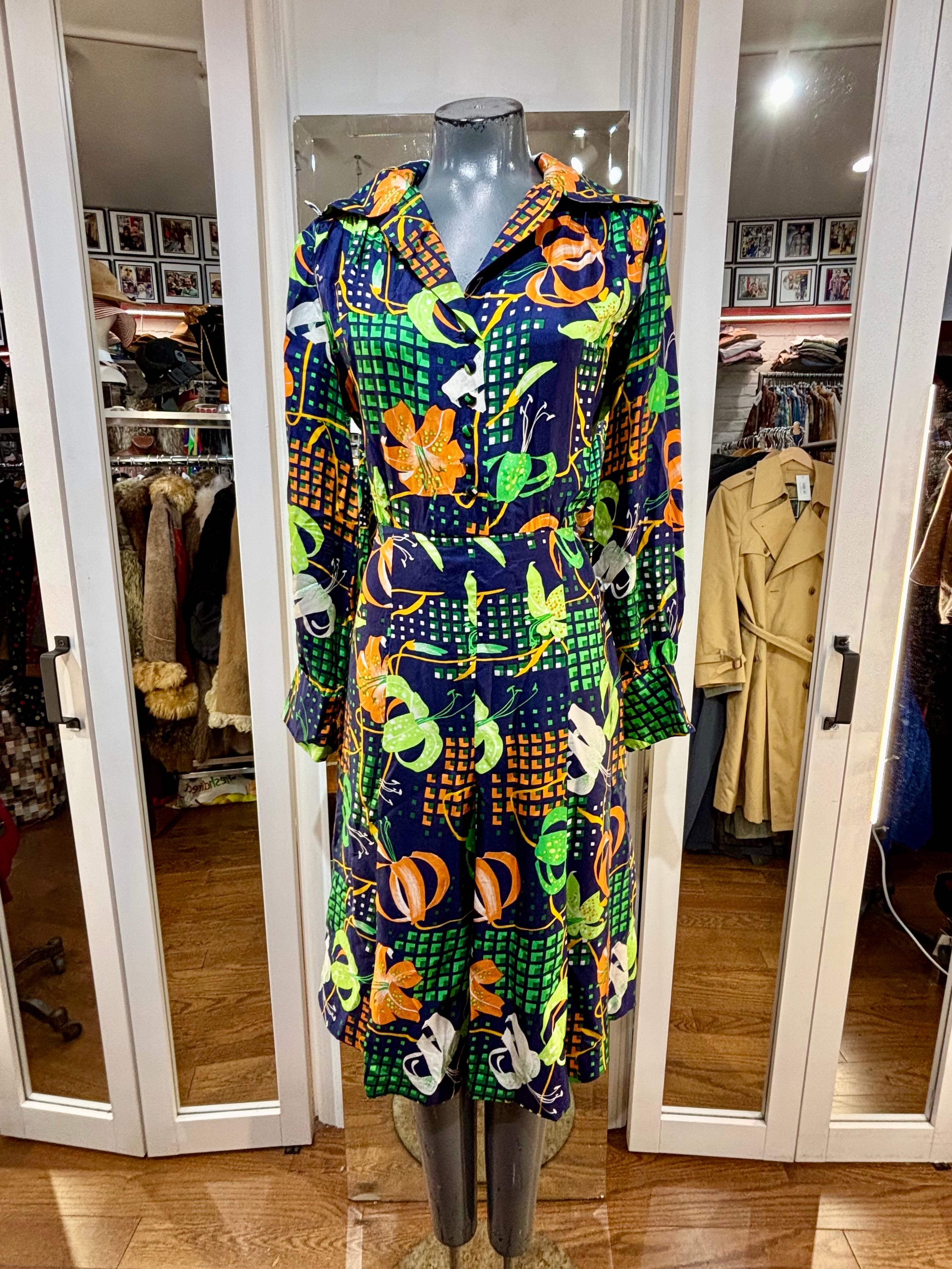70’s Navy Sheer Multicolored Flower And Geometric Long Sleeve Dress