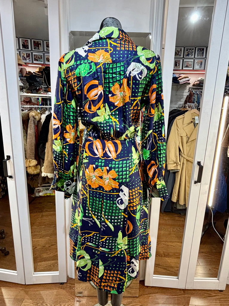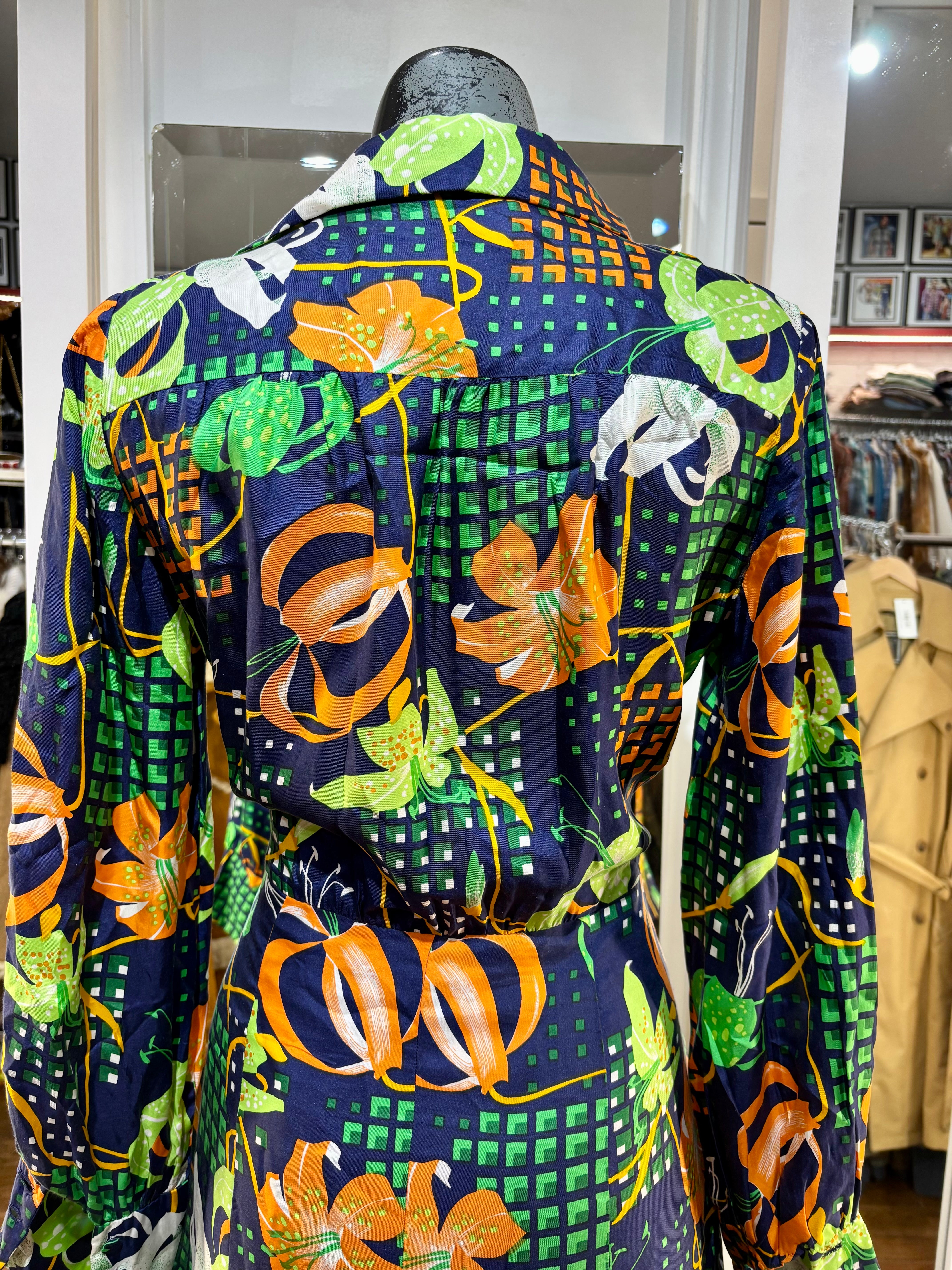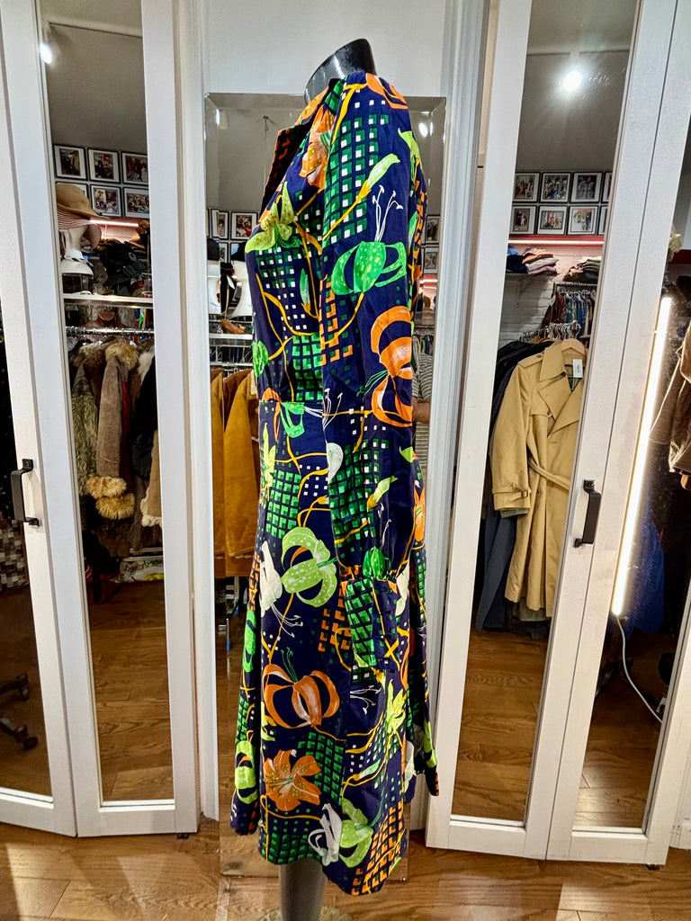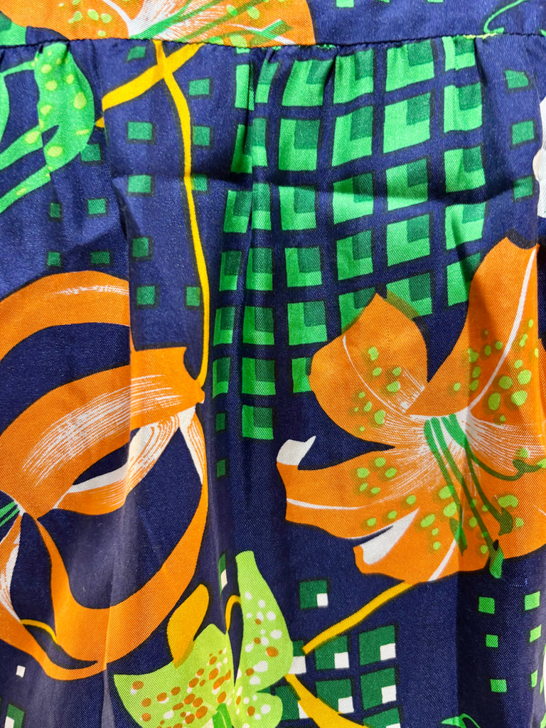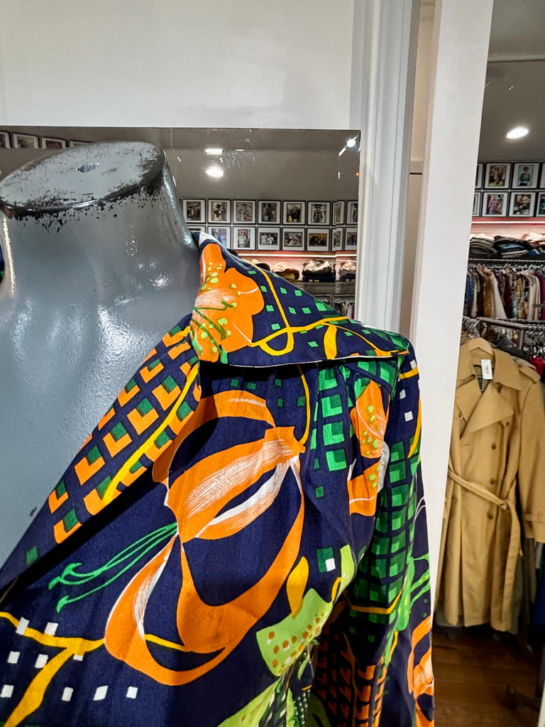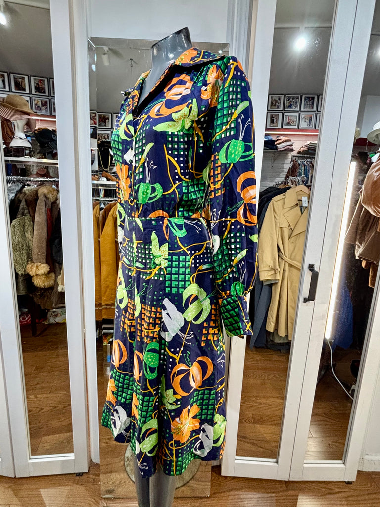 70’s Navy Sheer Multicolored Flower And Geometric Long Sleeve Dress