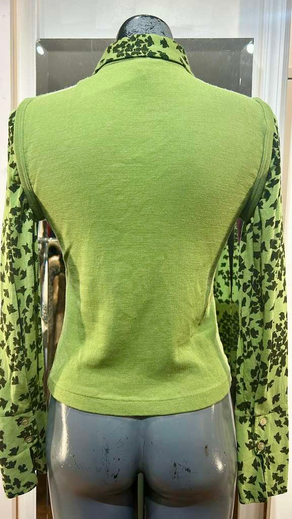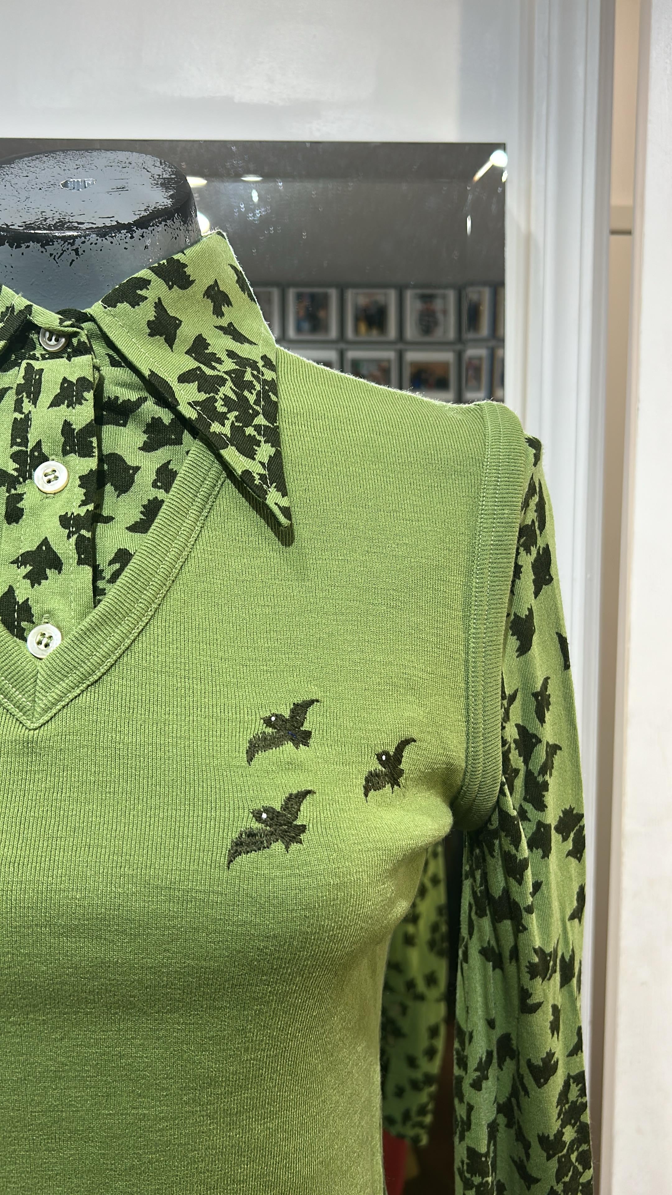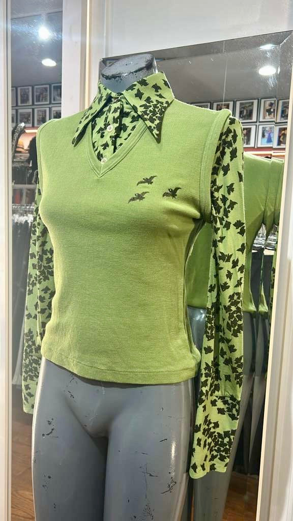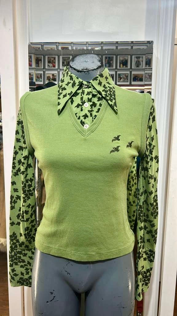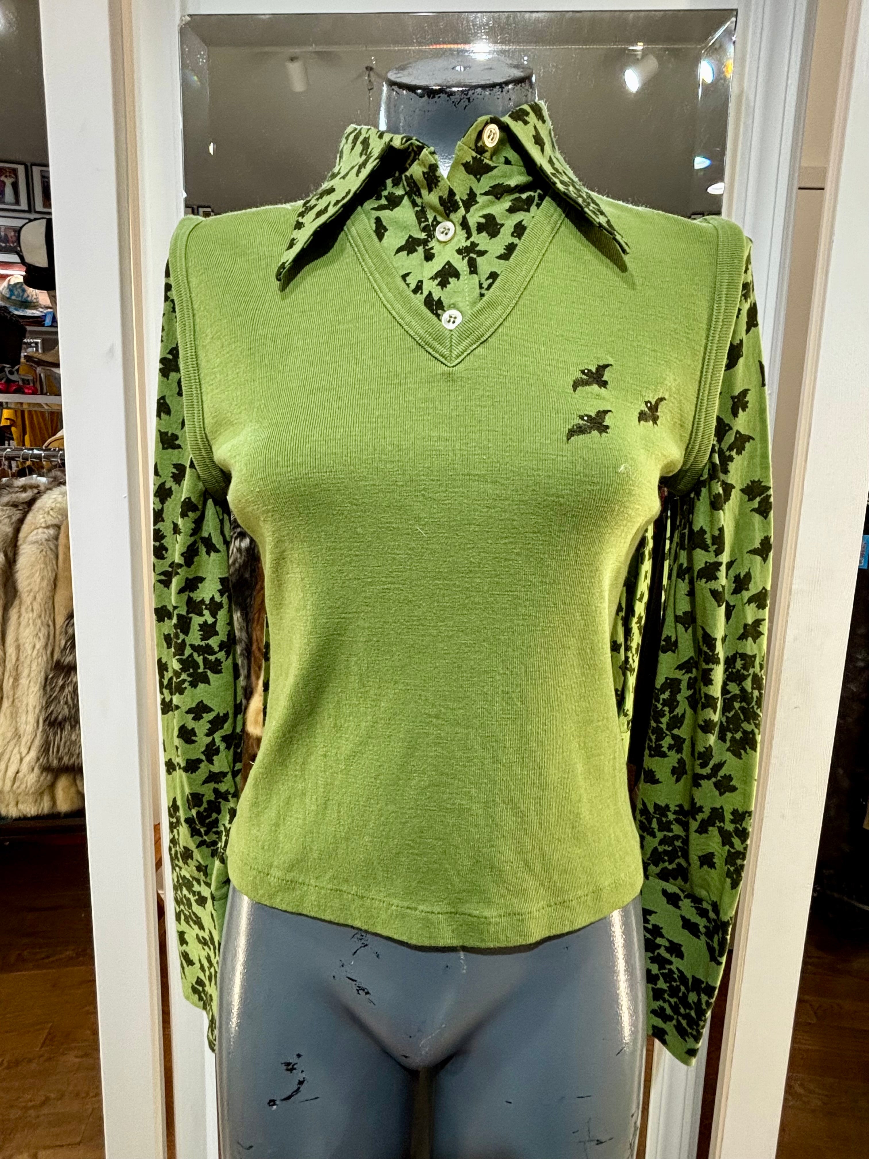 70’s Green Double Layer ilussion Vest & Print Shirt Long Sleeve Pull Dead Stock