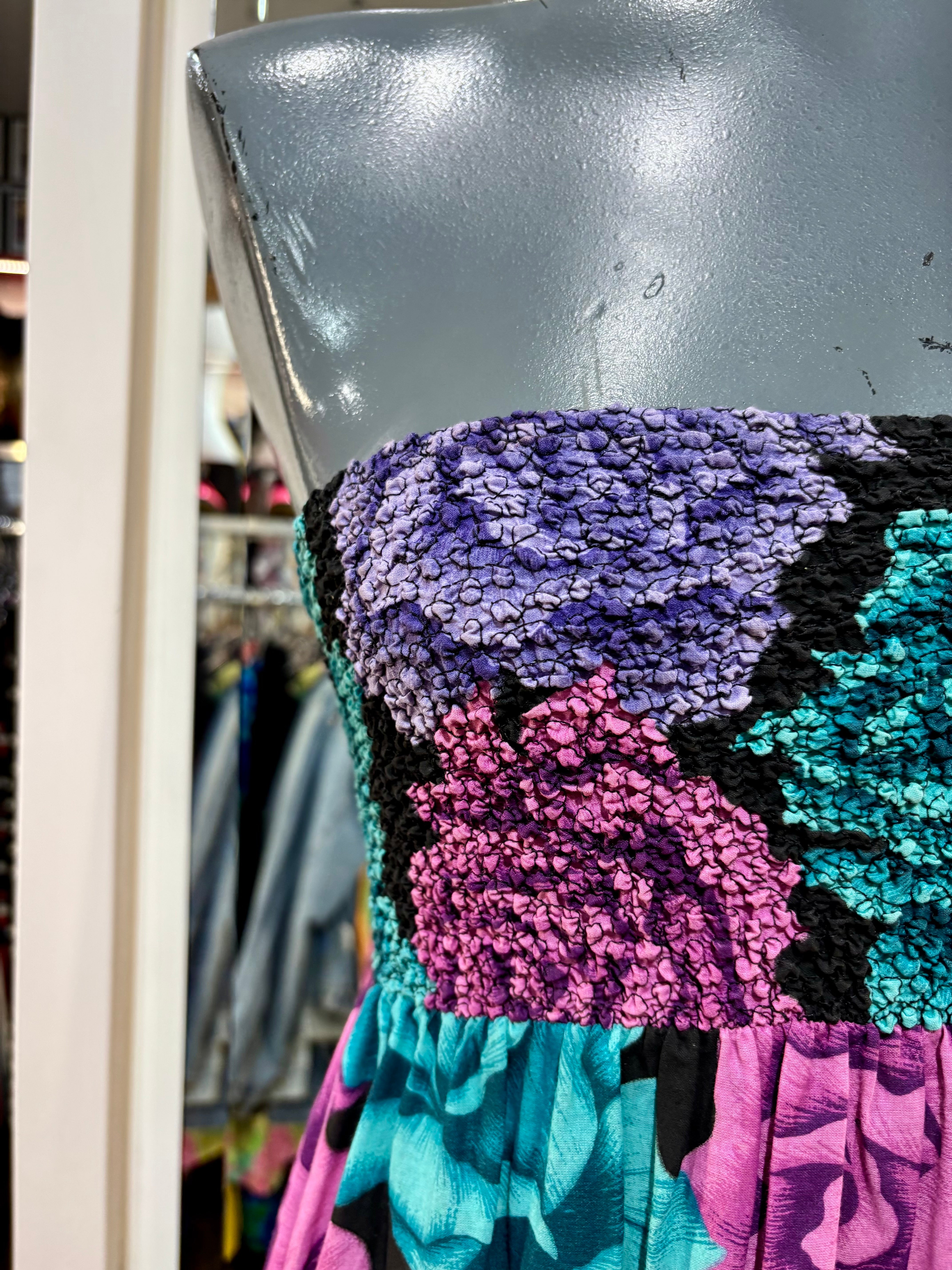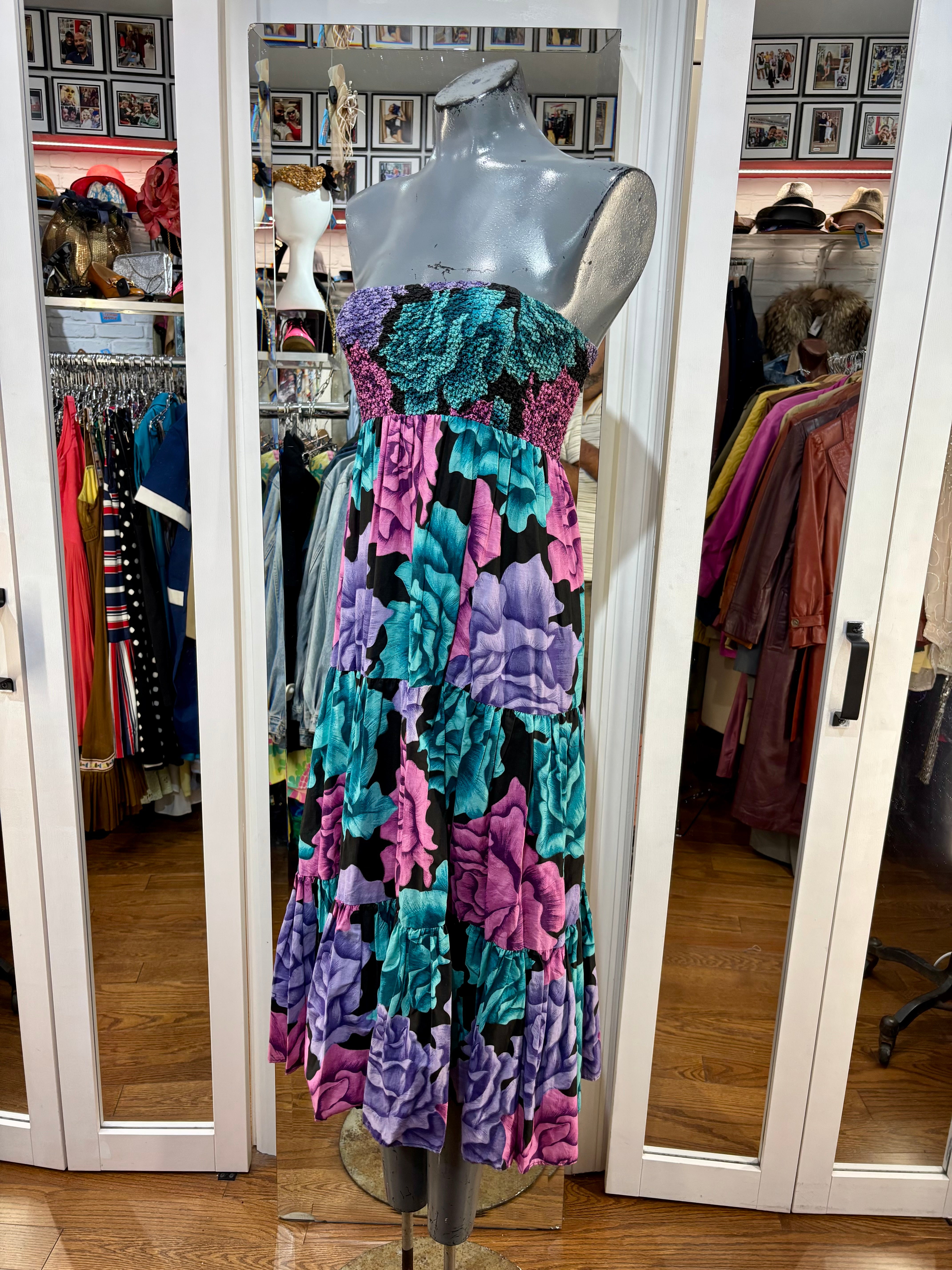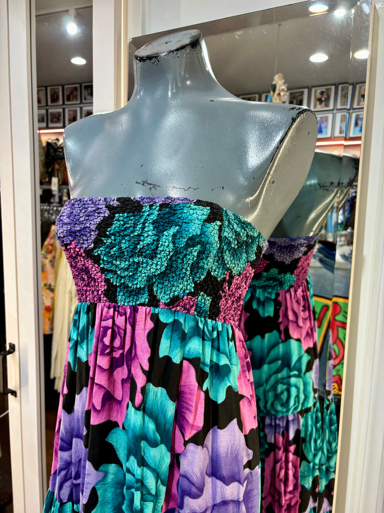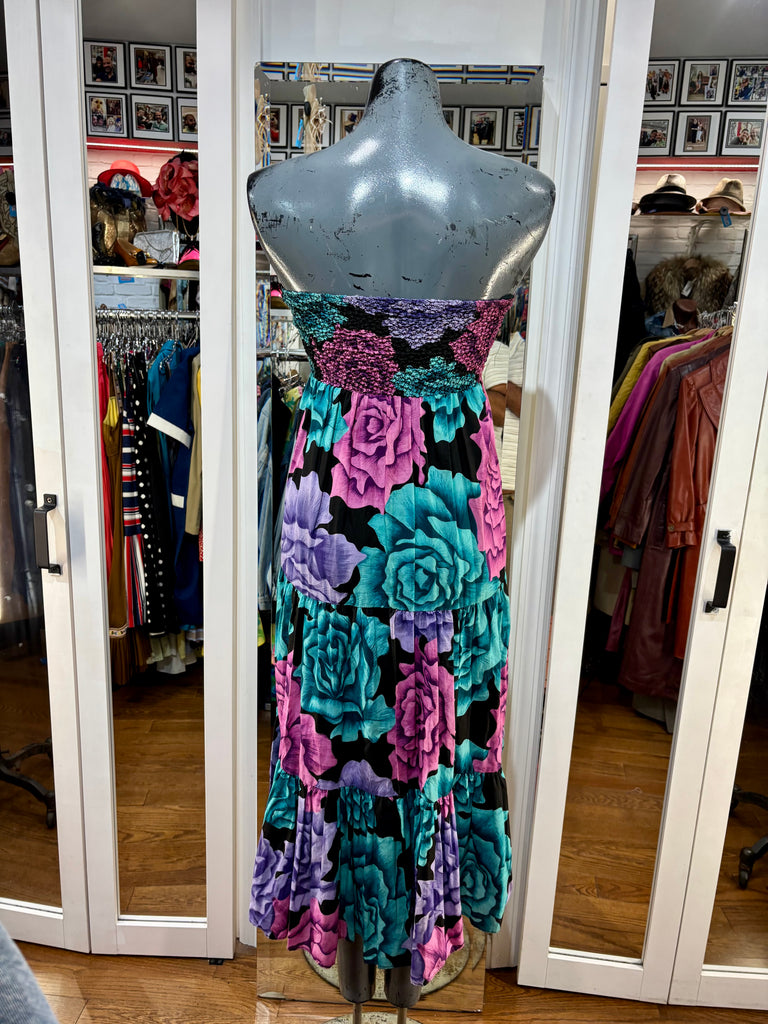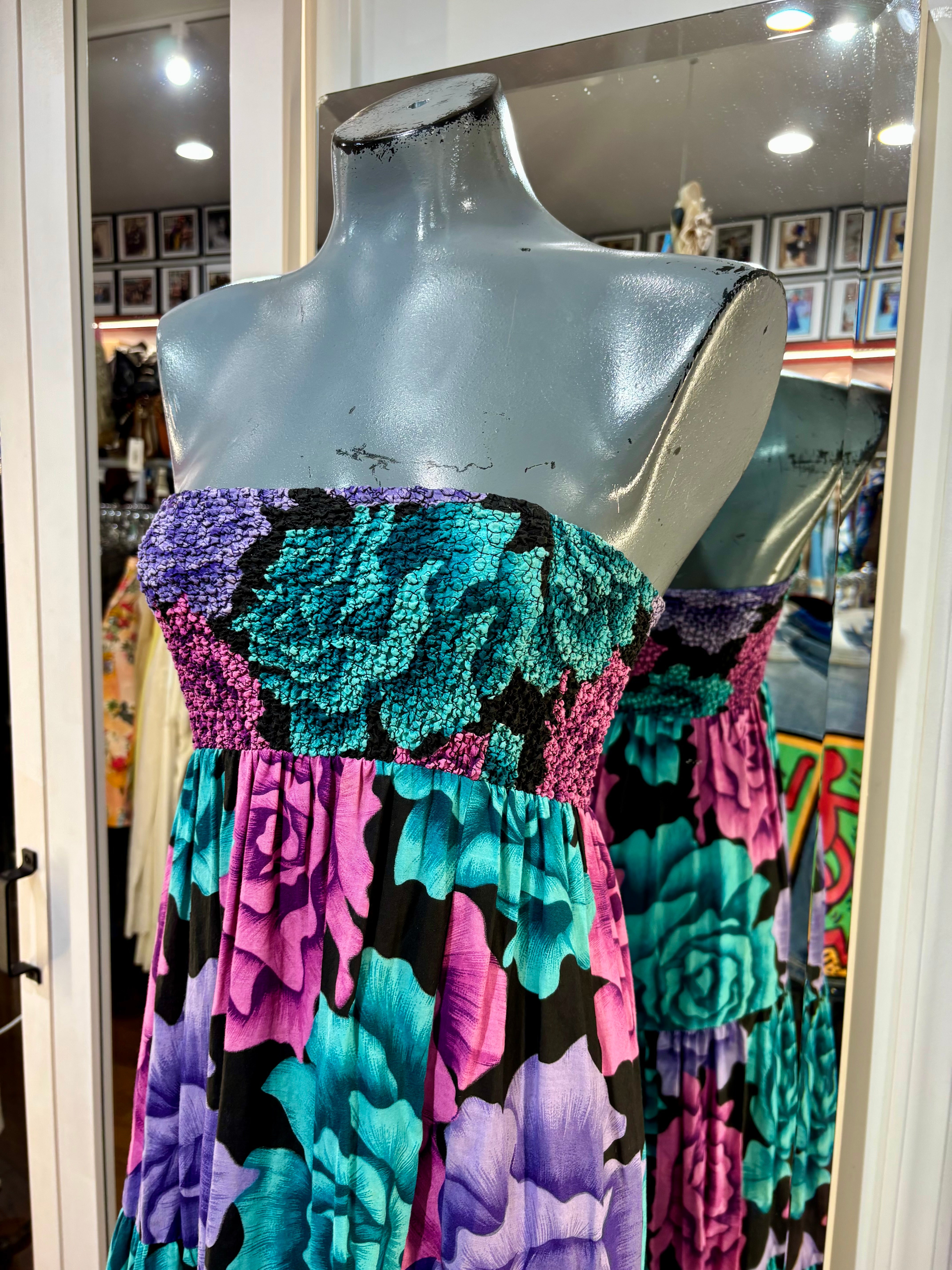 80’s Green & Pink Strapless Flower Print Dress By Gabar
