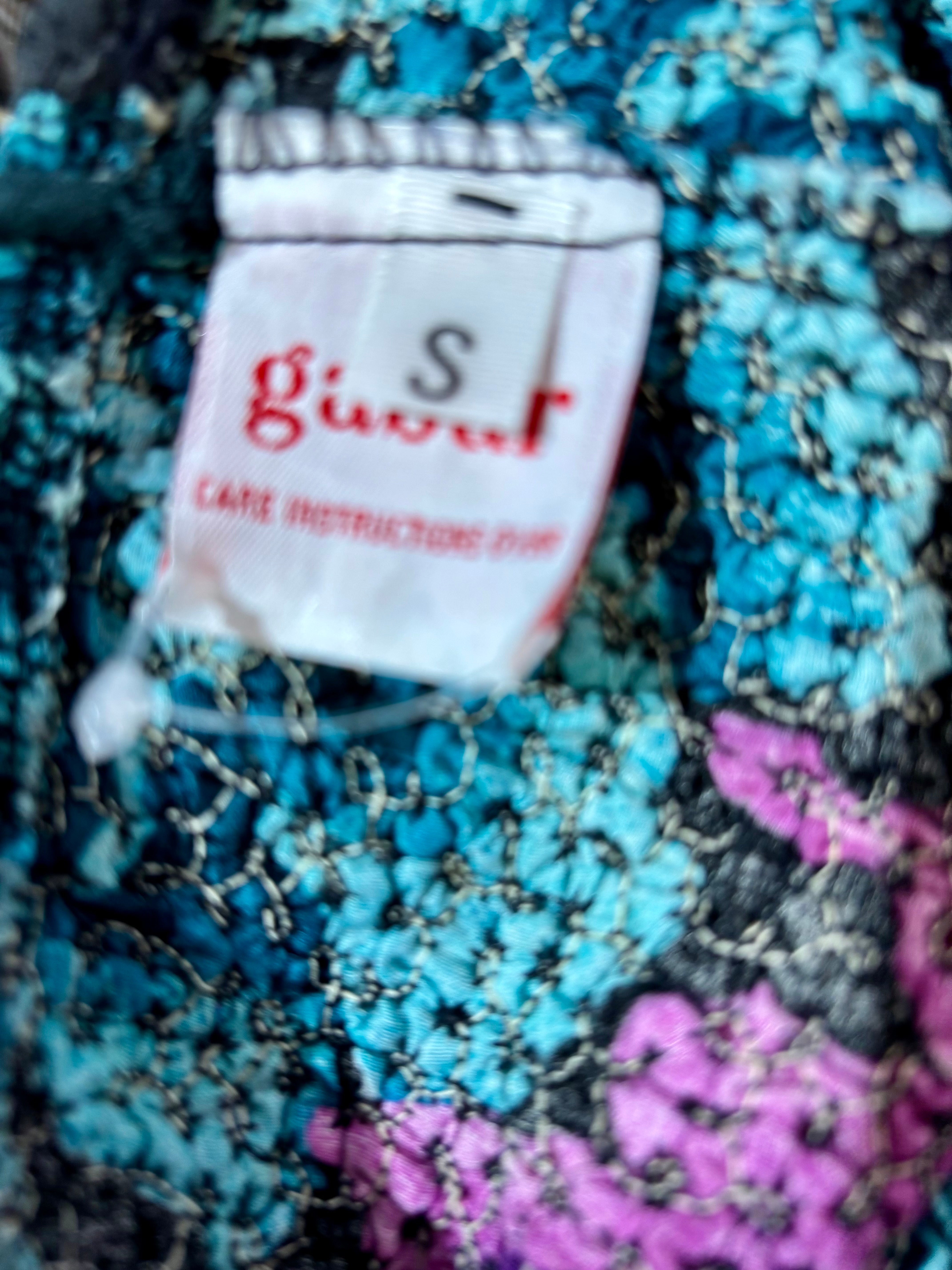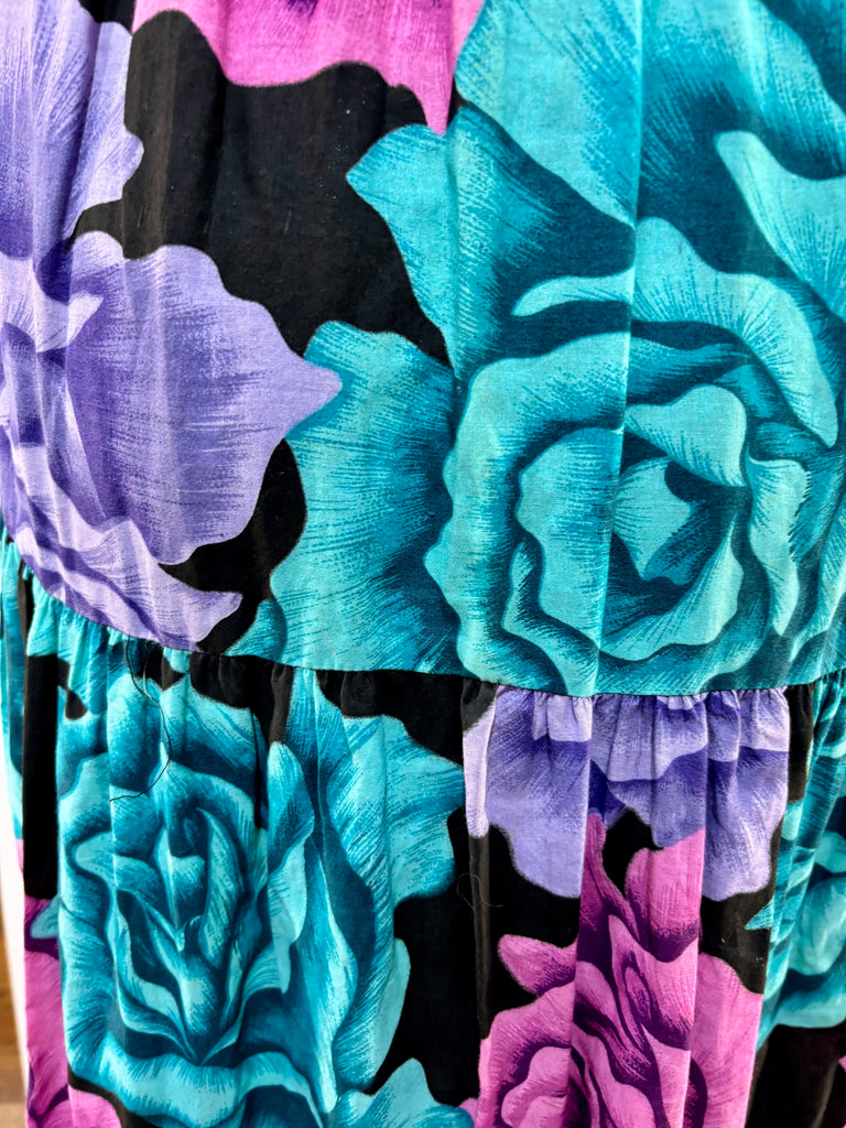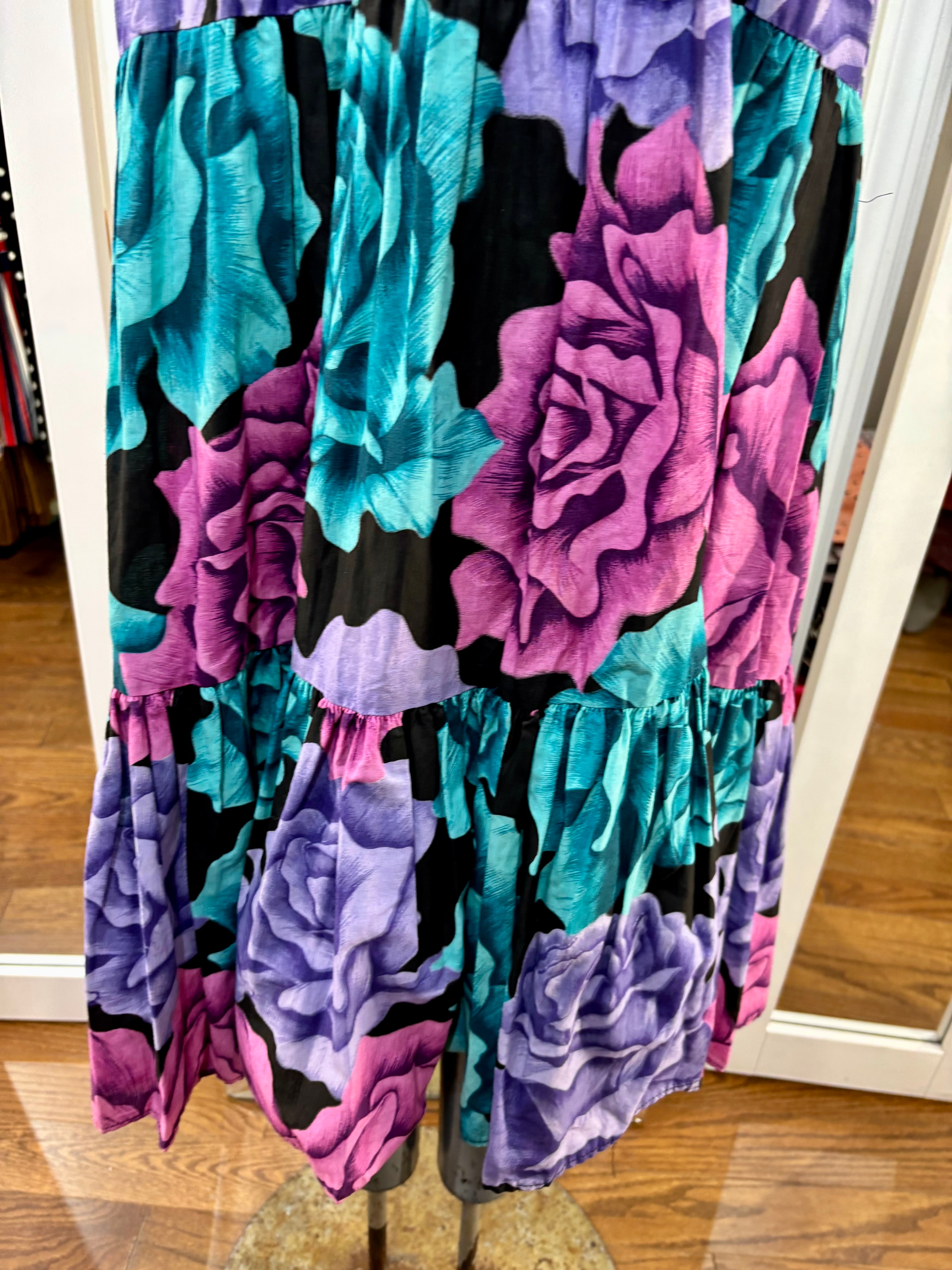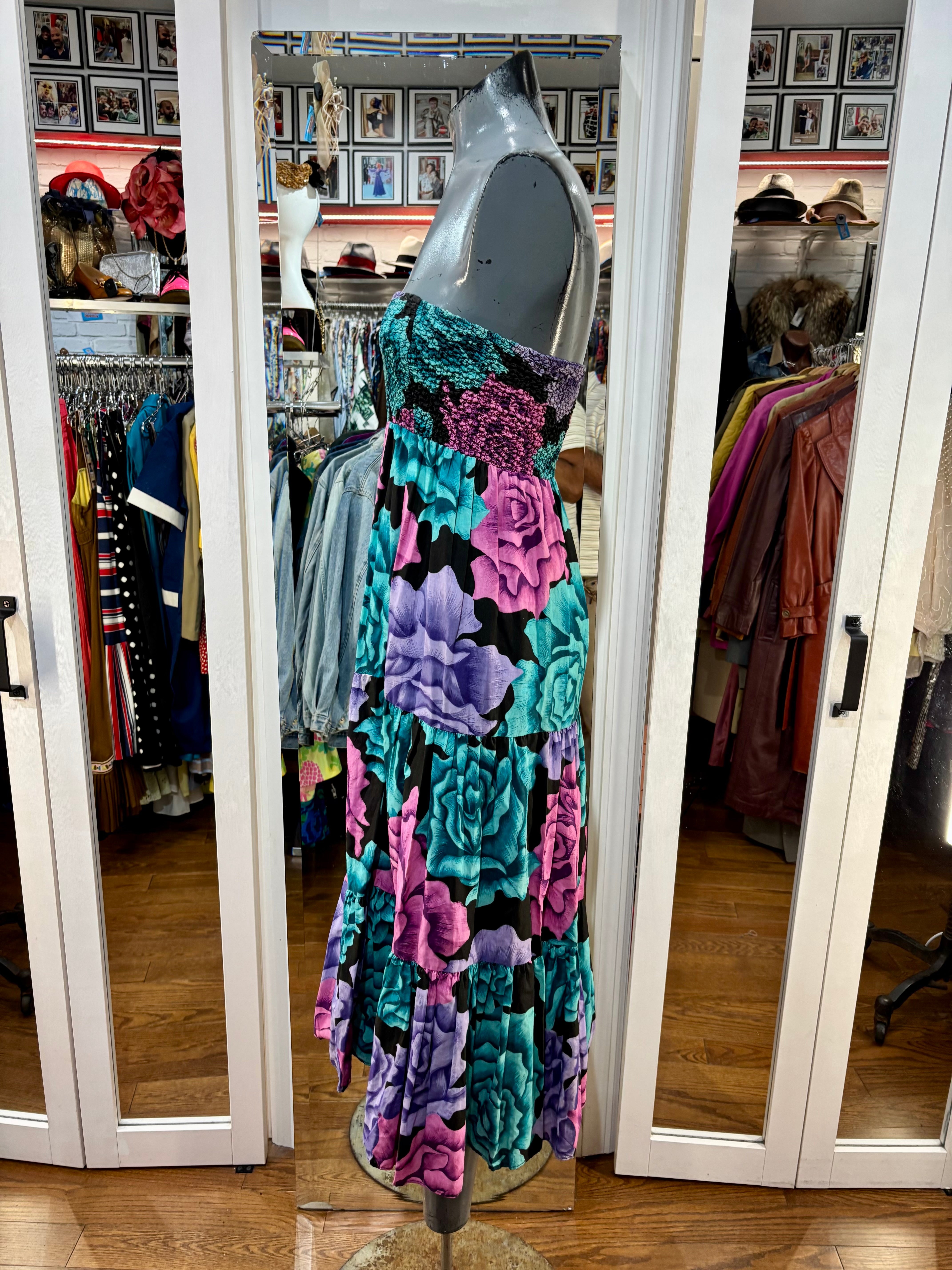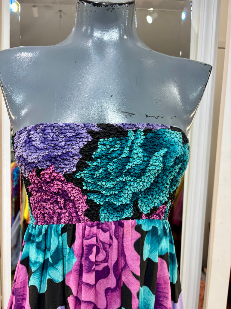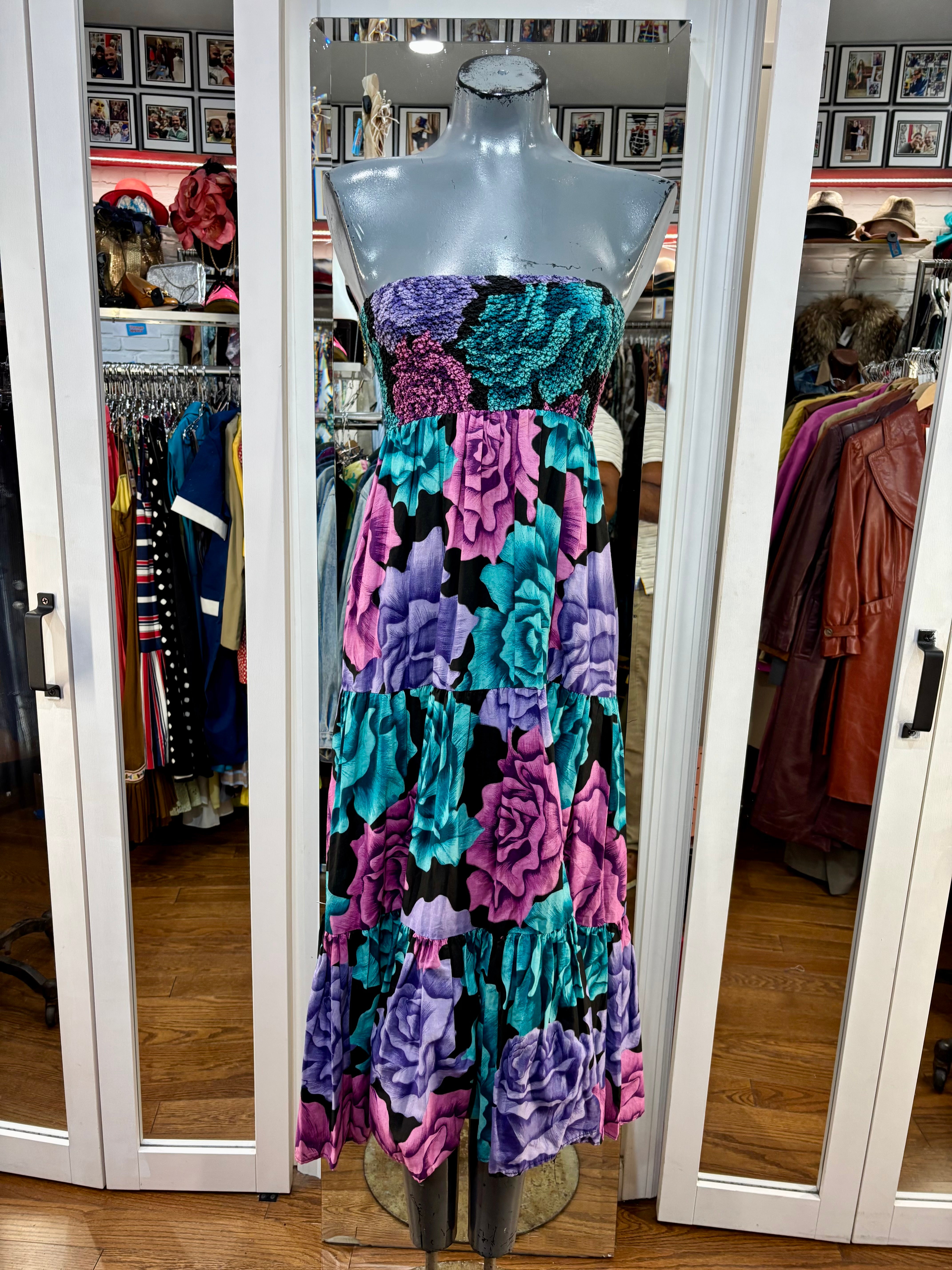 80’s Green & Pink Strapless Flower Print Dress By Gabar