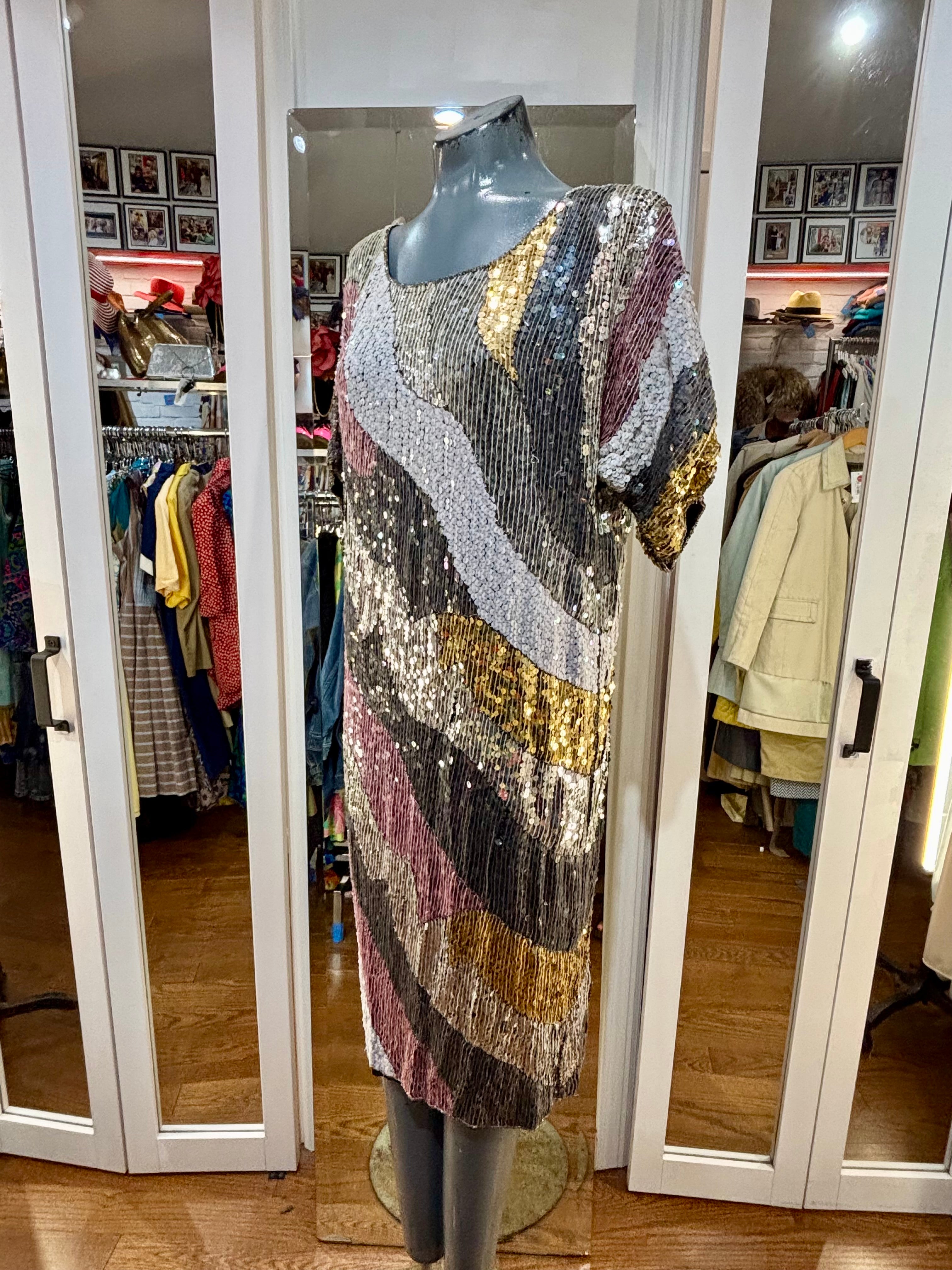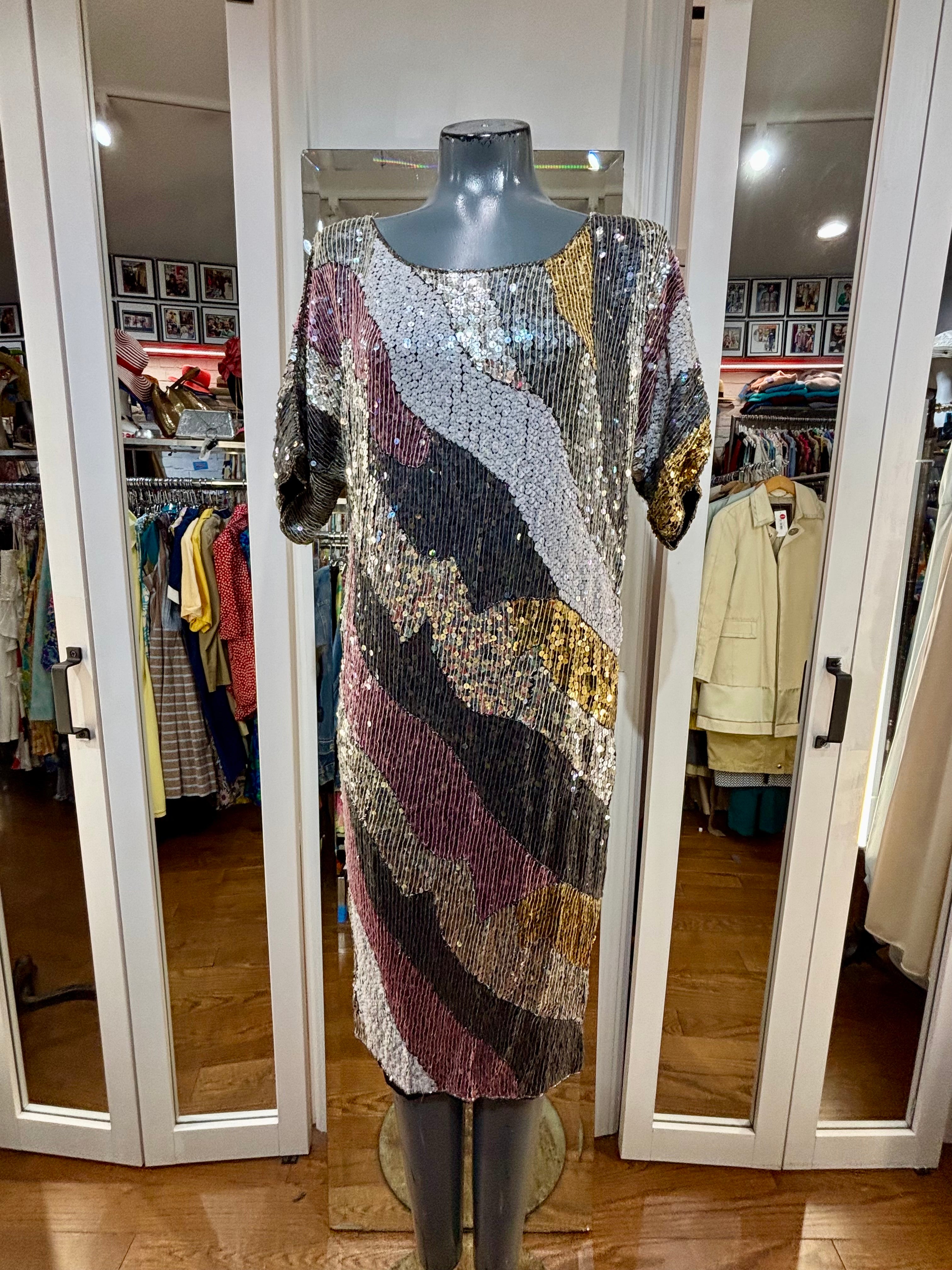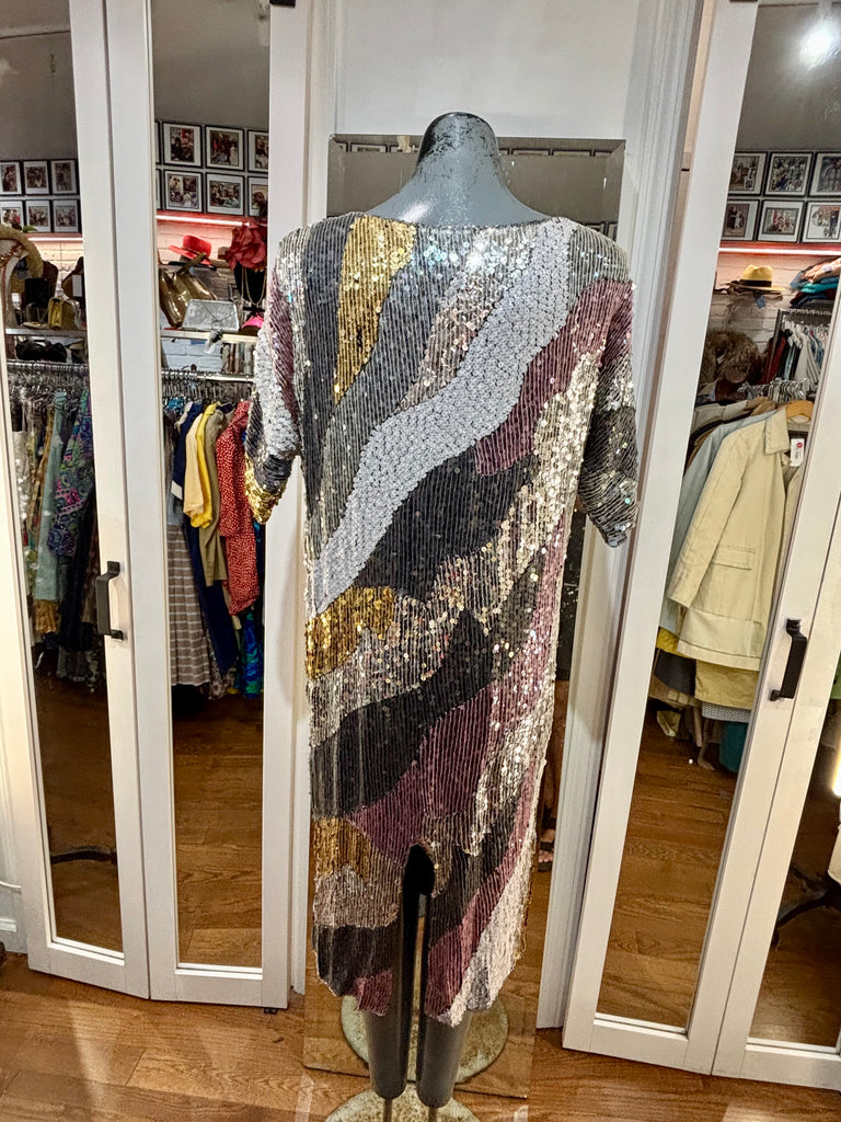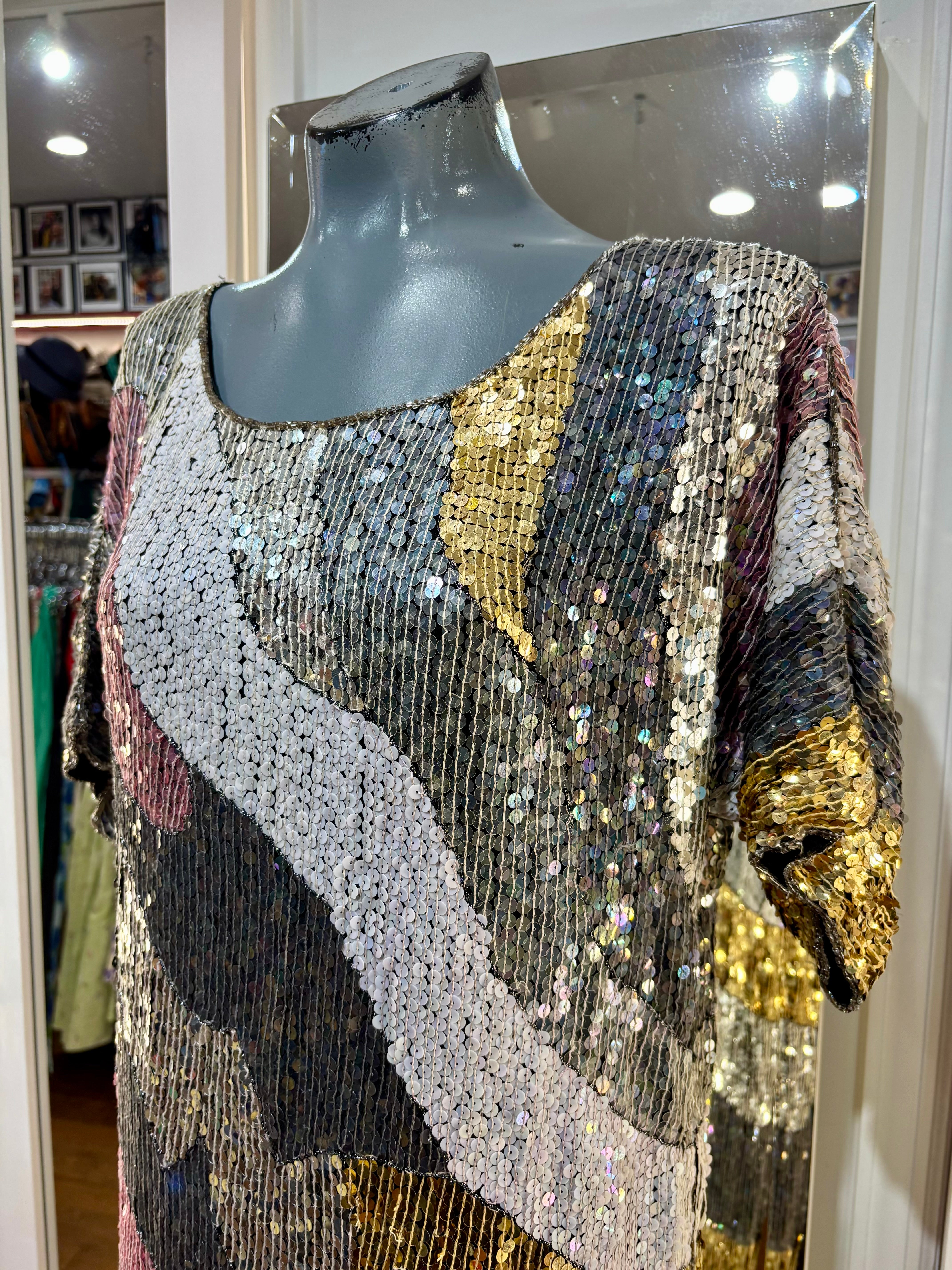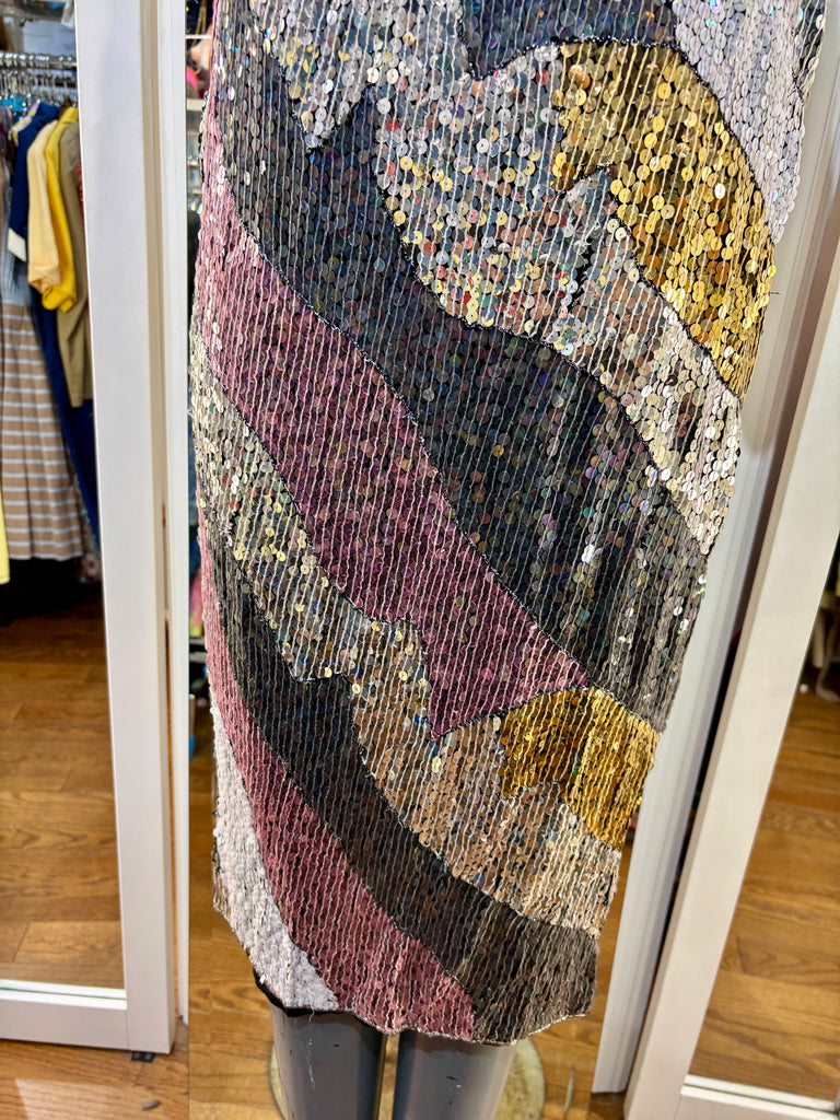 80’s Gray Multicolored Abstract Sequins Short Sleeve Dress By Joseph Le Bon