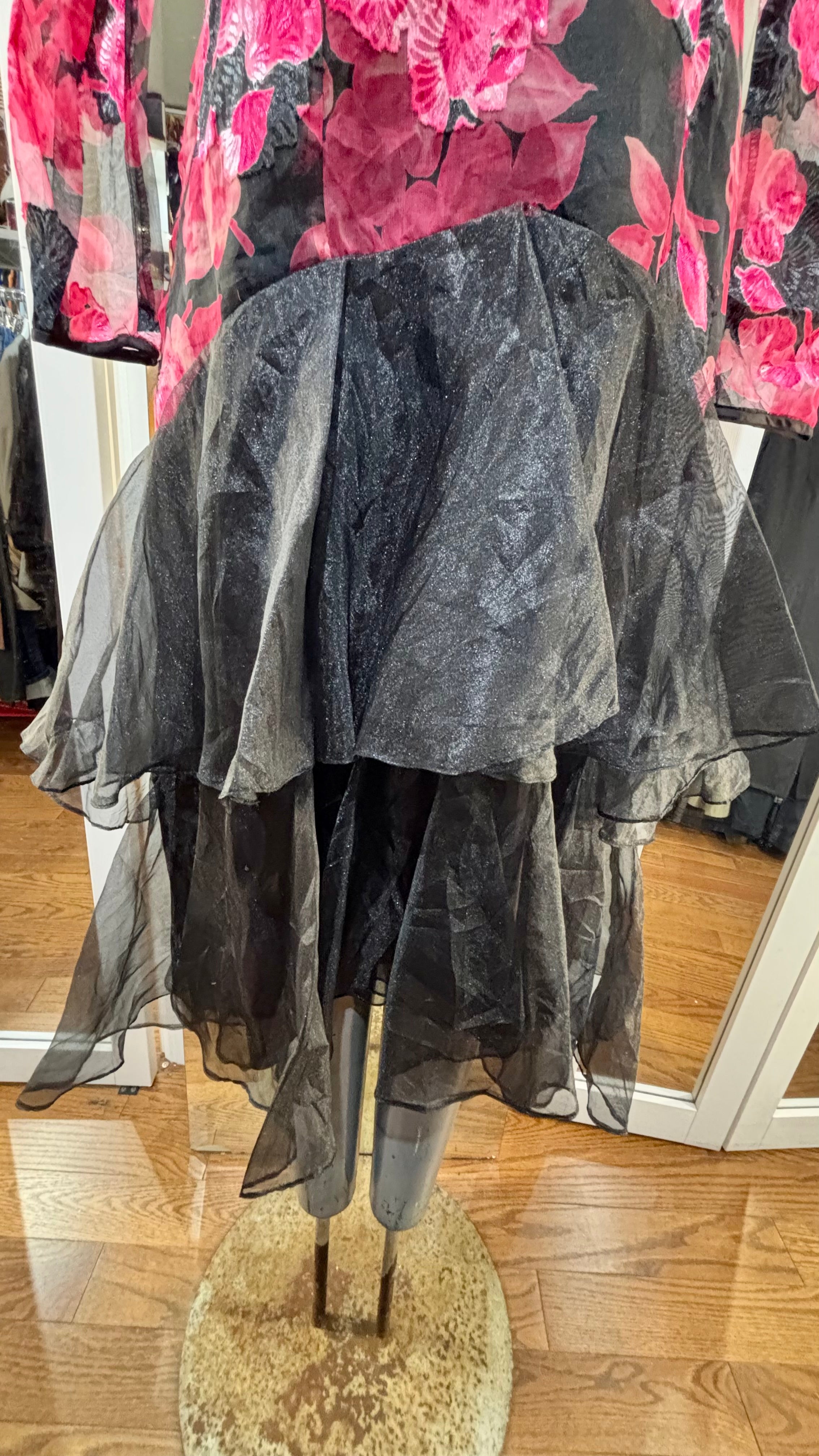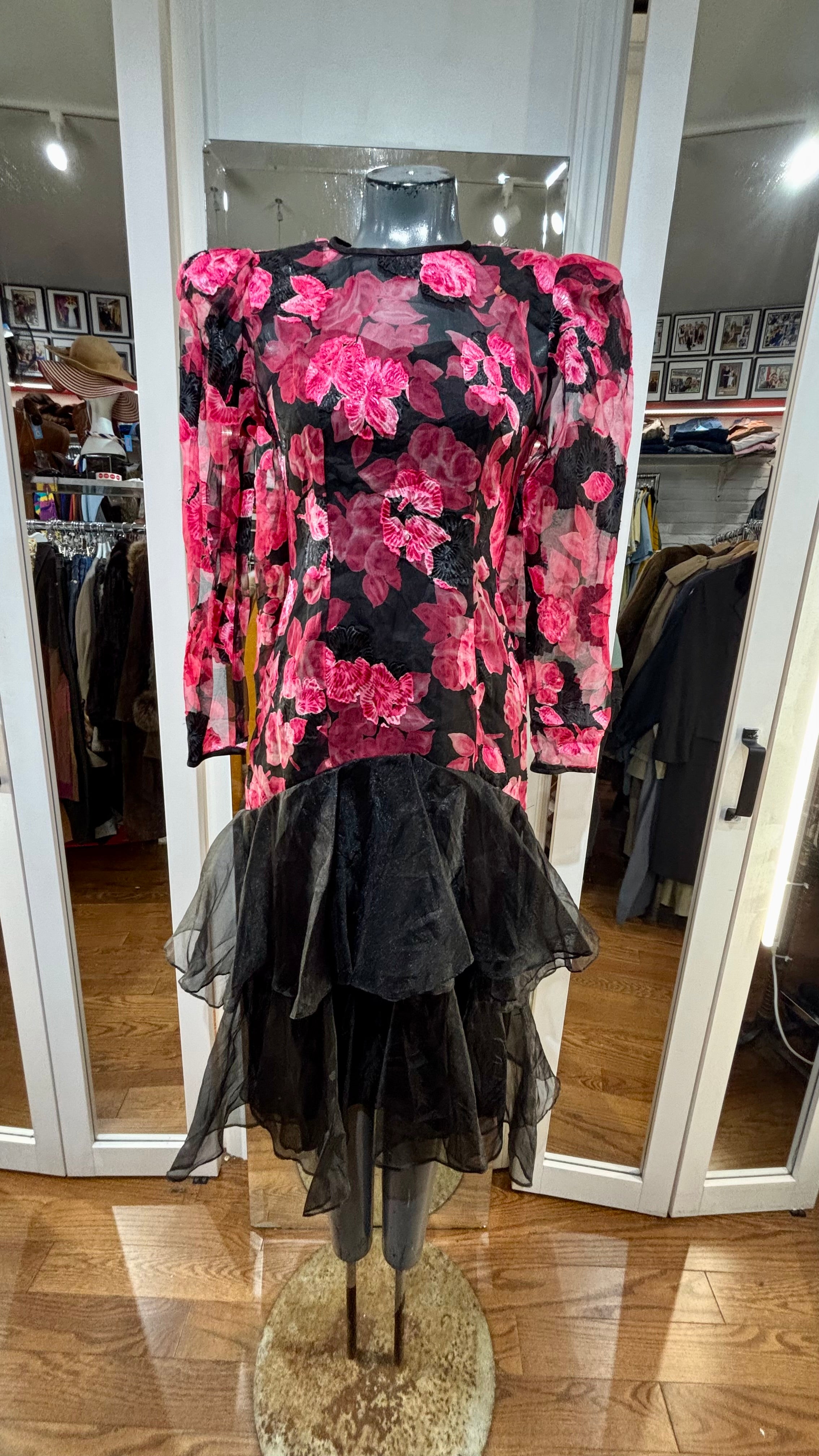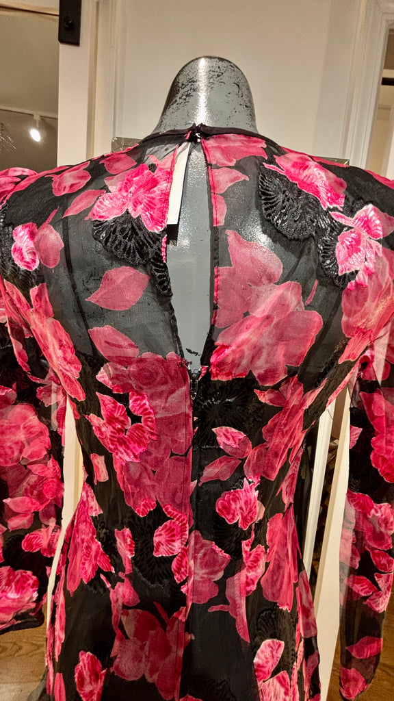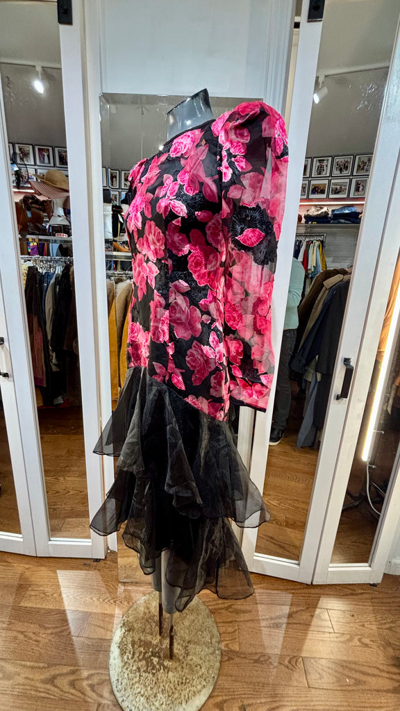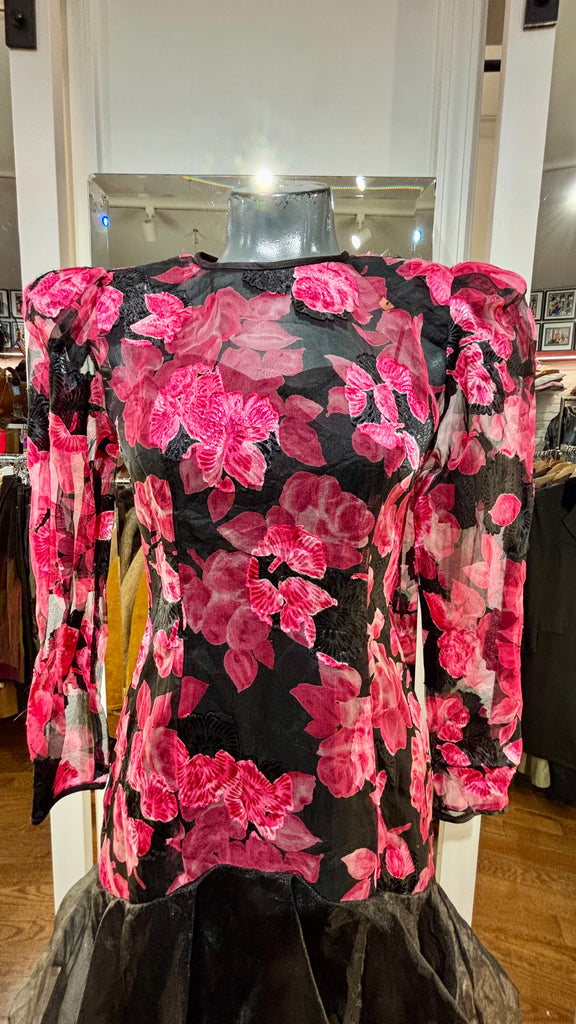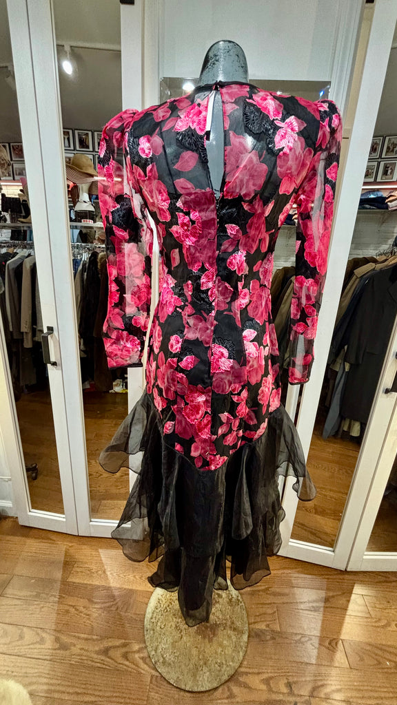 80’s Black With Hot Pink Flowers Sheer Layer Long Sleeve Dress By Nancy Bracolini