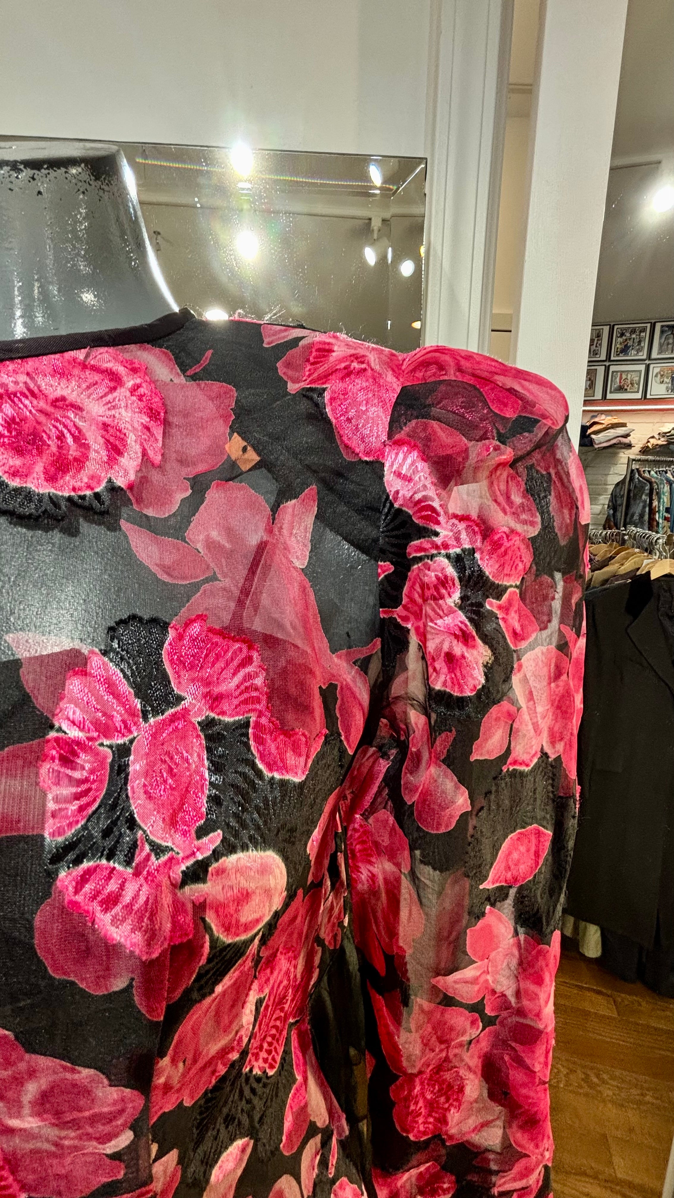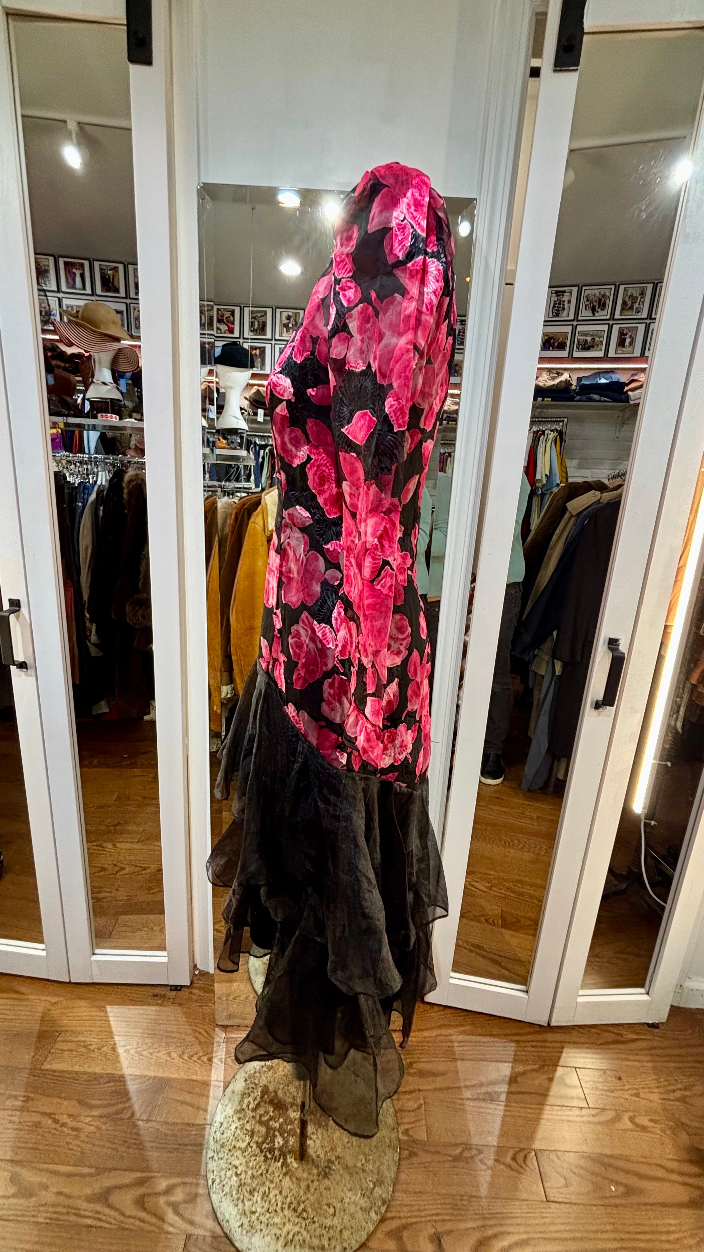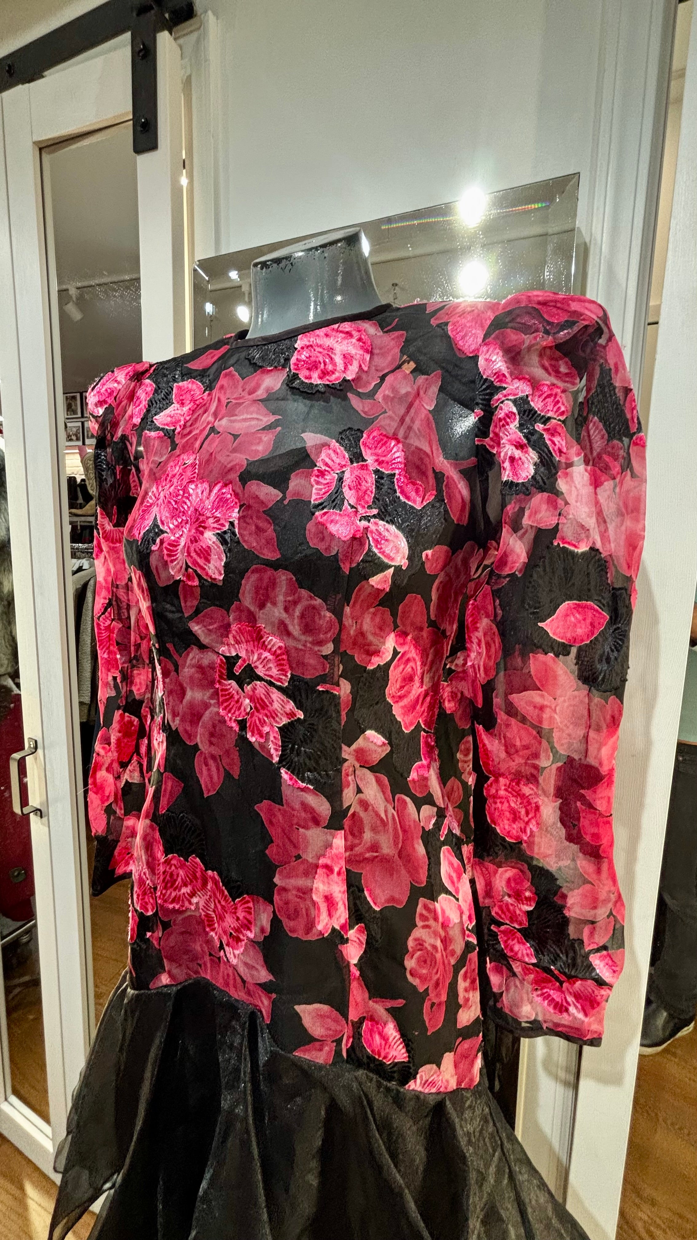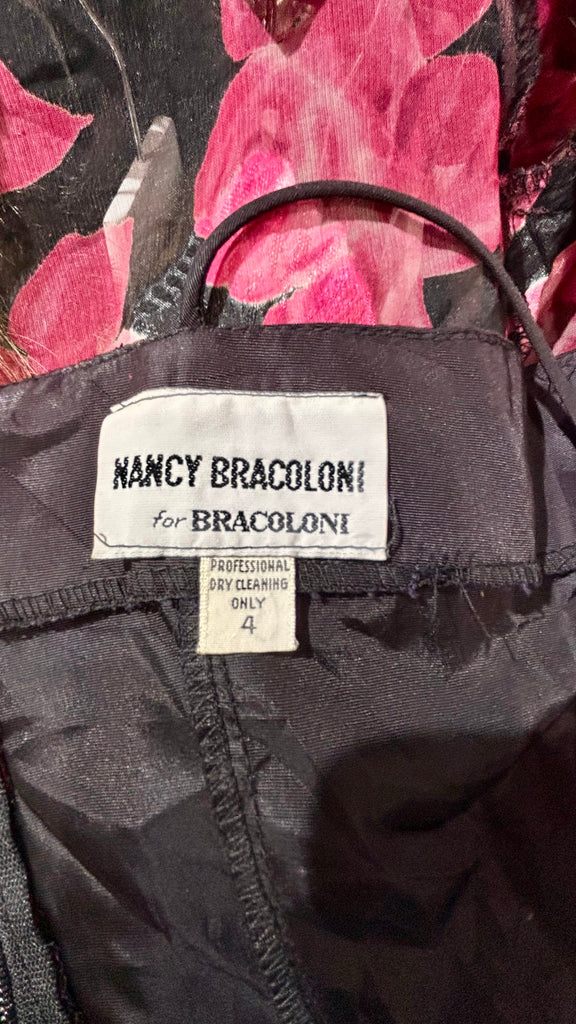 80’s Black With Hot Pink Flowers Sheer Layer Long Sleeve Dress By Nancy Bracolini