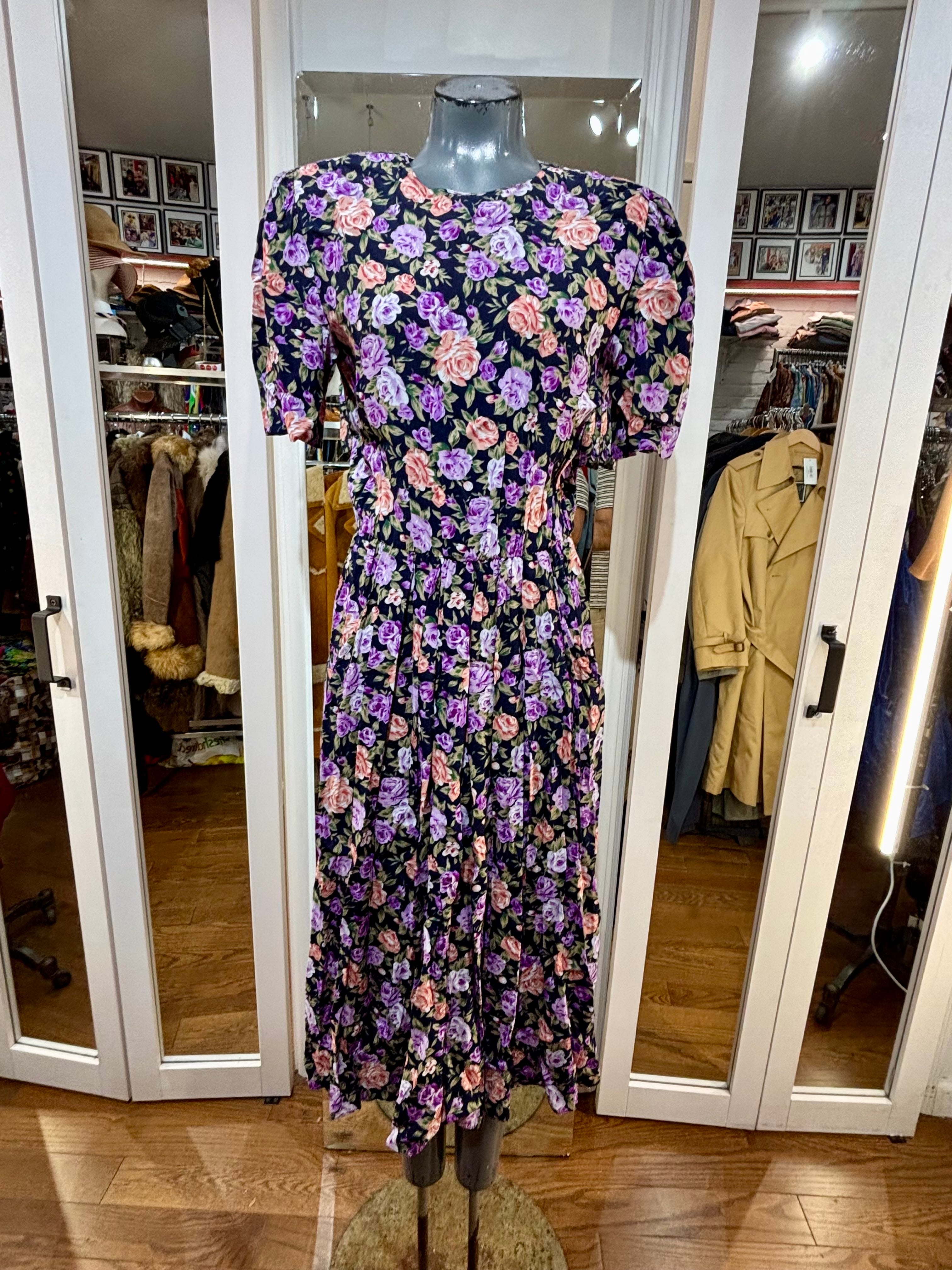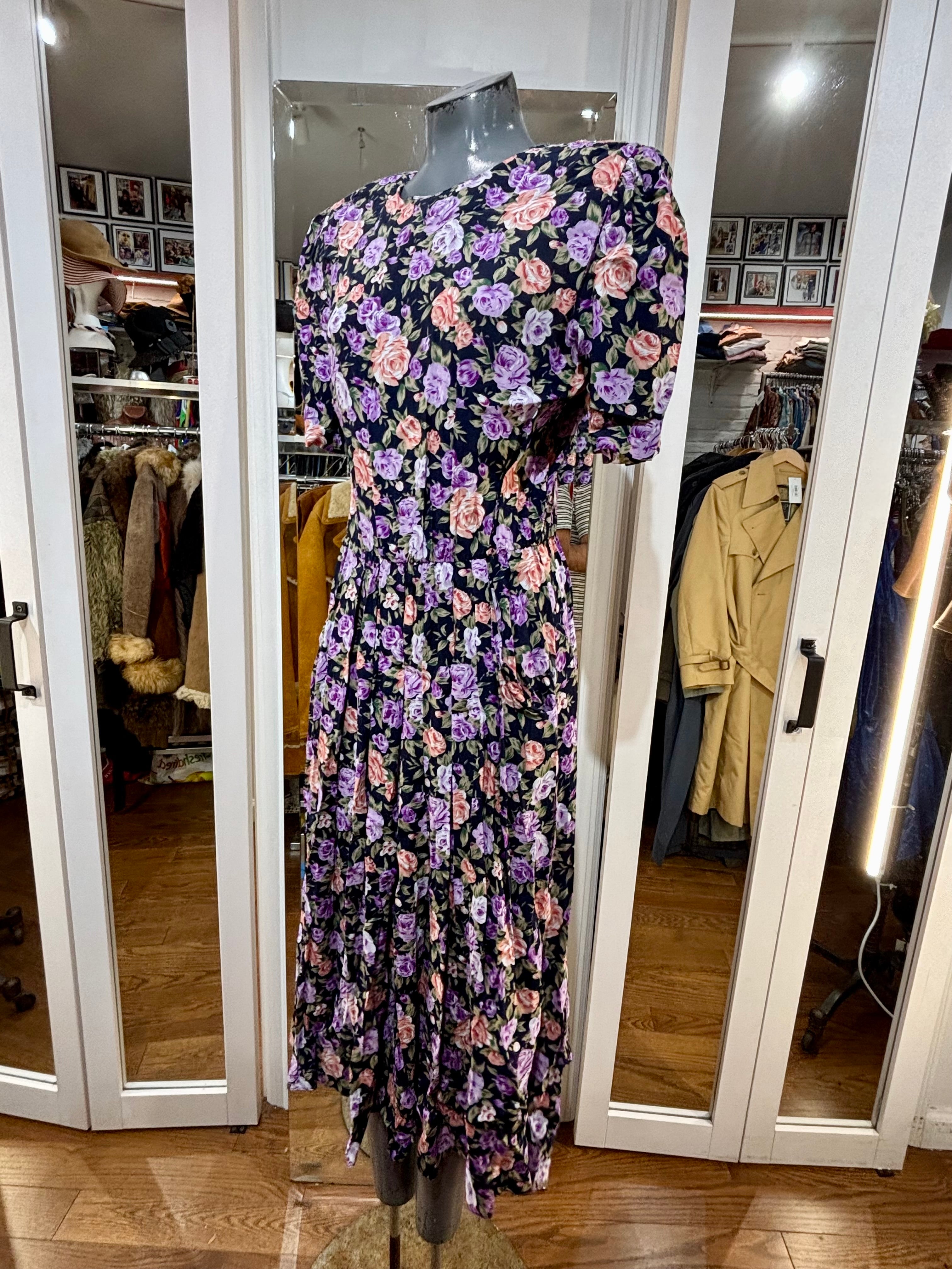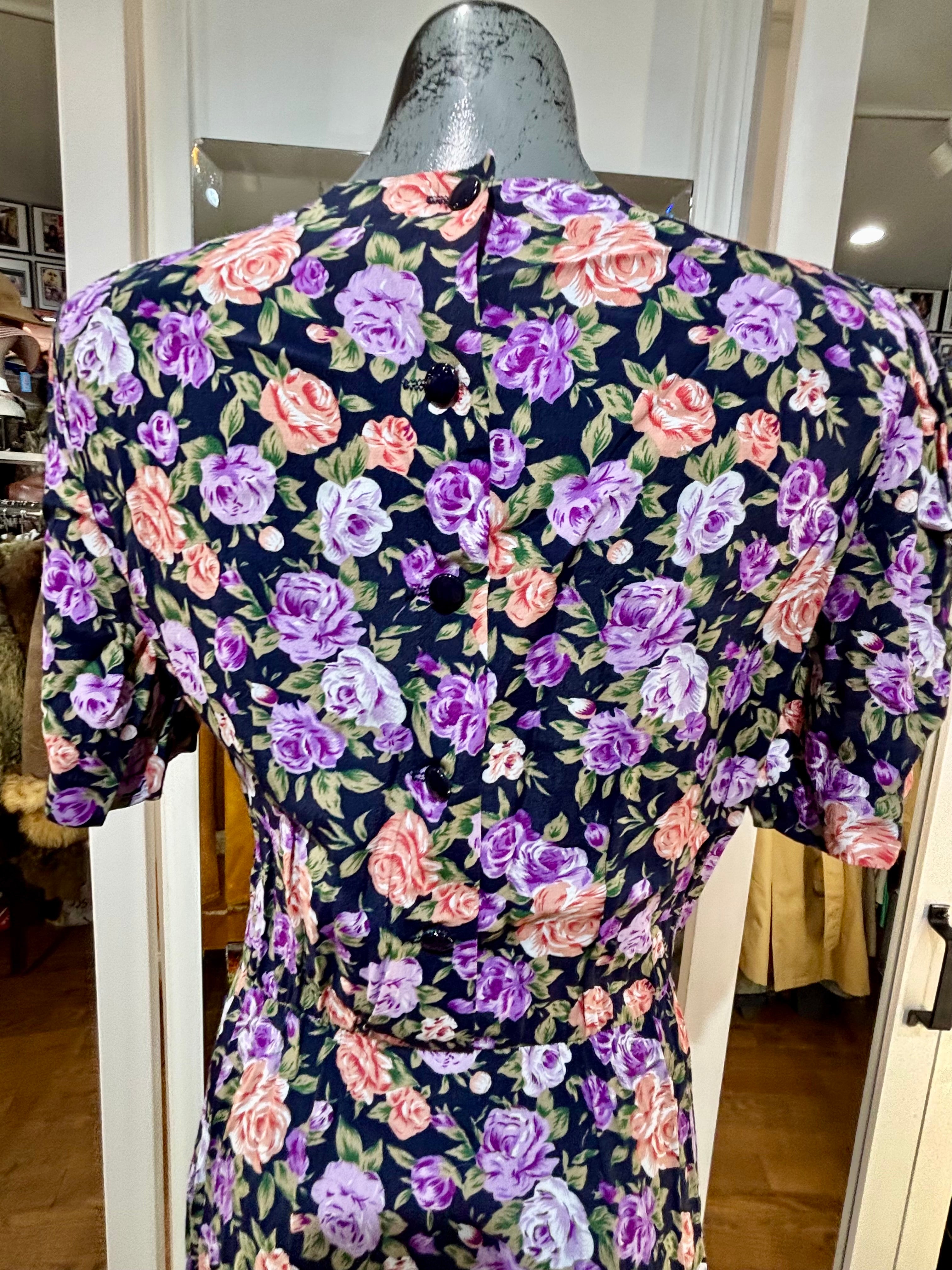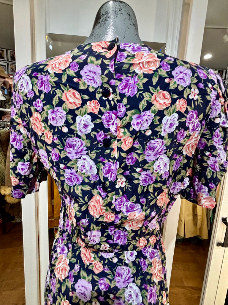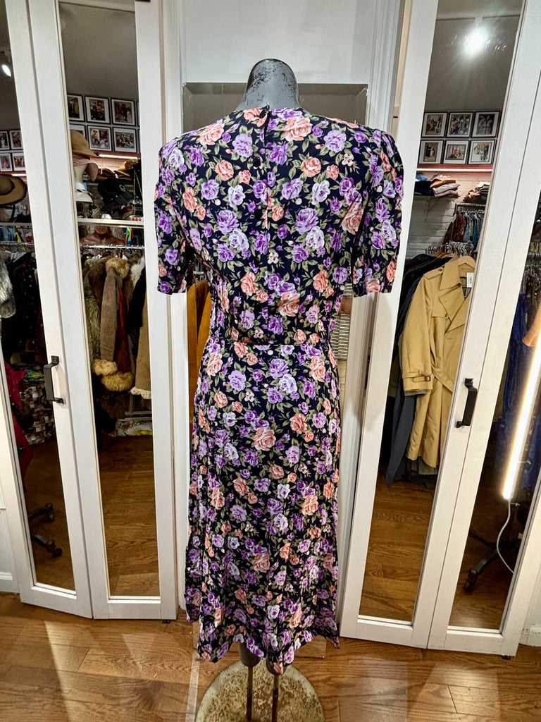 80’s Going 40’s Black And Purple Multicolor Flower Print Short Sleeve Dress By Ronnie Nicole