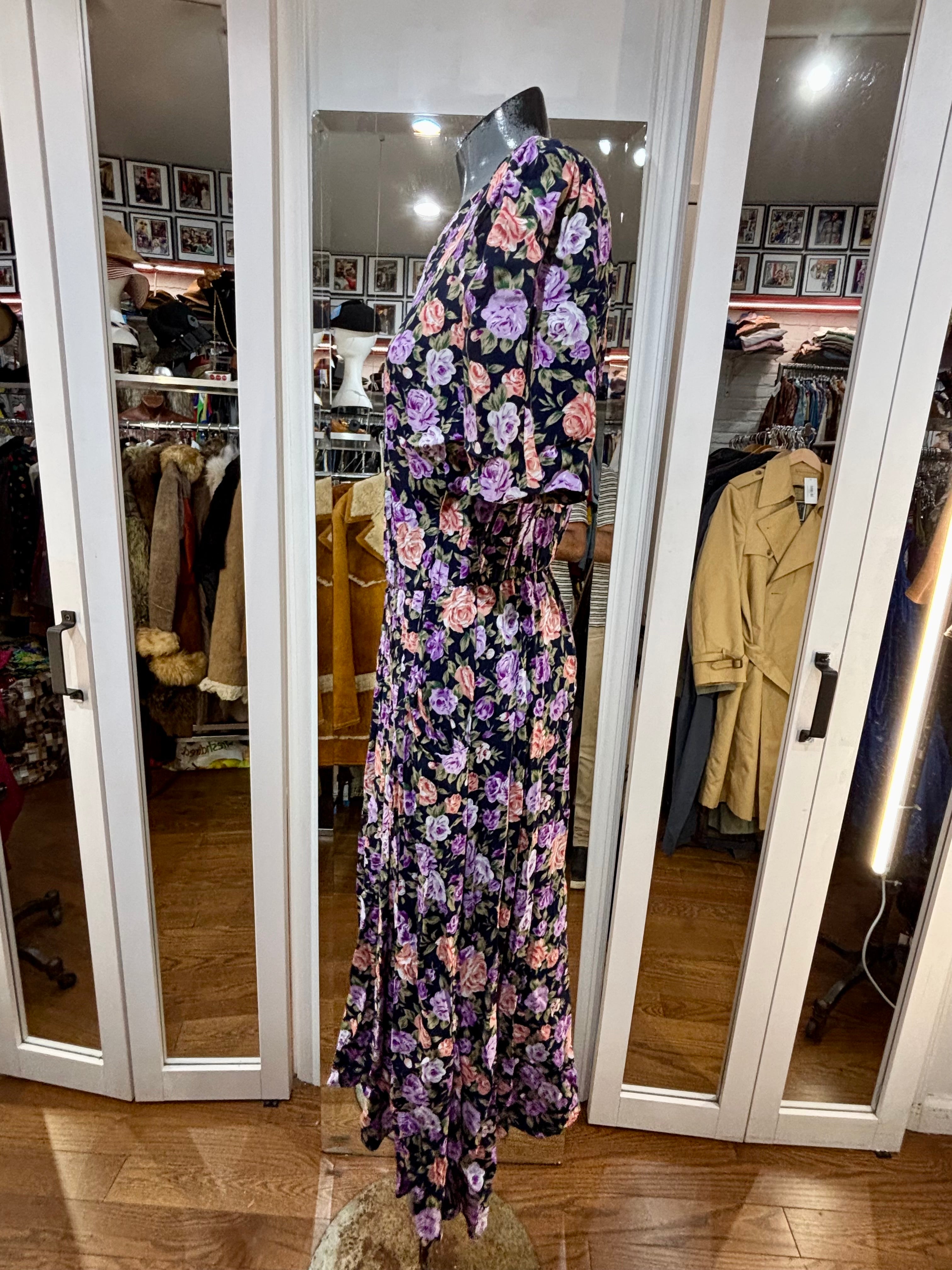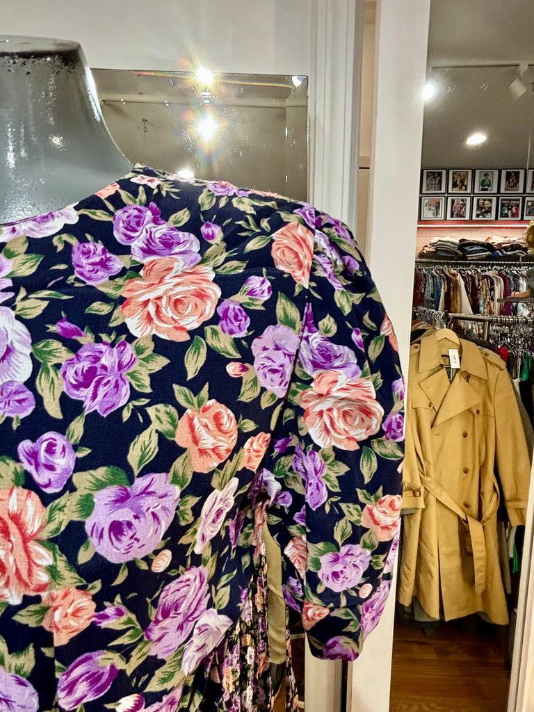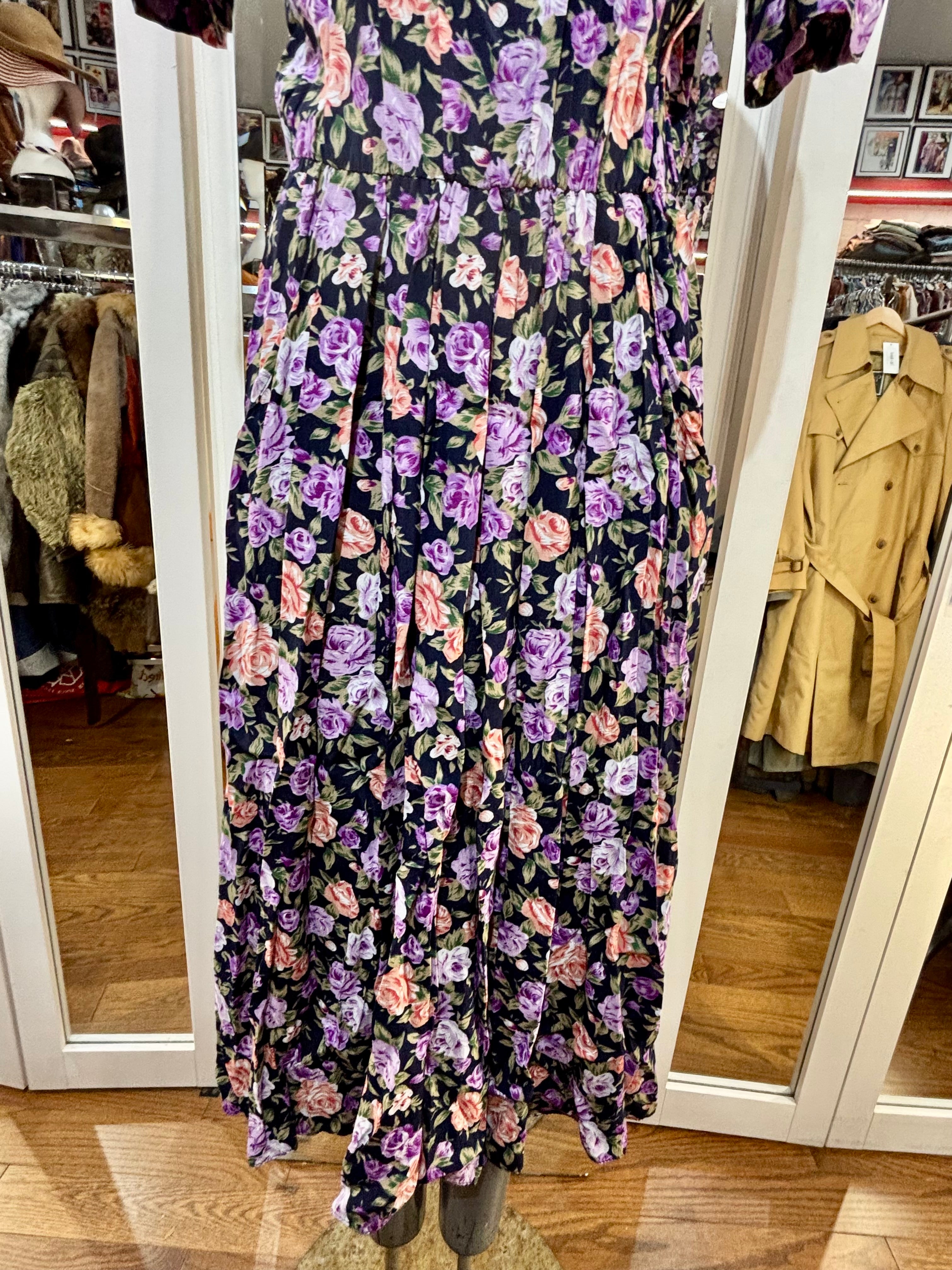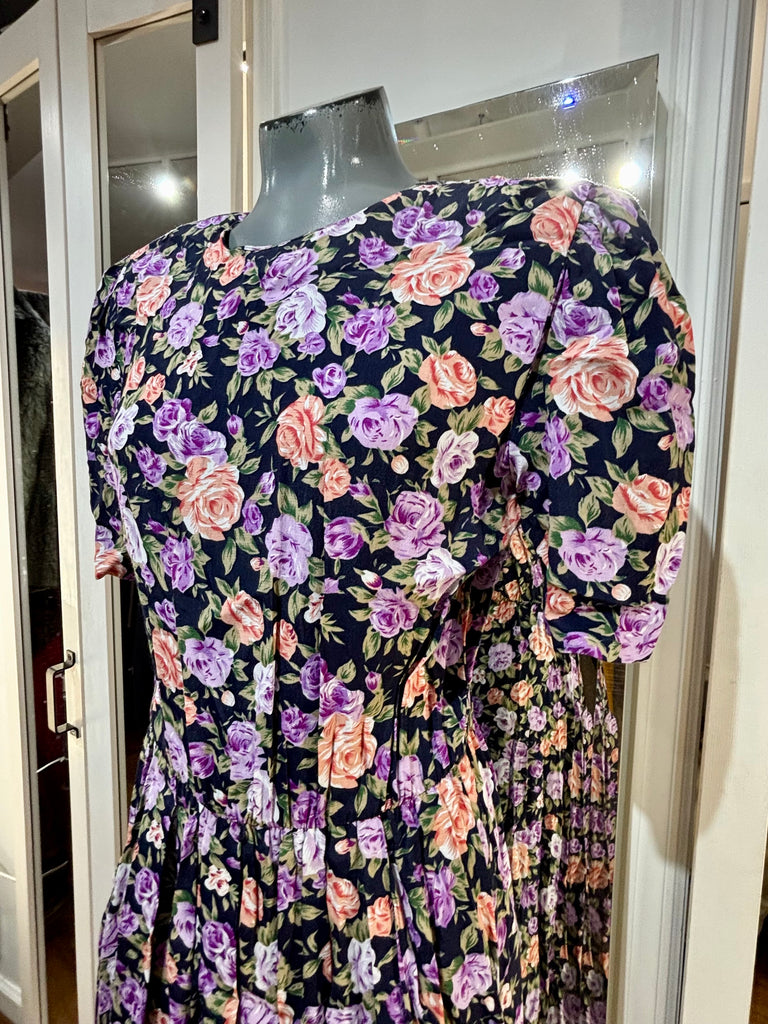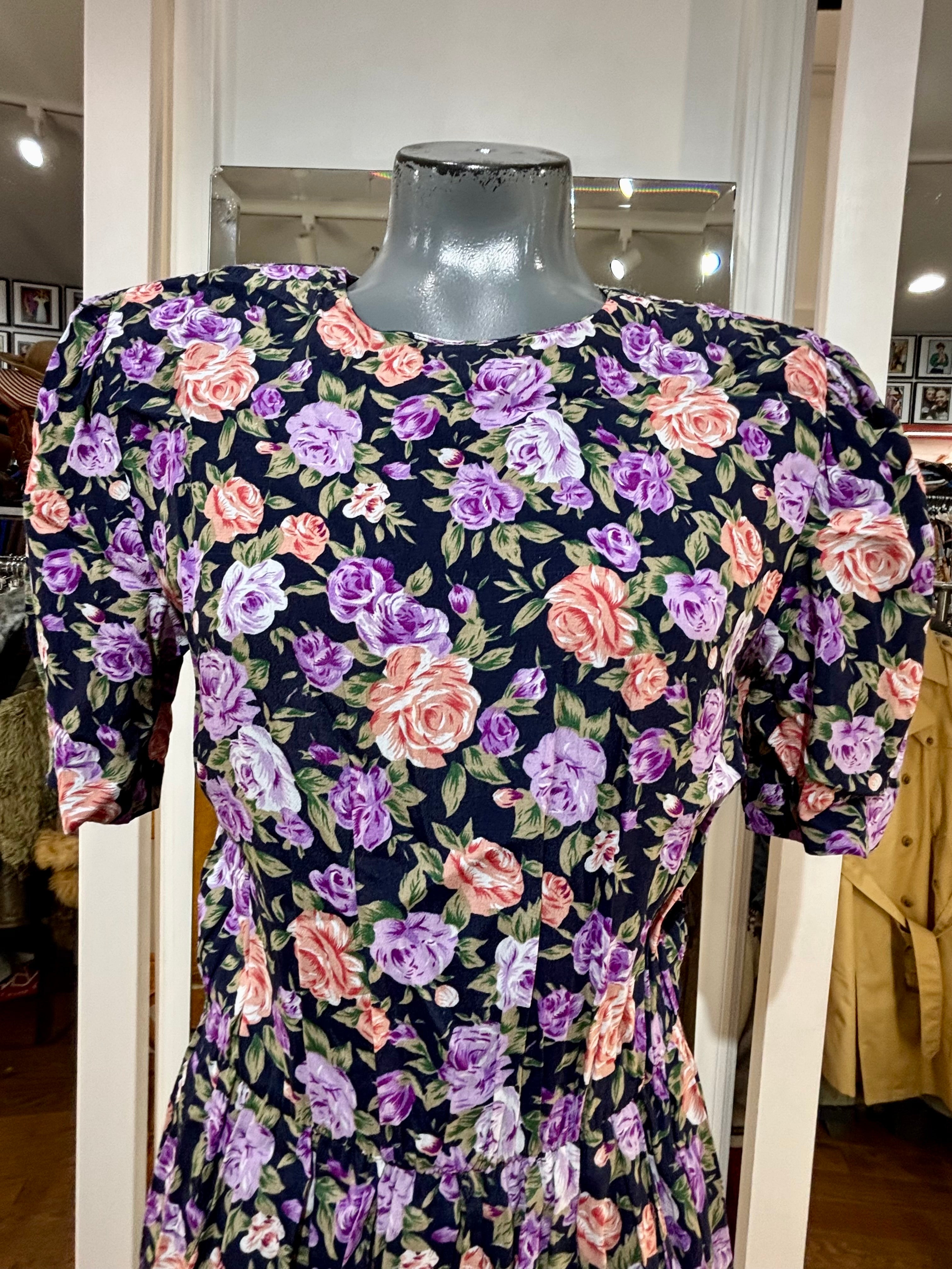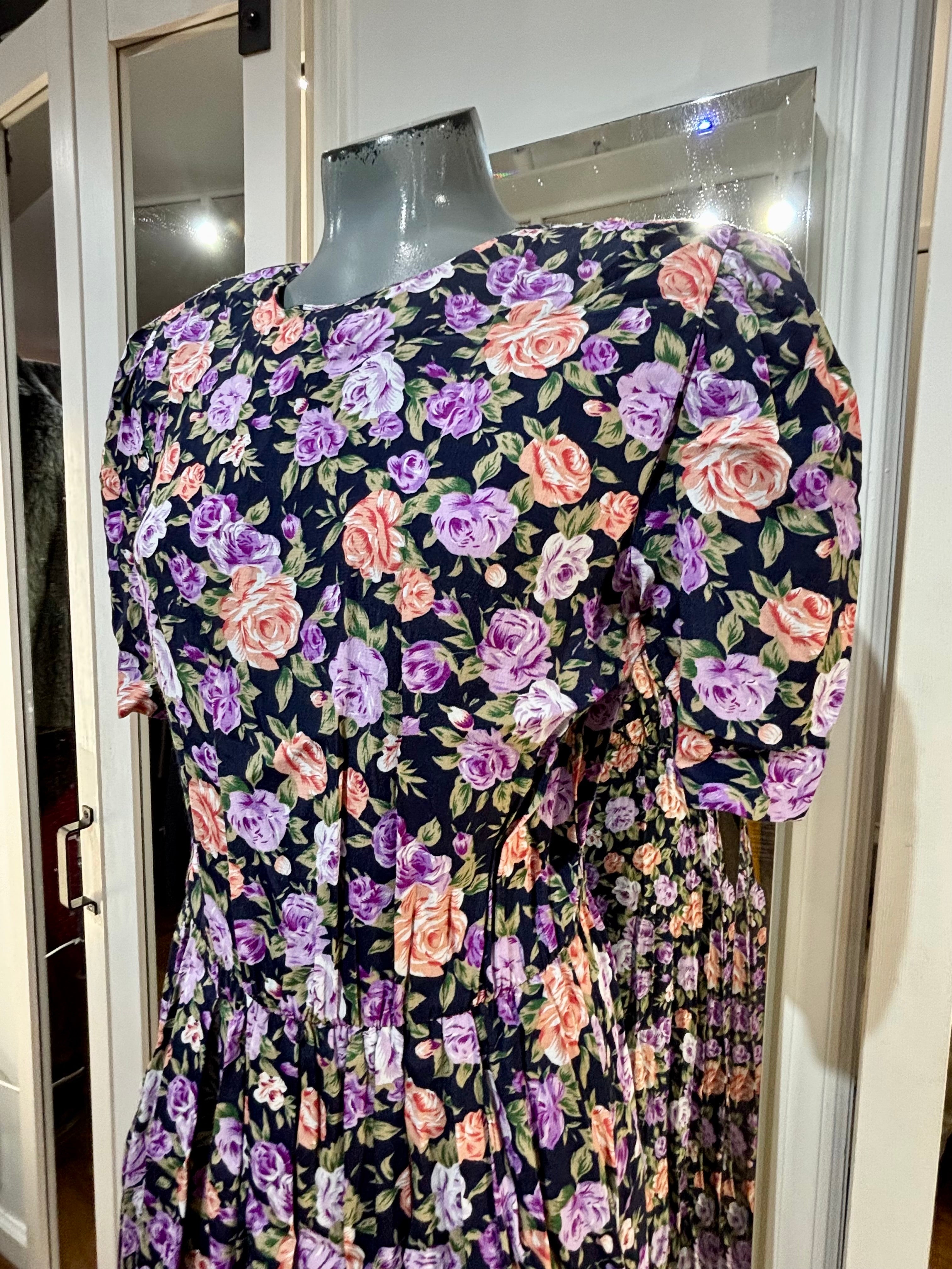 80’s Going 40’s Black And Purple Multicolor Flower Print Short Sleeve Dress By Ronnie Nicole