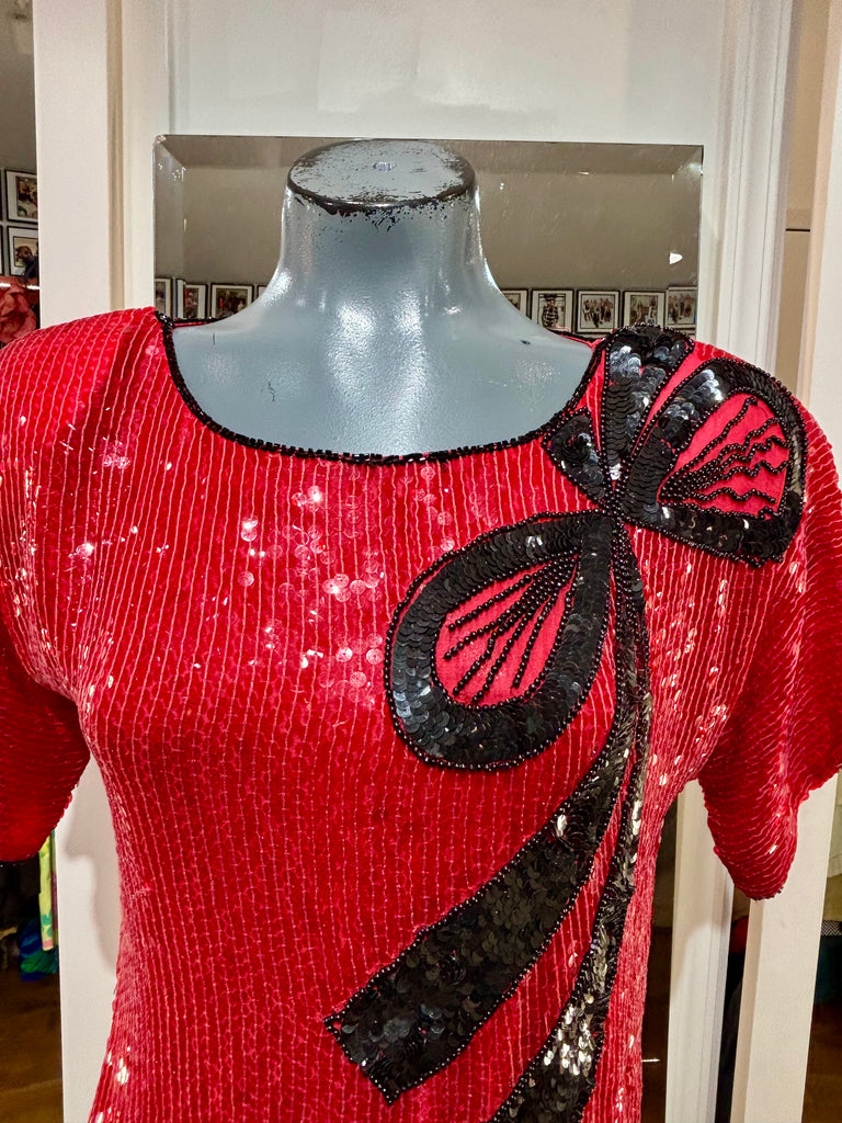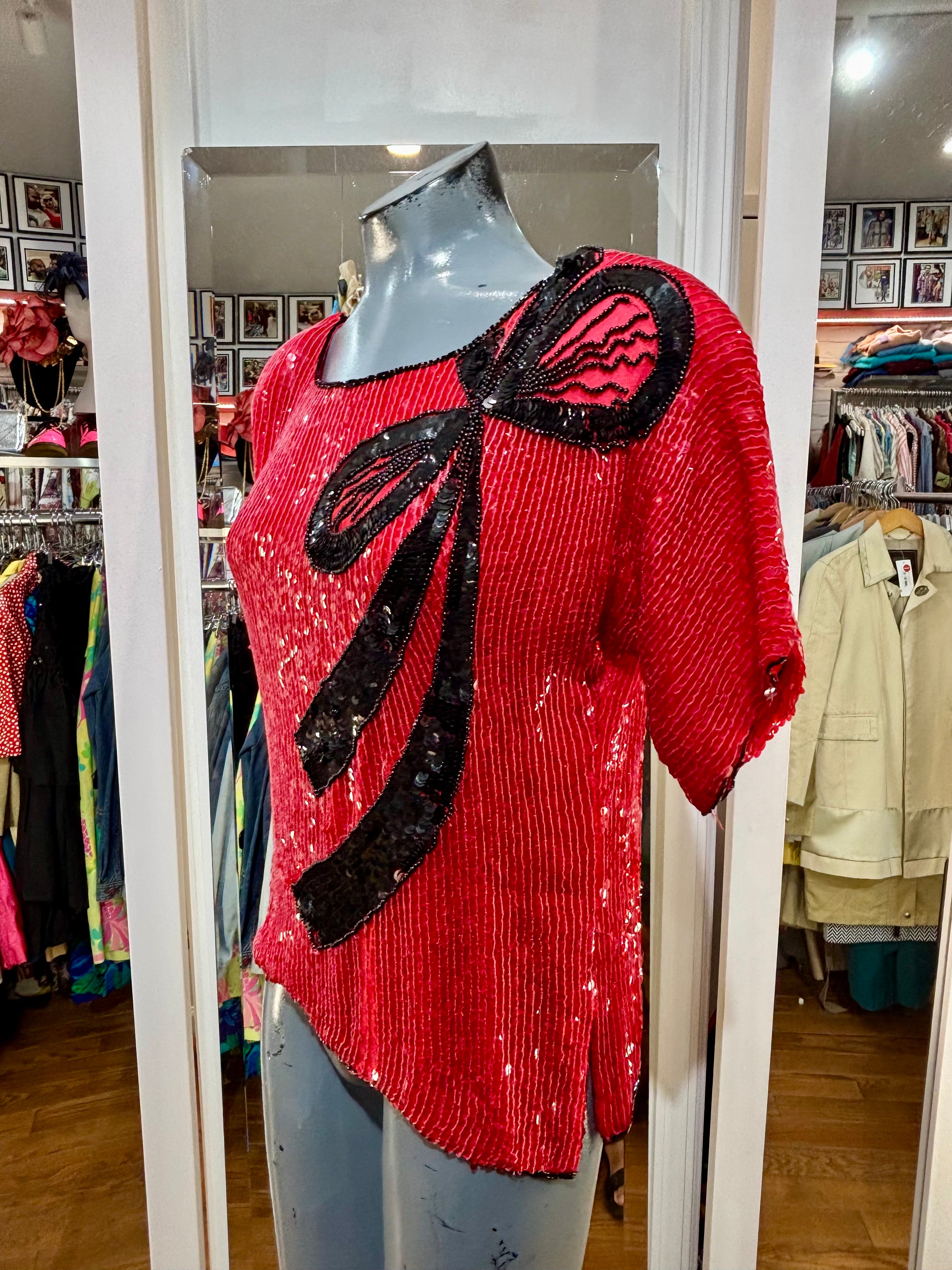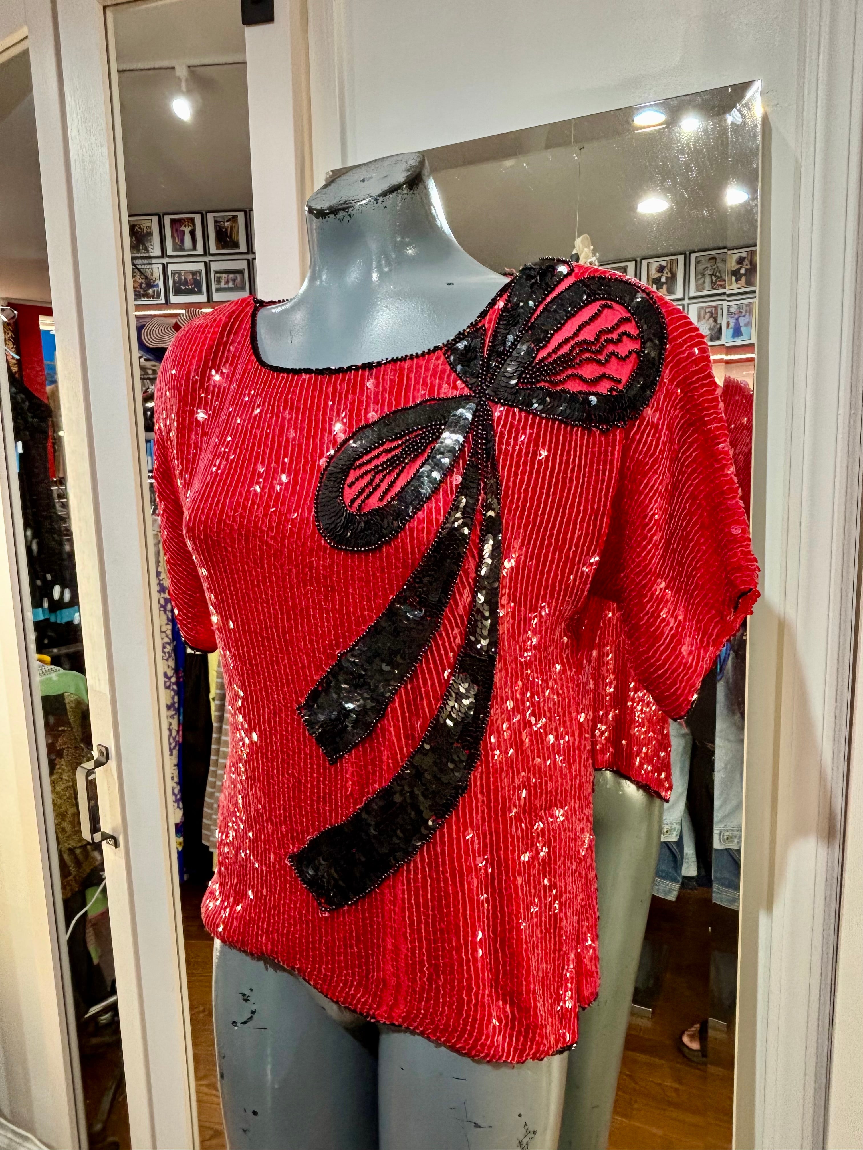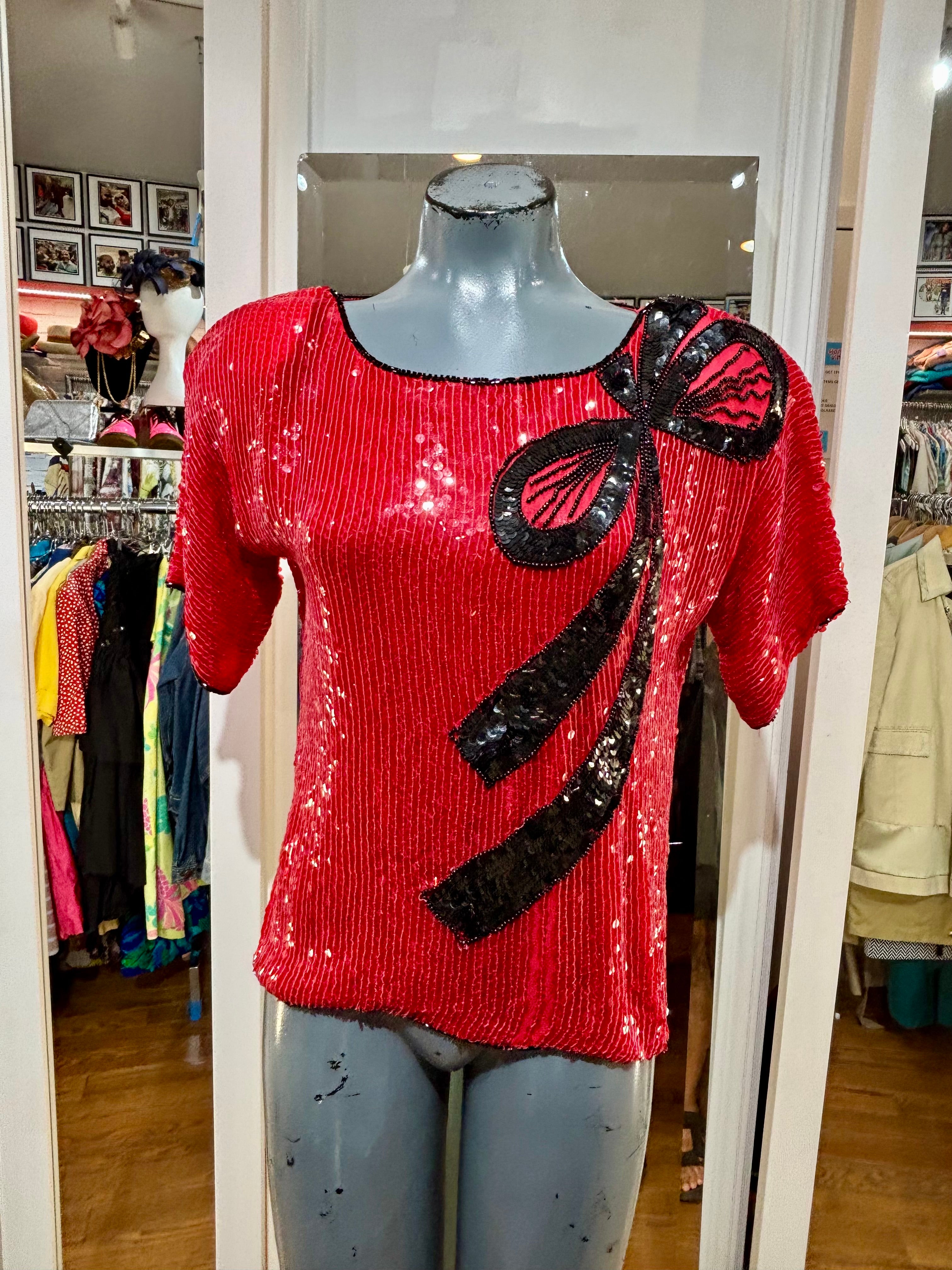 80’s Red & Black Bow Details Short Sleeve Sequins Top By