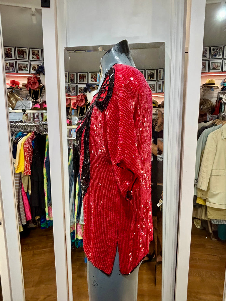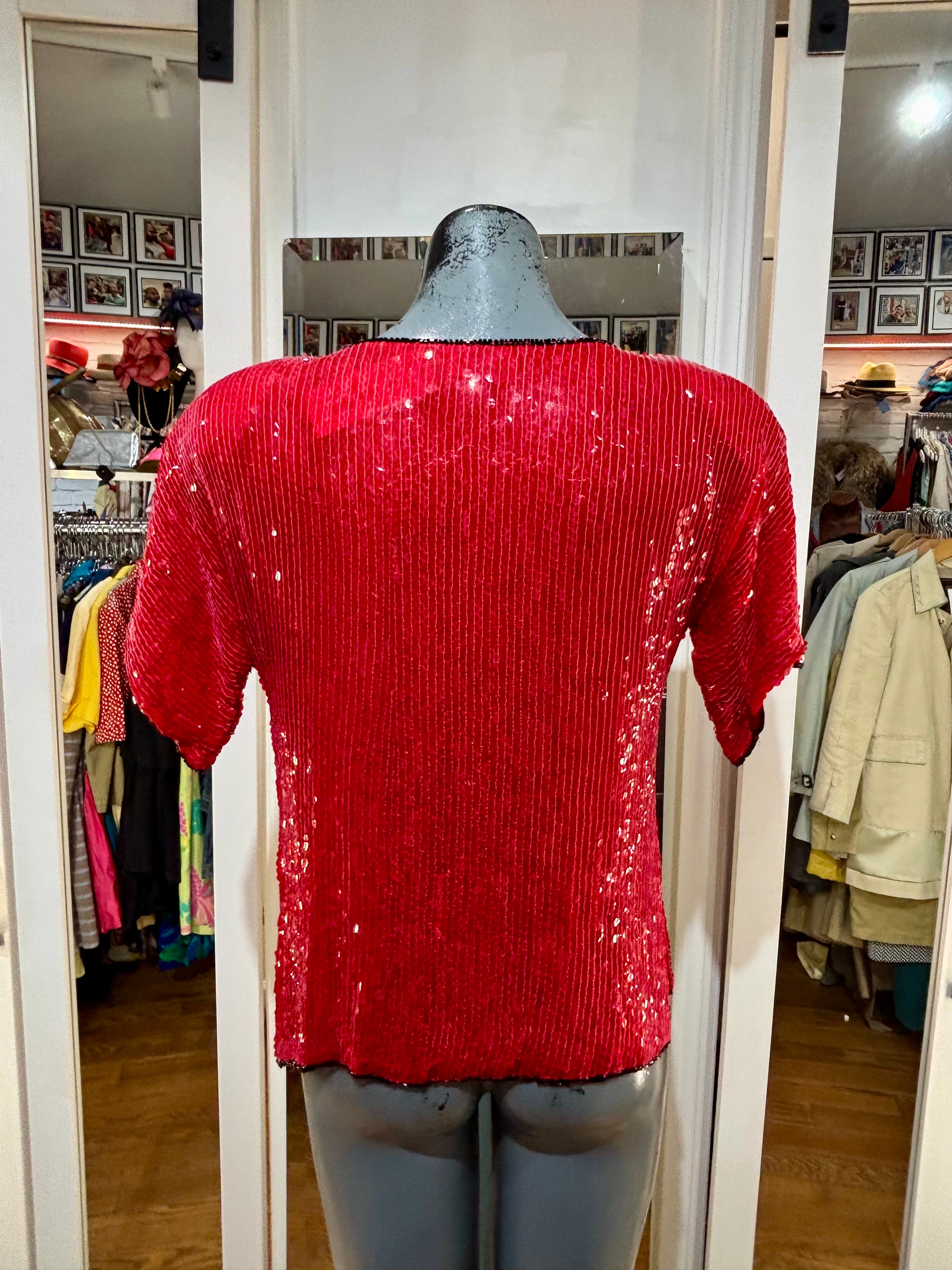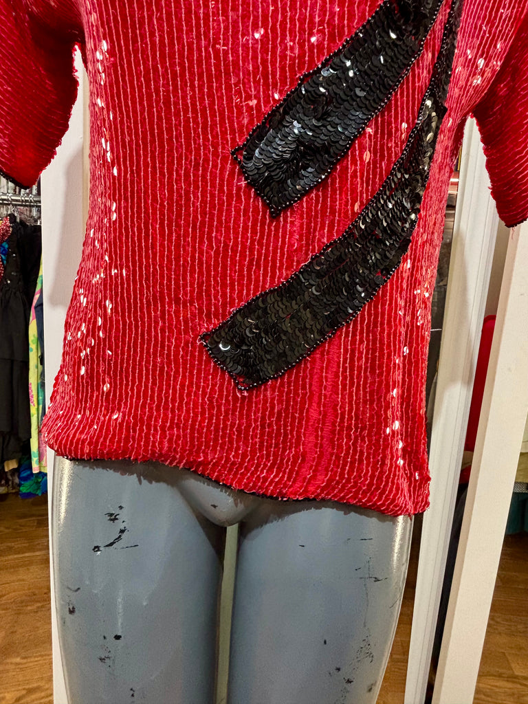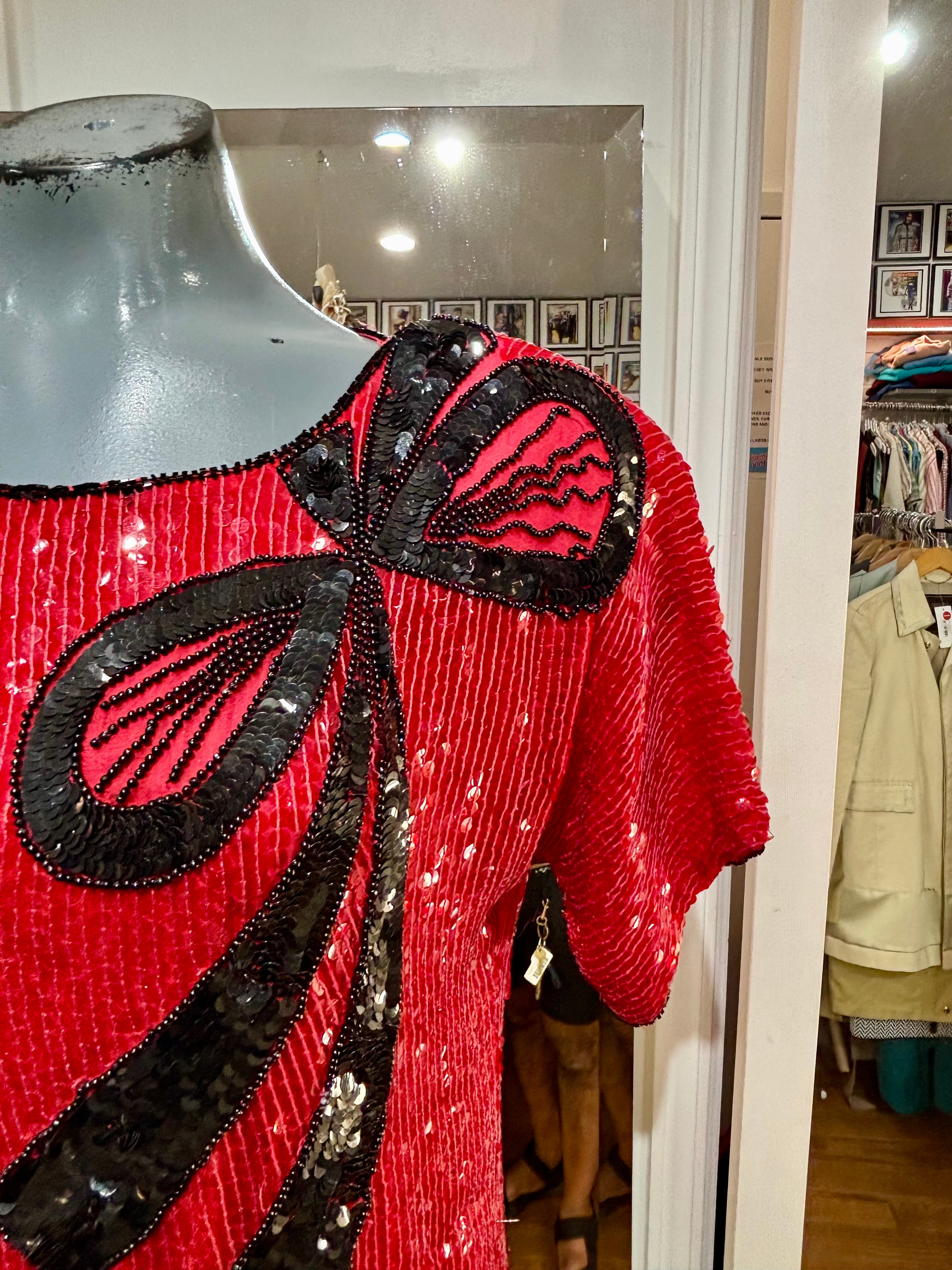 80’s Red & Black Bow Details Short Sleeve Sequins Top By