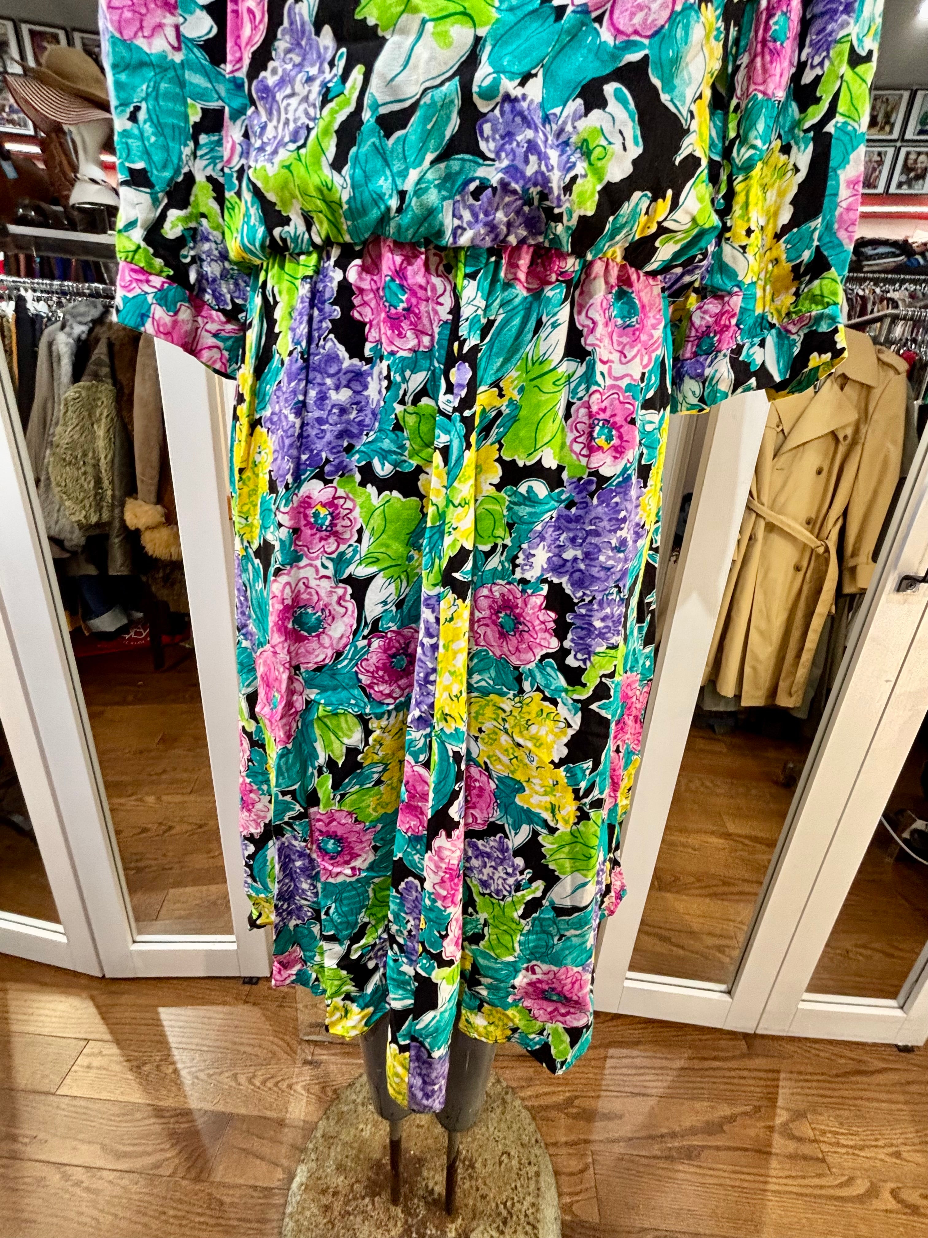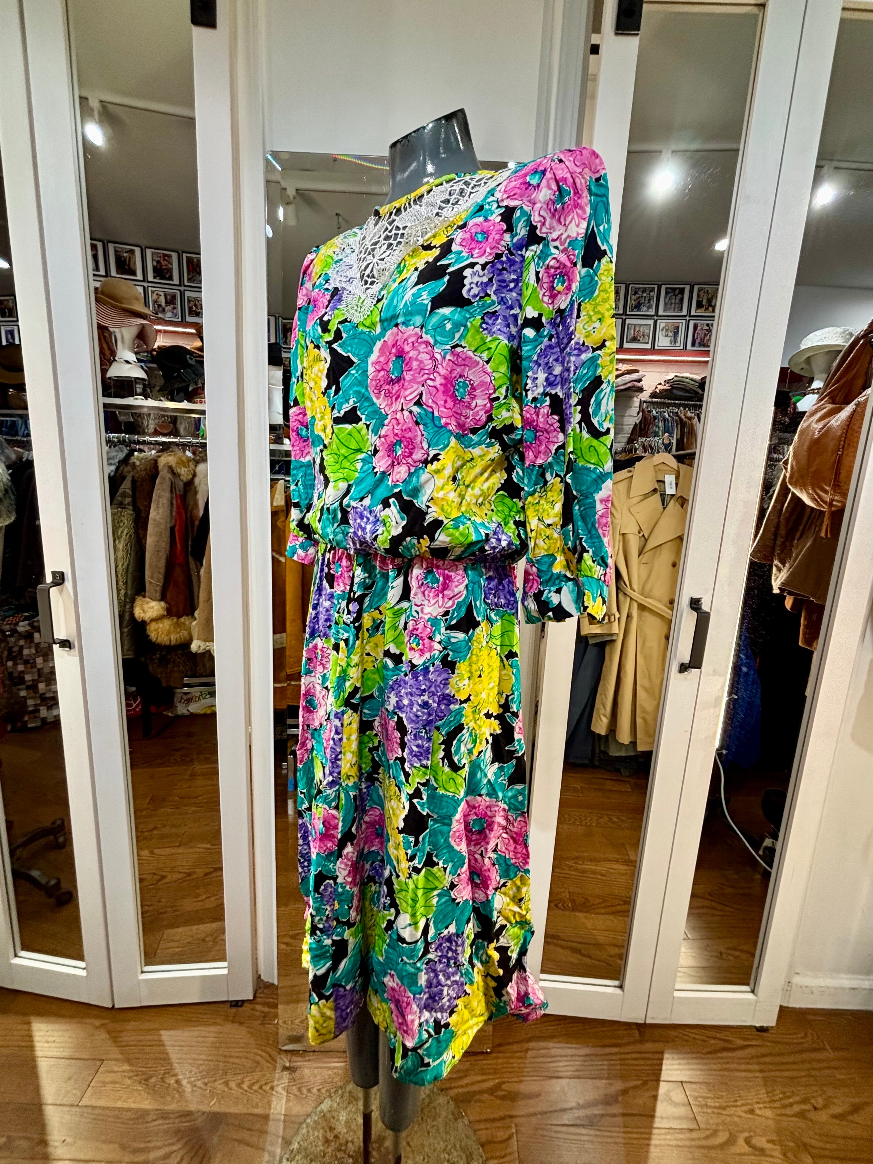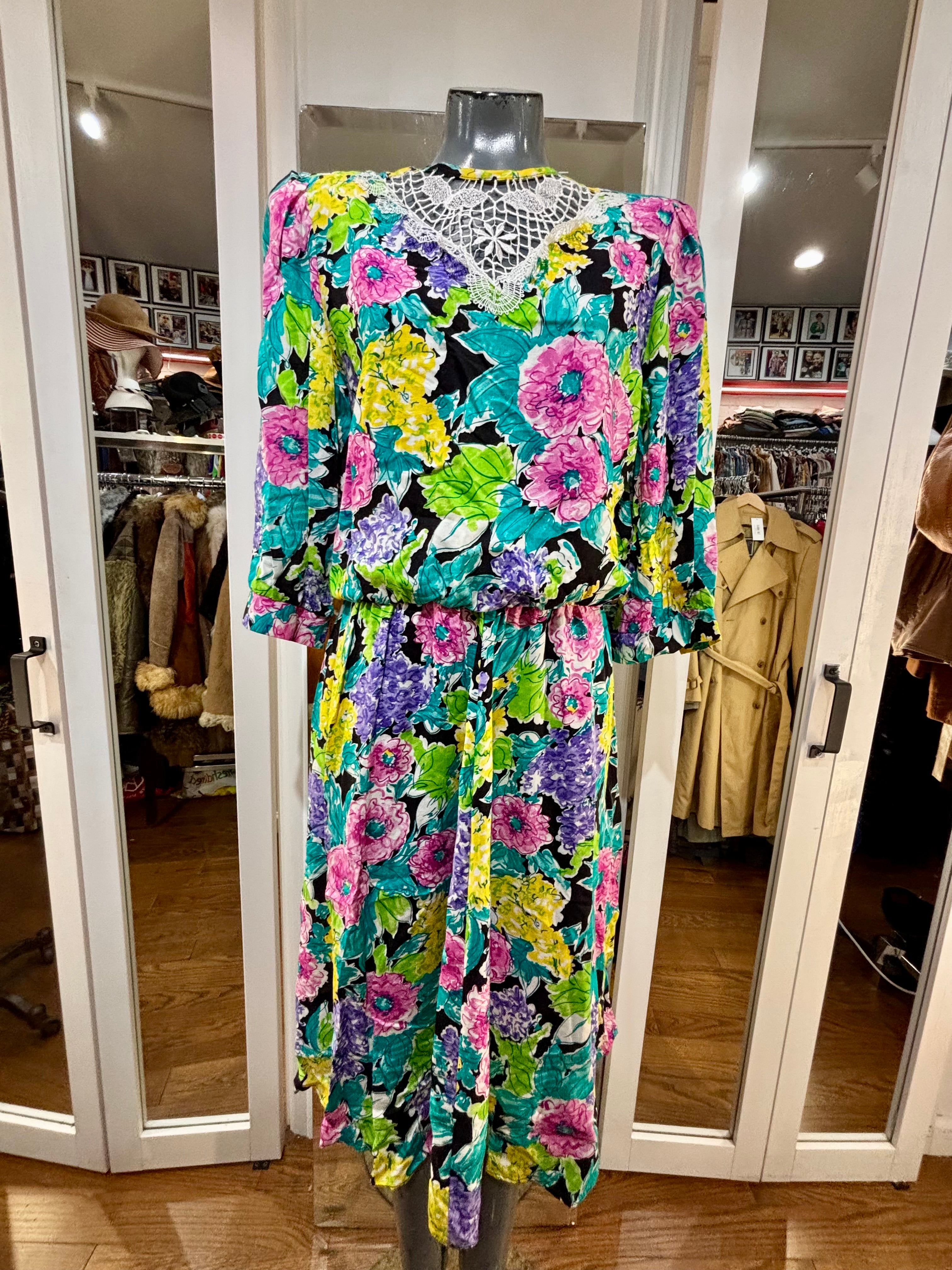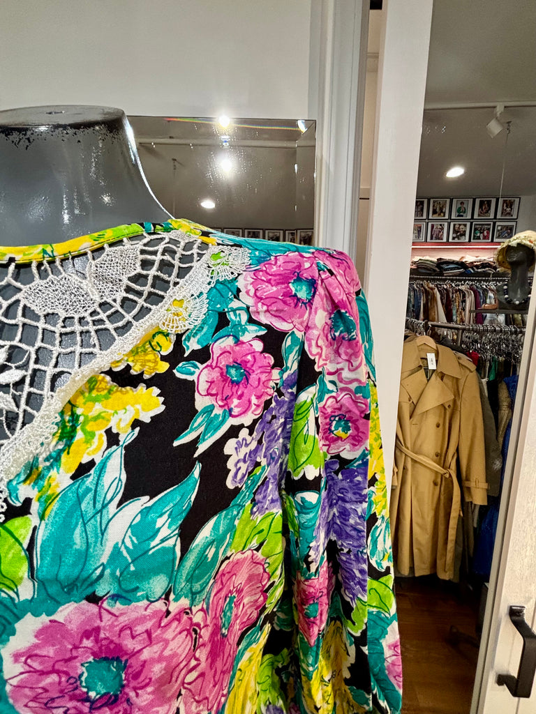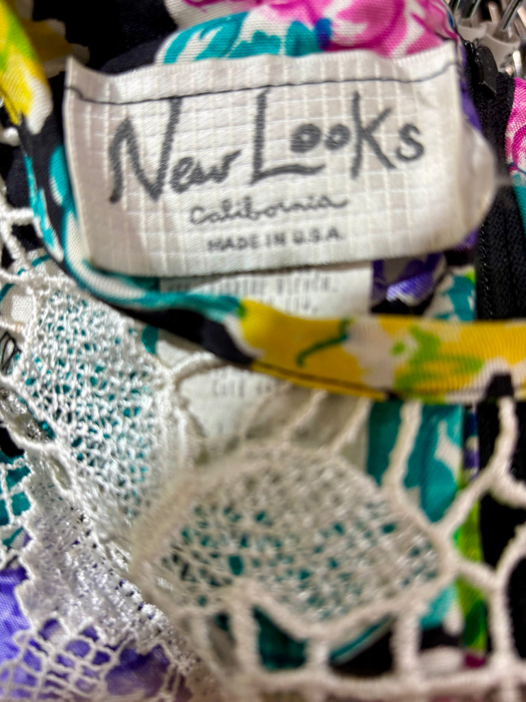 80’s Multicolor Flower Print Dress With Lace Collar By New Looks California