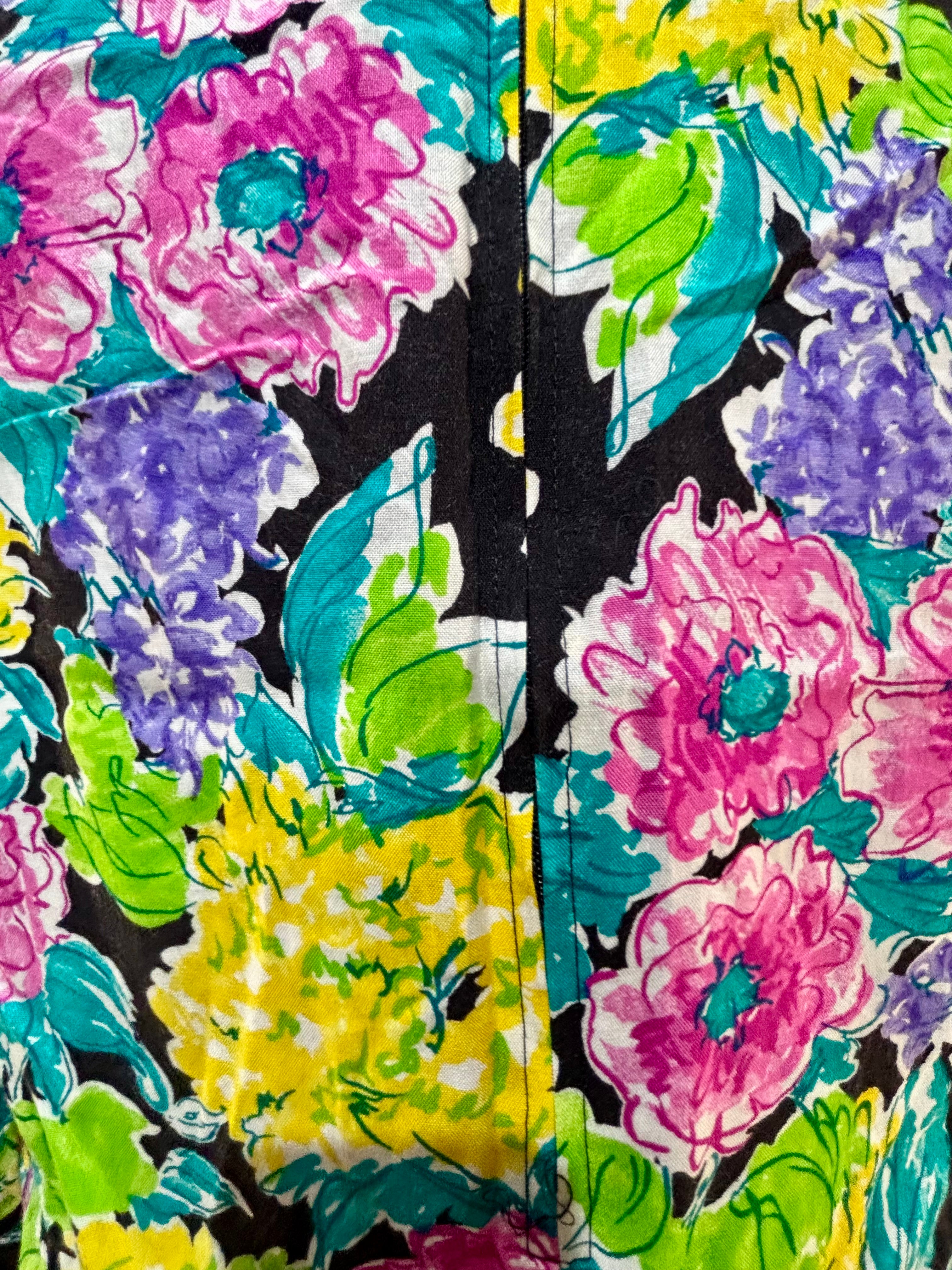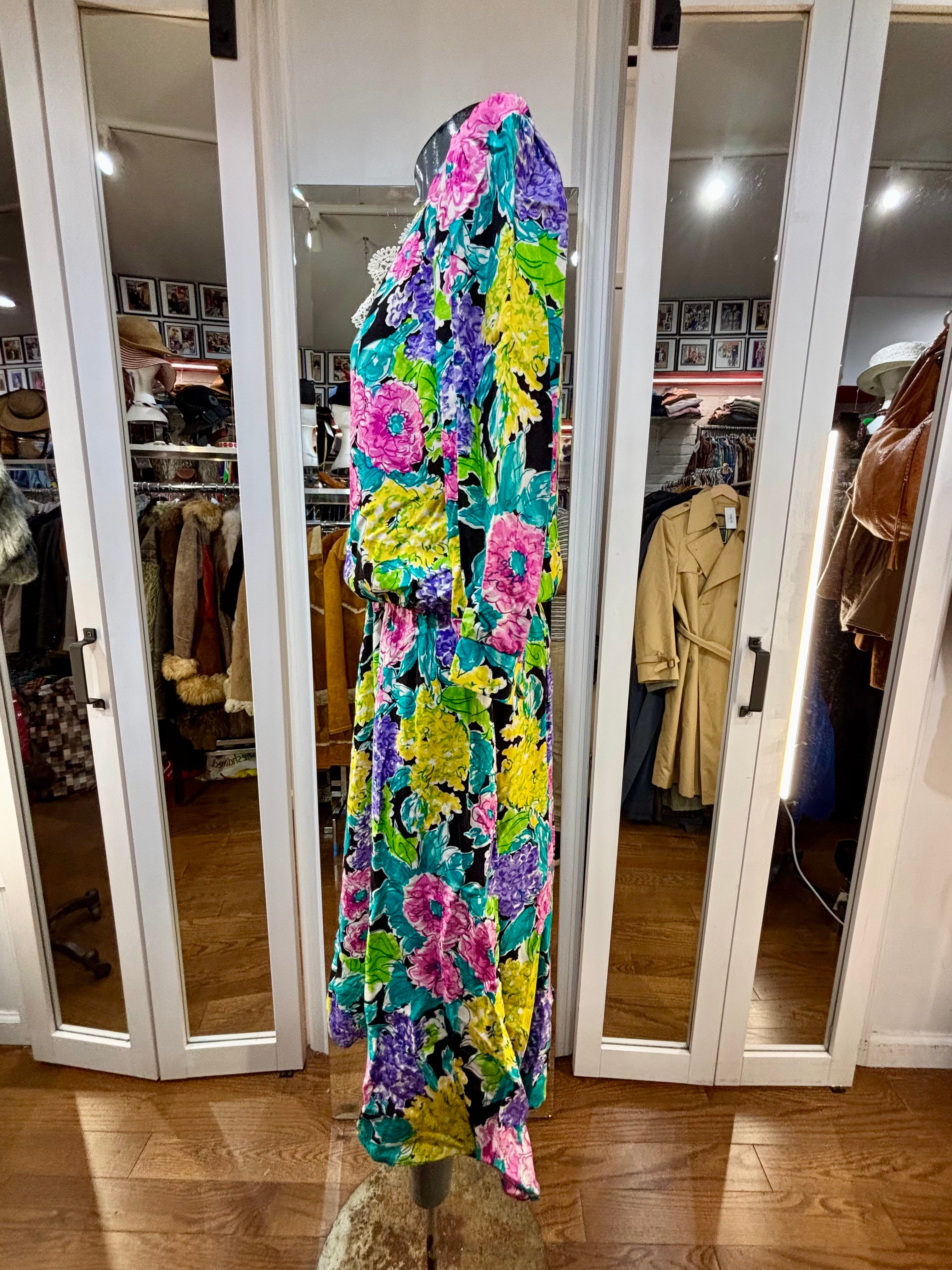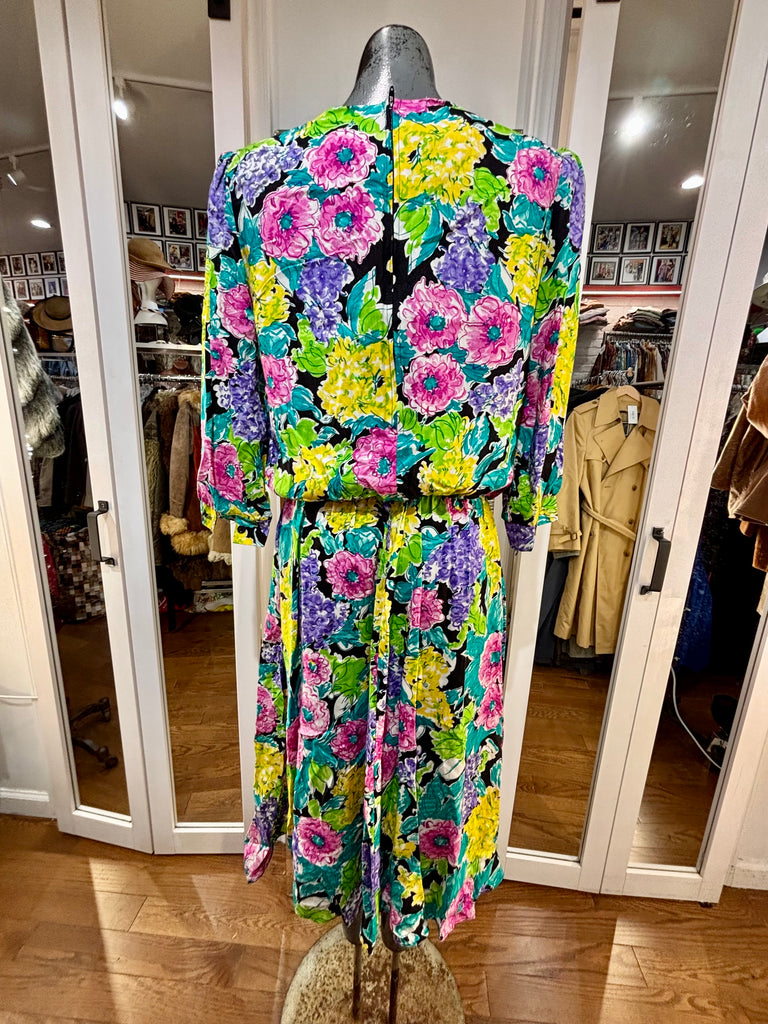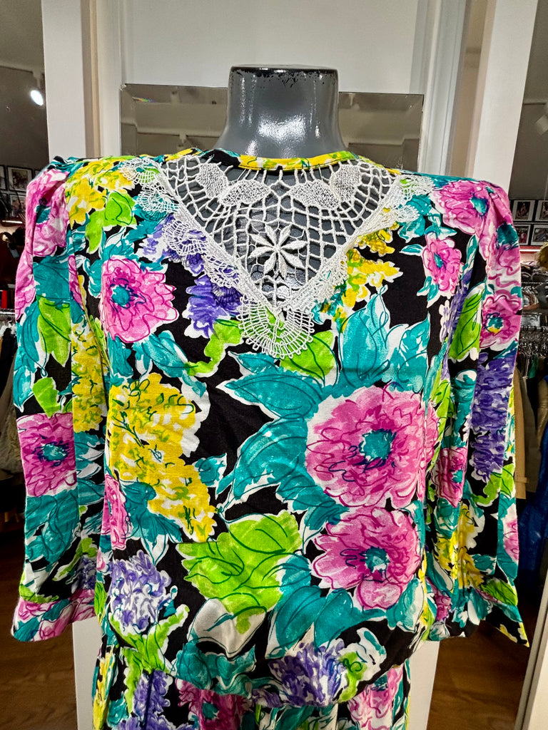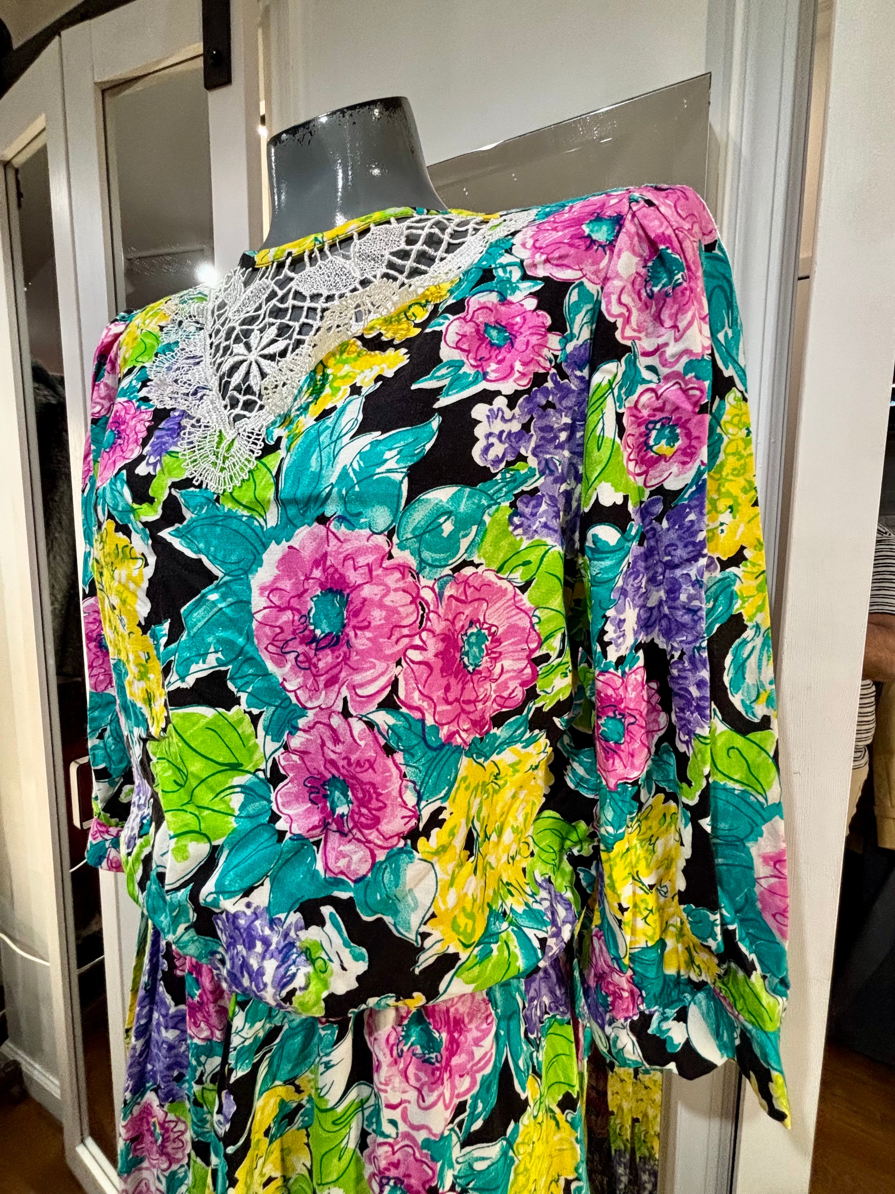 80’s Multicolor Flower Print Dress With Lace Collar By New Looks California