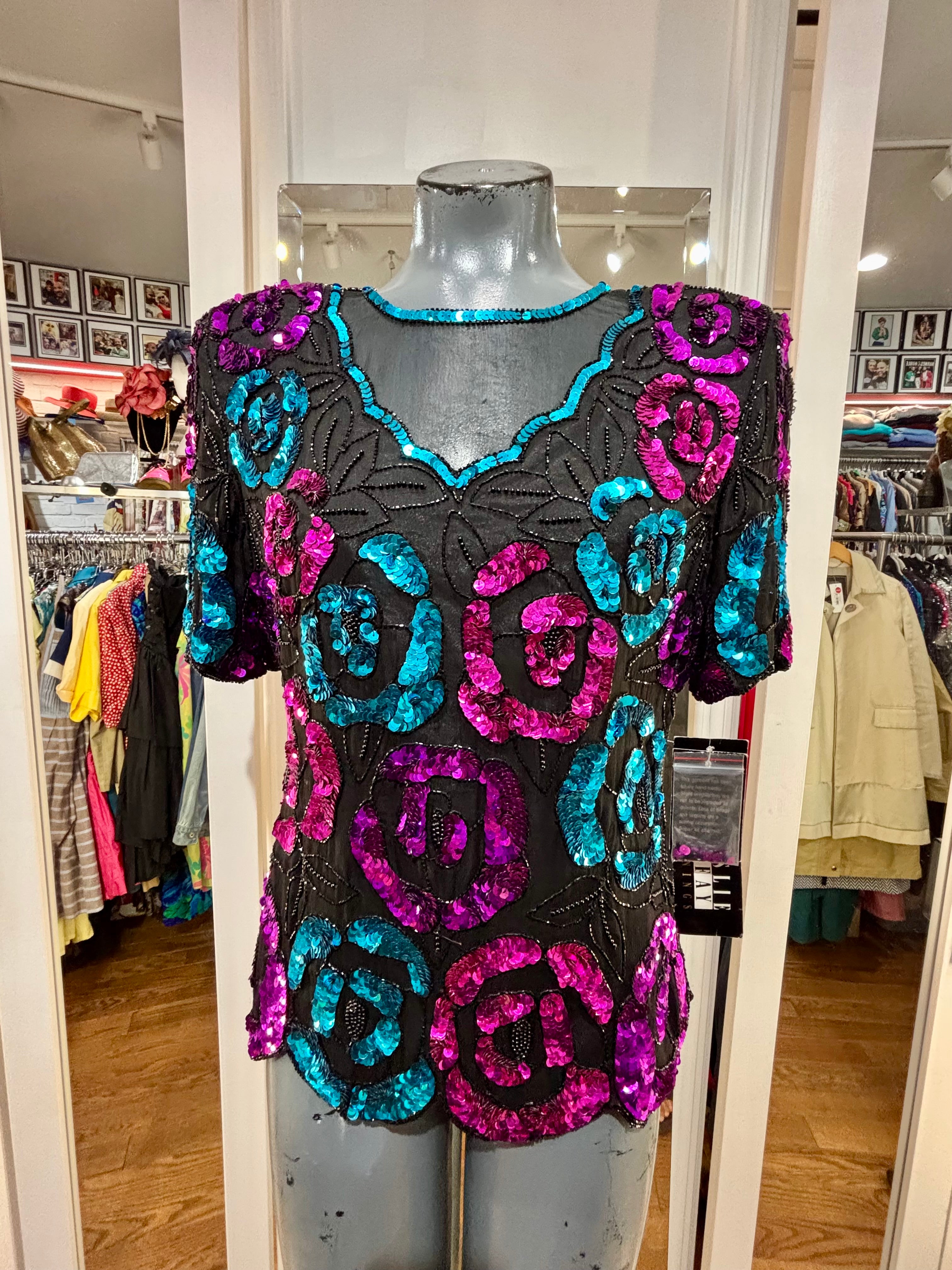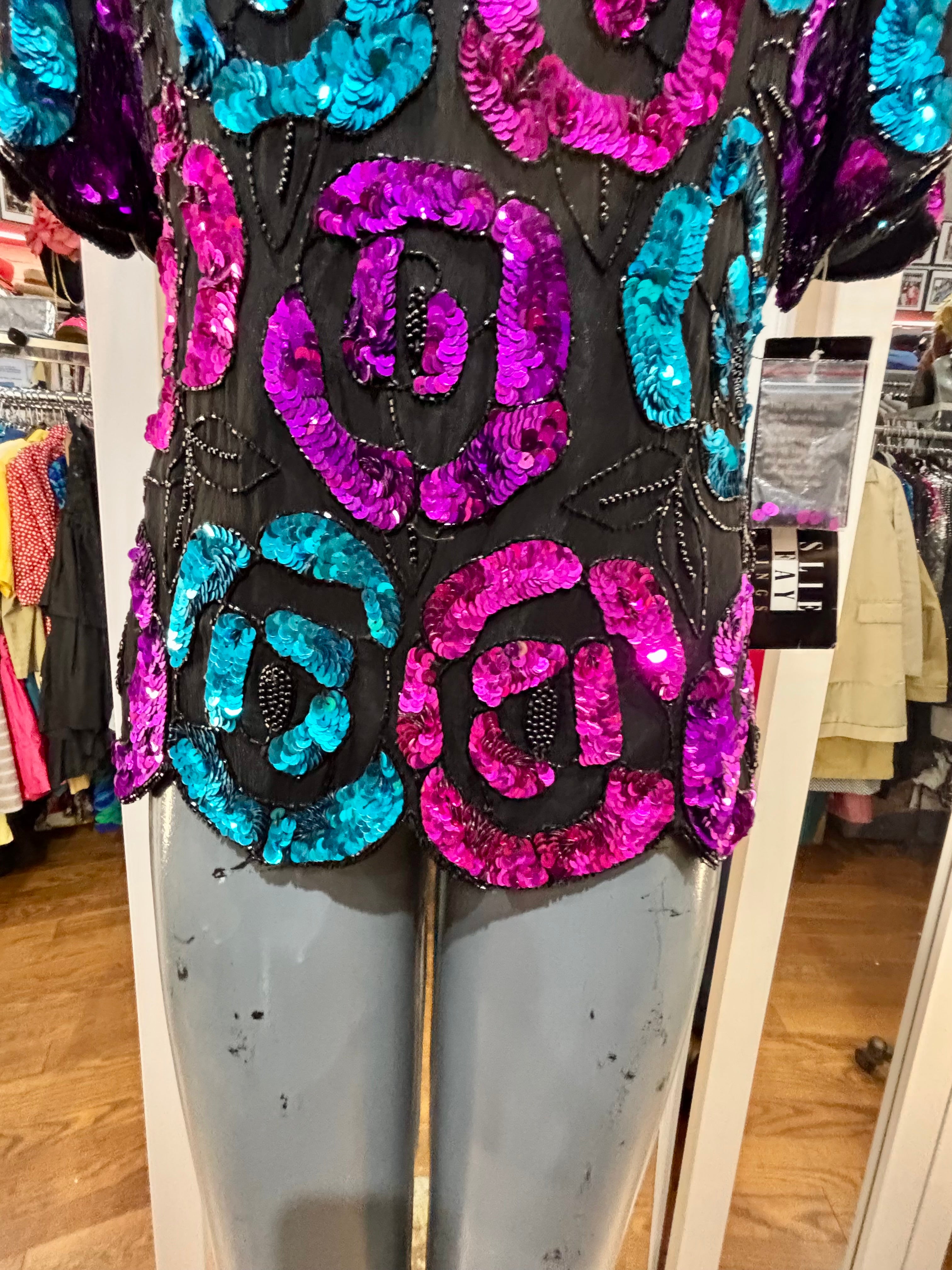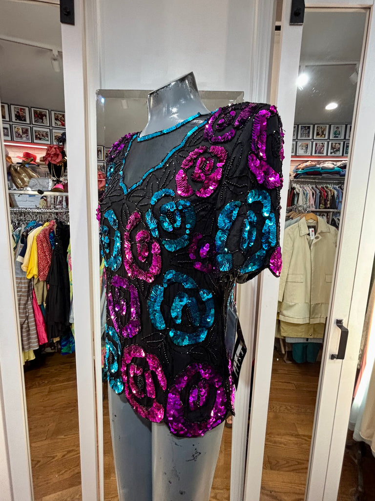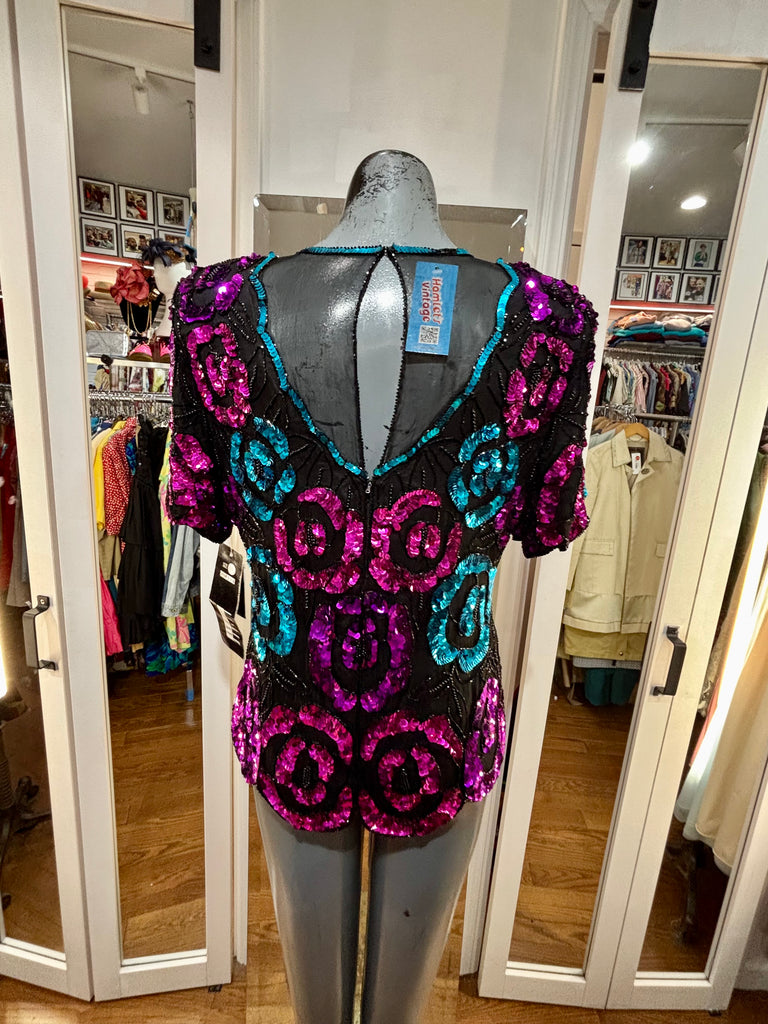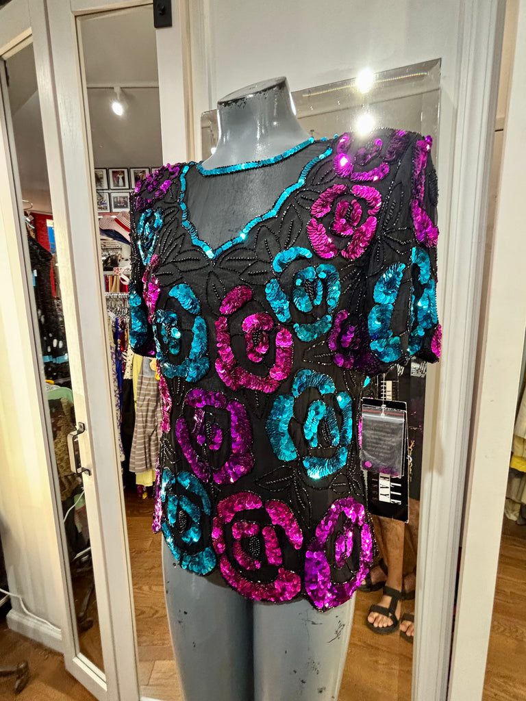 80’s Turquoise & Pink Short Sleeve Sequins Top By Leslie Fay Evening