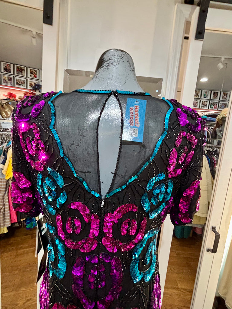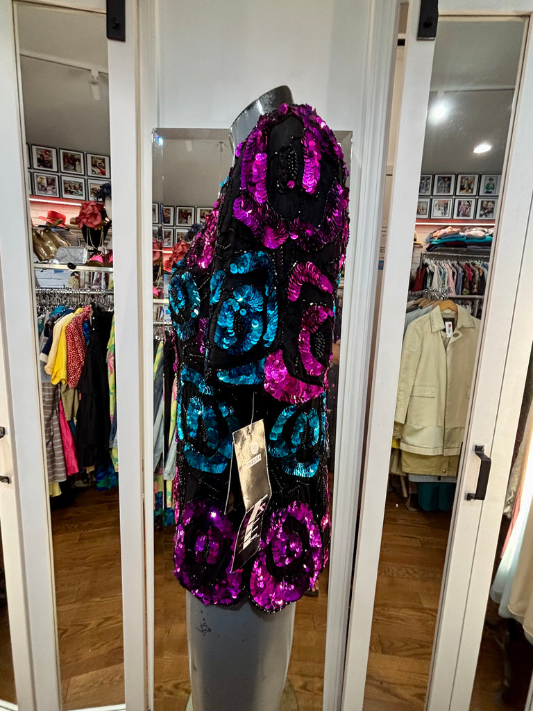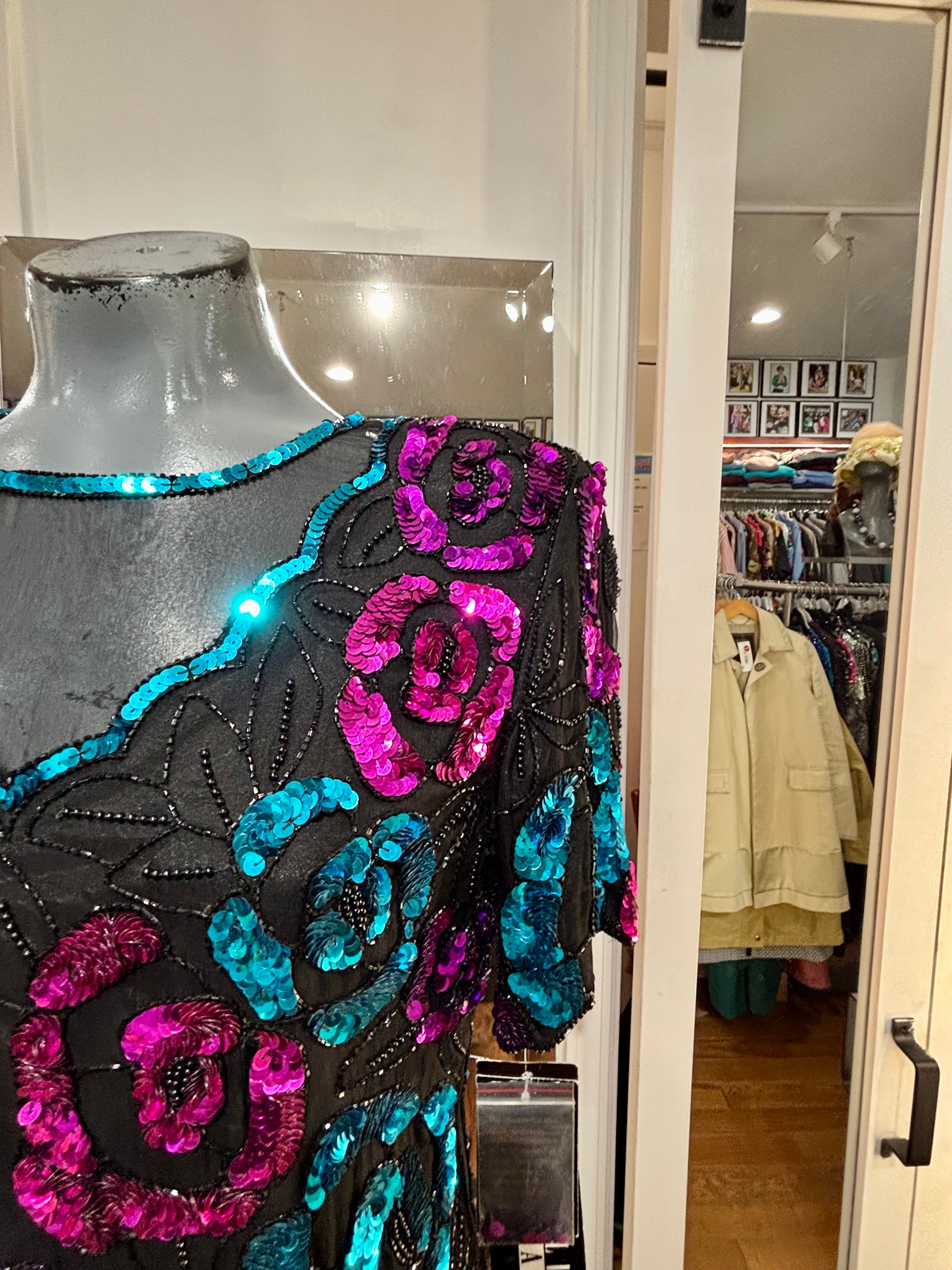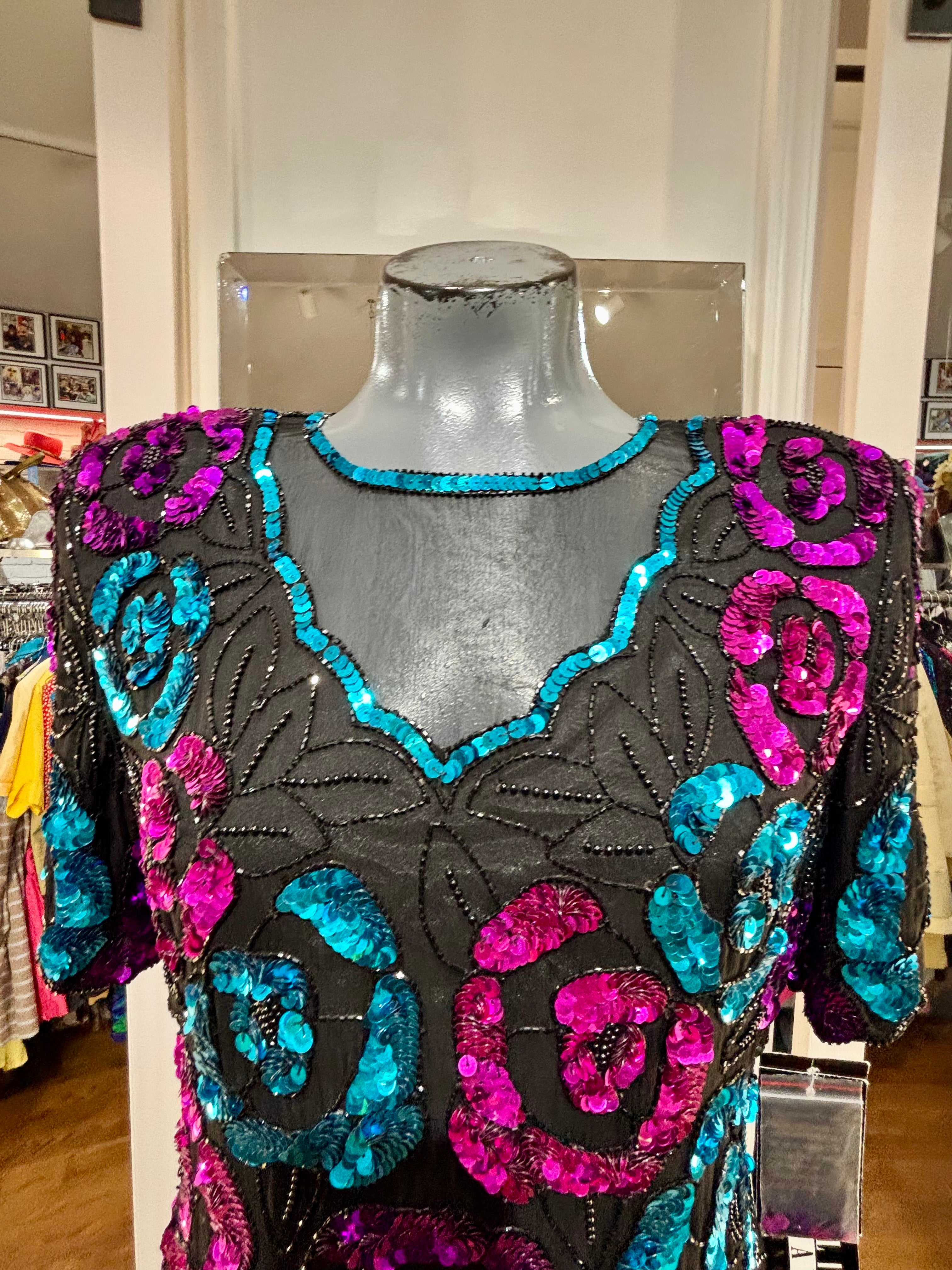 80’s Turquoise & Pink Short Sleeve Sequins Top By Leslie Fay Evening