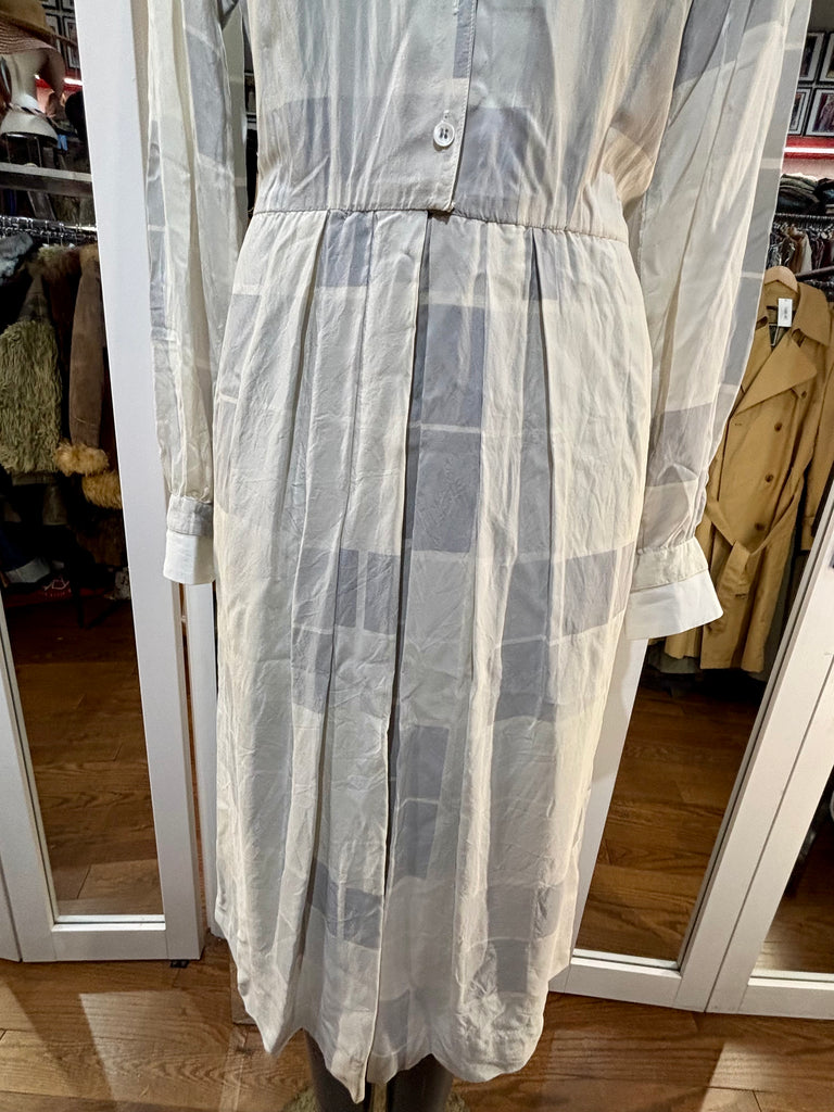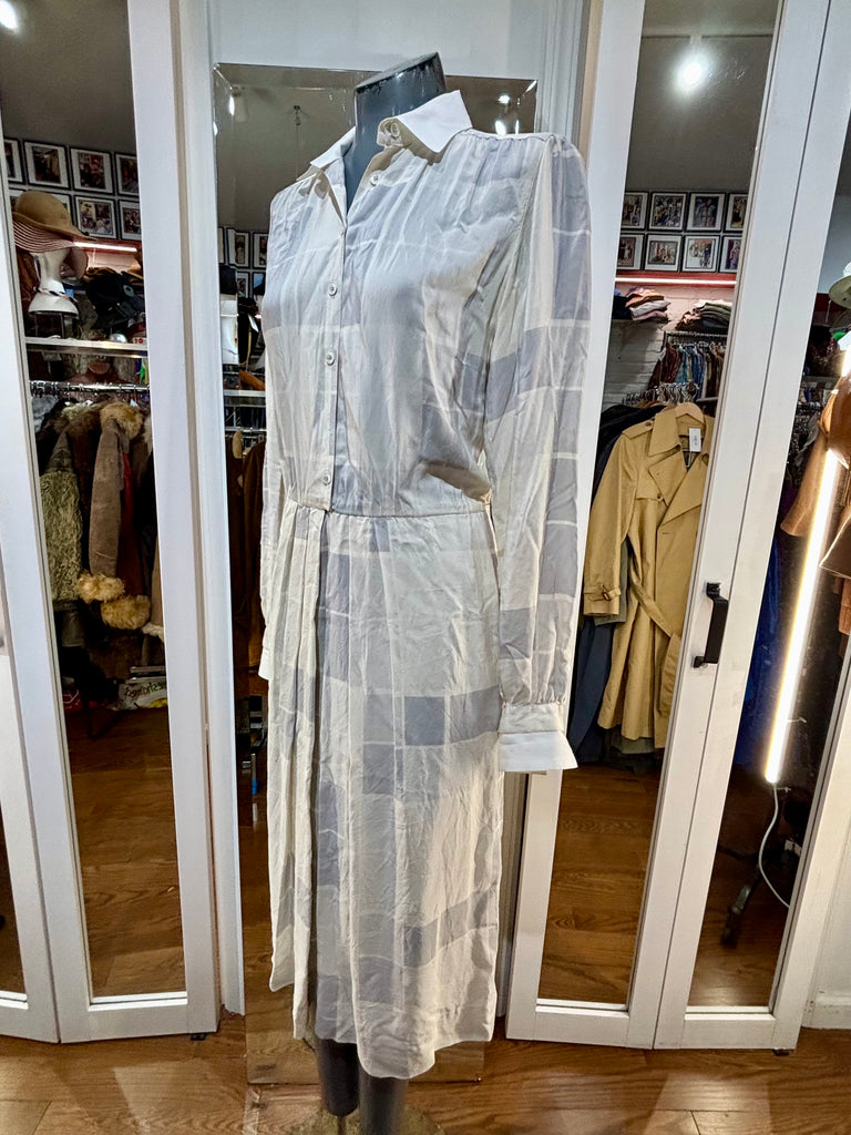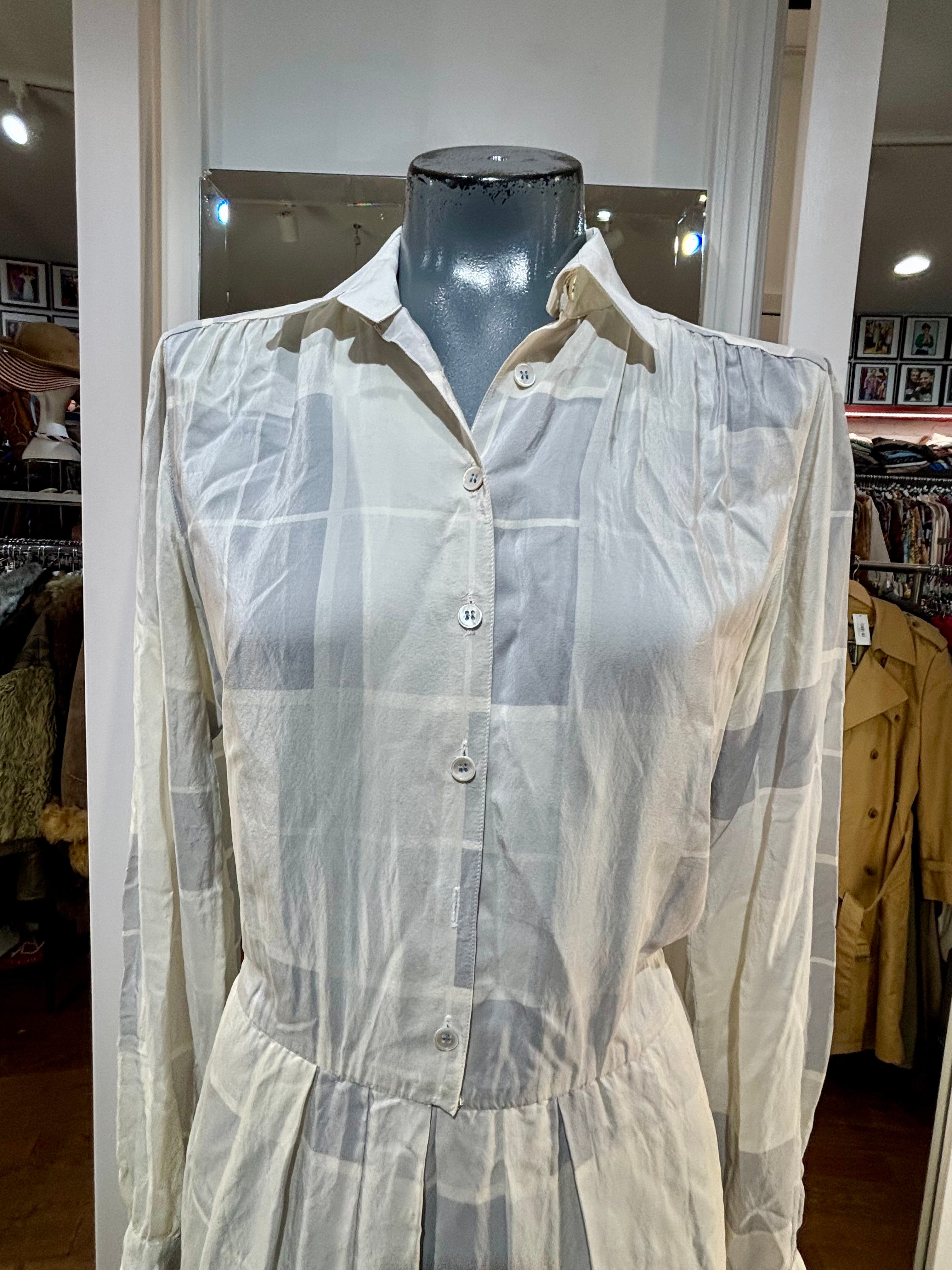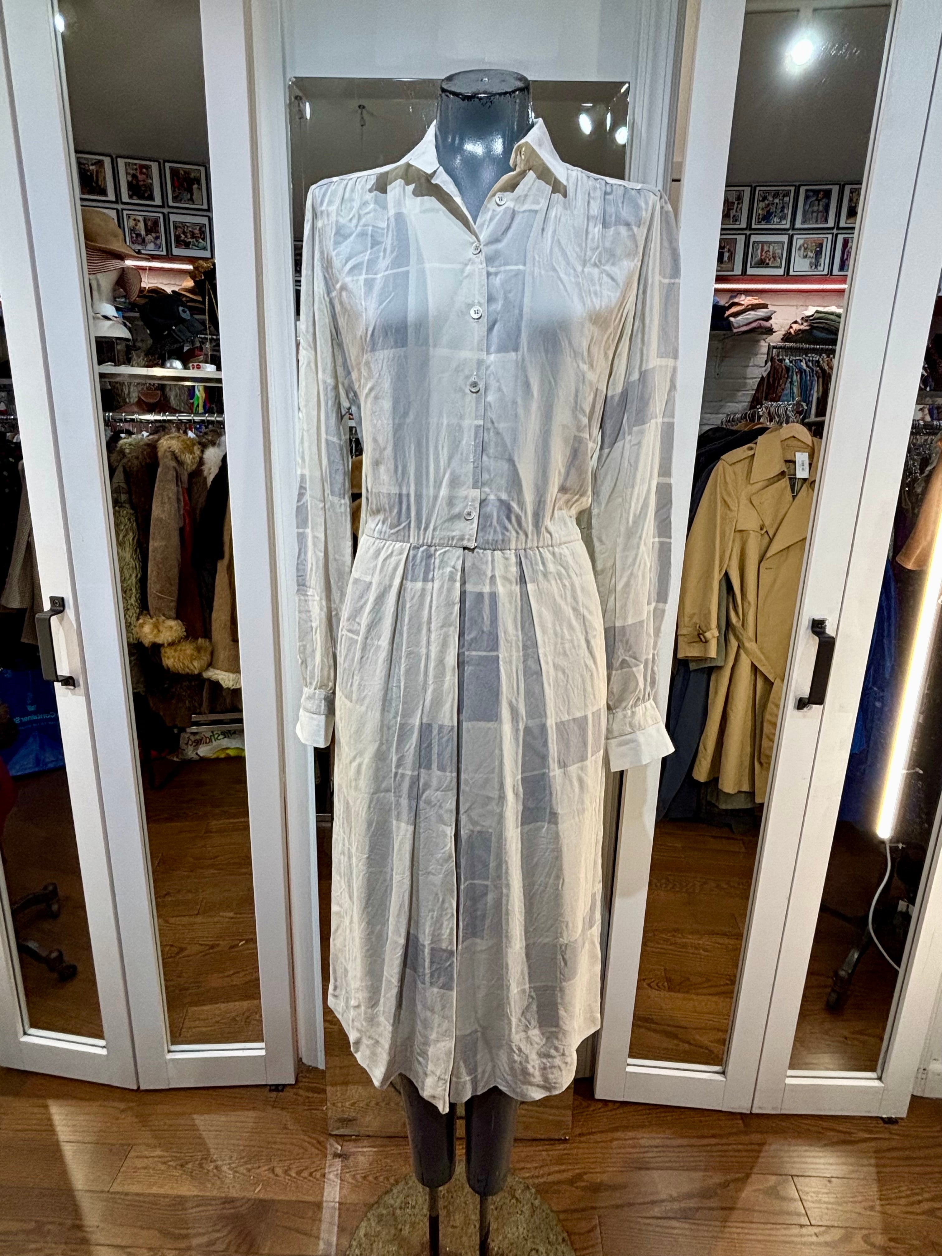 60’s Light Gray And Off White Square Prints Long Sleeve Dress