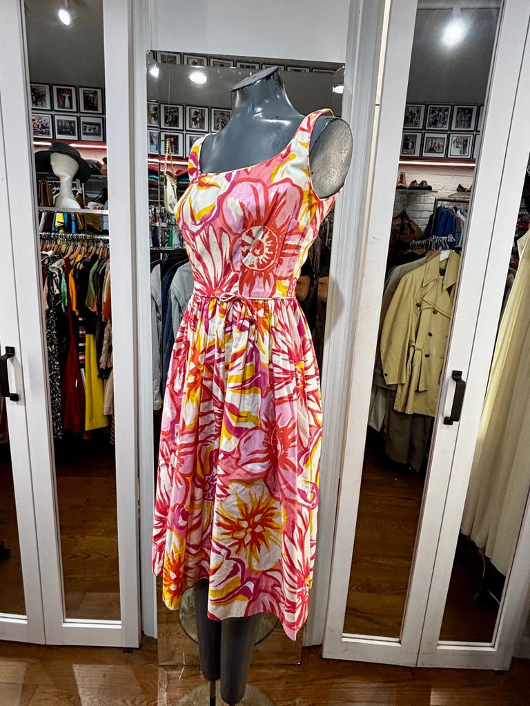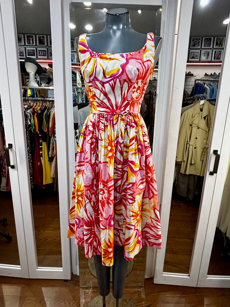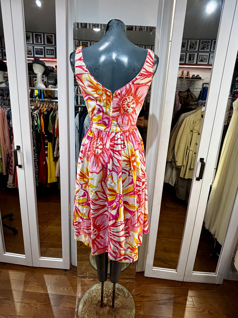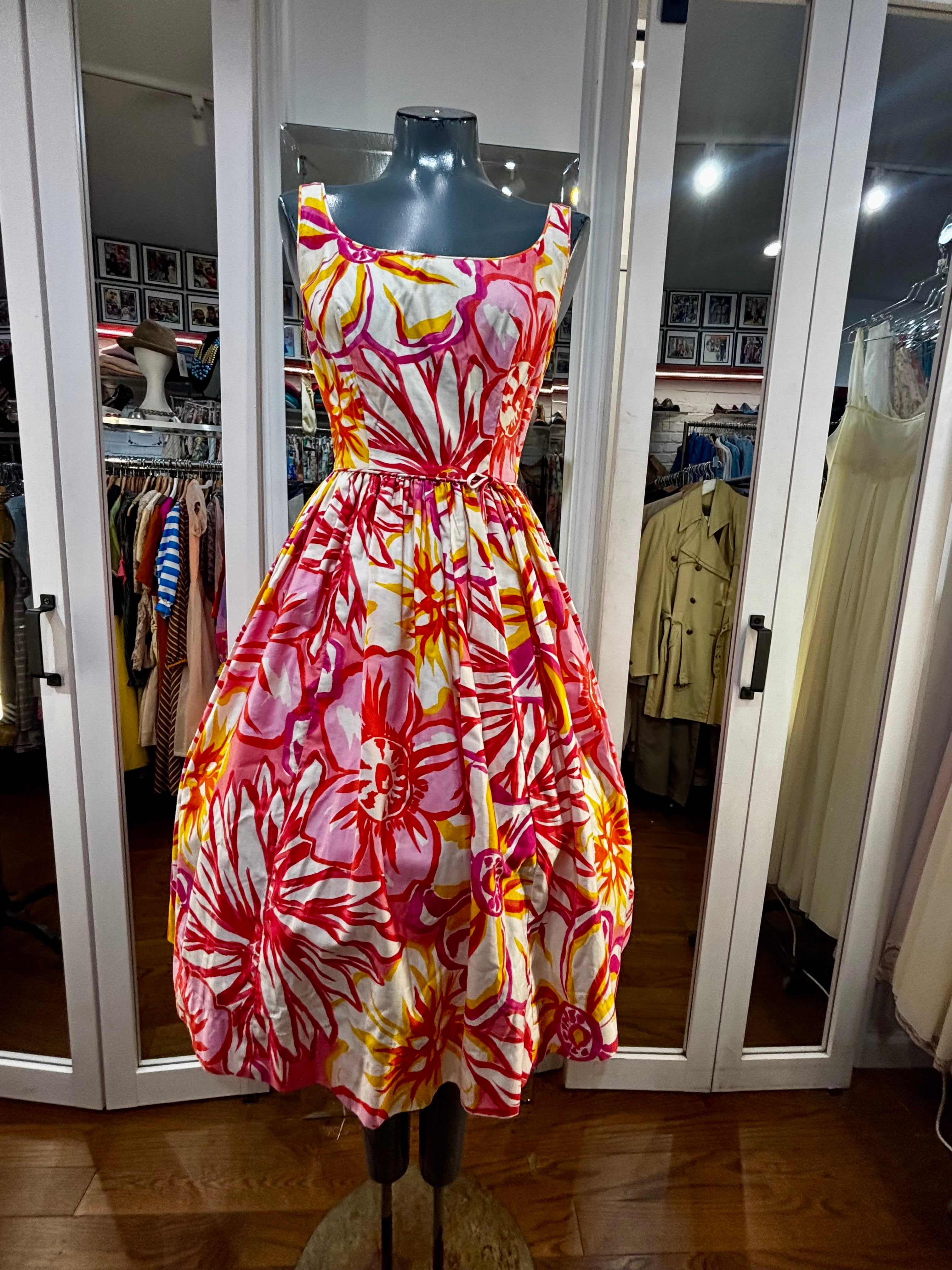 50’s Pink And Orange Print Flowers Fit And Flare Dress