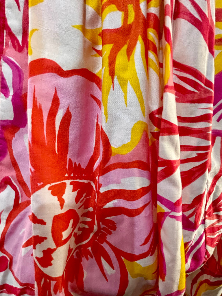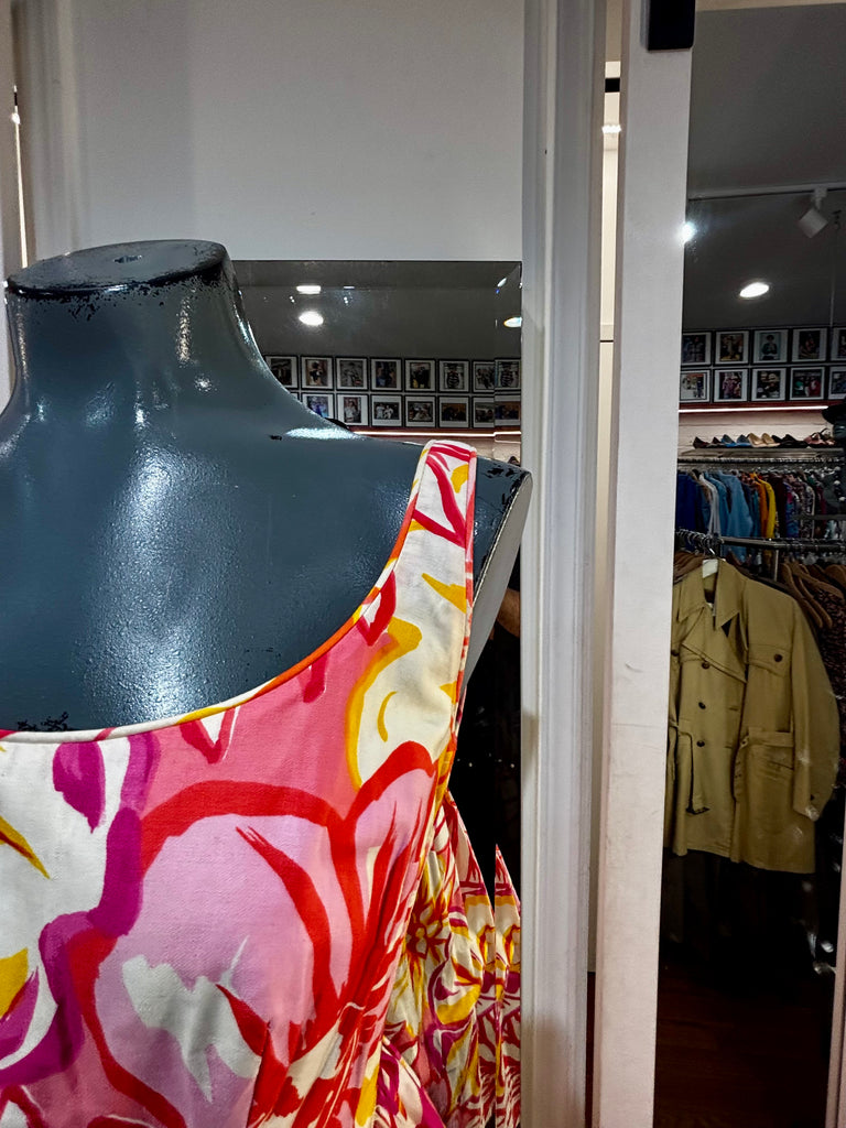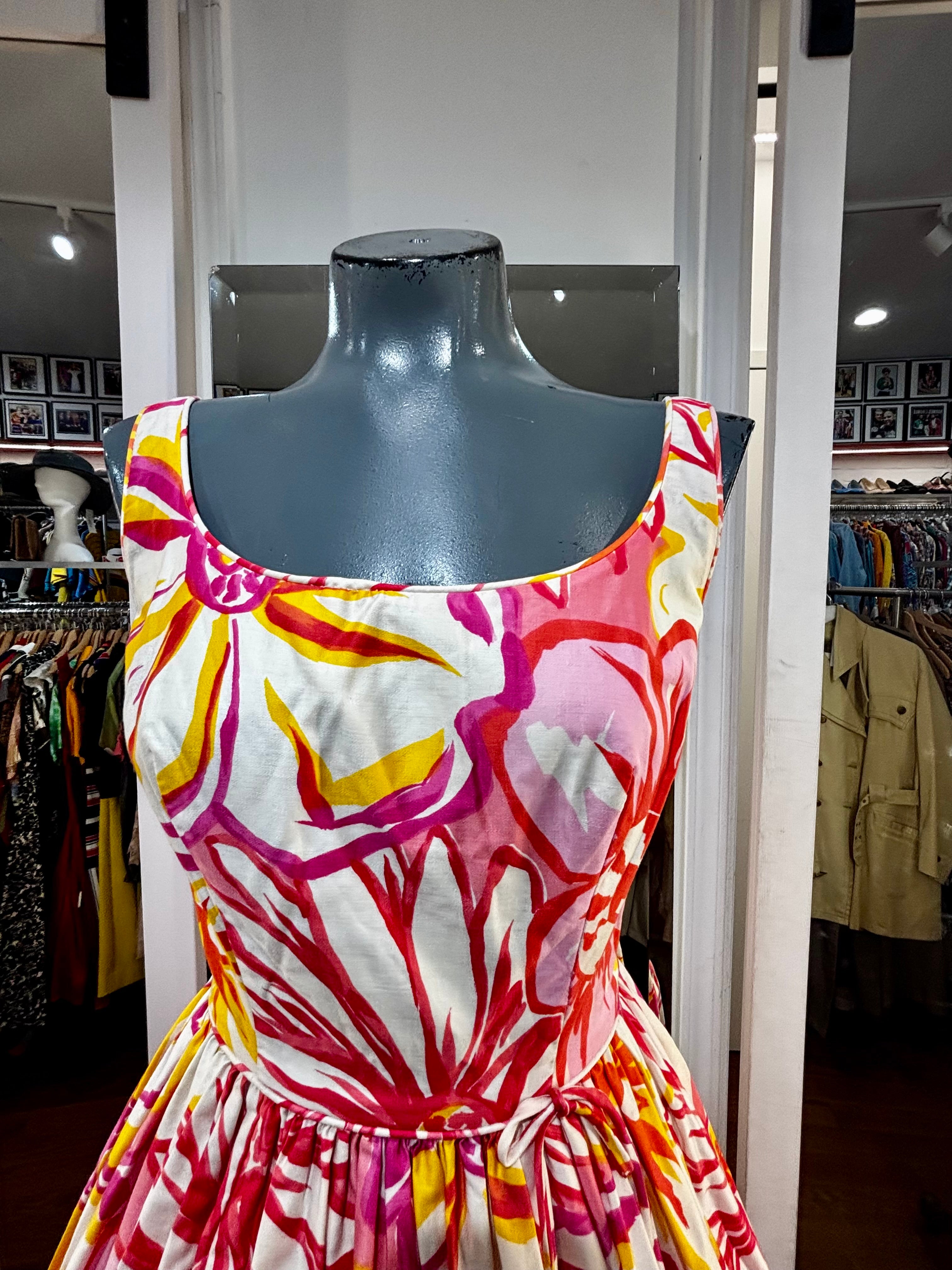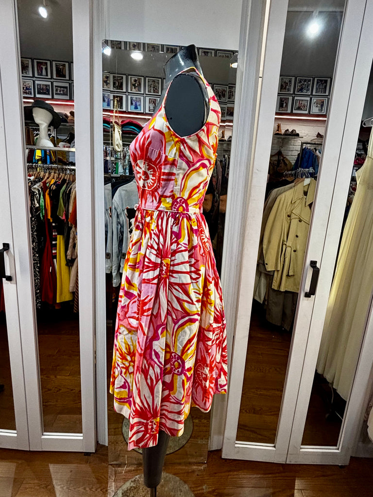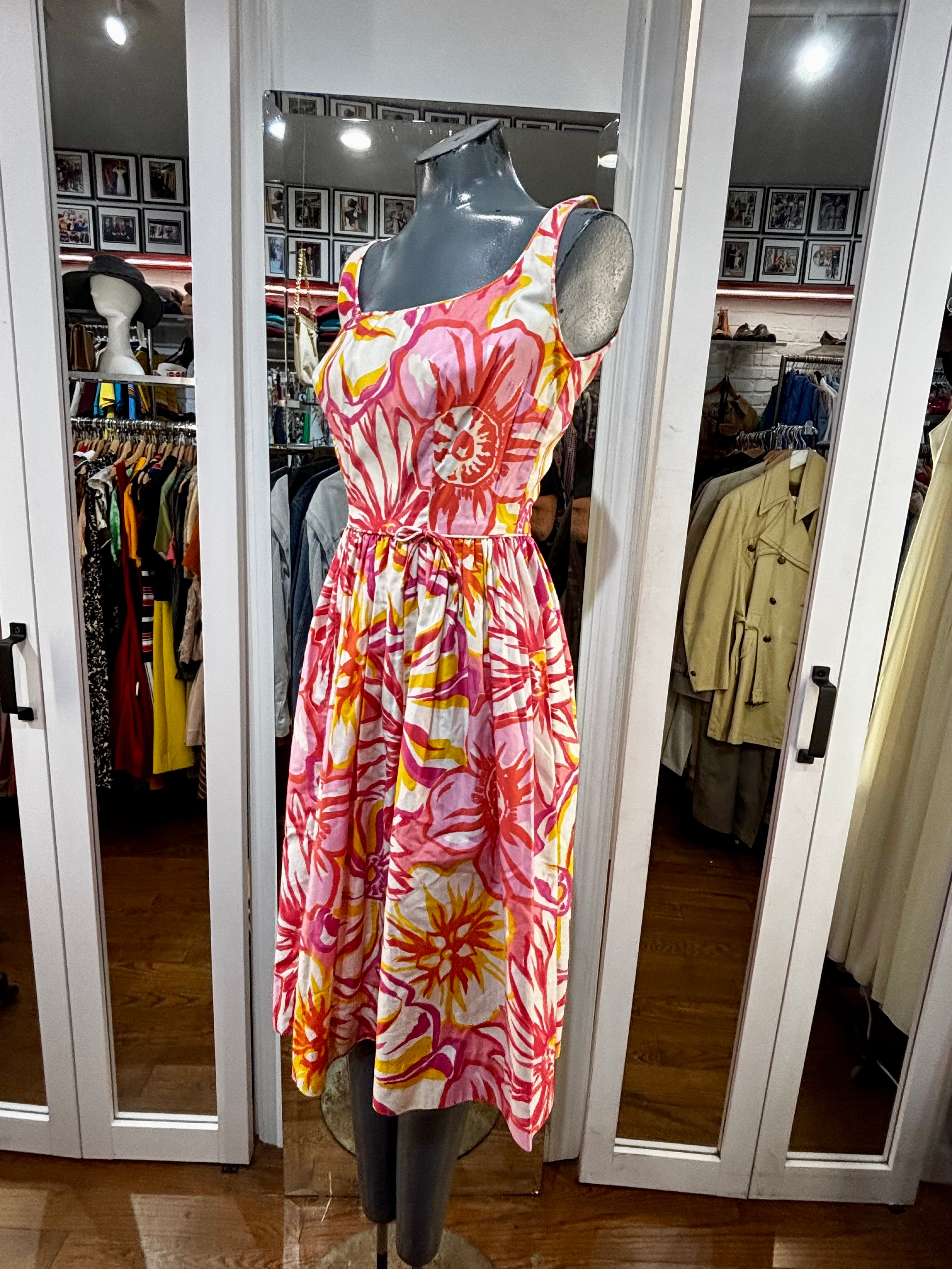 50’s Pink And Orange Print Flowers Fit And Flare Dress
