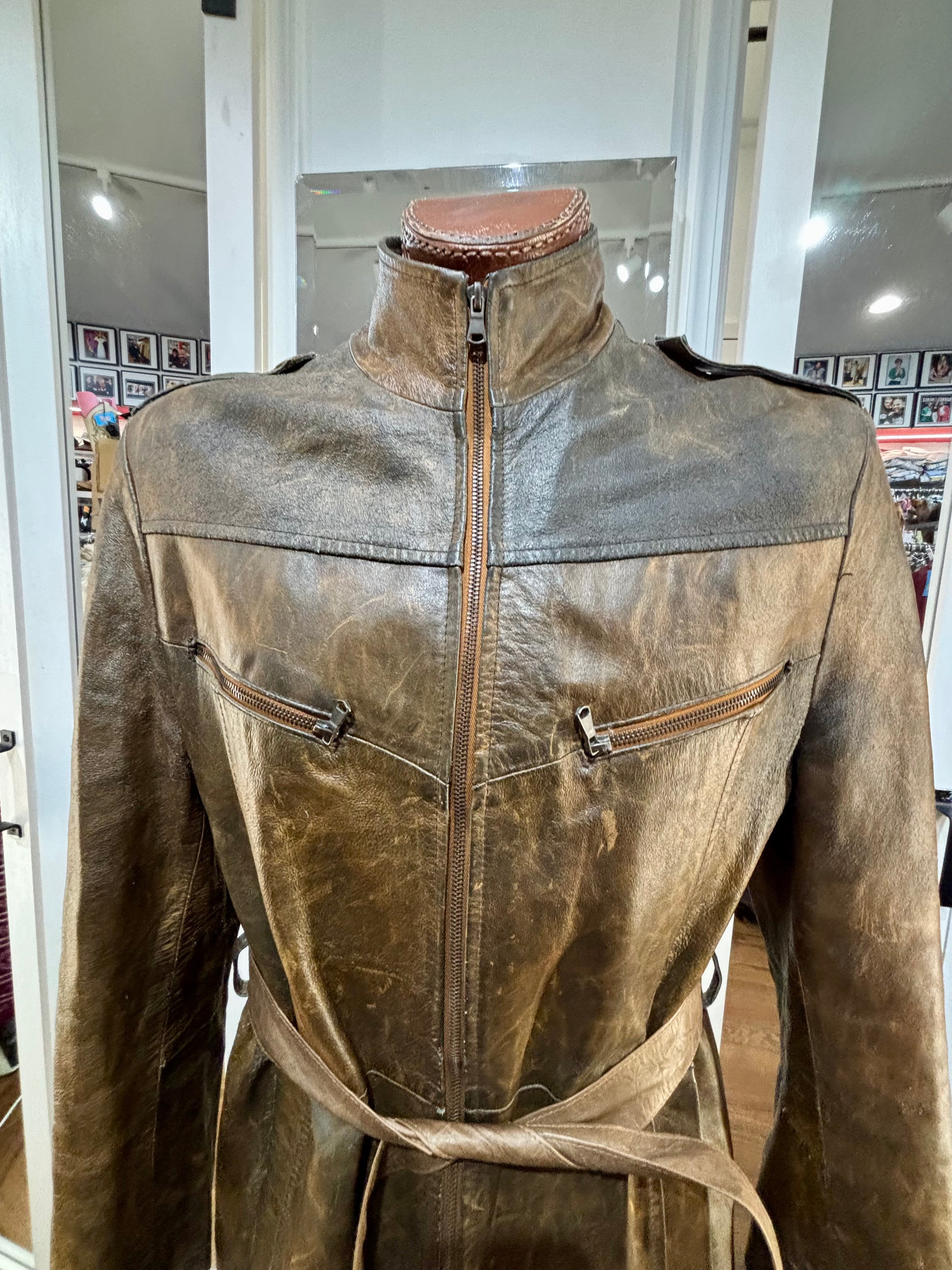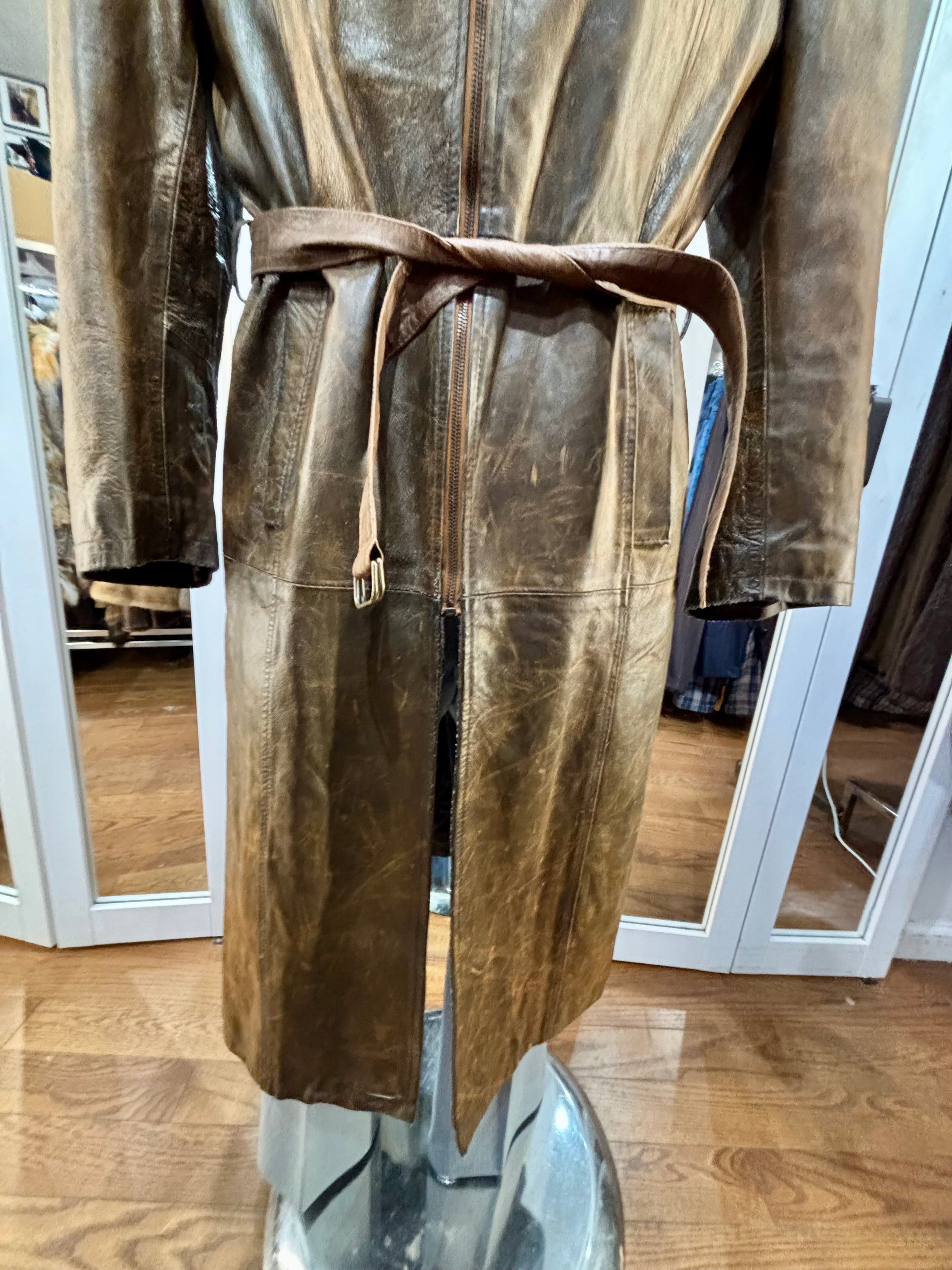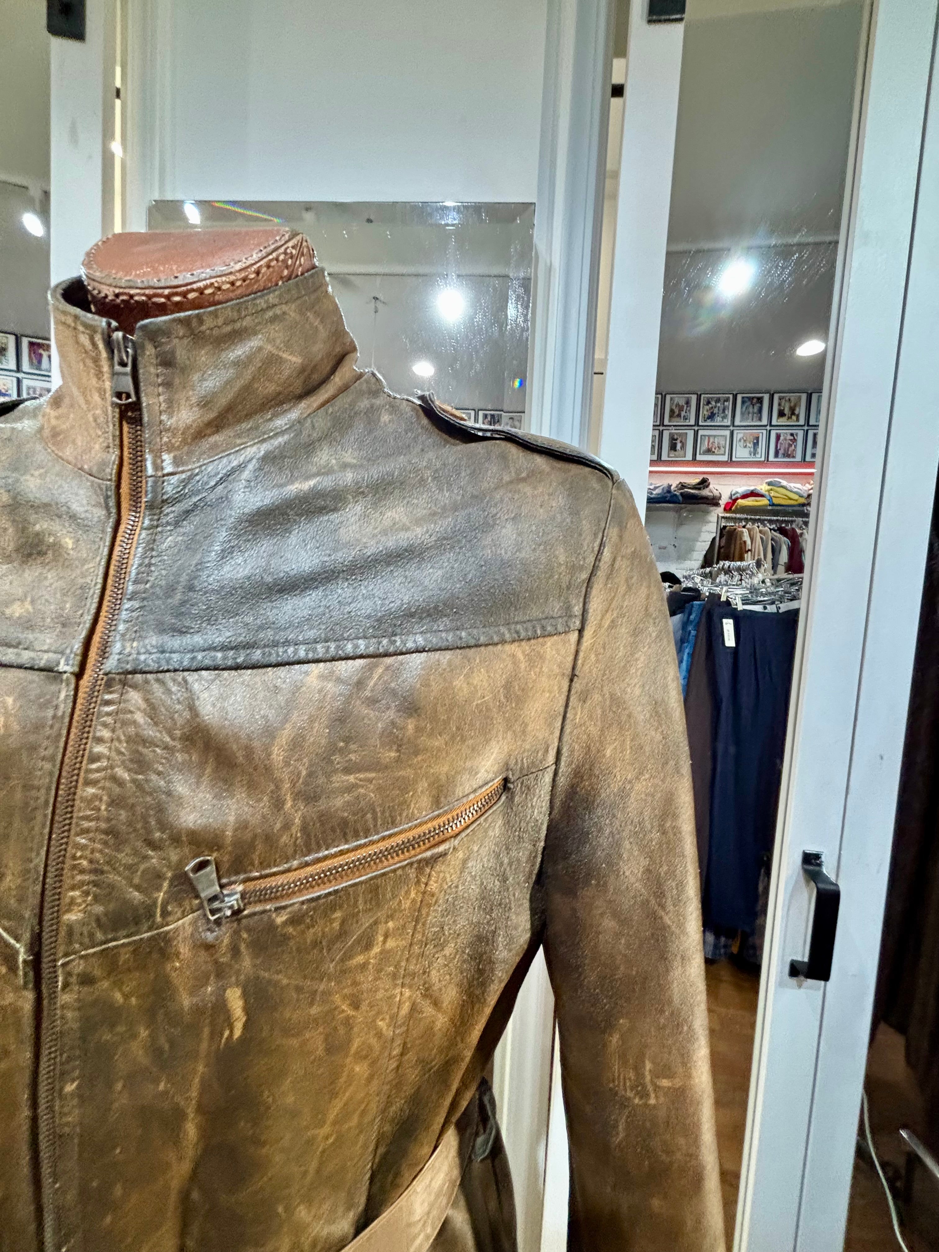 80’s Distressed Brown Zip Leather Long Jacket By Sorbing