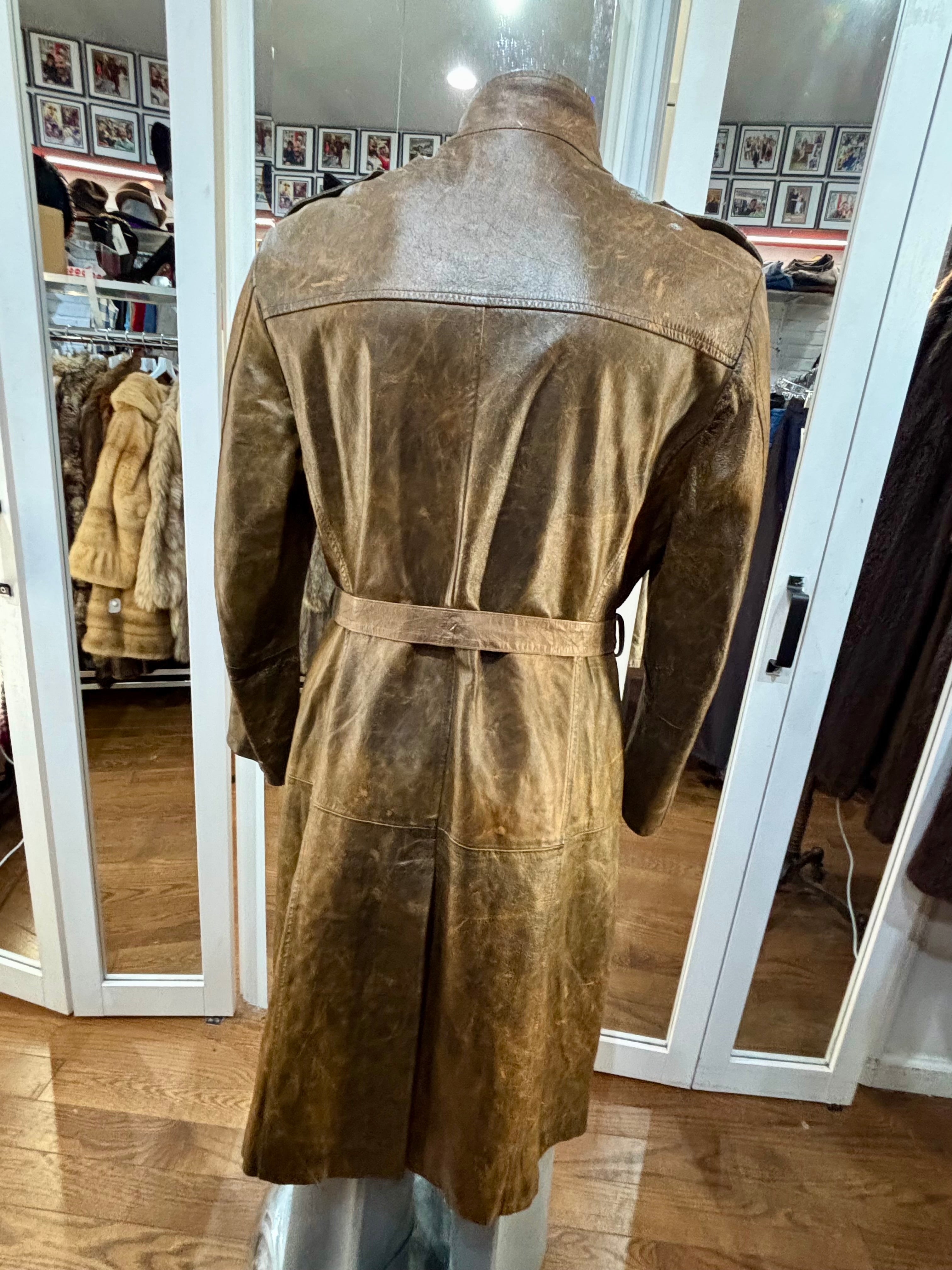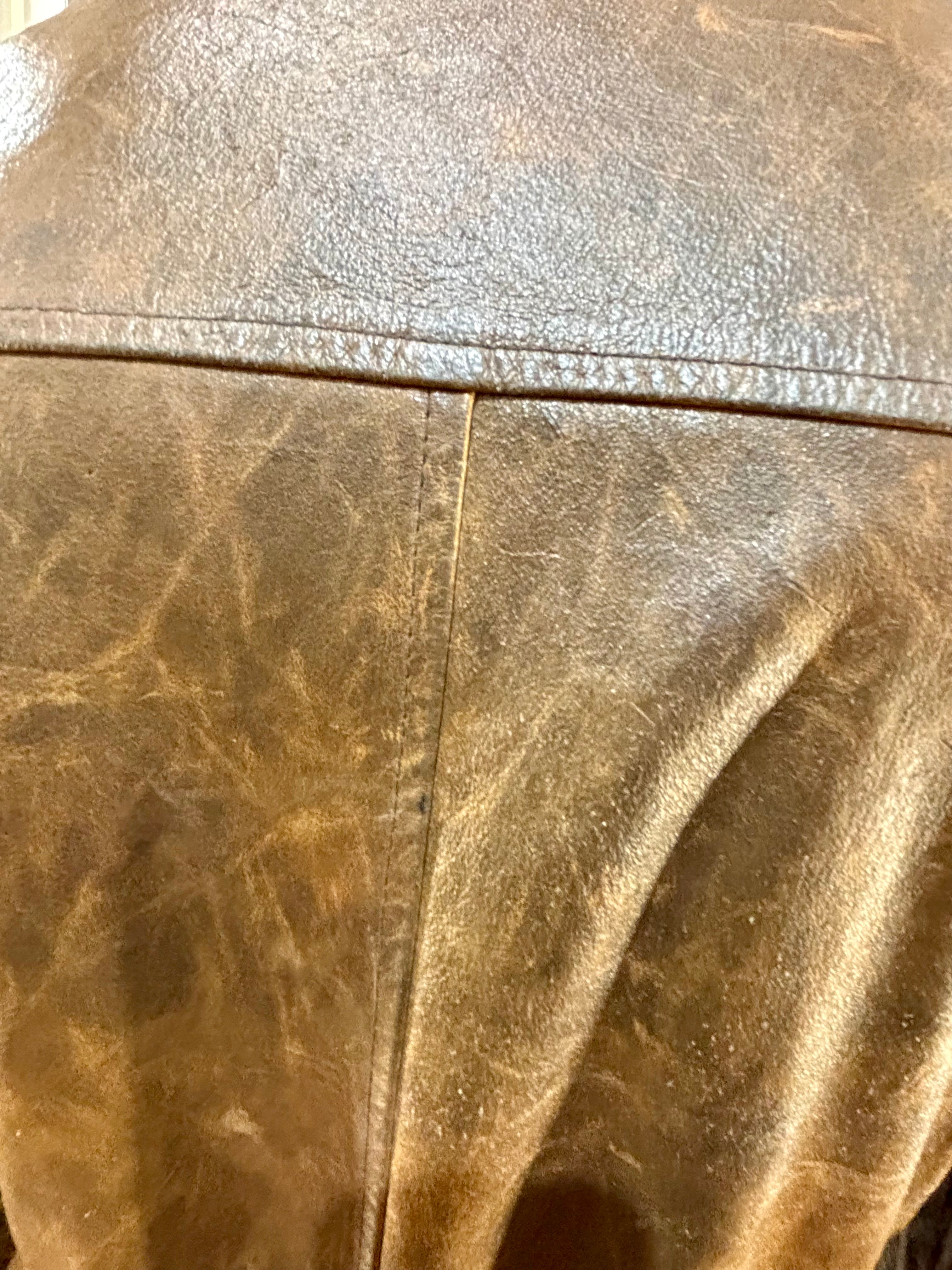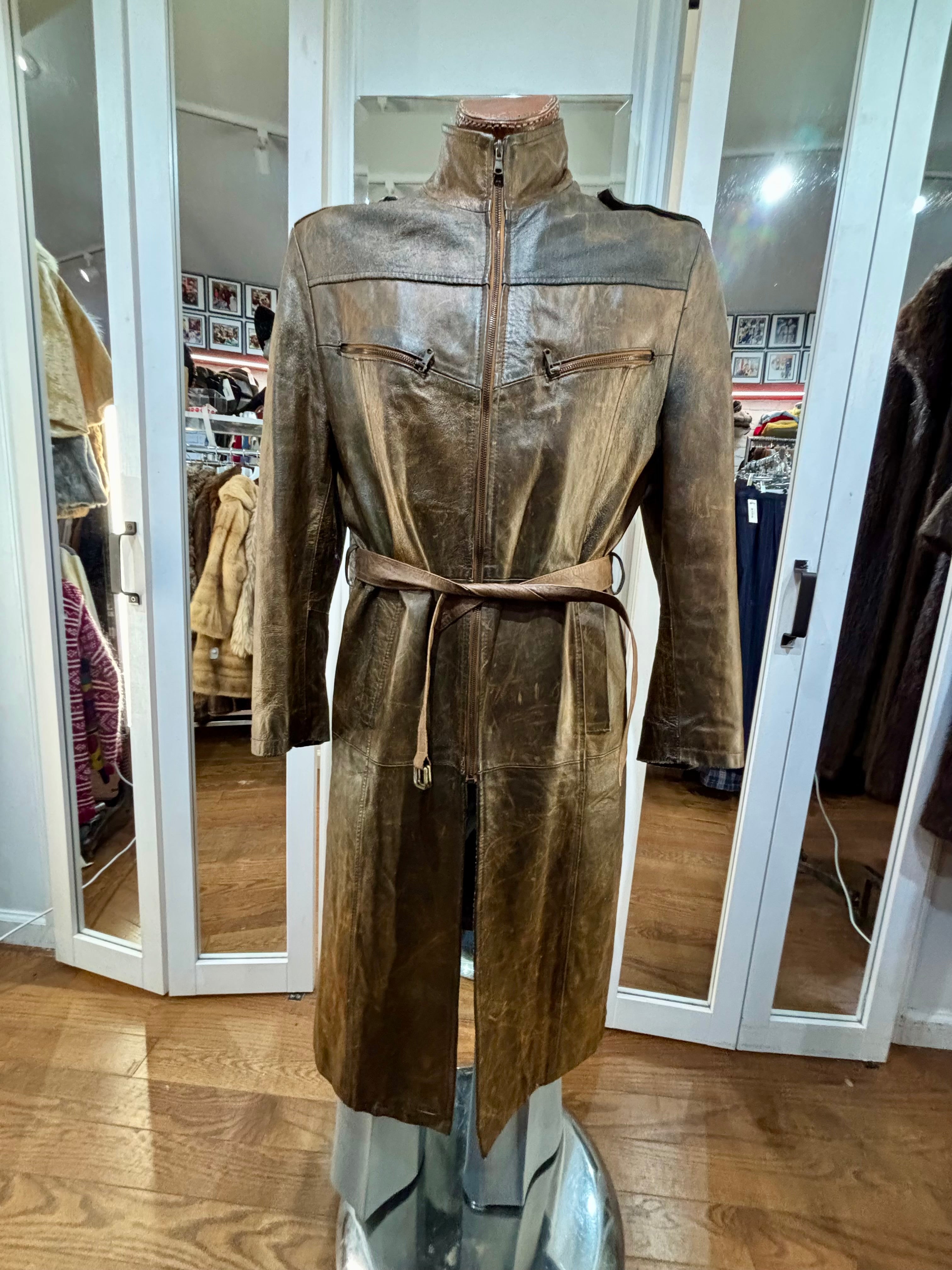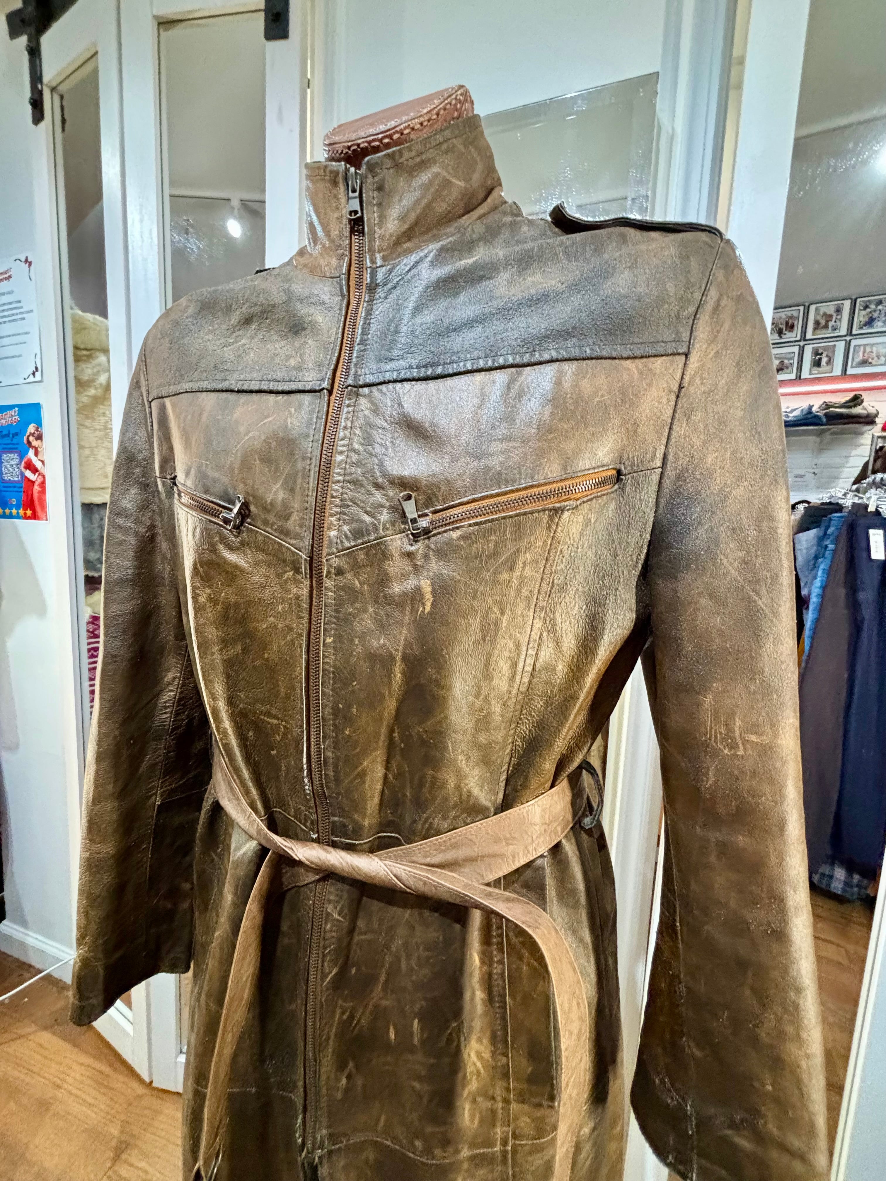 80’s Distressed Brown Zip Leather Long Jacket By Sorbing
