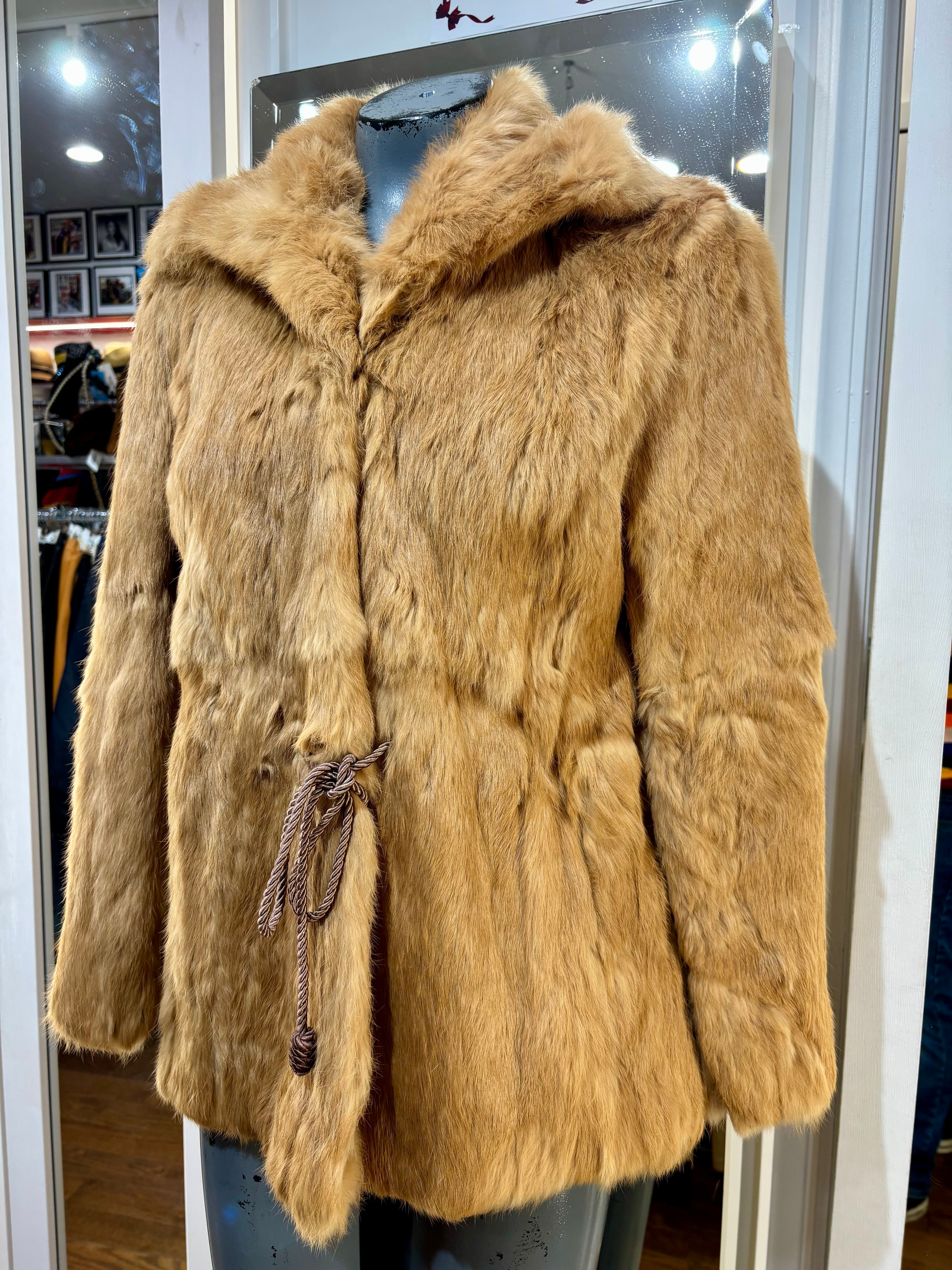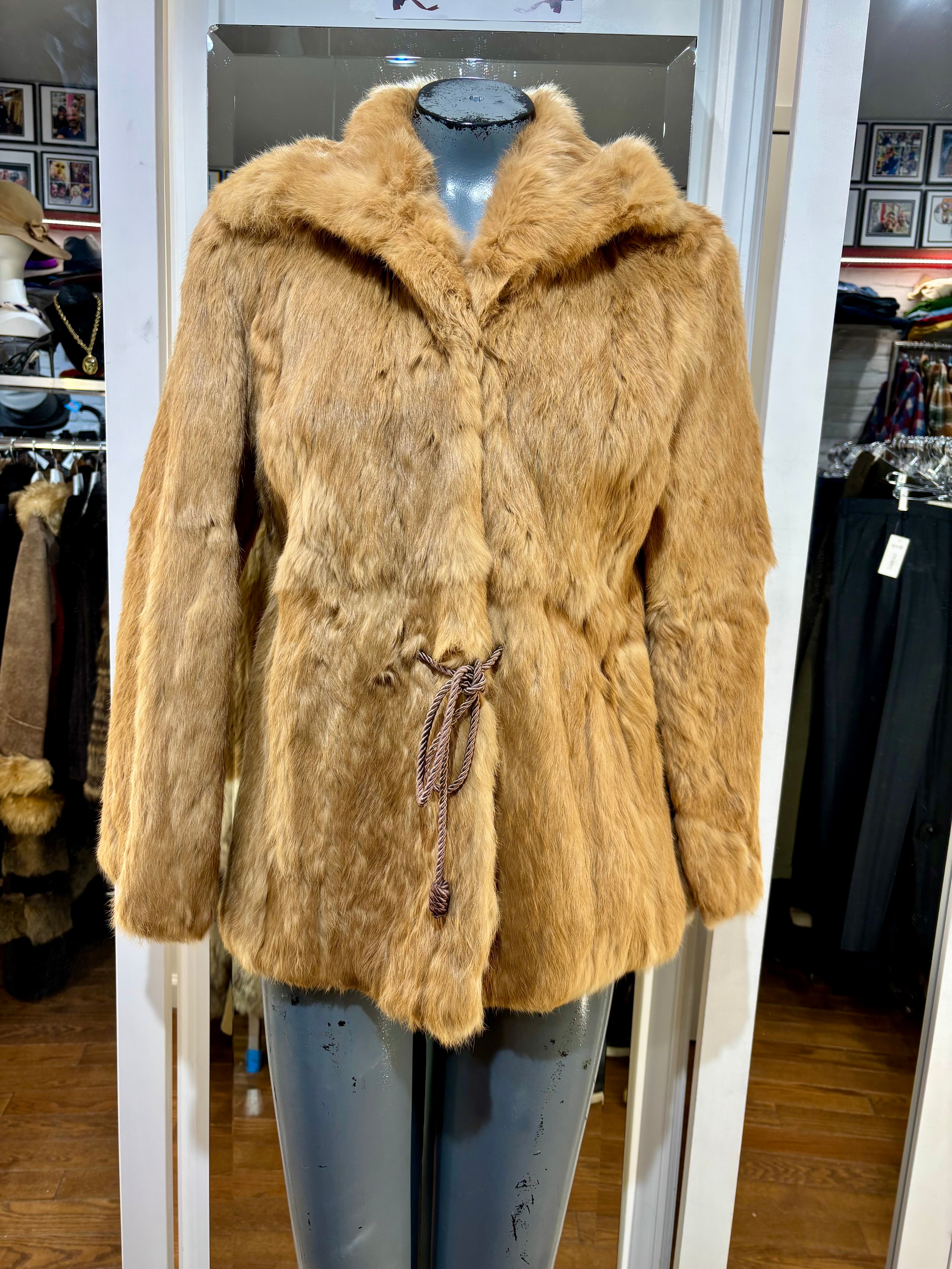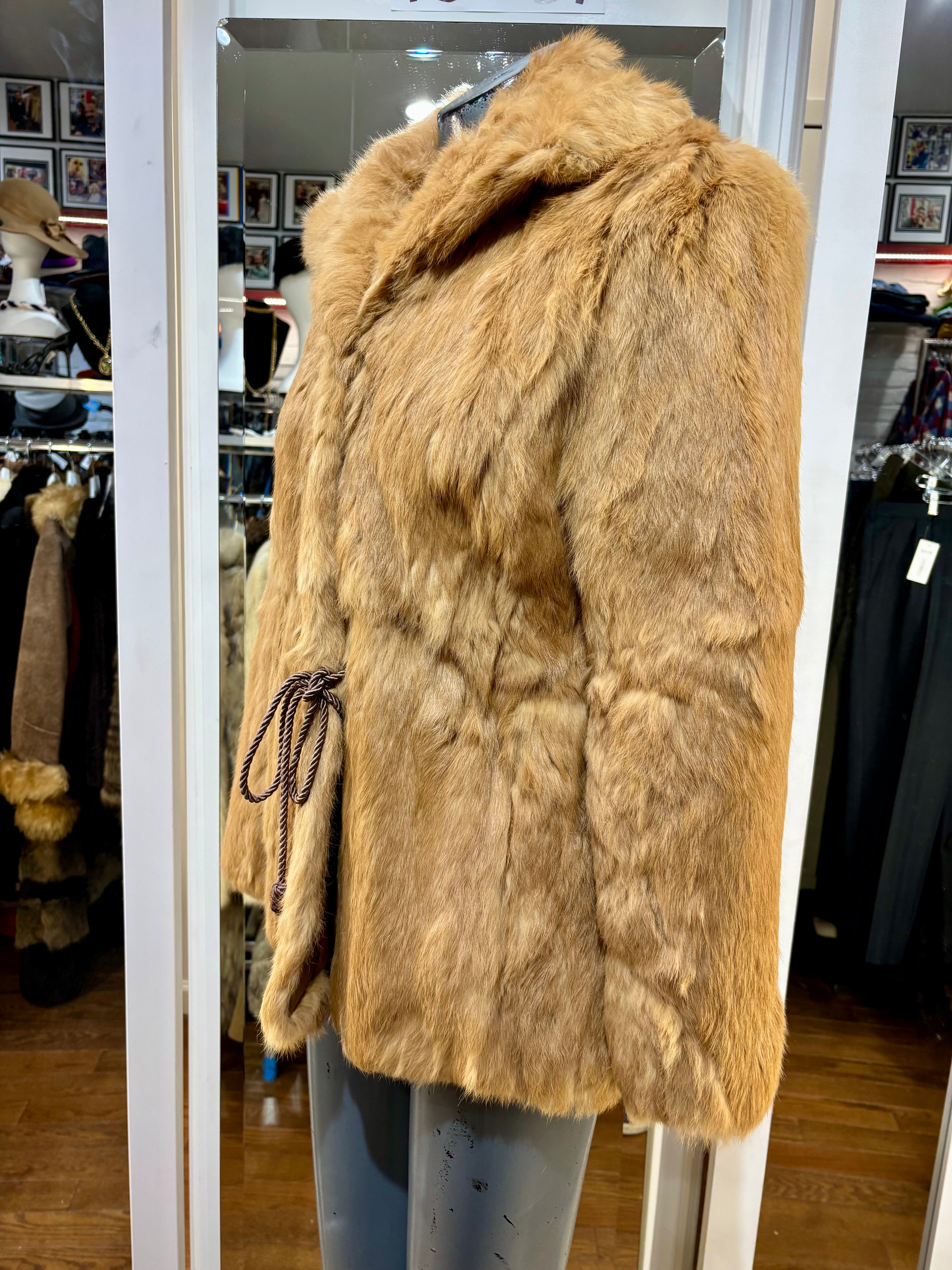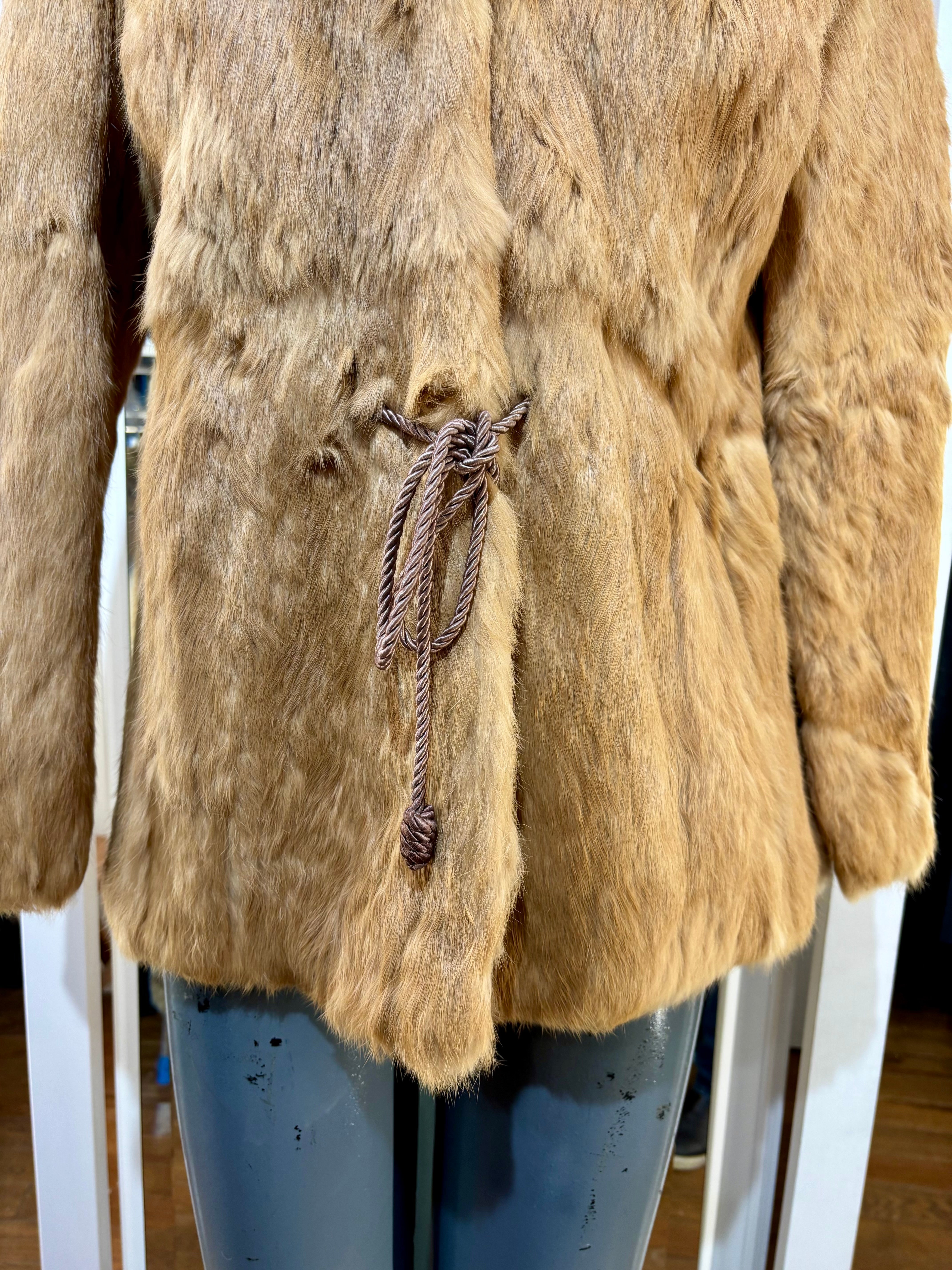 80’s Latte Brown Short Rabbit Fur Coat With String Cinch Belt