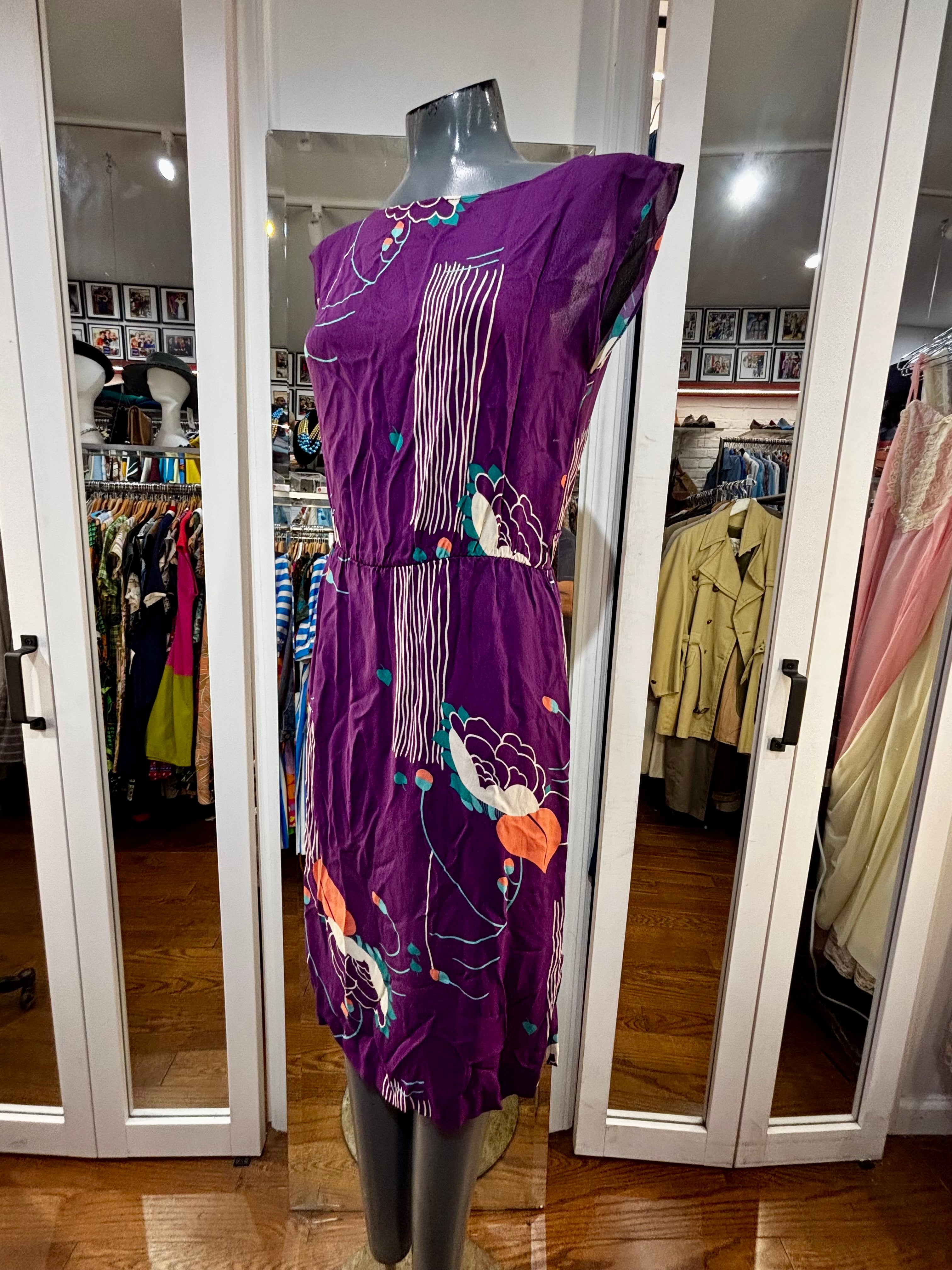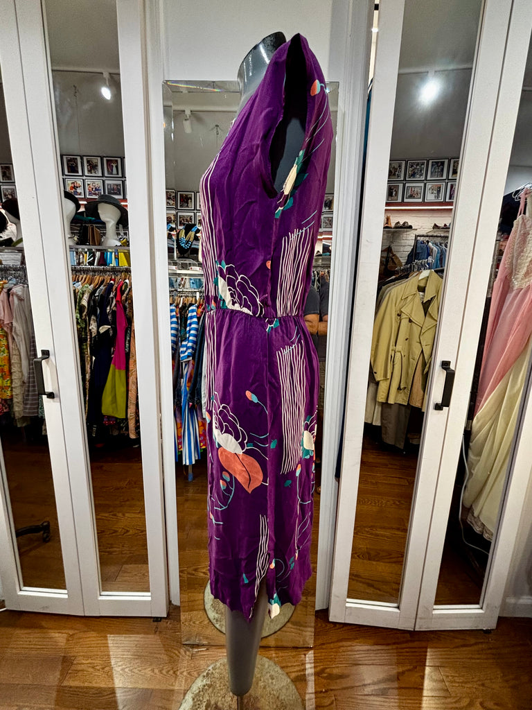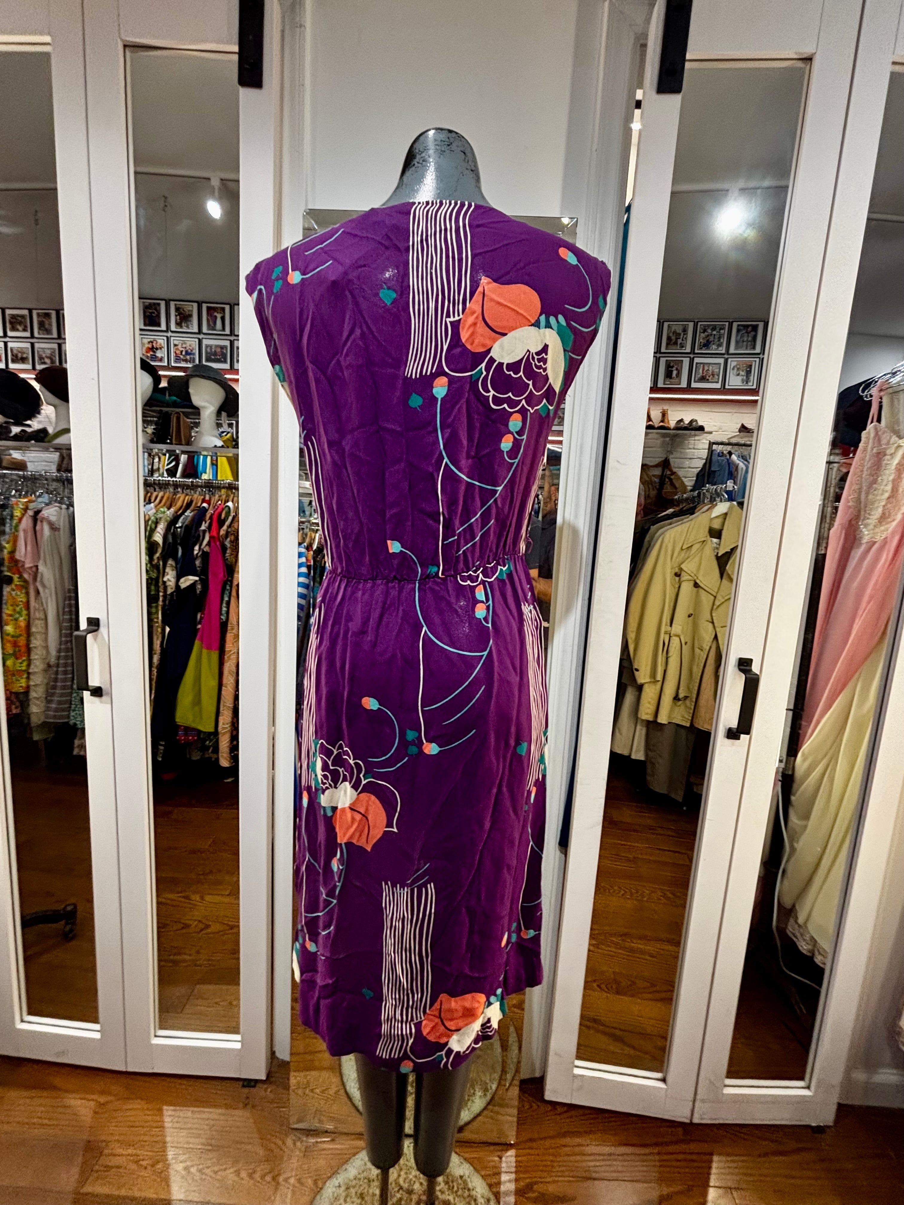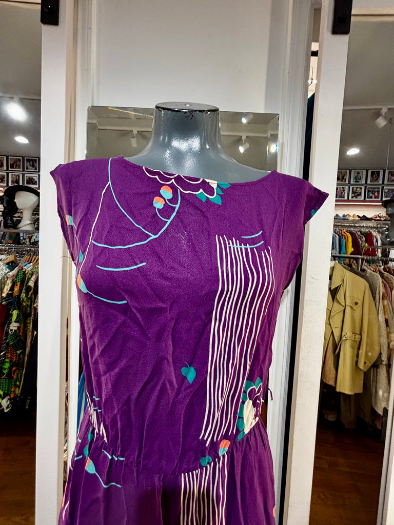 80’s Purple Sheer Non Sleeve Abstract Cinch Waist Dress