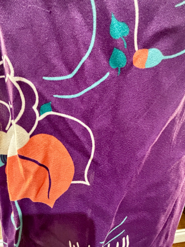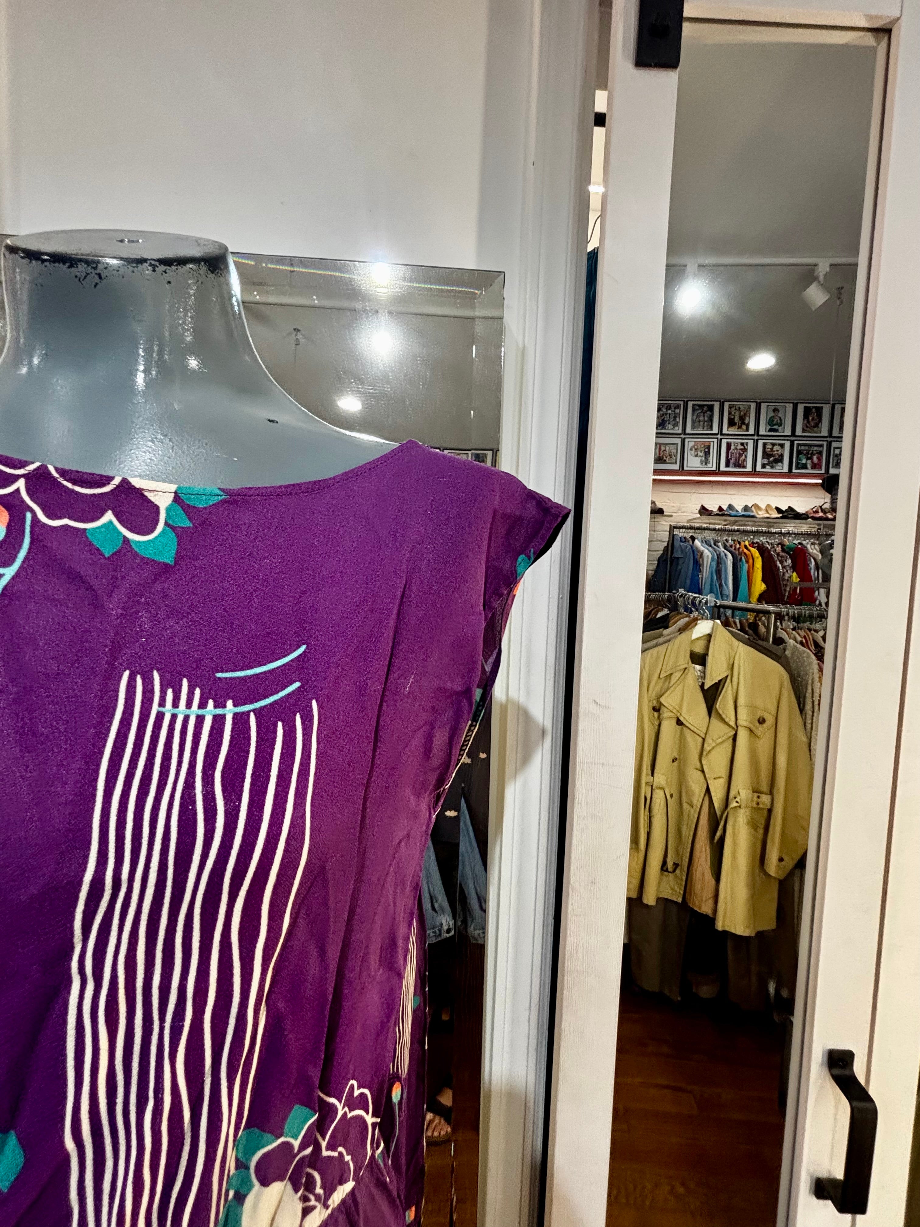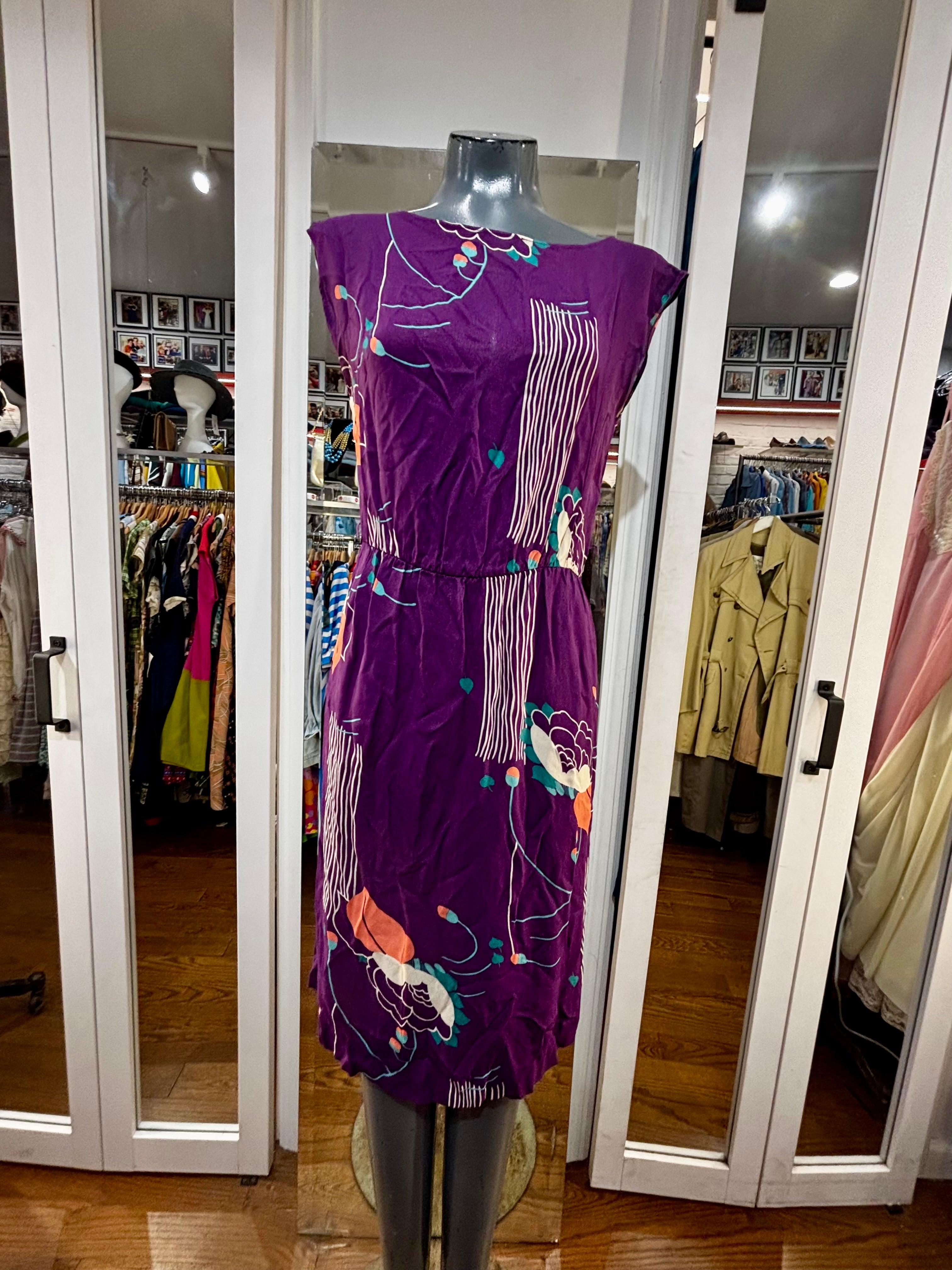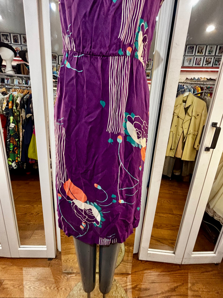 80’s Purple Sheer Non Sleeve Abstract Cinch Waist Dress